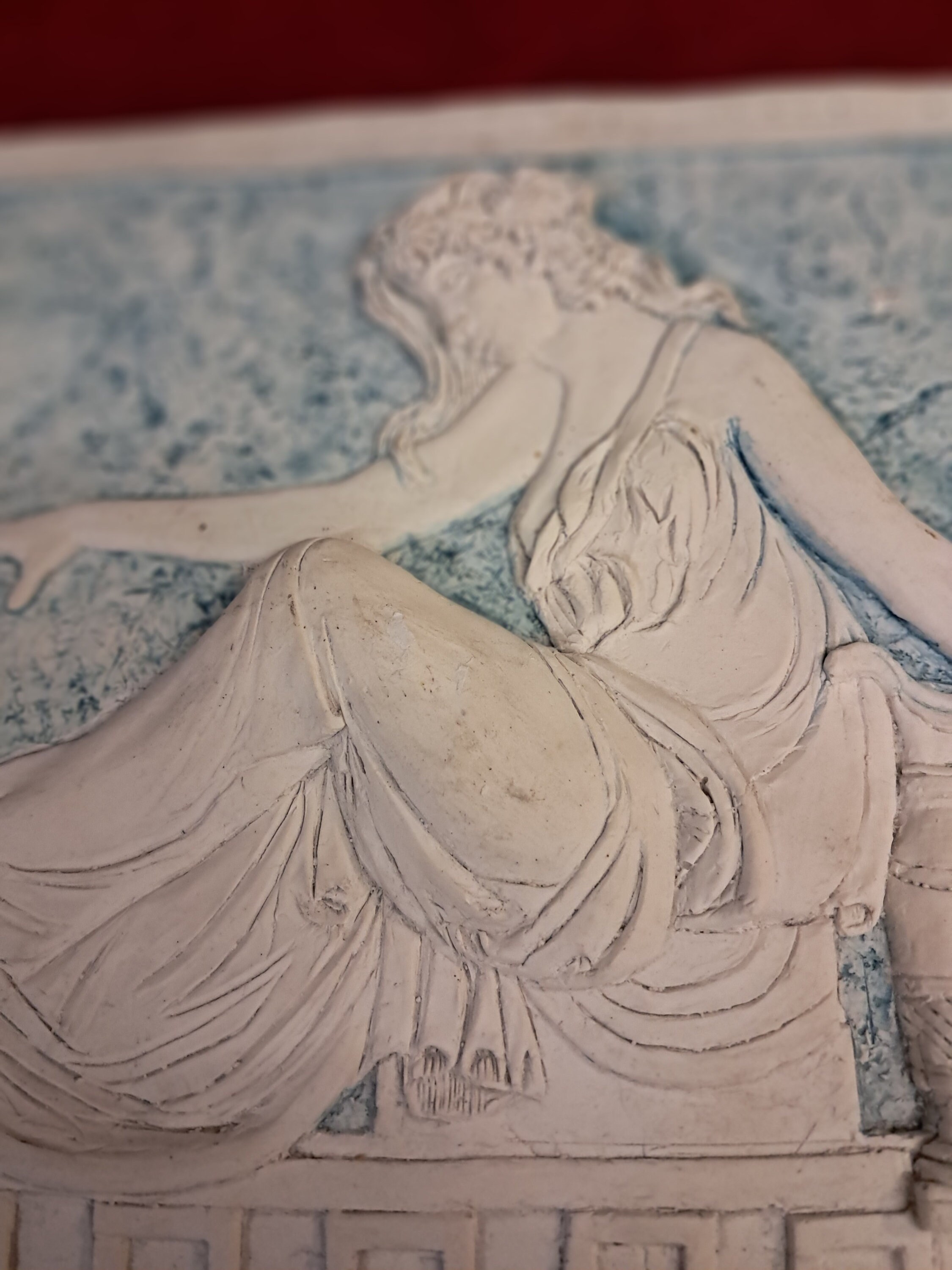 Vtg Art Nouveau Incolay Plaque Relief Blue White Goddess with her cat