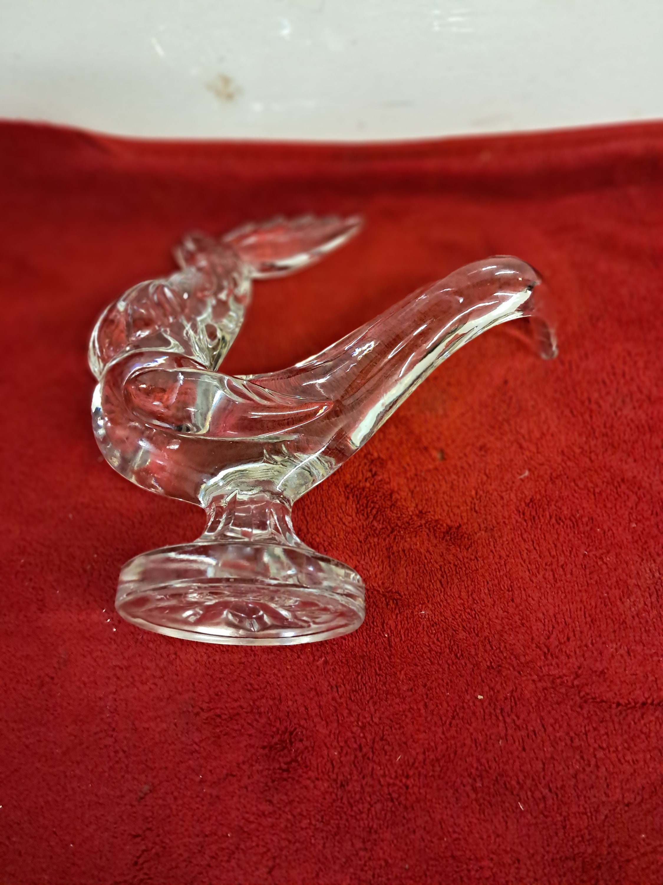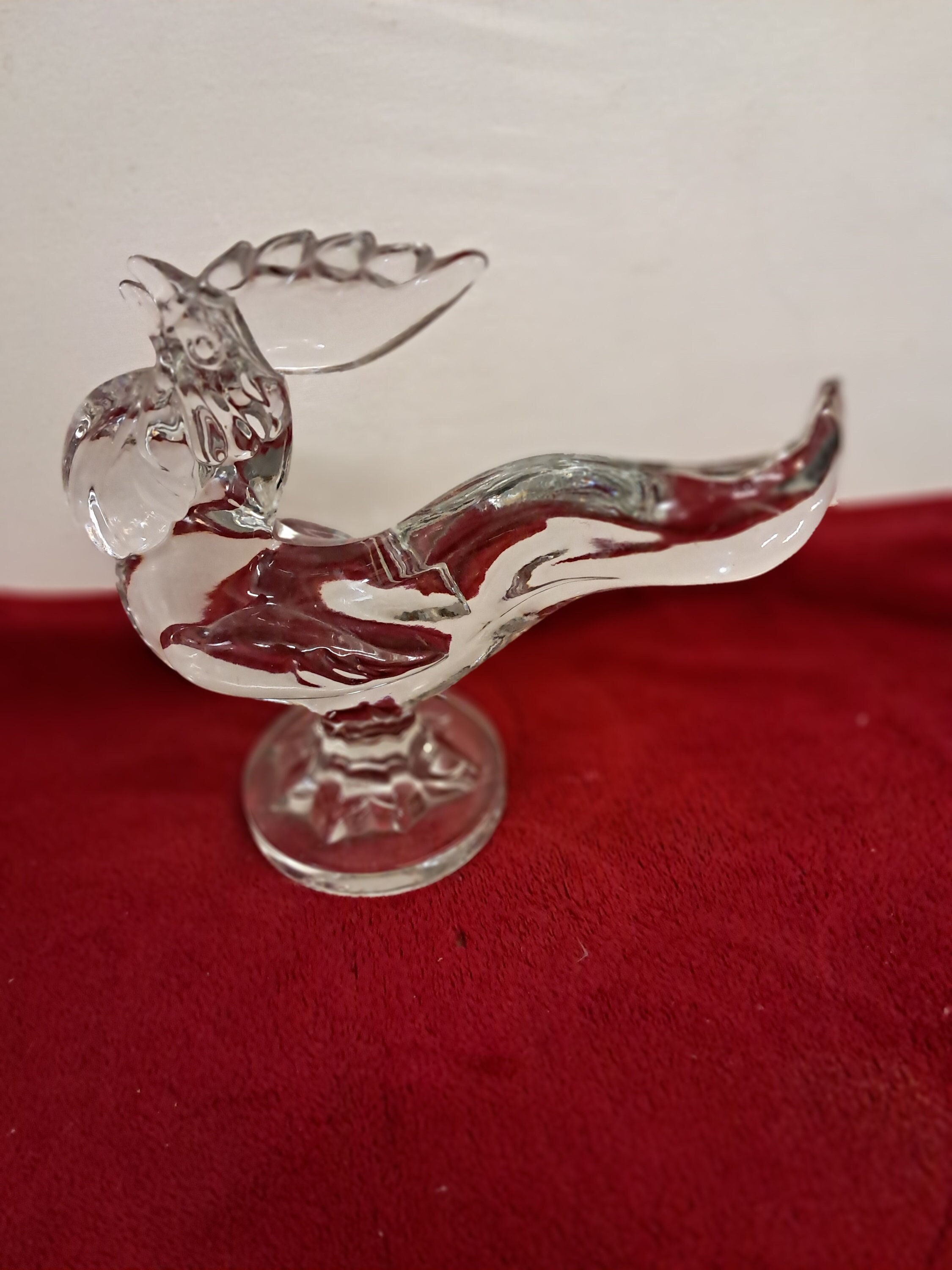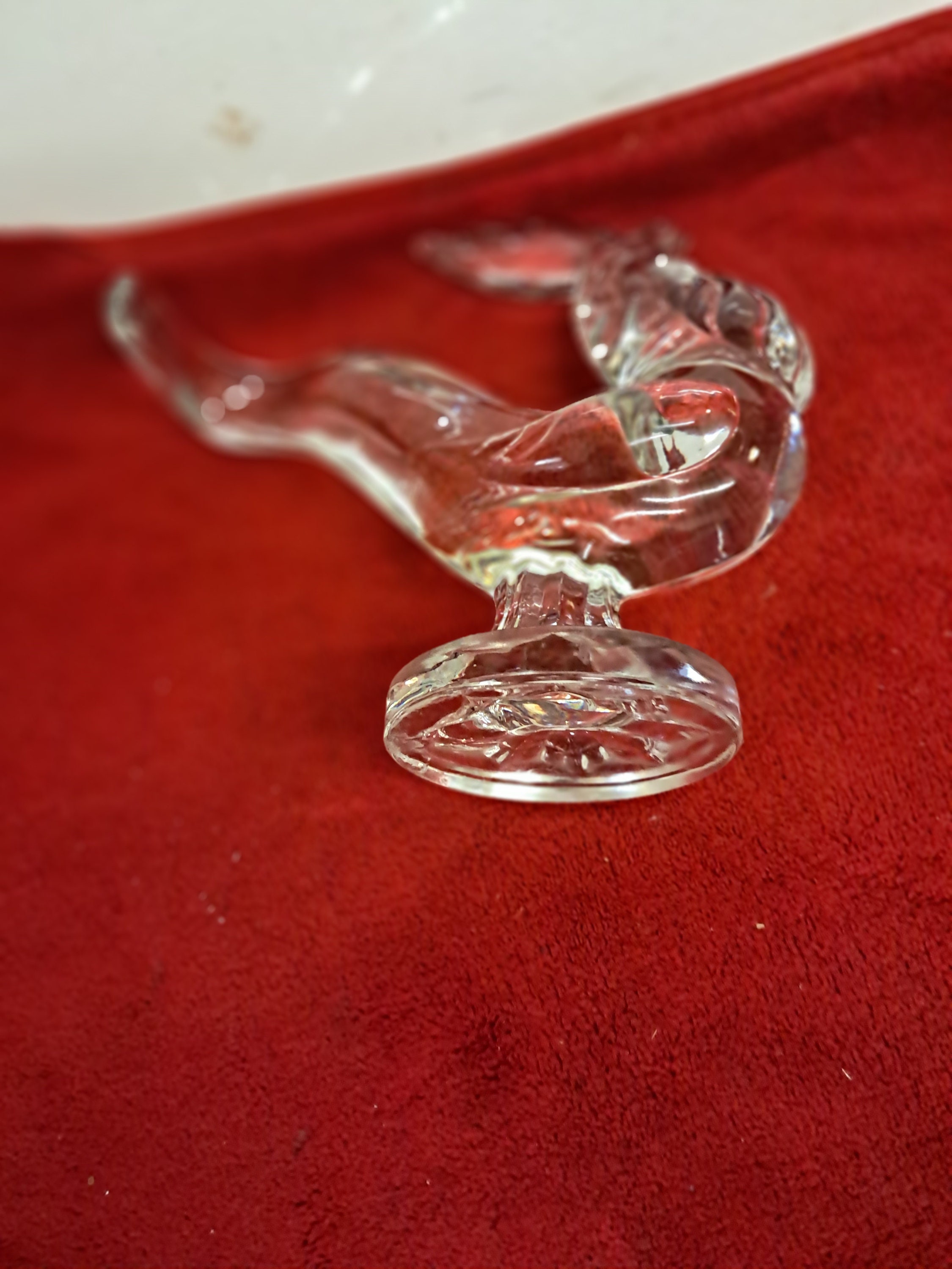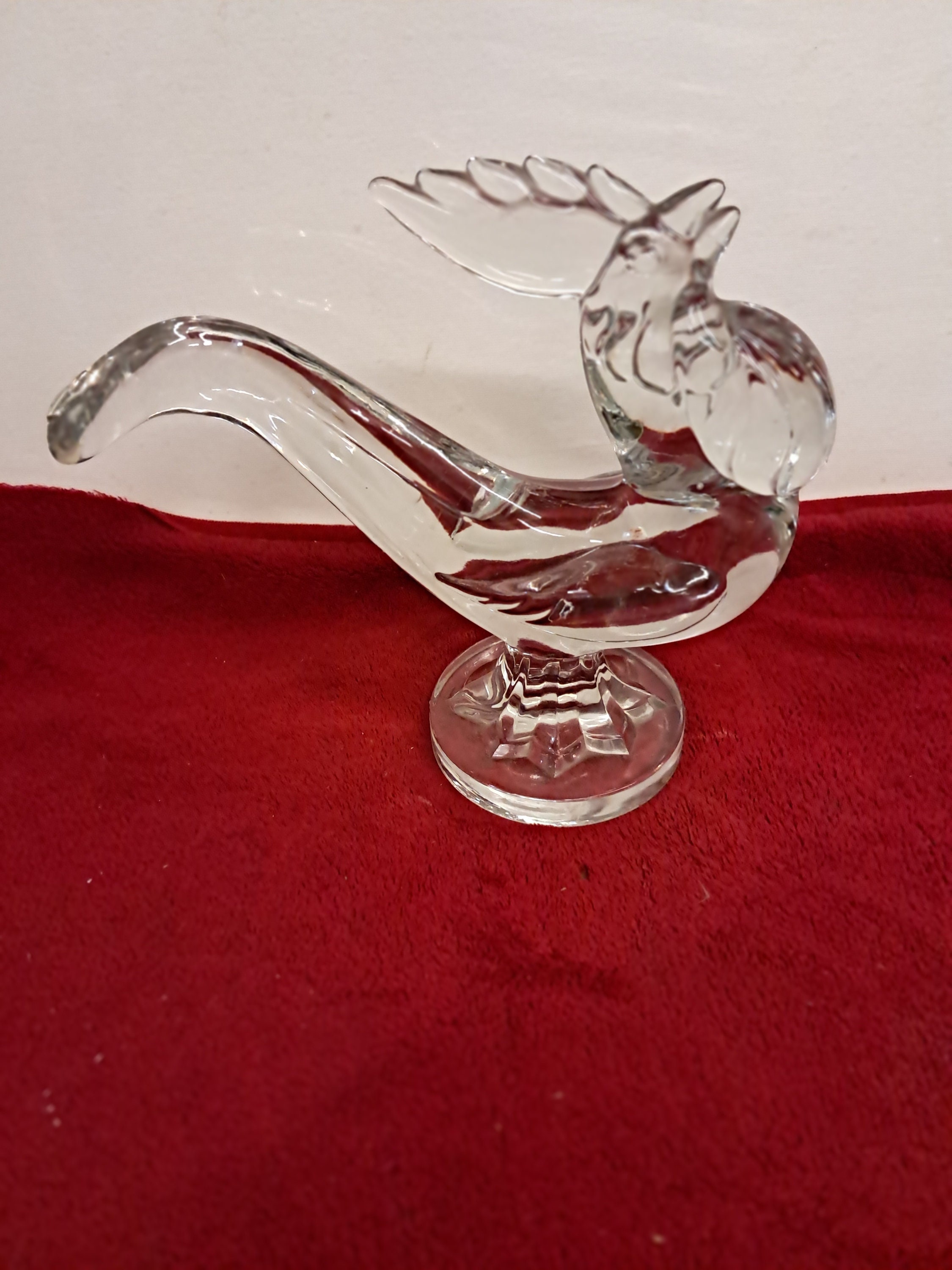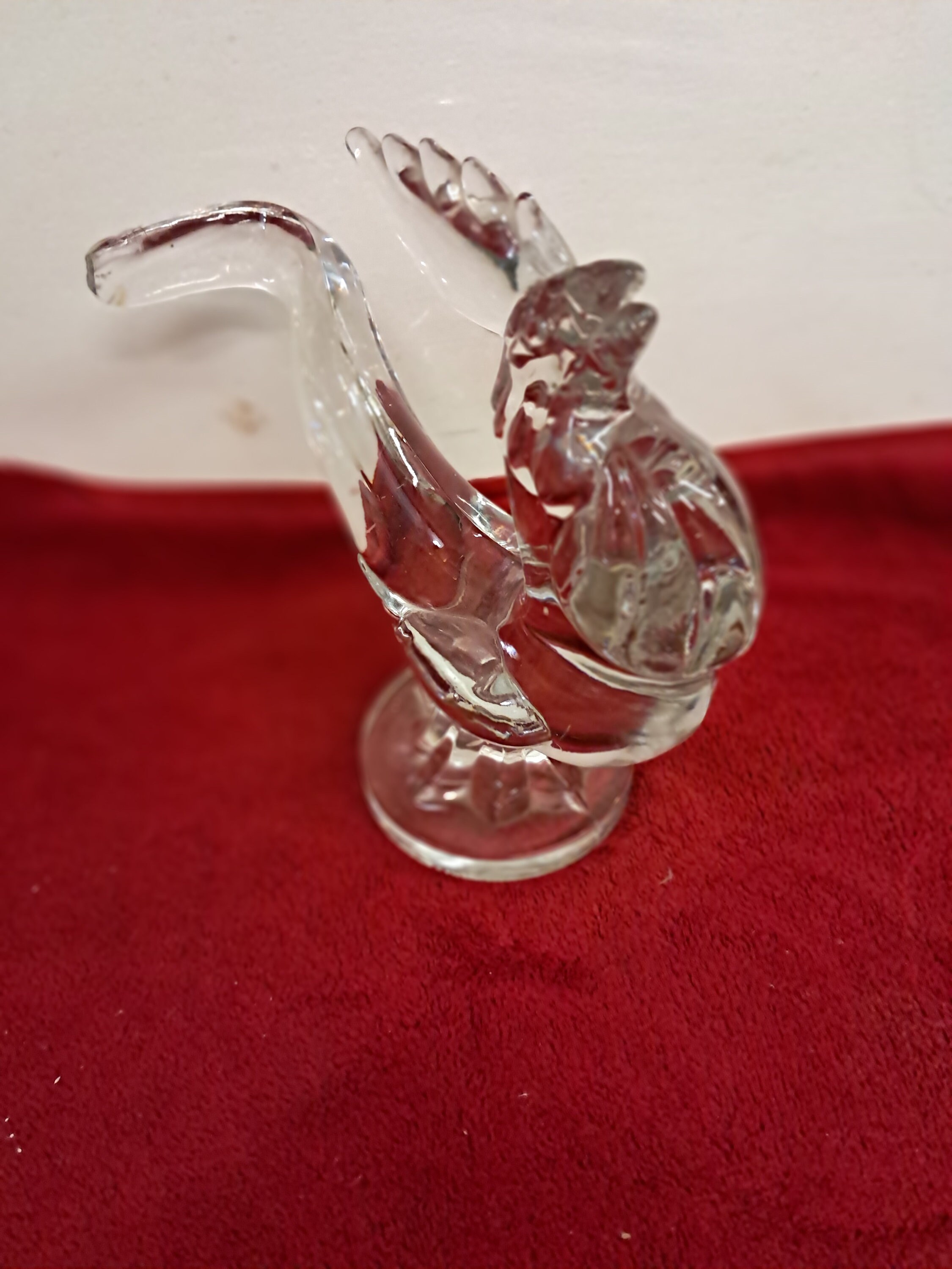 Martinsville Glass Company made the crooked tail rooster in 1951. There are no chips or cracks in the glass.WEIGHT 2.5LBSMEASURMENTS:8"wide x 7.5" tall x 3.25" deepPerfect Condition Thanks for looking.