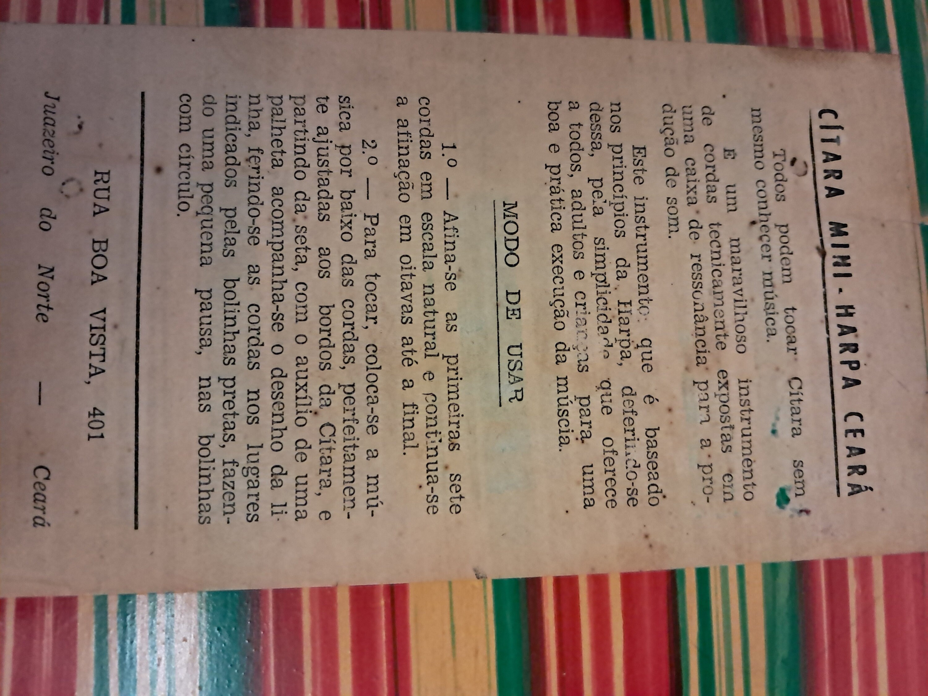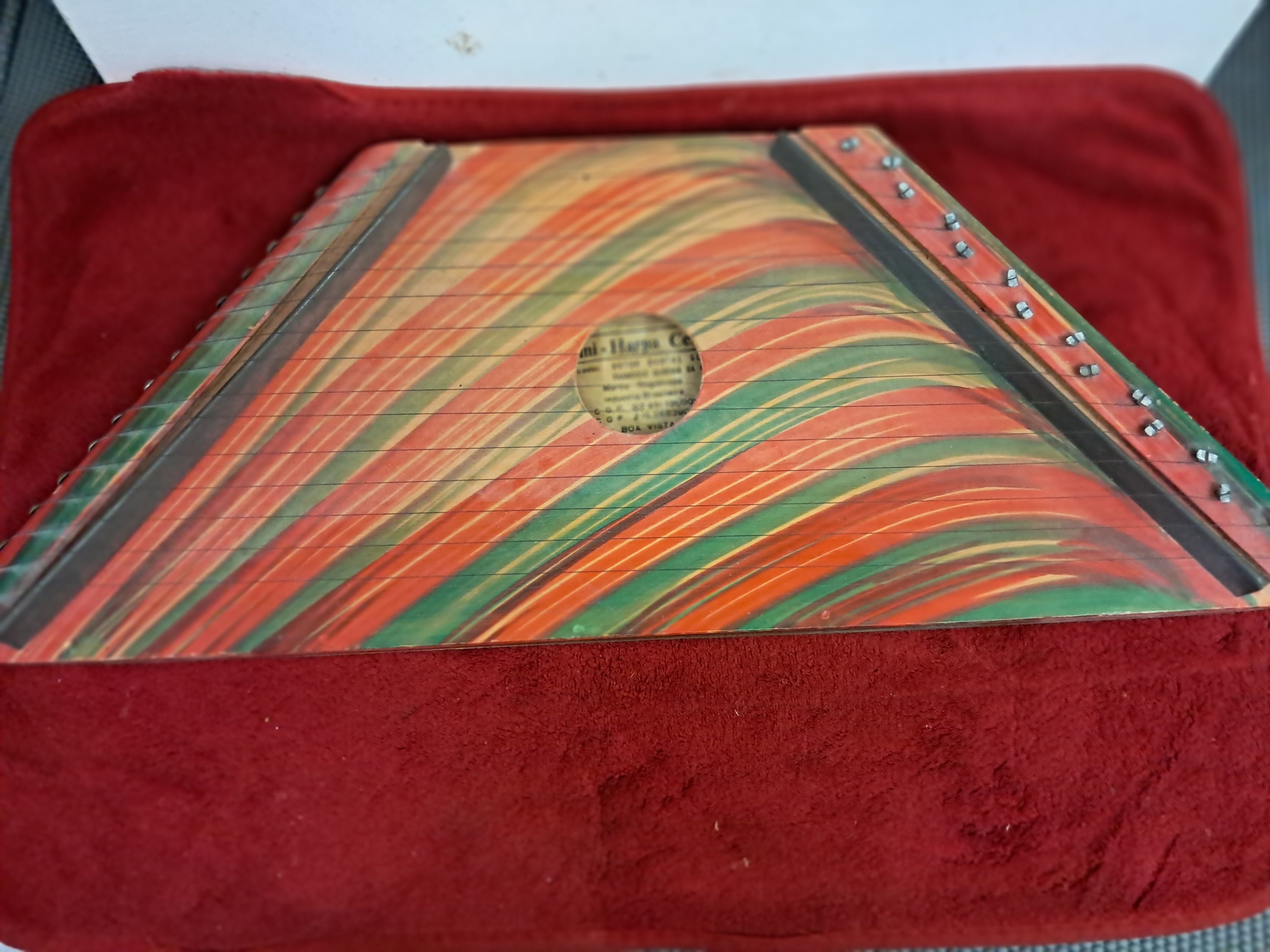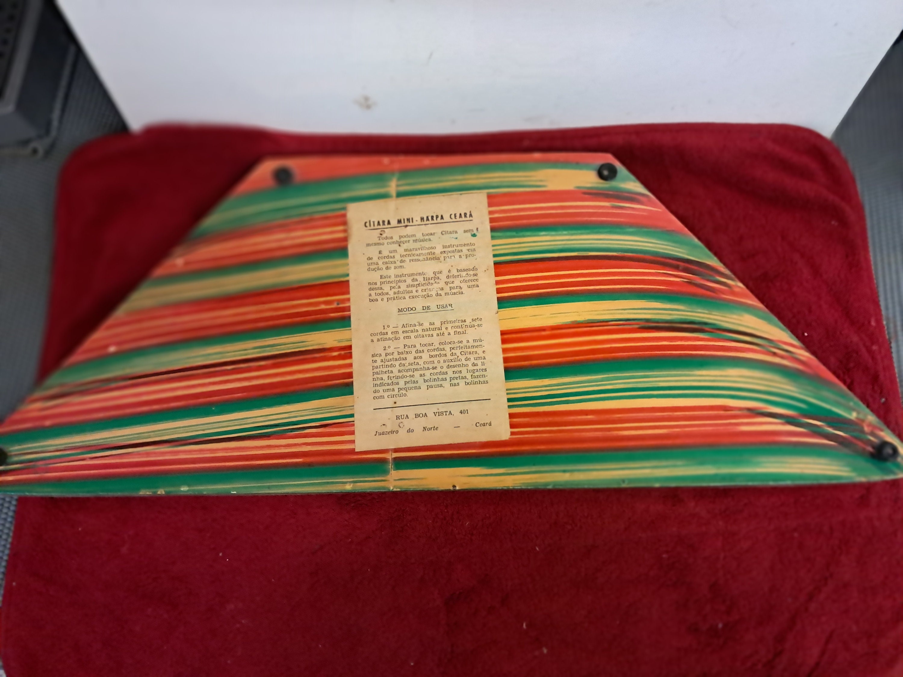 vintage Citara Mini Harpa 15-string lap harp made in Brazil in the 1970s by a company owned by two gentlemen by the names of Artur Dantas and João Moreira. It’s definitely nothing fancy, but it is a fun little instrument that is still tunable and playable even though it is a bit worn. Sale includes this mini lap harp and four music sheets with 8 songs total.