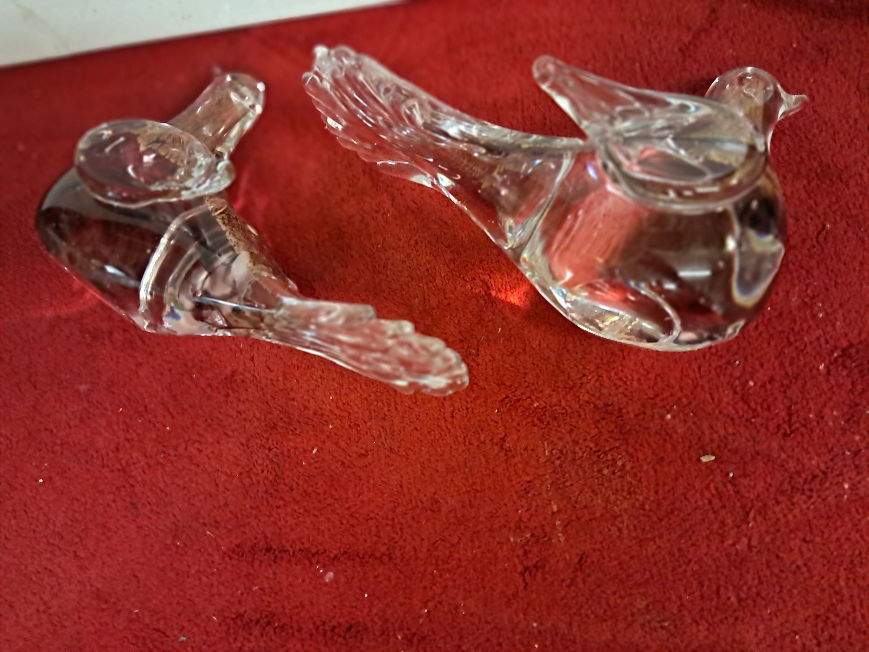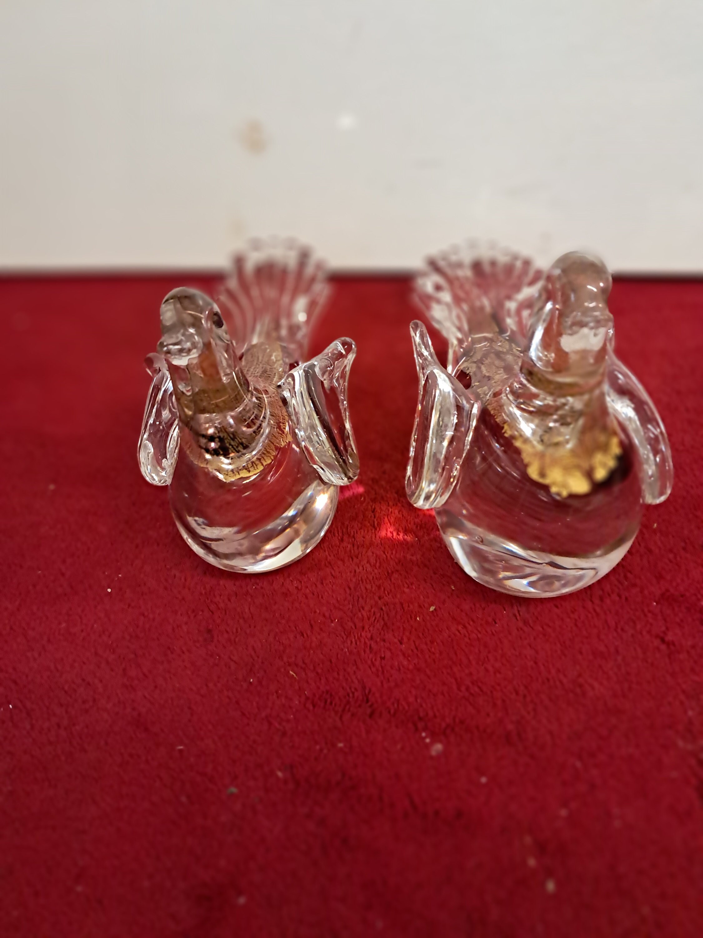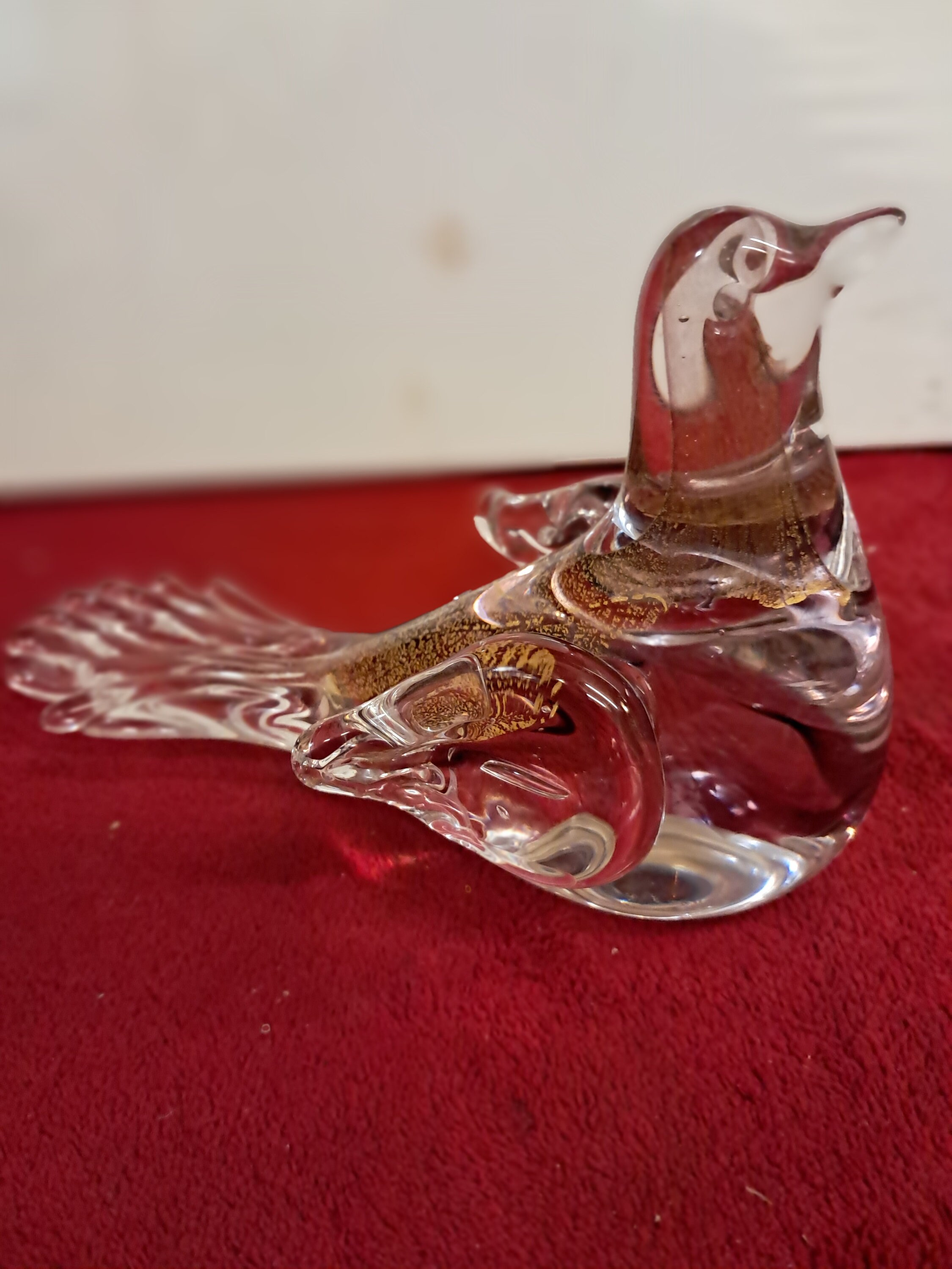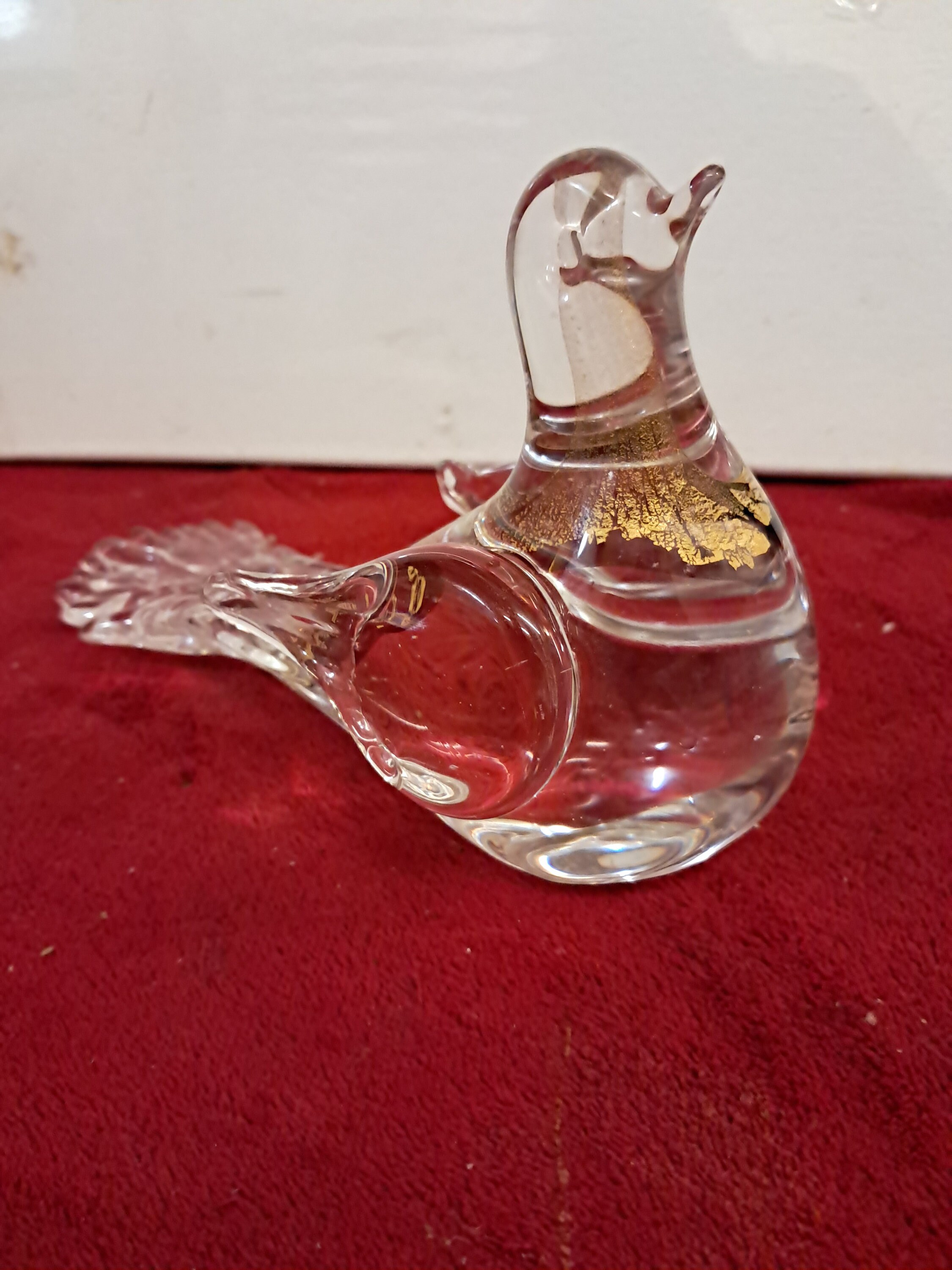 The Fifth Avenue Crystal "Aura" lilac bird with gold flecks is a collectible glass item manufactured in China and distributed by Crystal Clear Industries in New York.