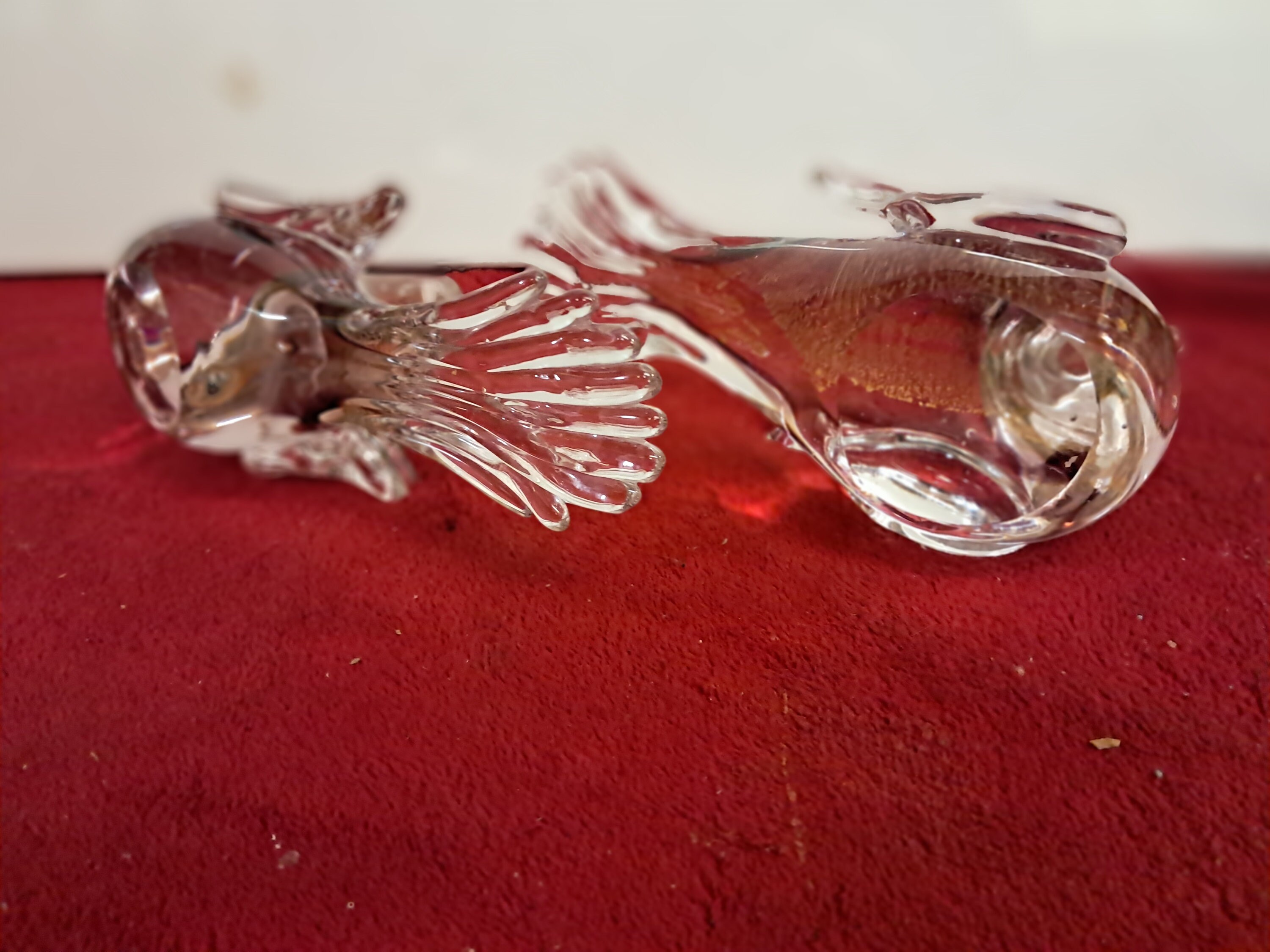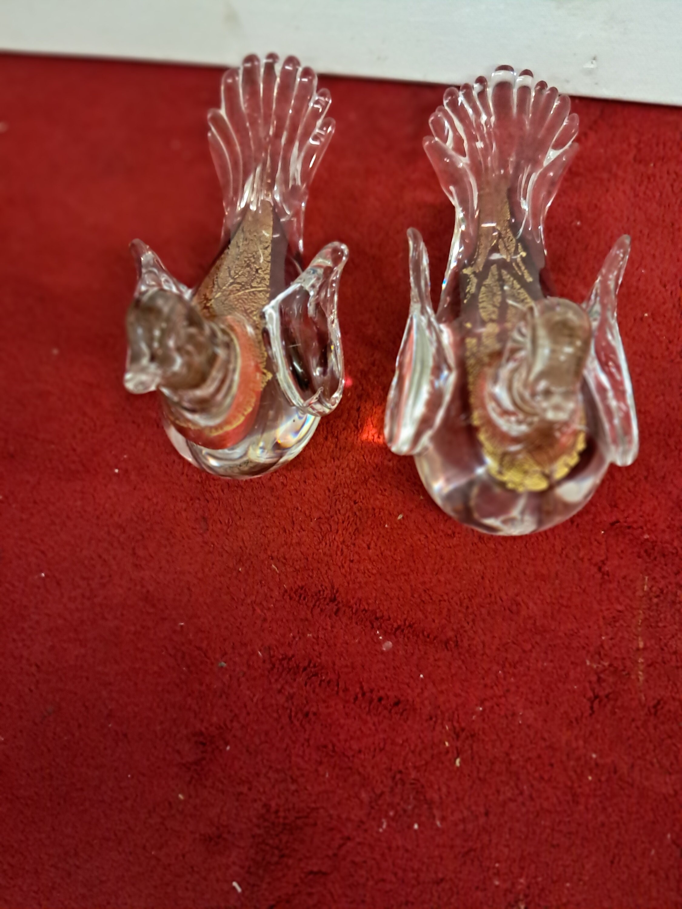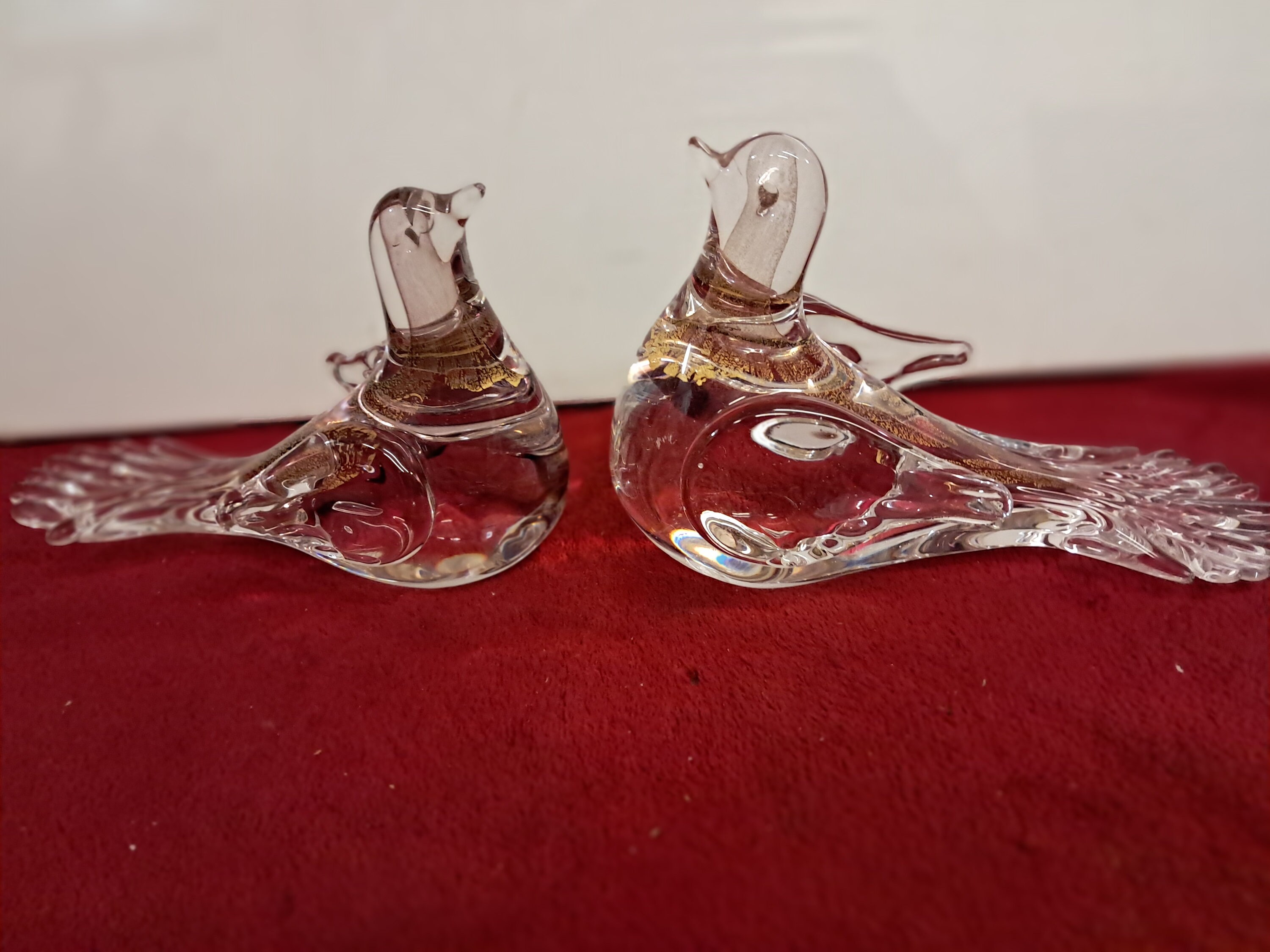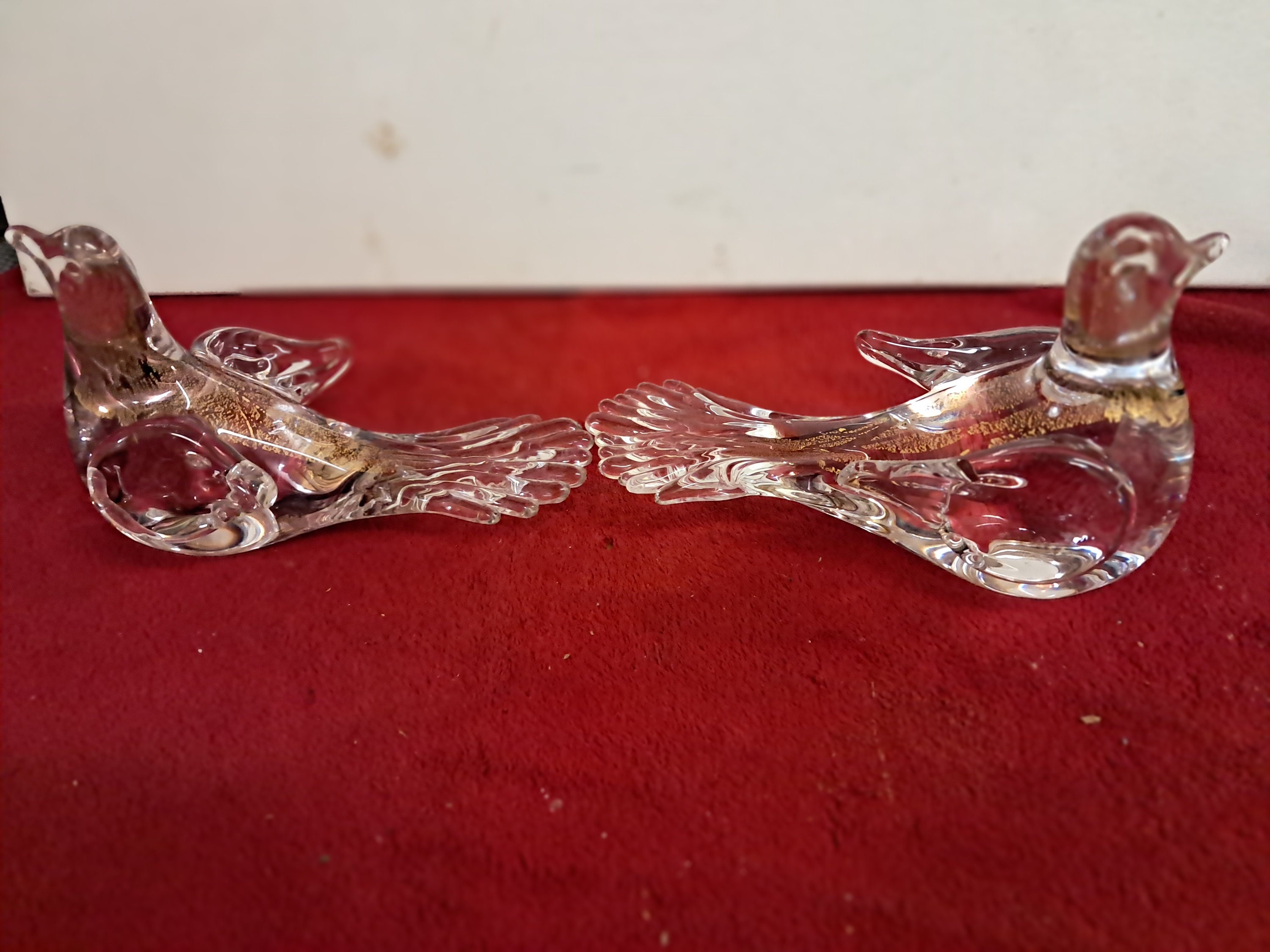 The Fifth Avenue Crystal "Aura" lilac bird with gold flecks is a collectible glass item manufactured in China and distributed by Crystal Clear Industries in New York.