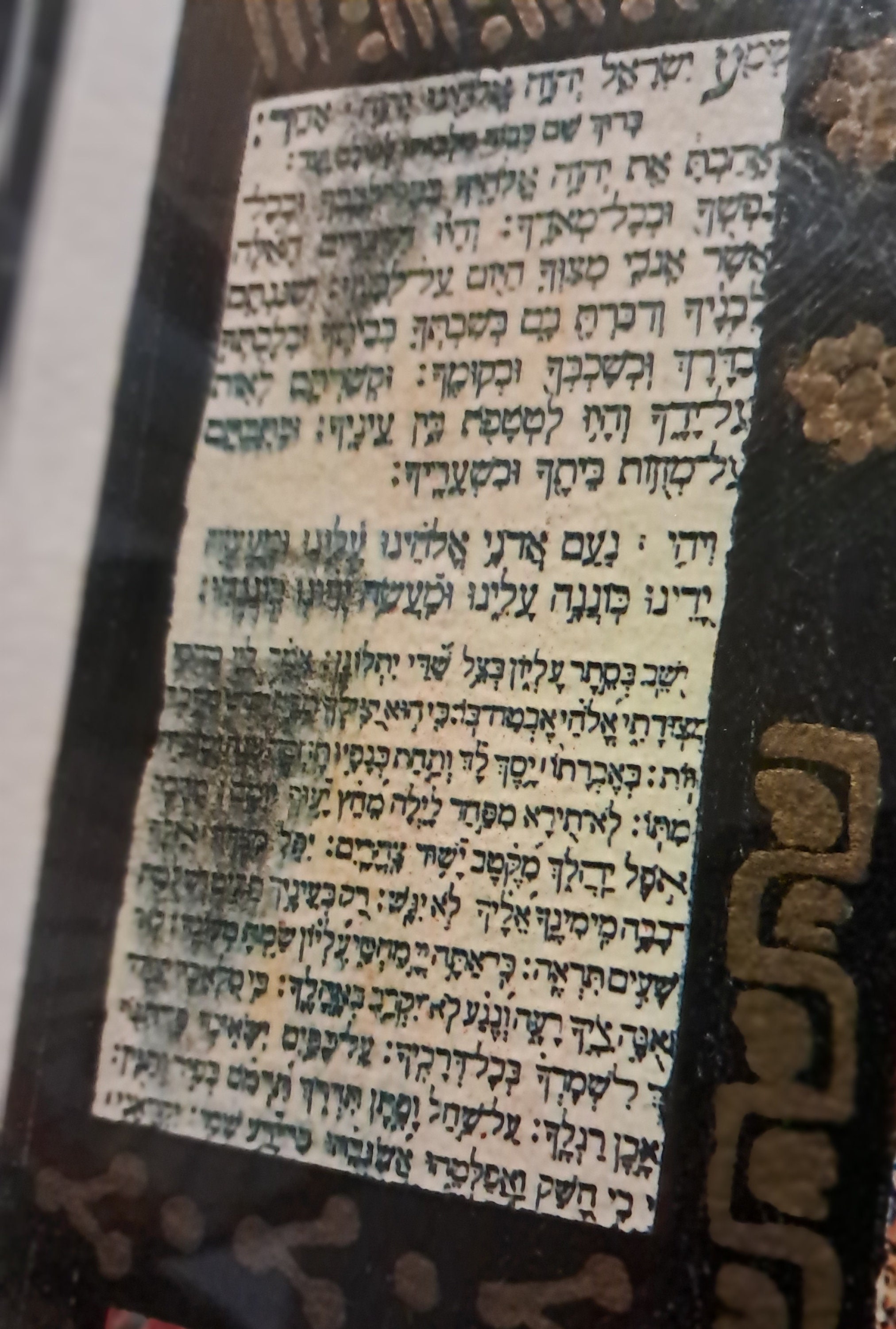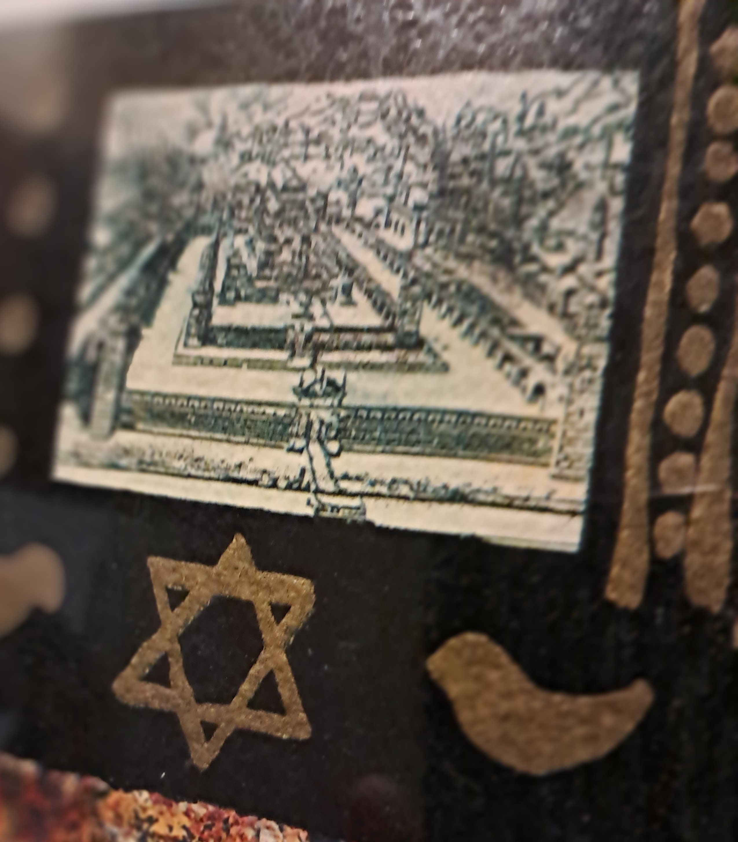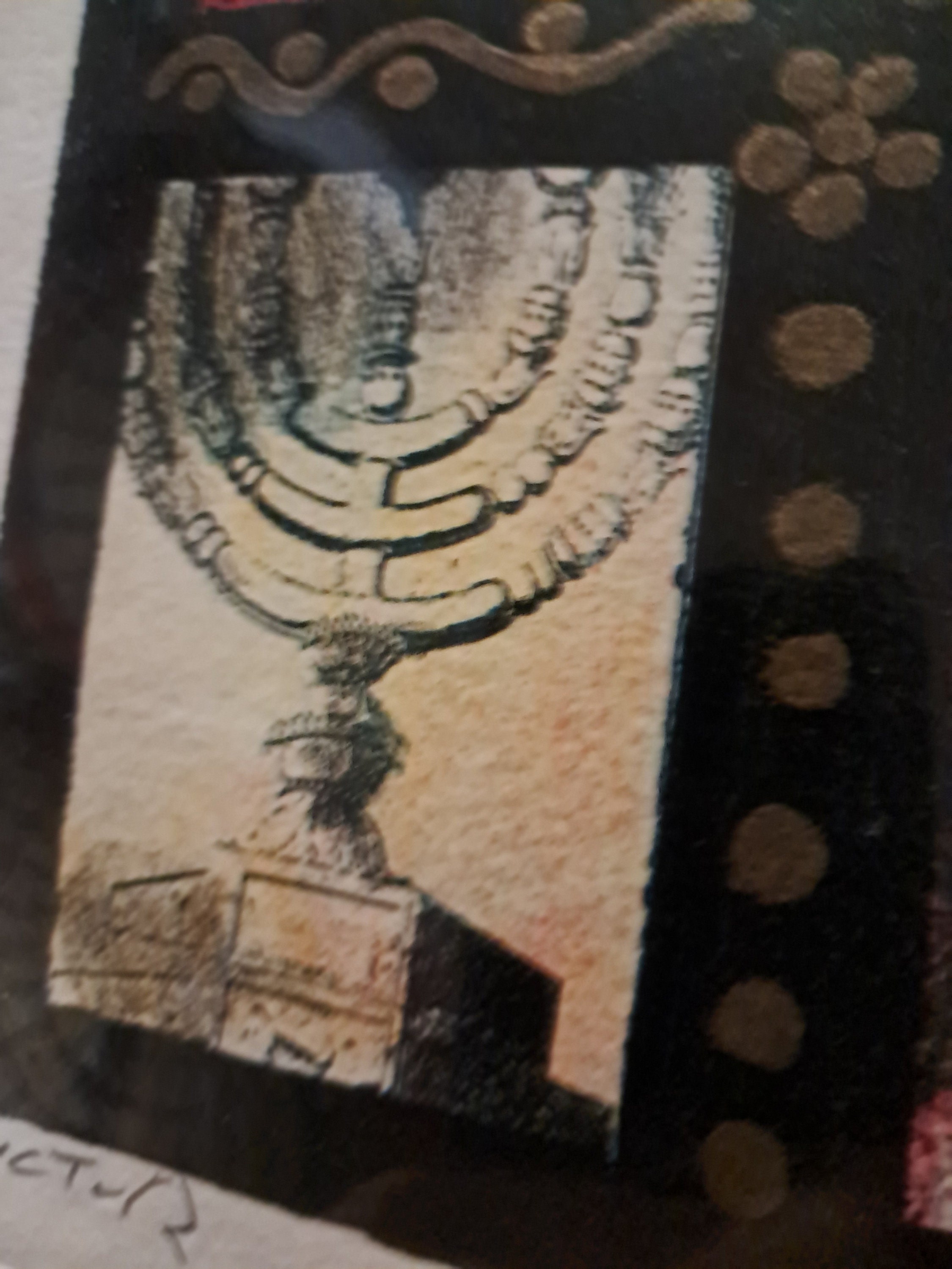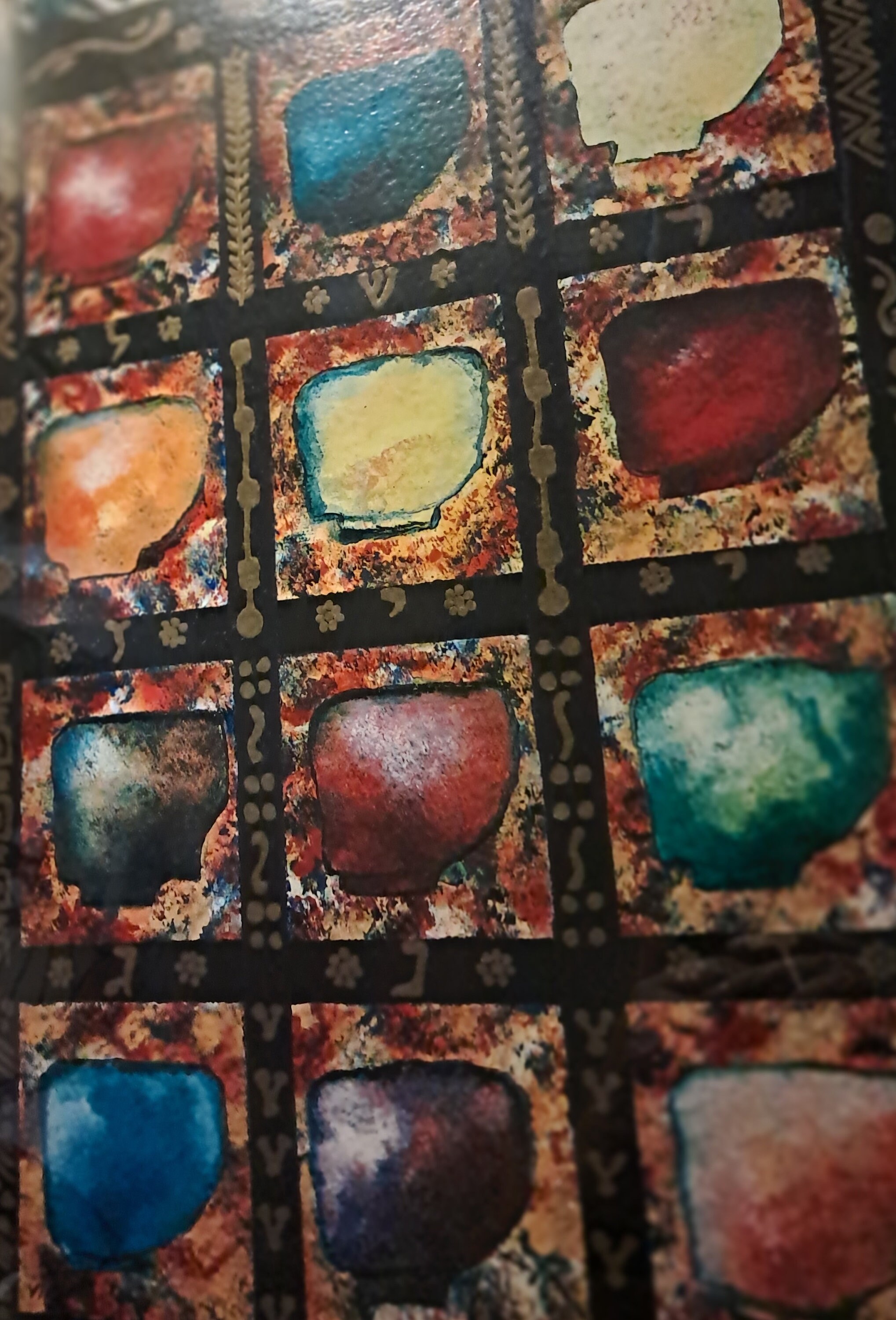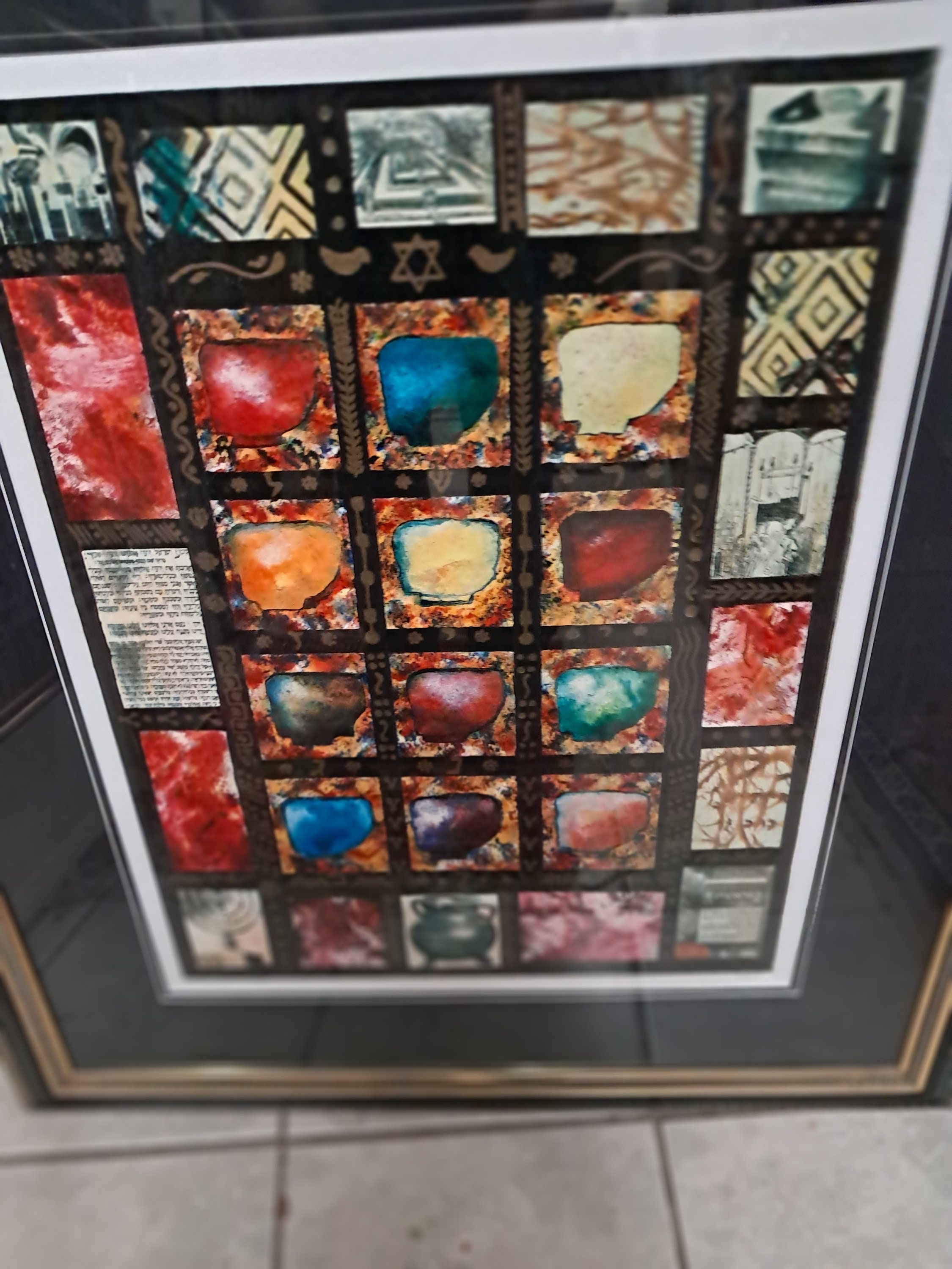 This stunning serigraph is based on the Hoshen - breastplate - worn by the High Priest in the Temple. It has twelve different colored stones: each one represents one of the twelve tribes. They are set on a firy yellow-red background, which is in turn set on a deep blue-black and decorated with a range of Jewish symbols and decorative motis. It is surrounded by a stained glass window-esque array of decorative panels filled with Jewish and Hebrew images.