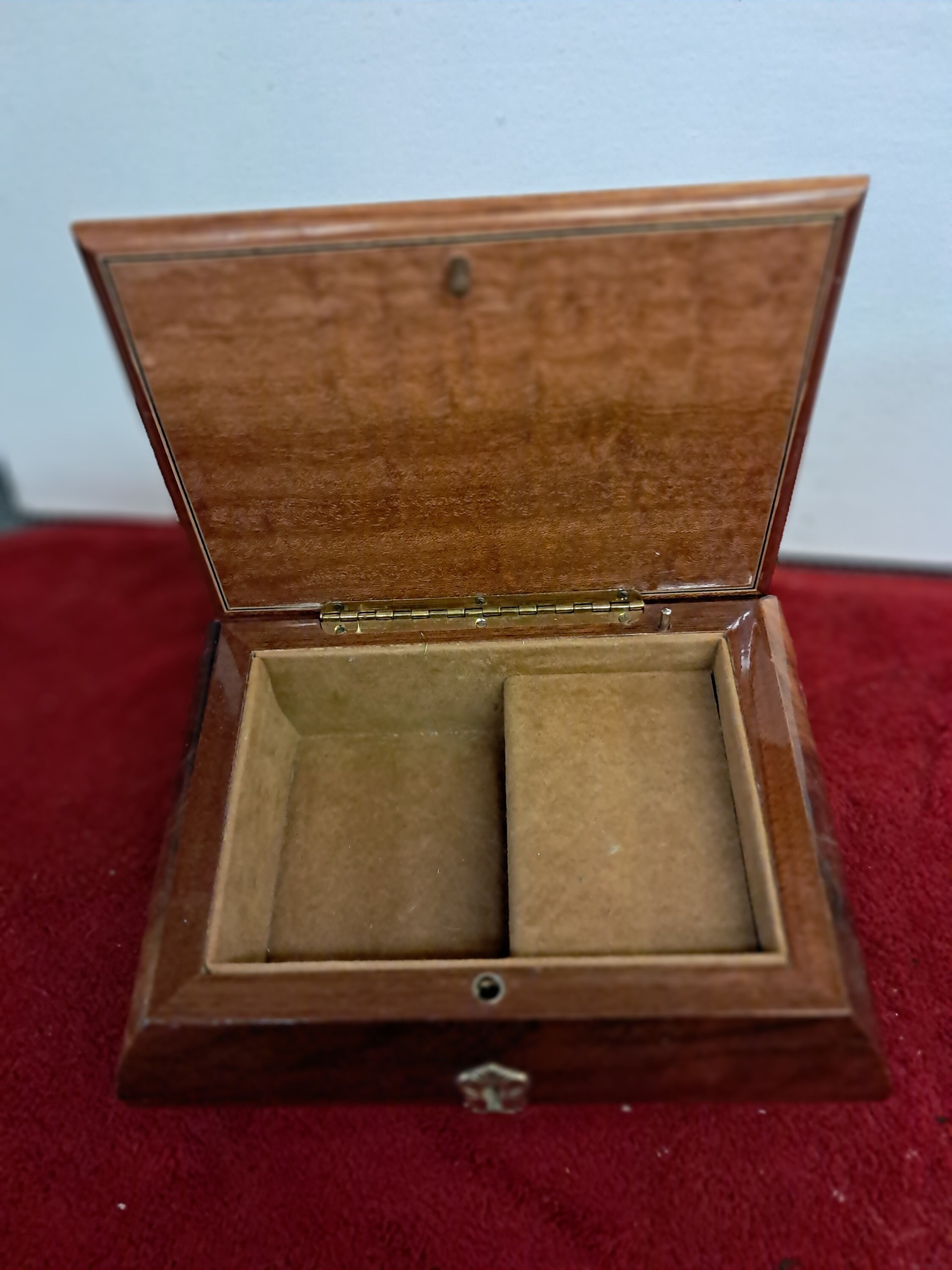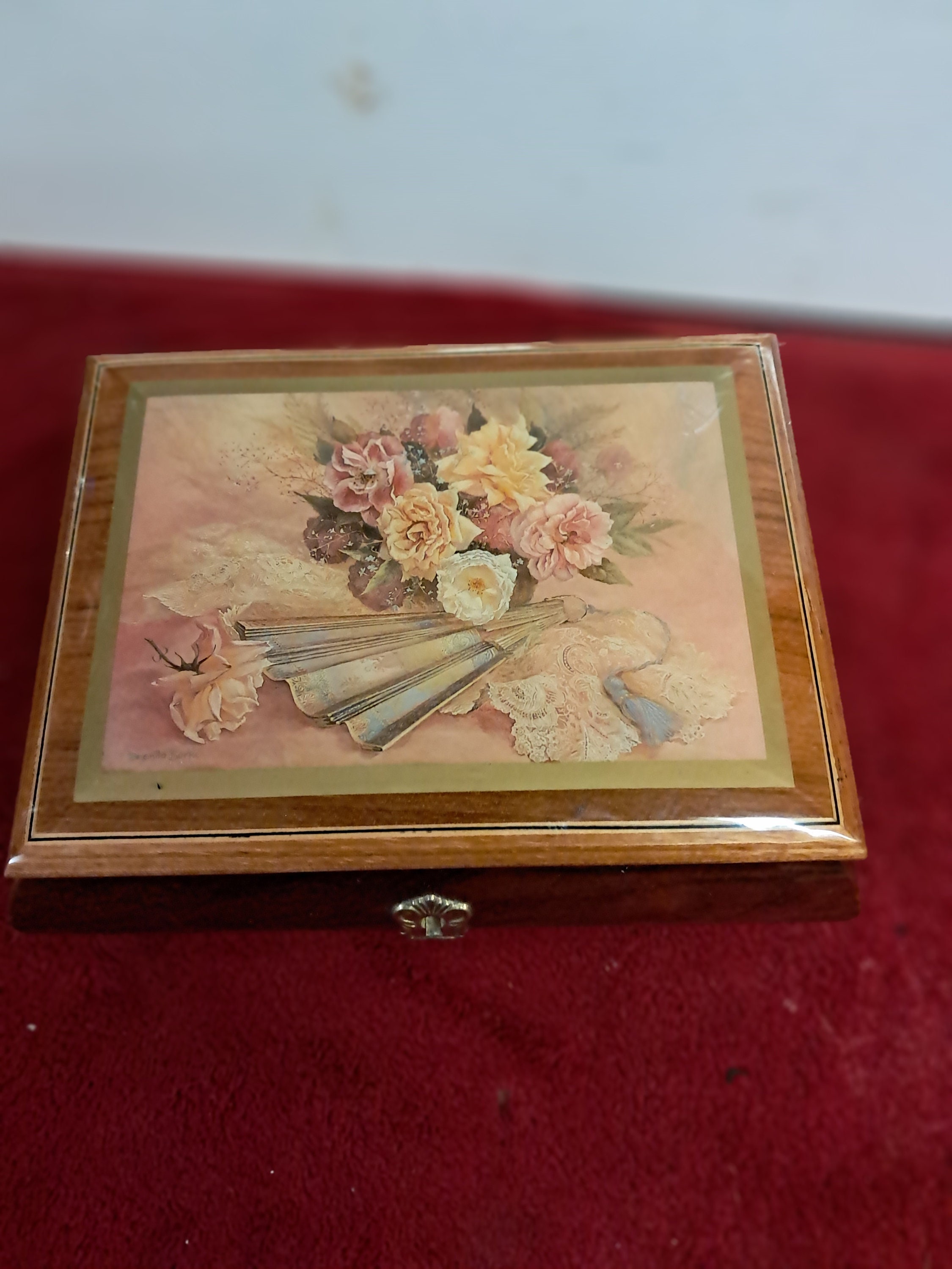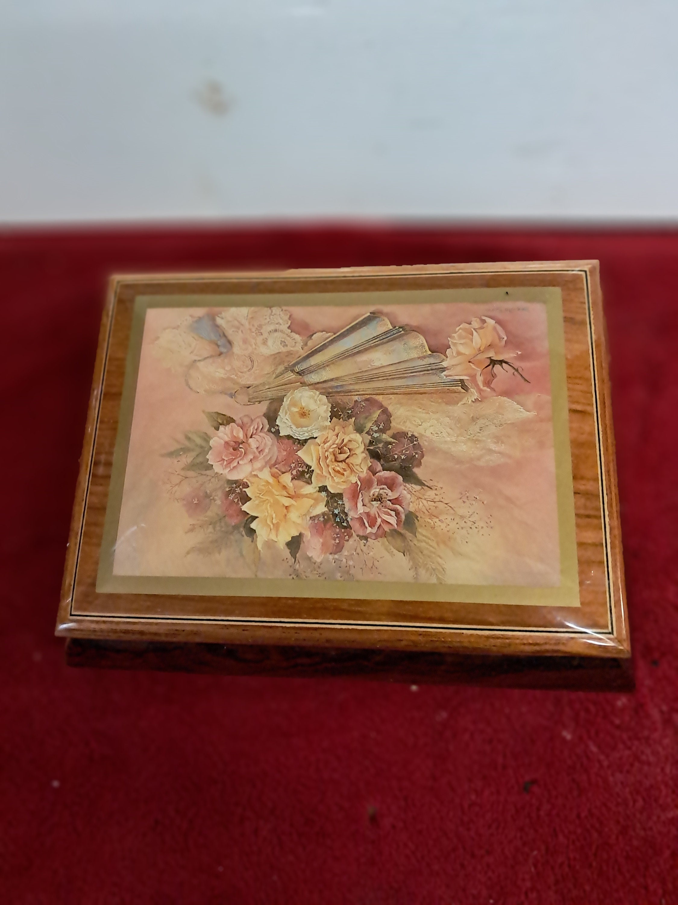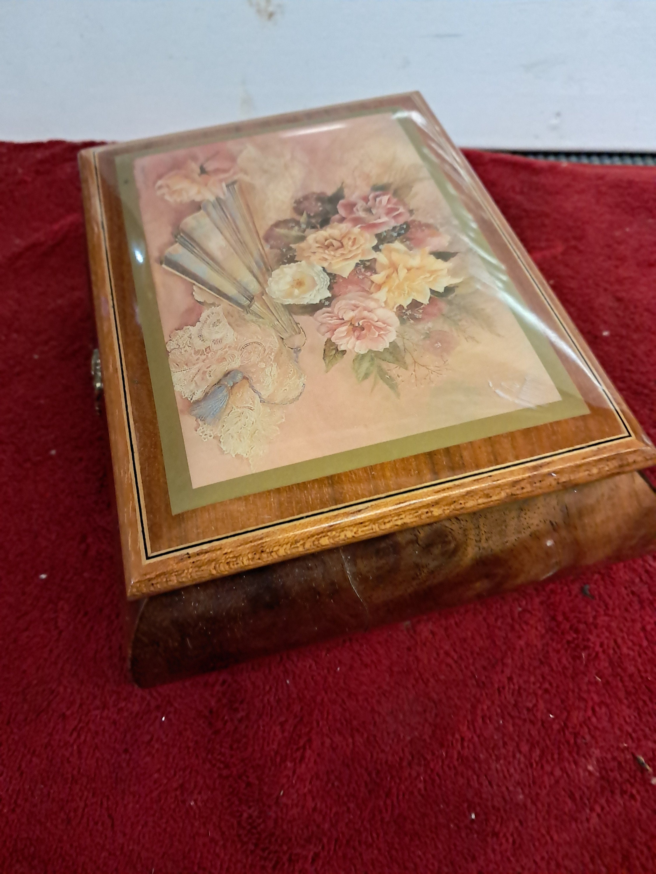 Elegant footed wooden music box with top finely hand painted and inlaid with foliages floral decor..