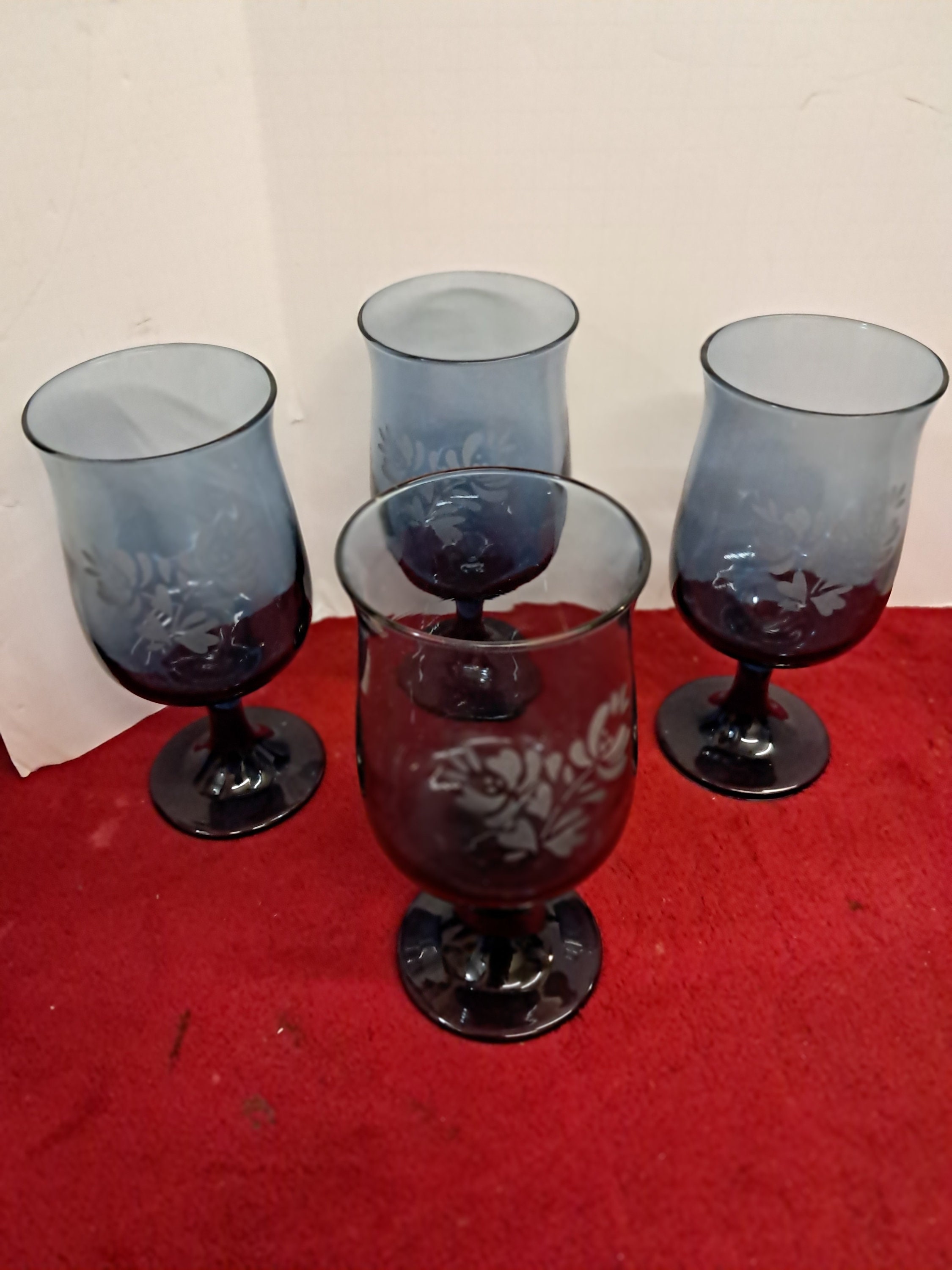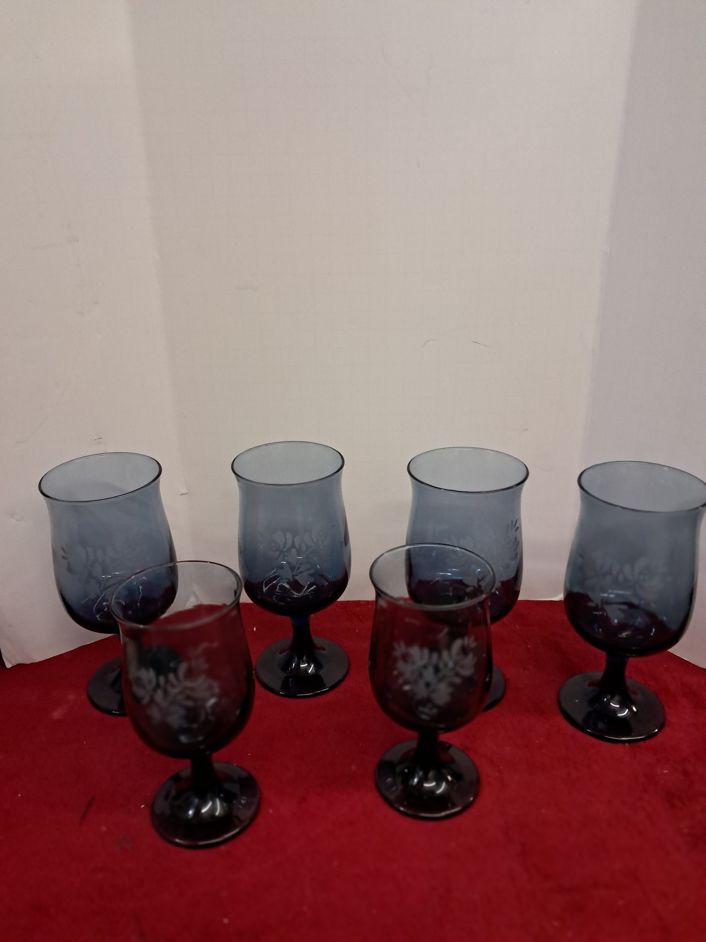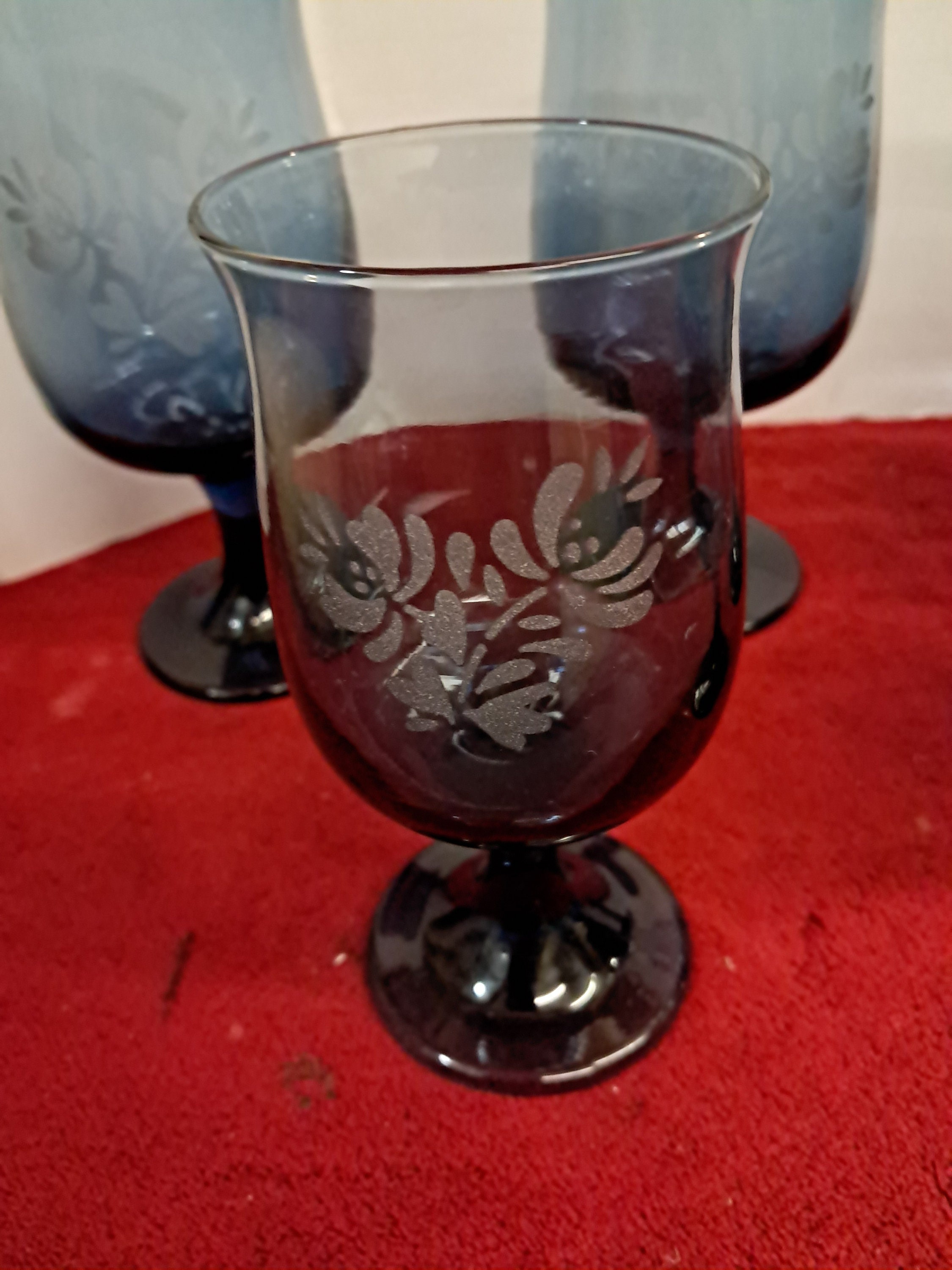 Set 6 Pfaltzgraff Blue Wine Glasses. Floral Etchings, Four 8 oz & Two 4 oz