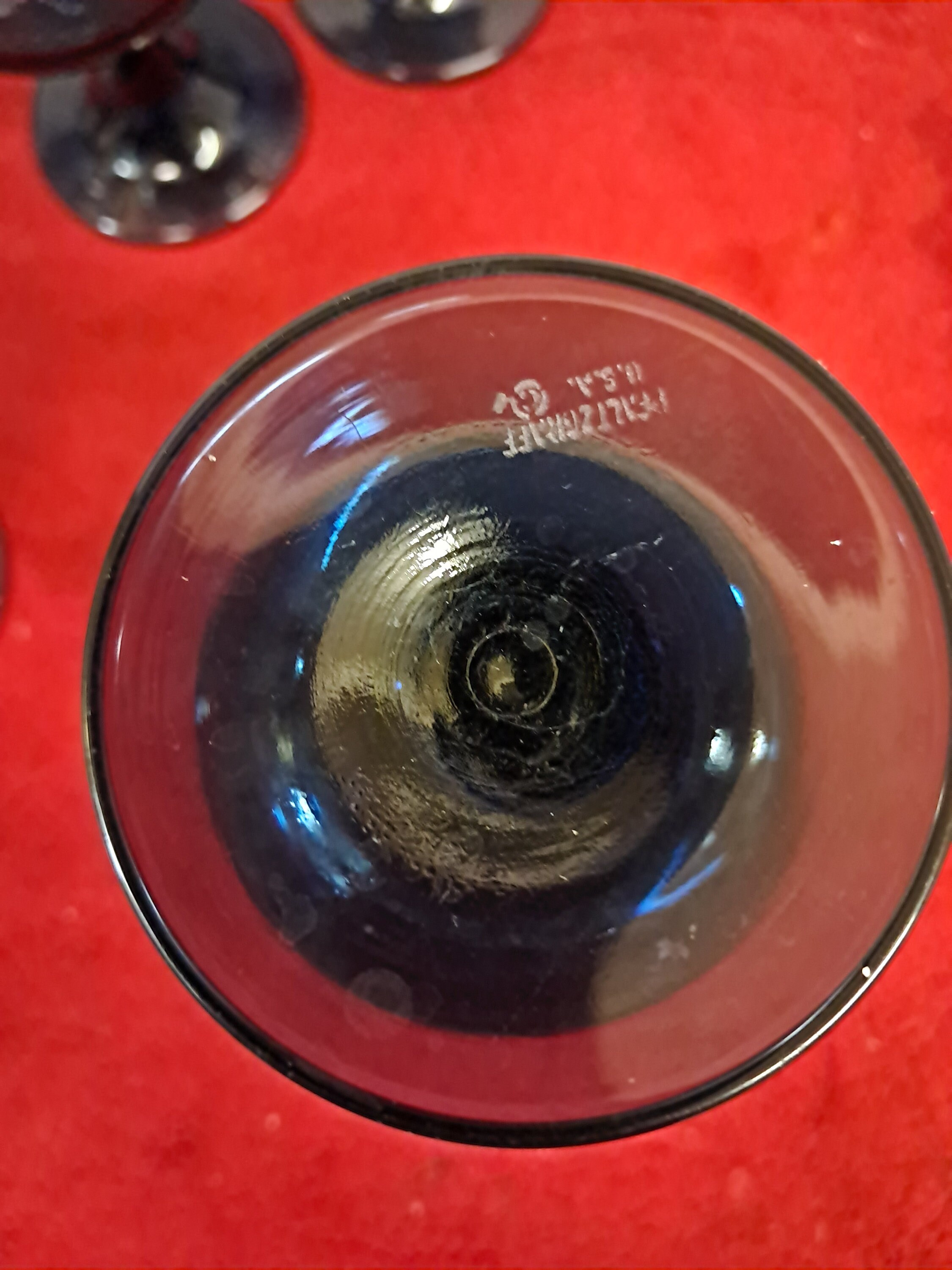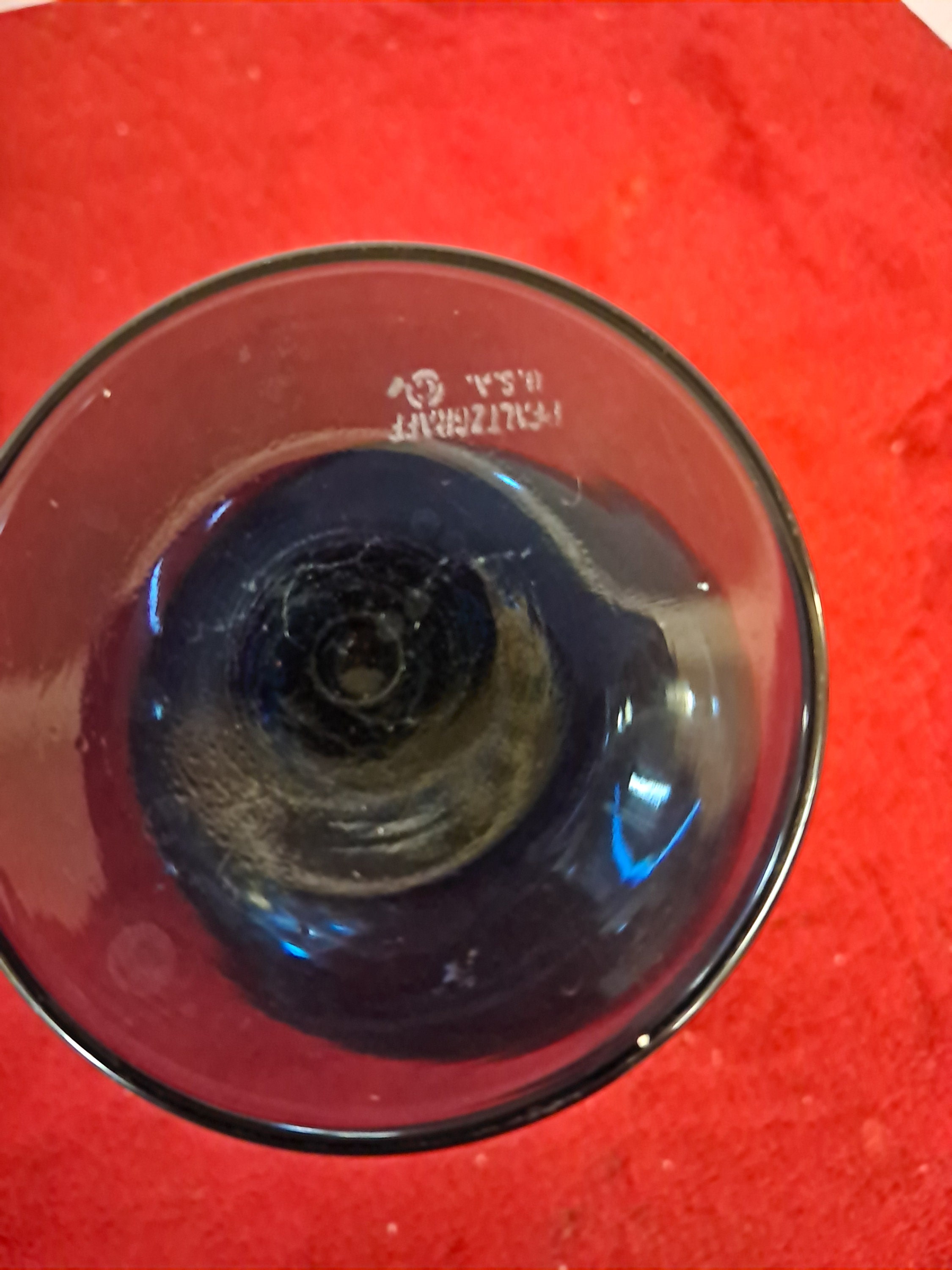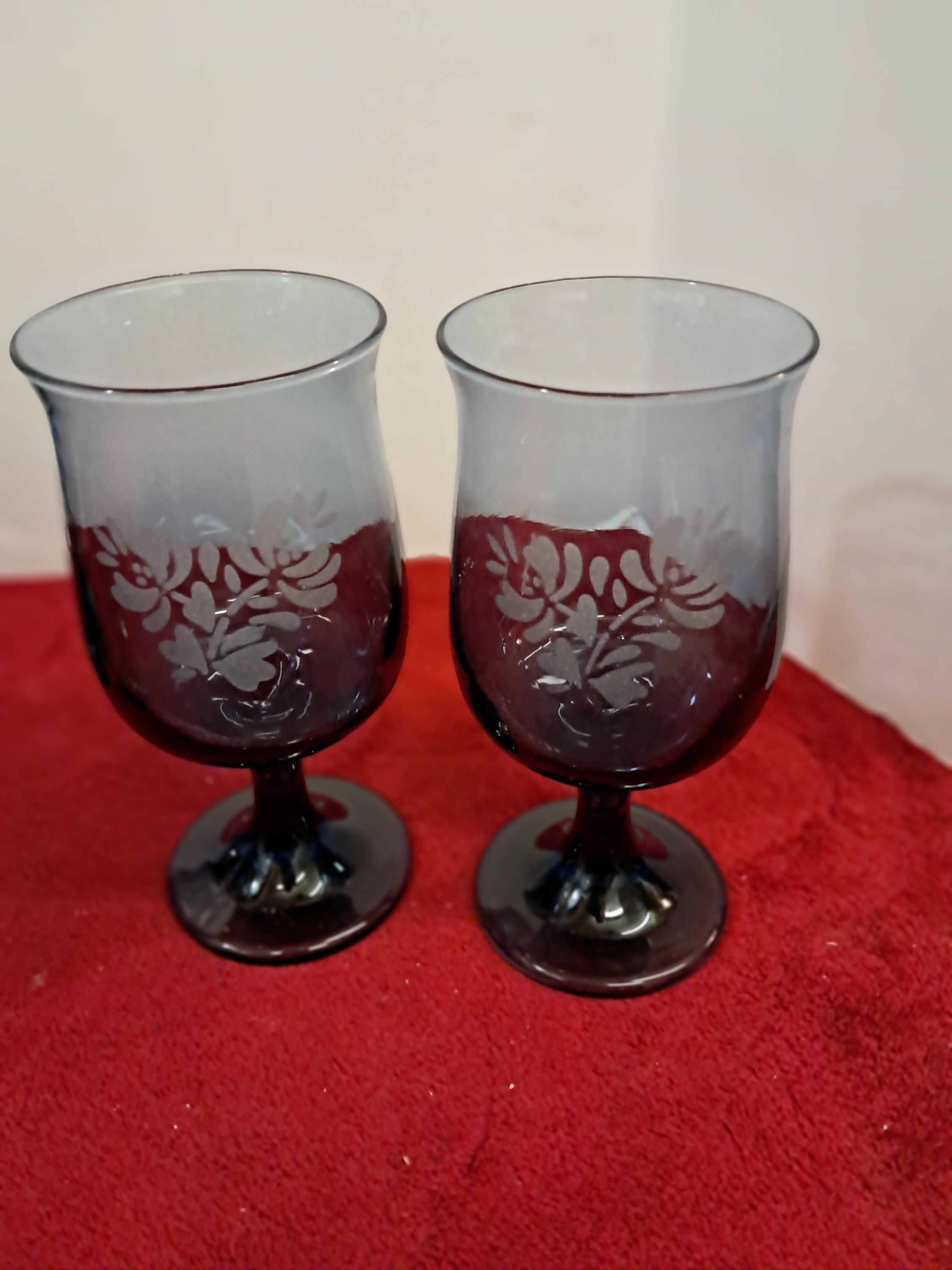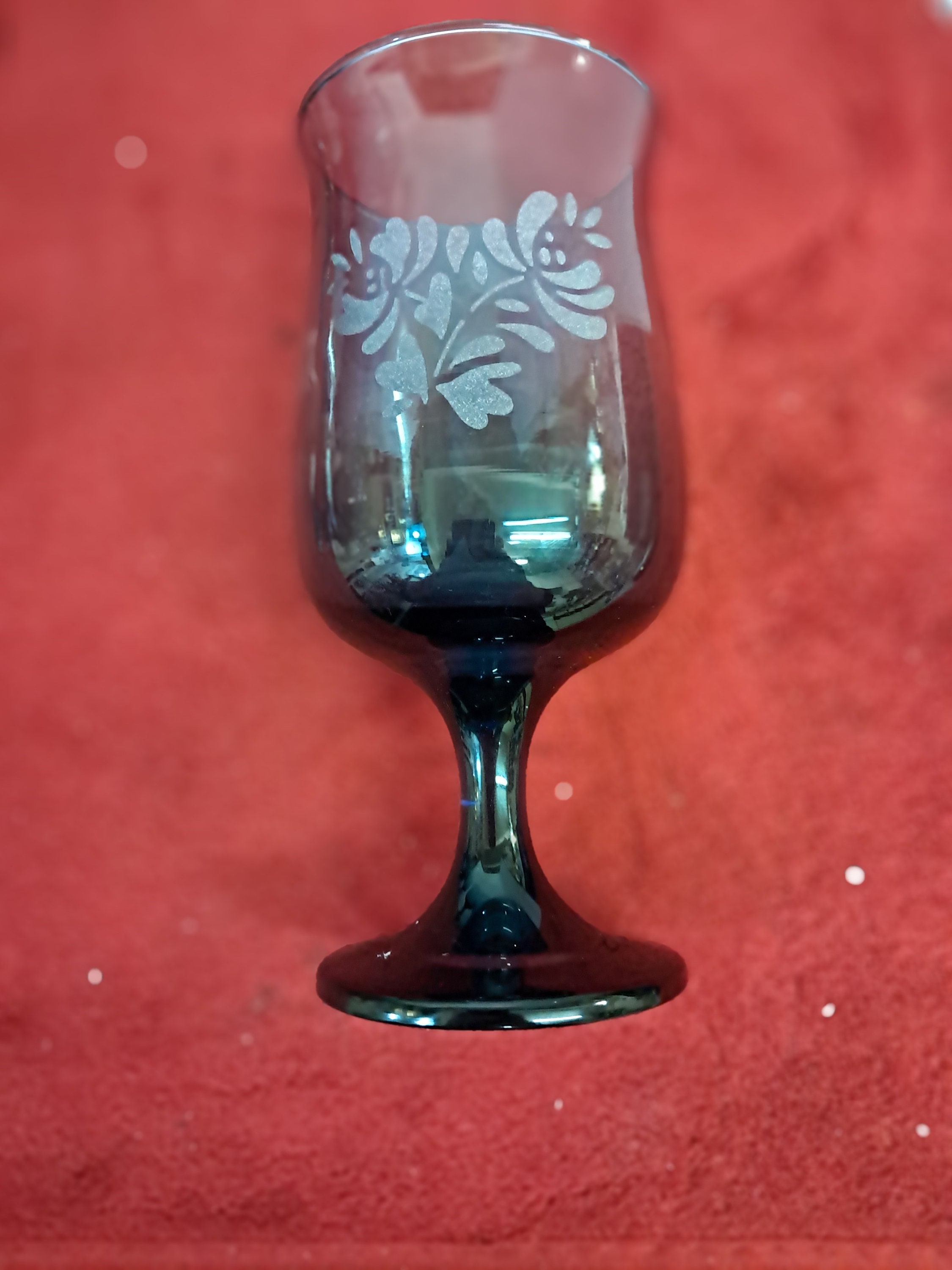 Set 6 Pfaltzgraff Blue Wine Glasses. Floral Etchings, Four 8 oz & Two 4 oz