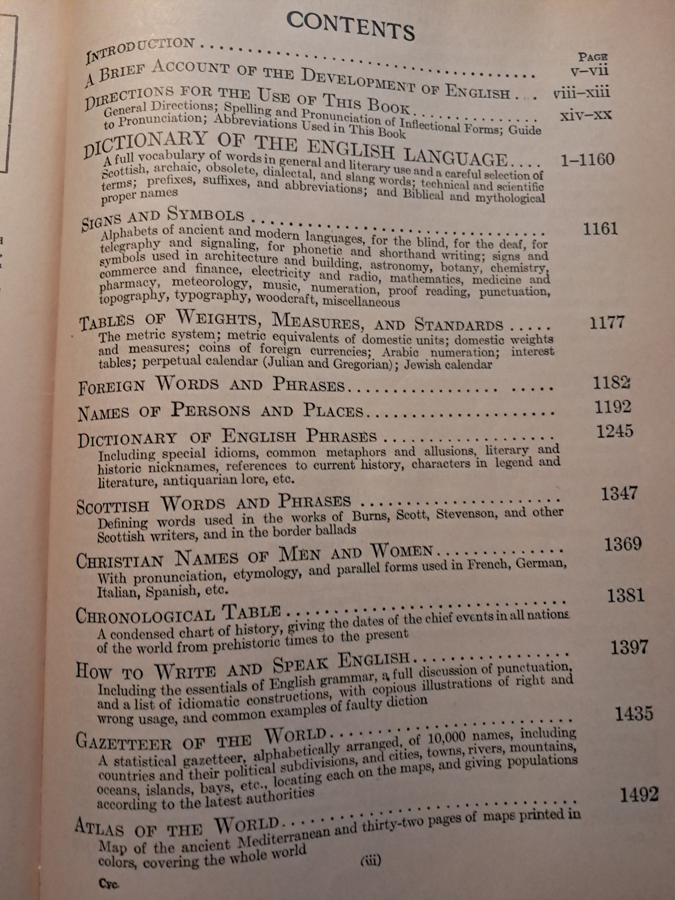 John C. Winston Company published the 9th Edition of The Winston Universal Reference Library in English in 1934. At 1524 pages, this world gazetteer includes charts, maps, lists of English and Scottish words and phrases, Christian name etymology, and a chronological table from prehistory to 1933. It also includes signs and symbols from diverse disciplines. Illustrations are in color and black and white, with a color frontispiece.
