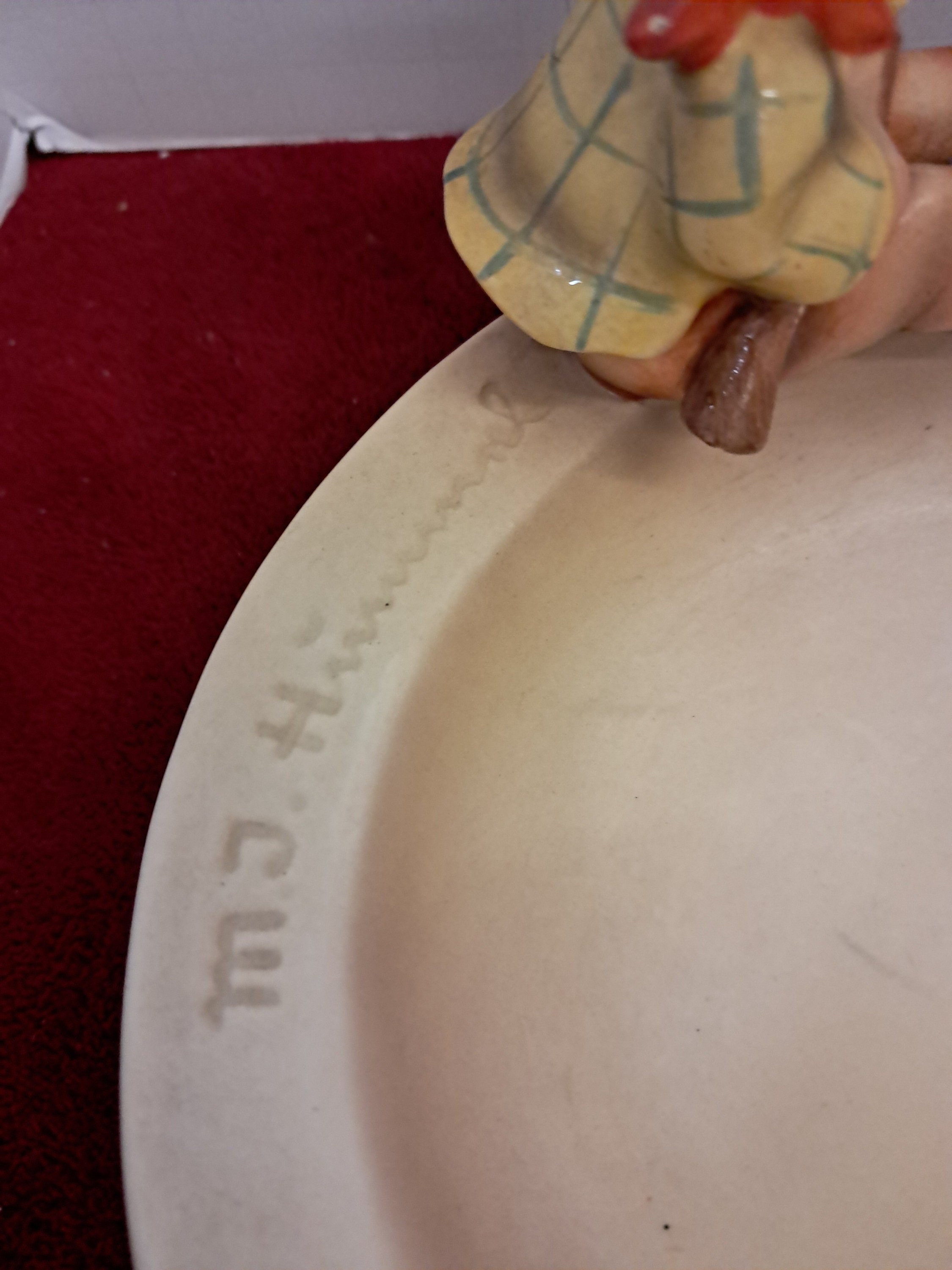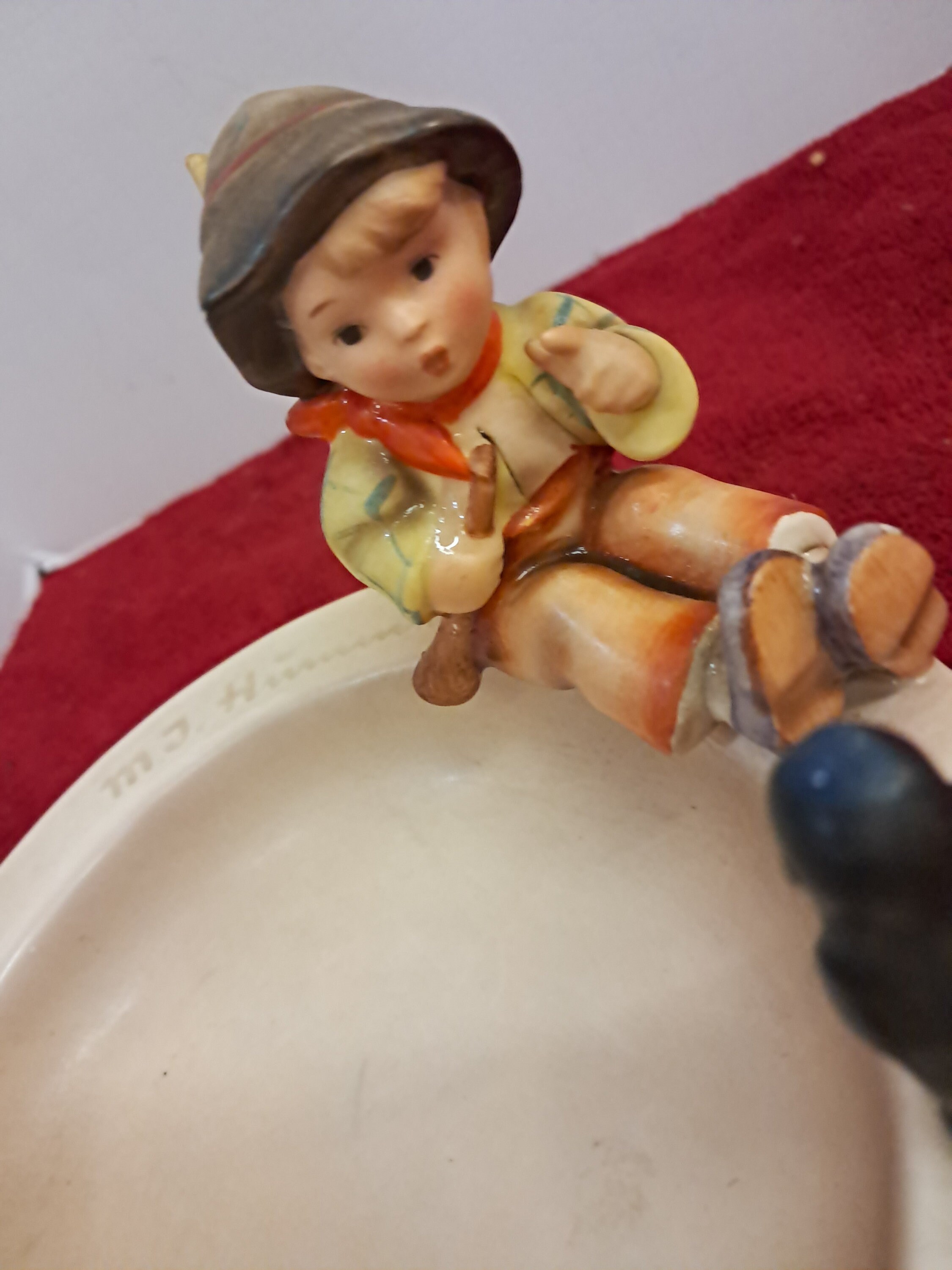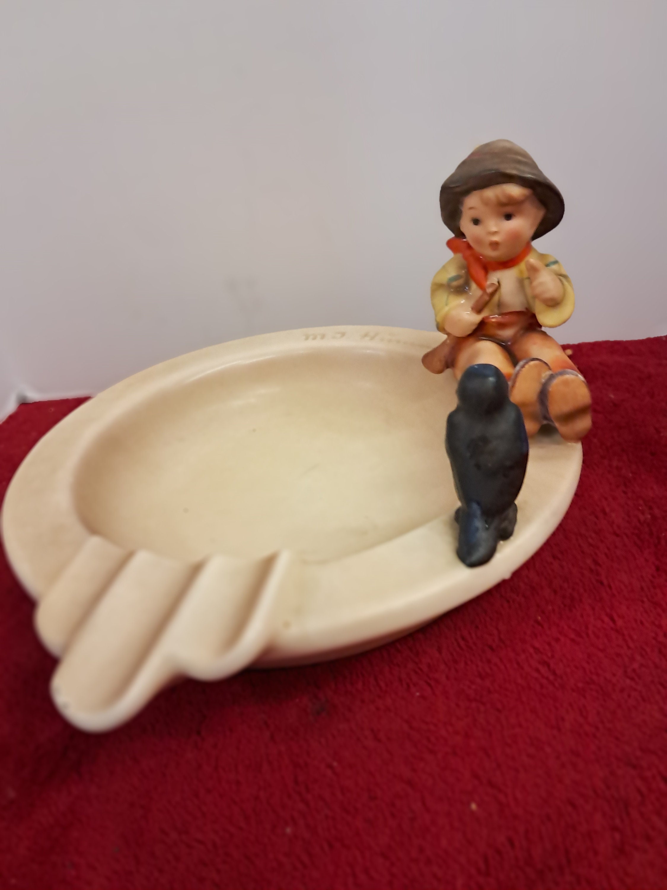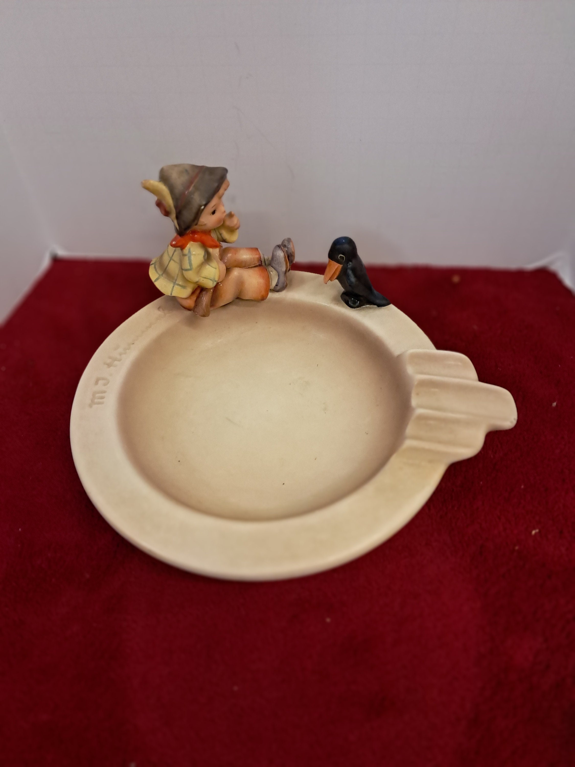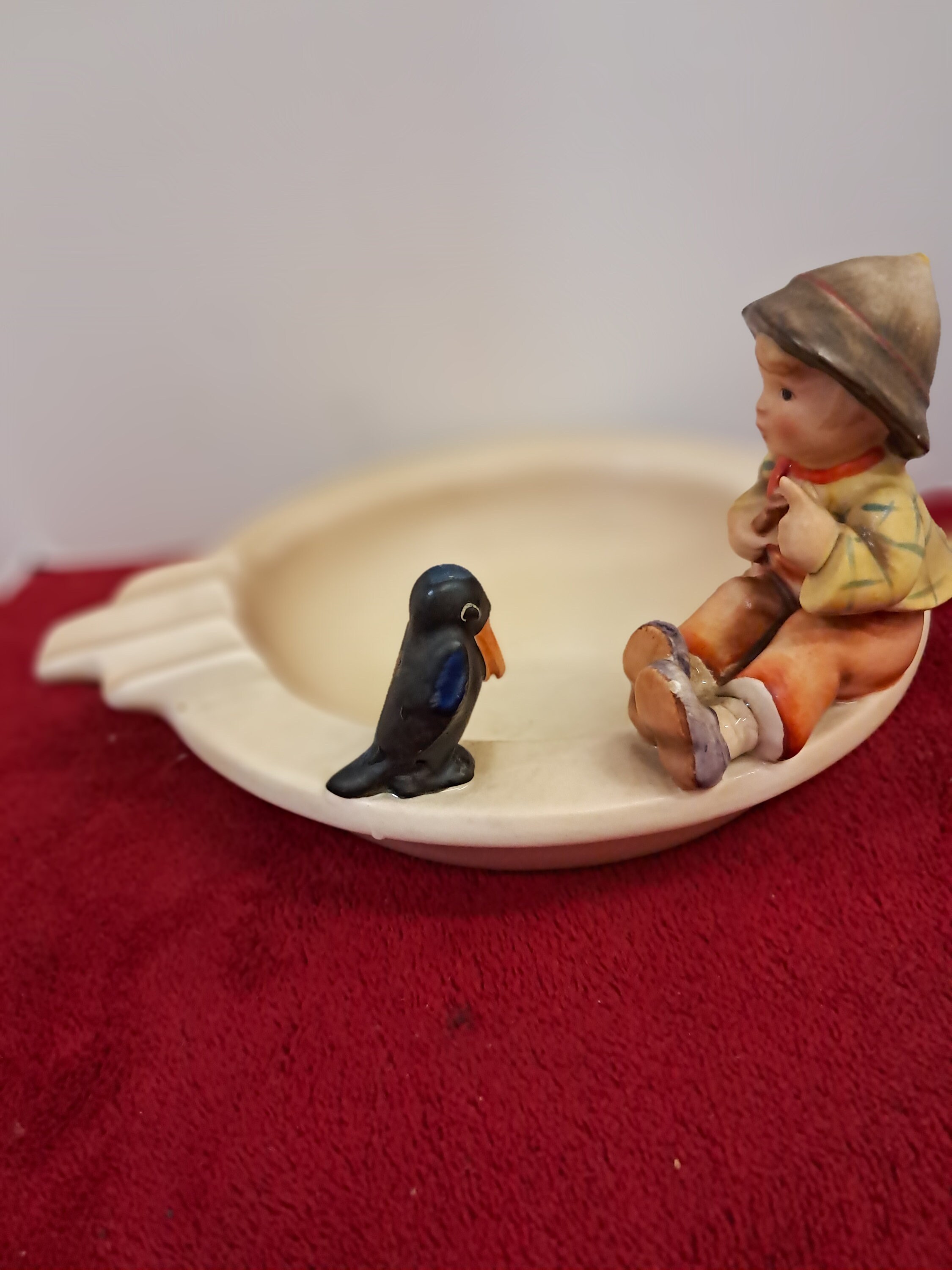 For sale M.J. Hummel Singing Lesson Ashtray Boy w/ Bird Vintage W. Germany Rare. Pre-owned very good condition without any chips or repairs. Visible crazing as shown in my photos. Hand painted, multi colors such as dark blue, black, purple, yellow, orange, light brown and cream. Measures 3 3/4" tall by 7 1/4" long. Marked on the bottom: Logo, W. Germany . Wonderful addition to any collection. Thanks for looking and good luck!!!