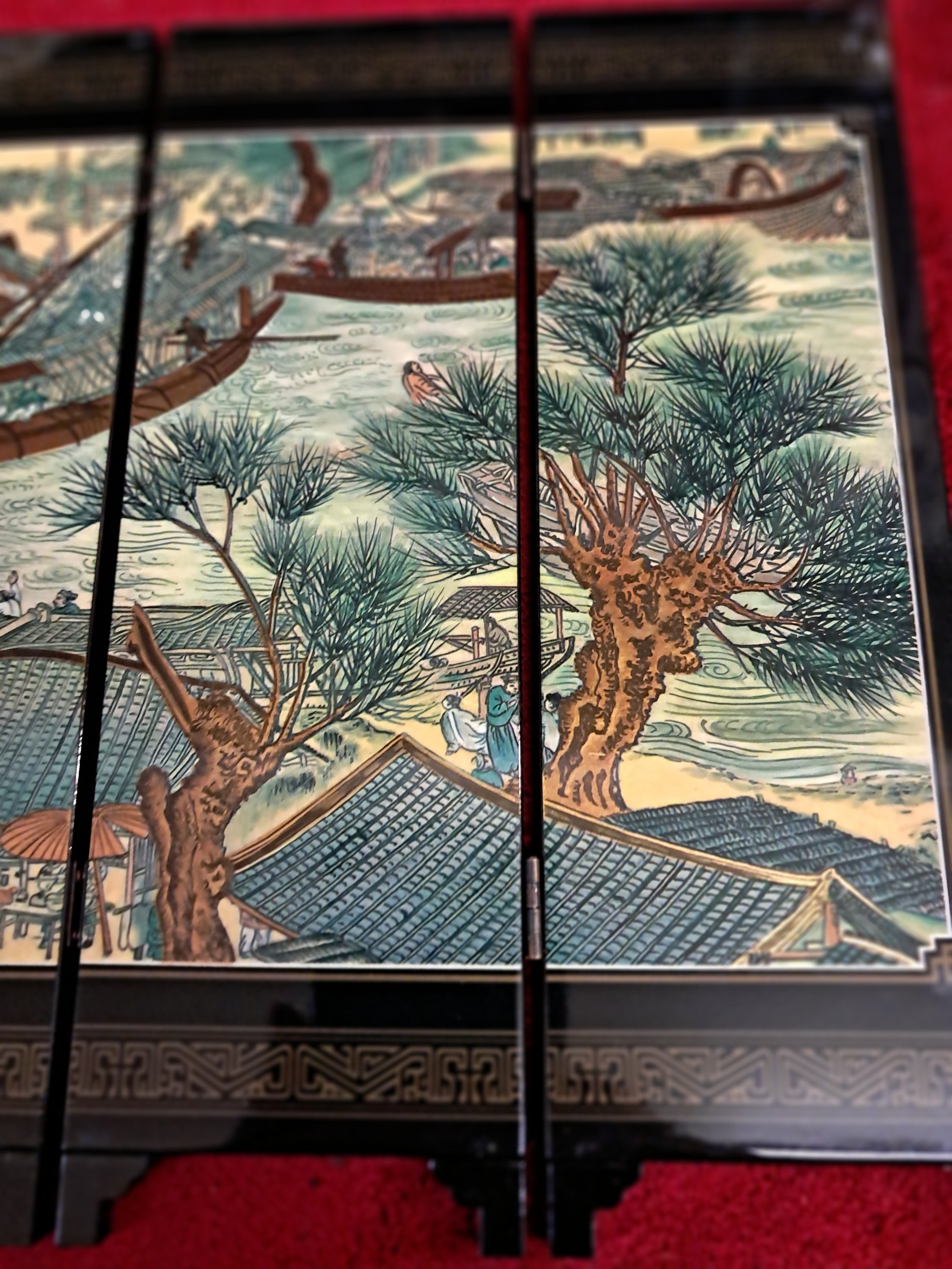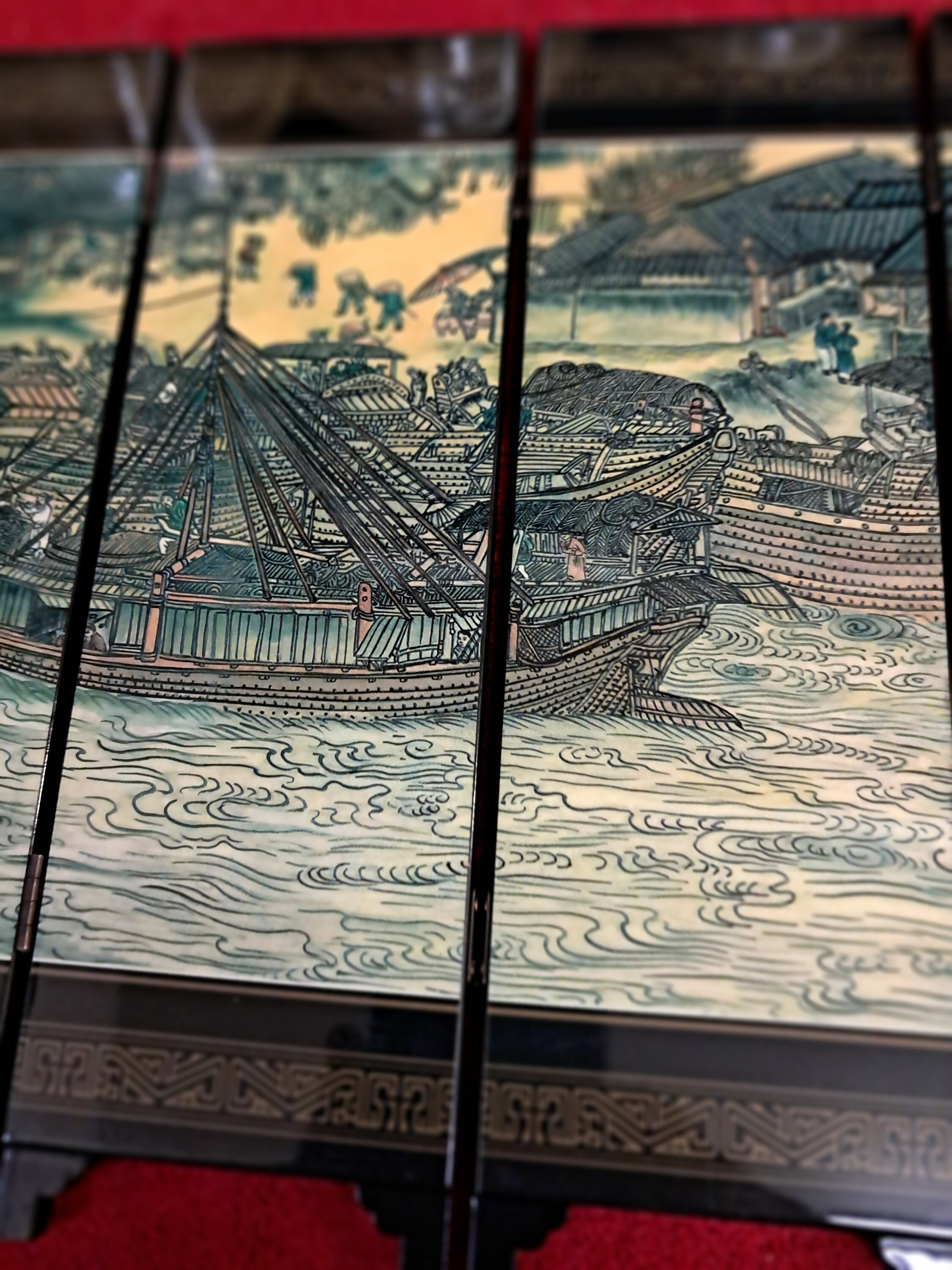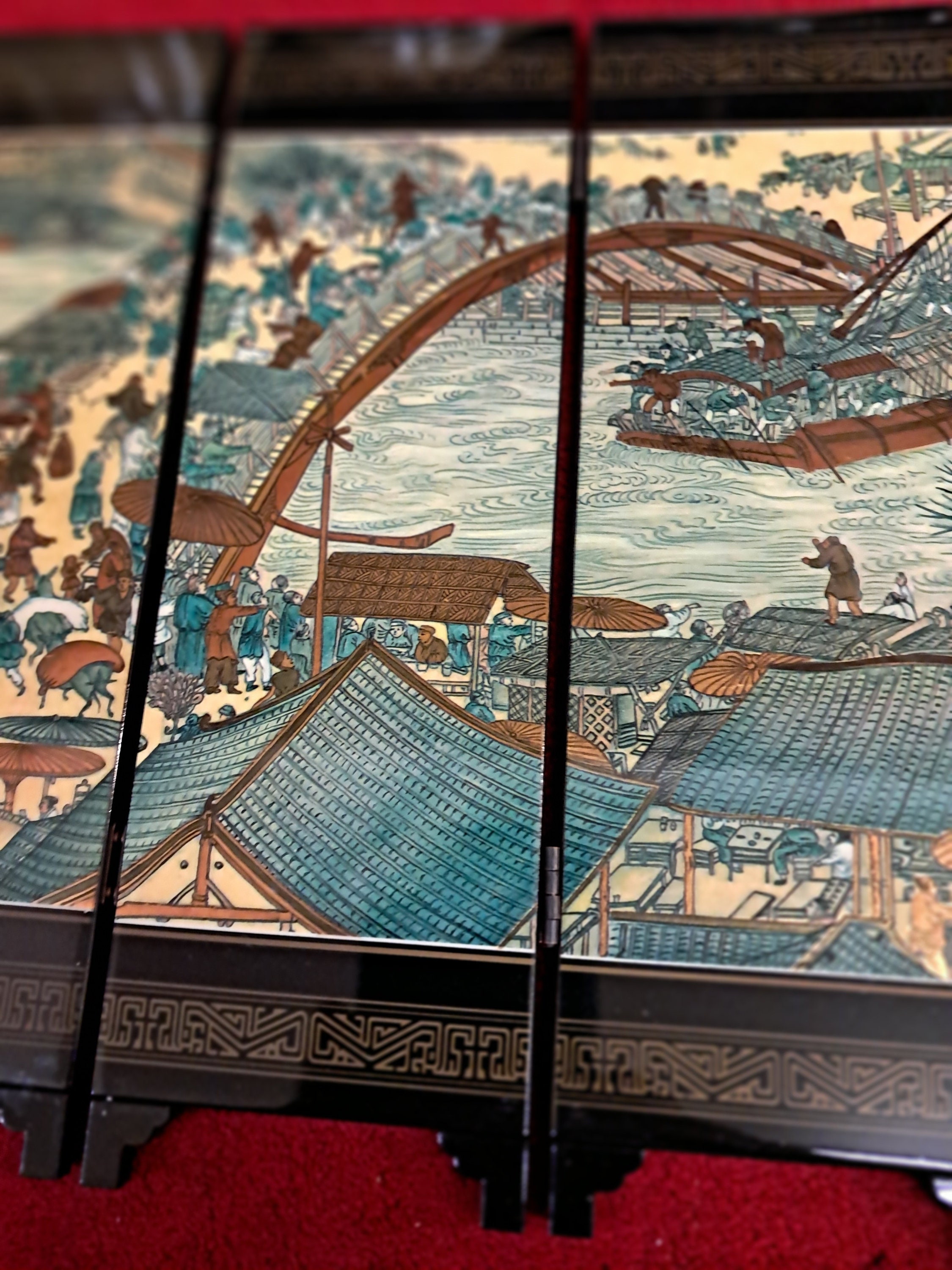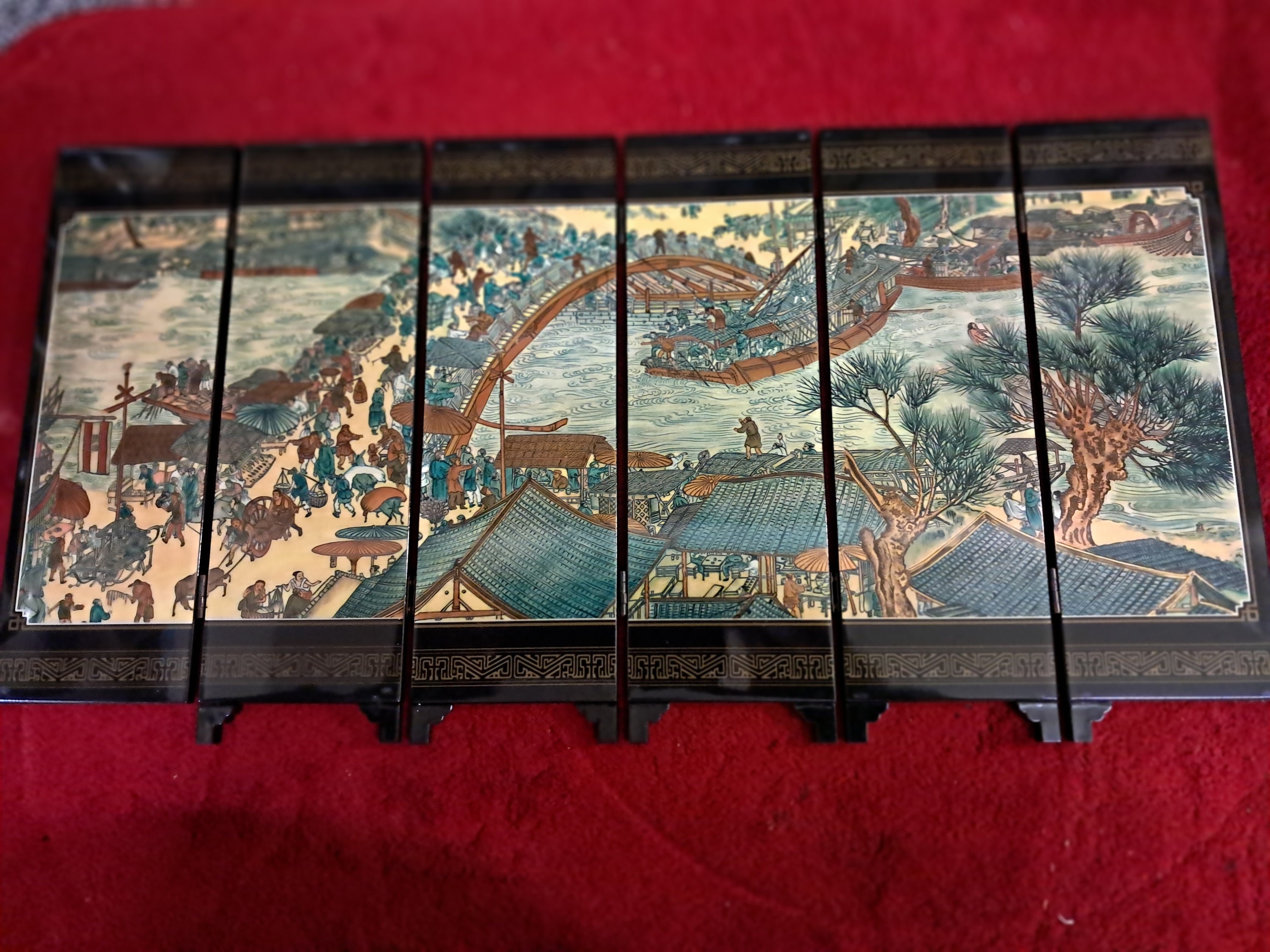 Asian Table Screen 6 Panel Symphonic Picture Riverside Scene @ Qingming Festival