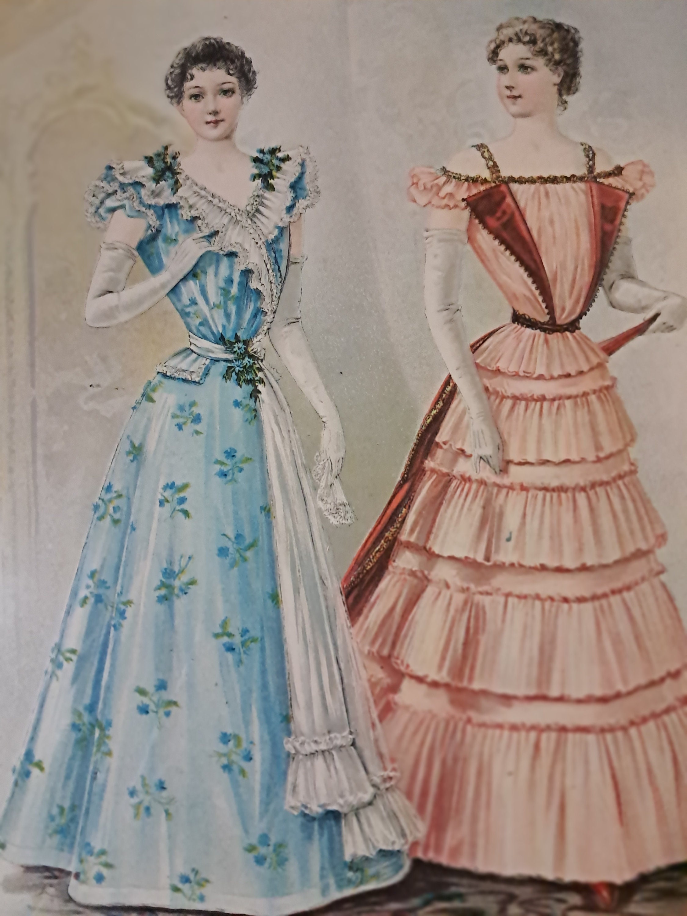 Ladies’ evening dress of the 1890s highlights an hourglass figure and usually consists of a fitted bodice with and open neckline, the shoulder-line is on the shoulder, with sleeves ranging from extravagant puffs to small or even almost non-existent ruffles or lace. The skirt sweeps the floor and is A-line, usually cut in a circle with gored pattern pieces. Fabrics range from rich brocades and velvets to lightweight chiffons and organdies. Colors are deep rich jewel tones or light and youthful pastels. Trims can be rich, heavy, and historically influenced or very femminine and fluffy.
