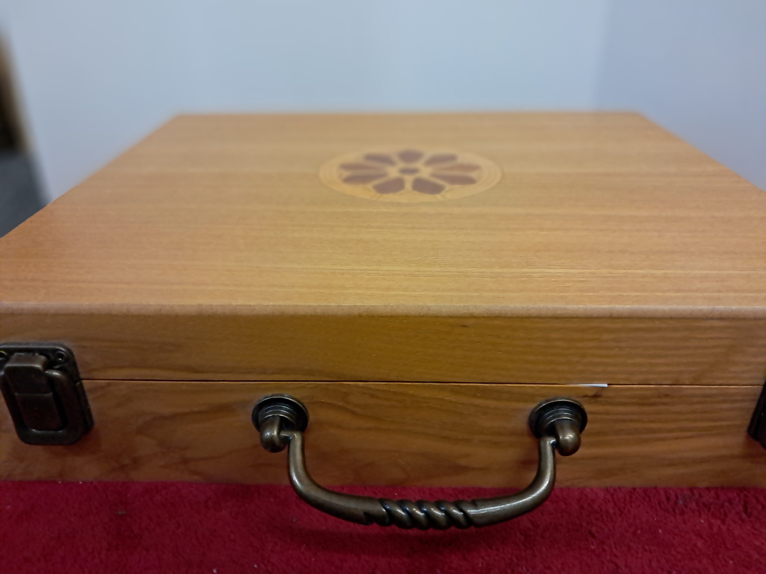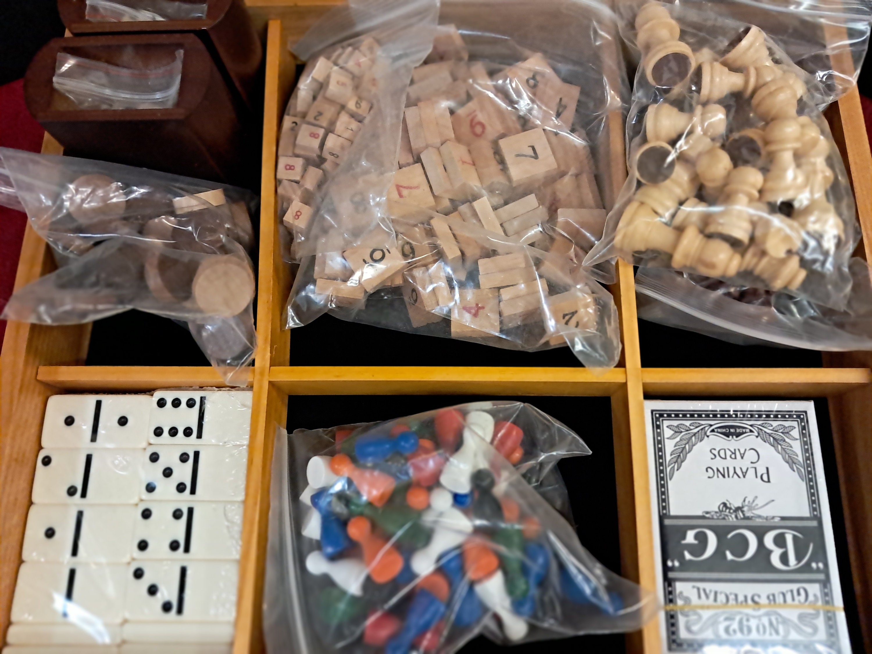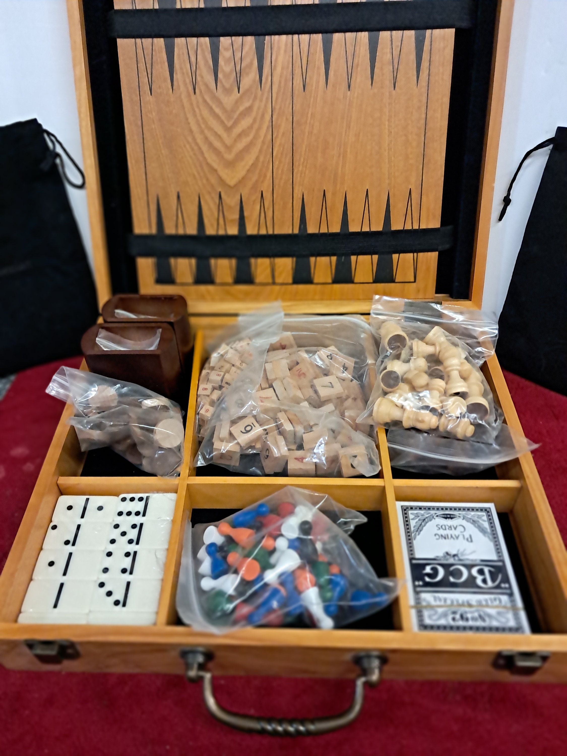 "Organized within this finely crafted wood box are 8 classic games—chess, checkers, backgammon, Chinese checkers, playing cards, dominoes, sudoku, and 5 dice Poker—to enjoy with friends and family during the holidays, on vacations, or whenever the mood strikes. Inlaid on the lid with a design inspired by the Smithsonian Castle's north-facing circular window, this oak-finished chest can be proudly stored in plain sight. Velvet game-piece storage bags included with this Castle Marquetry 8-Game Wooden Game Box.