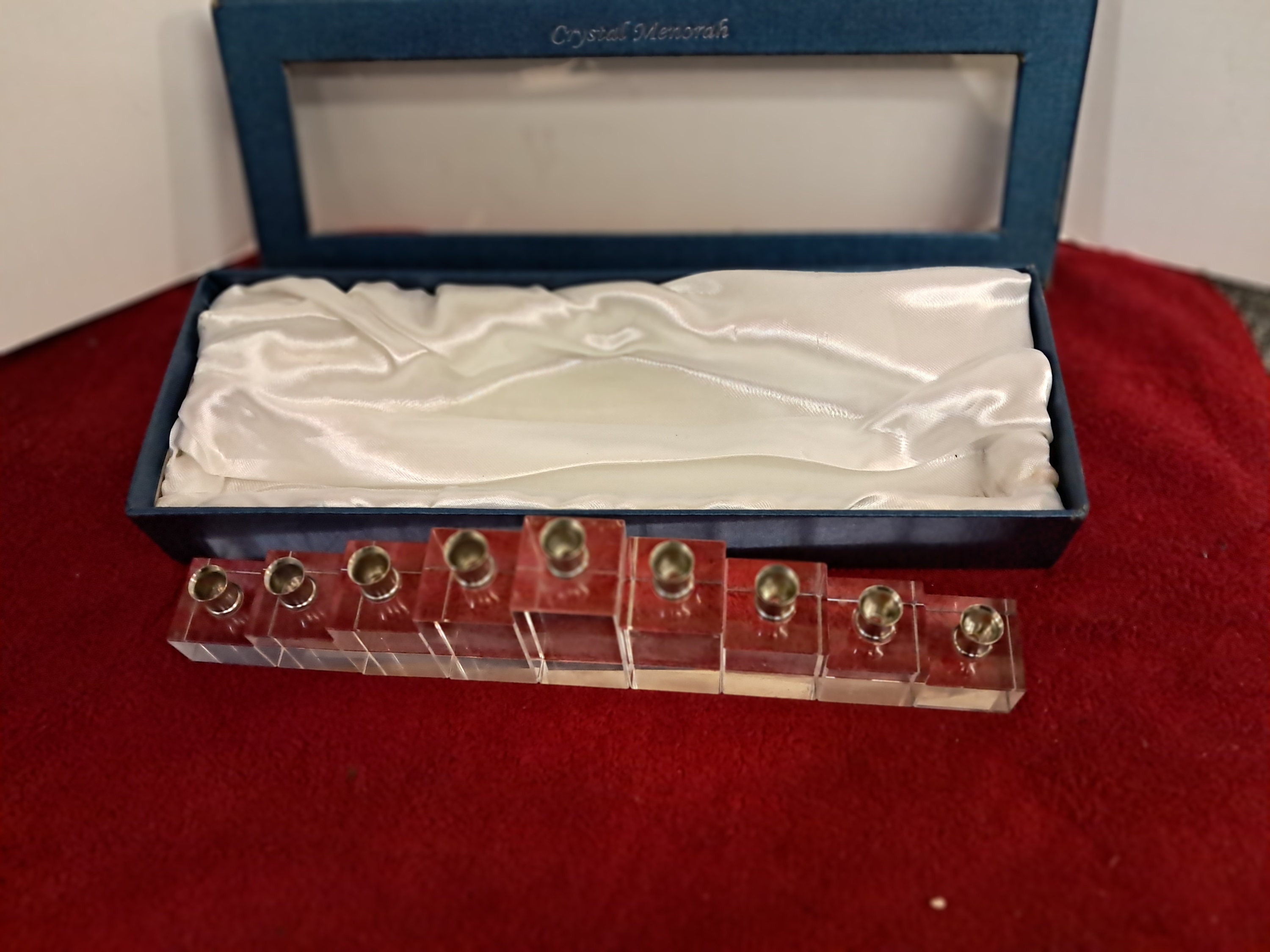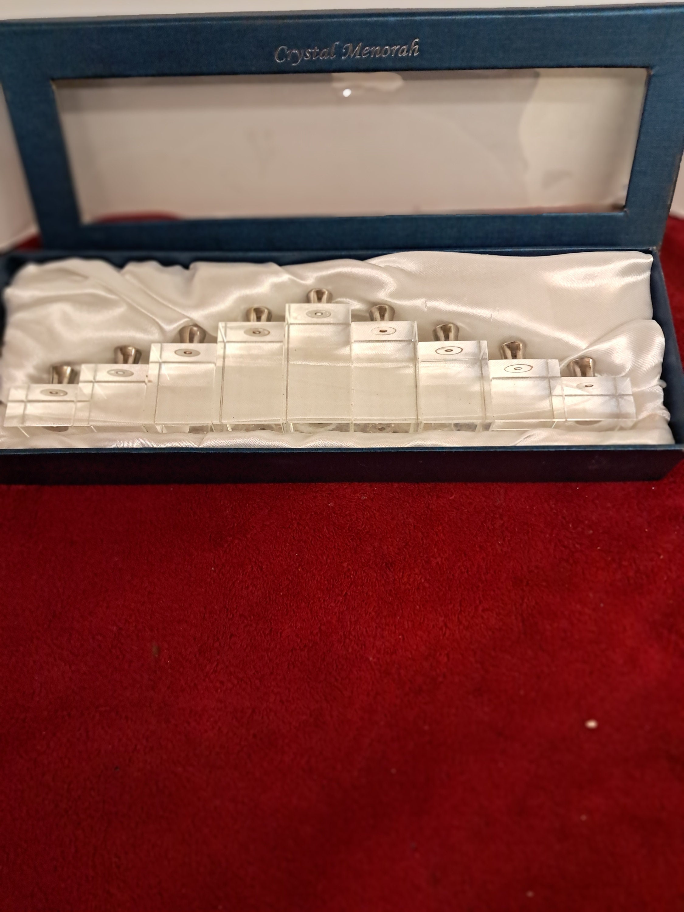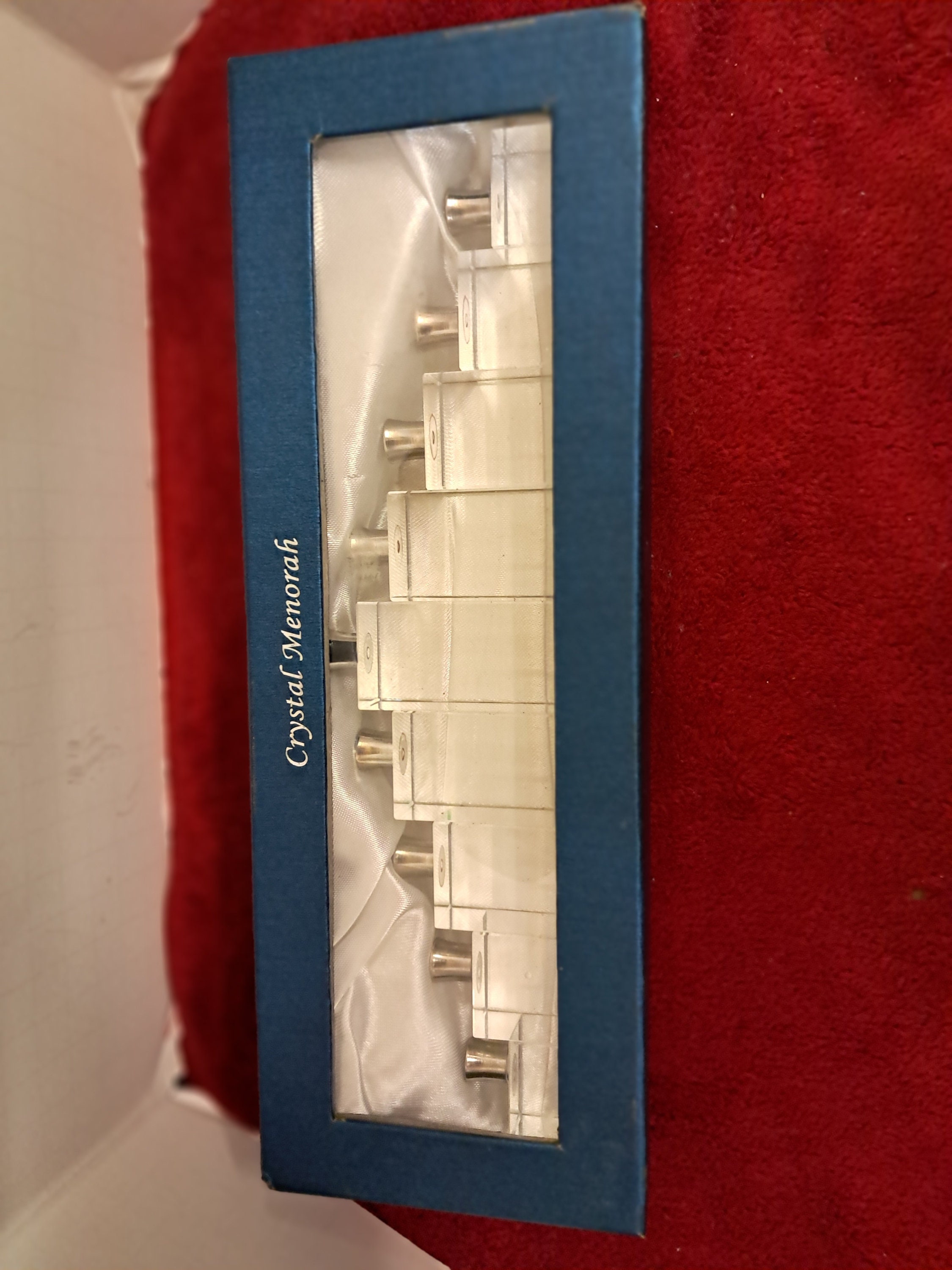 Crystal Menorah-Menora w/Chrome Candle Holder in Silk Lined Box Measures approx. 3”x 10 5/8” x 1 1/4”The rare heavy lead crystal menorah is in very good condition The blue case shows signs of storage