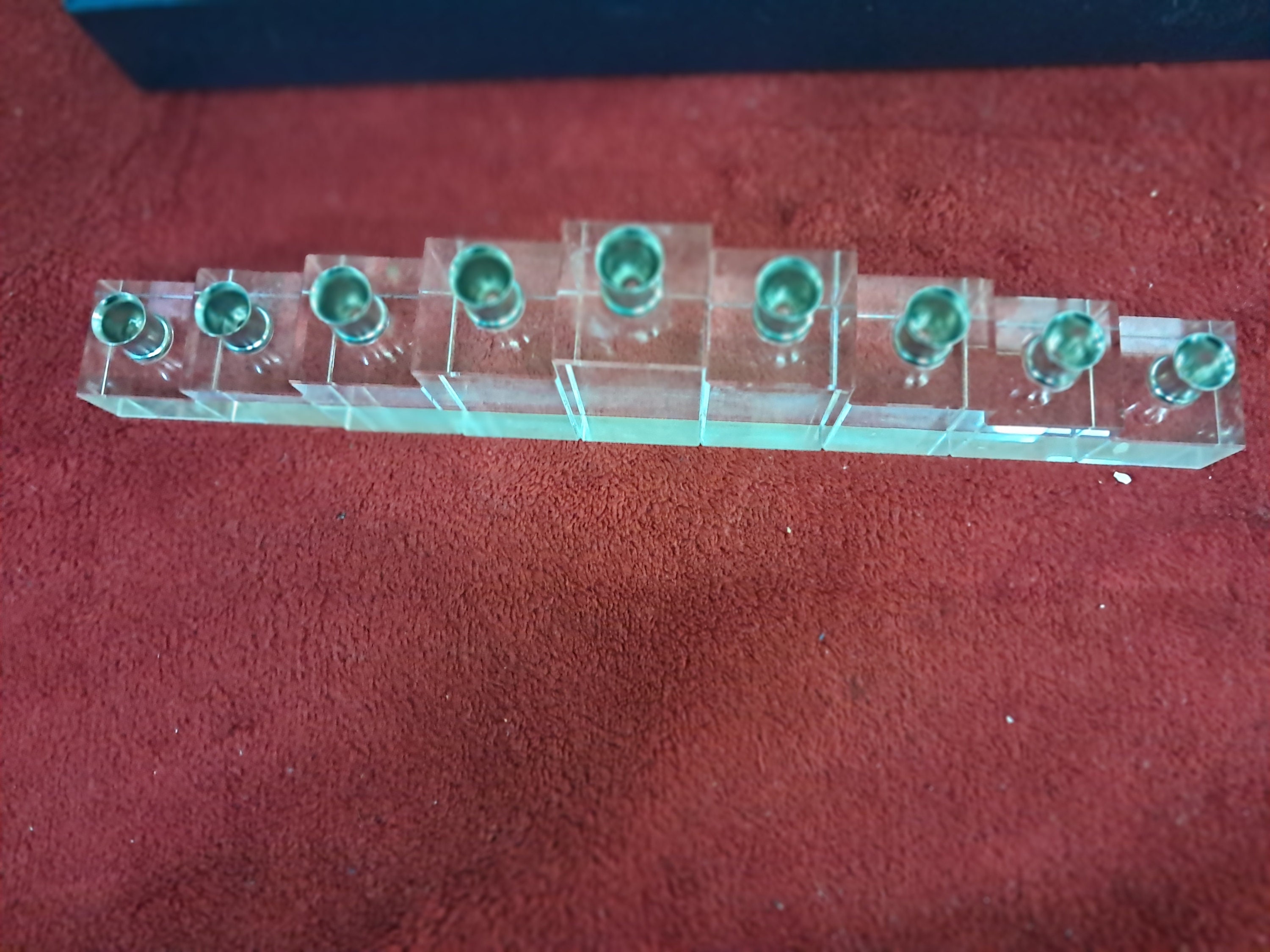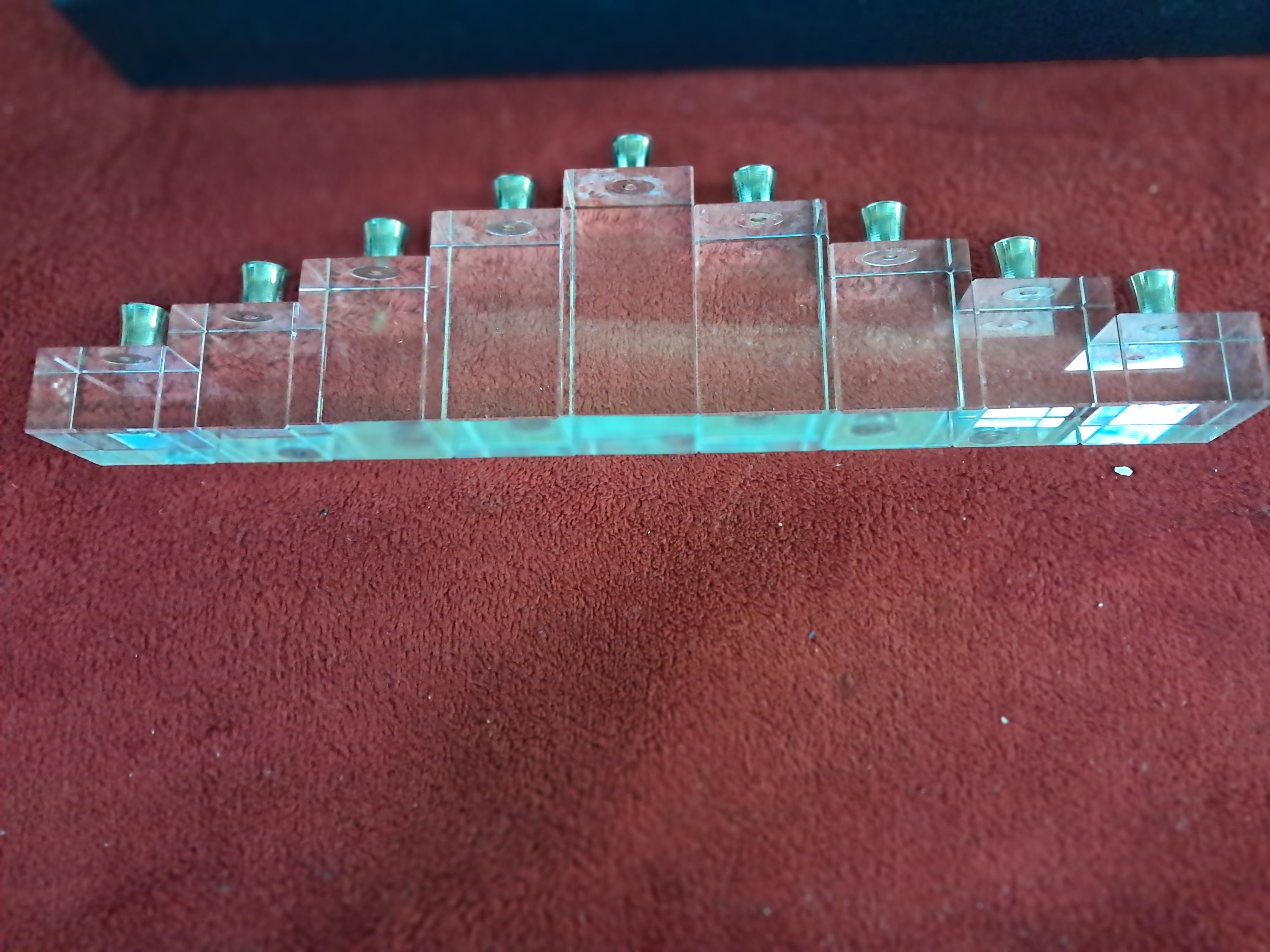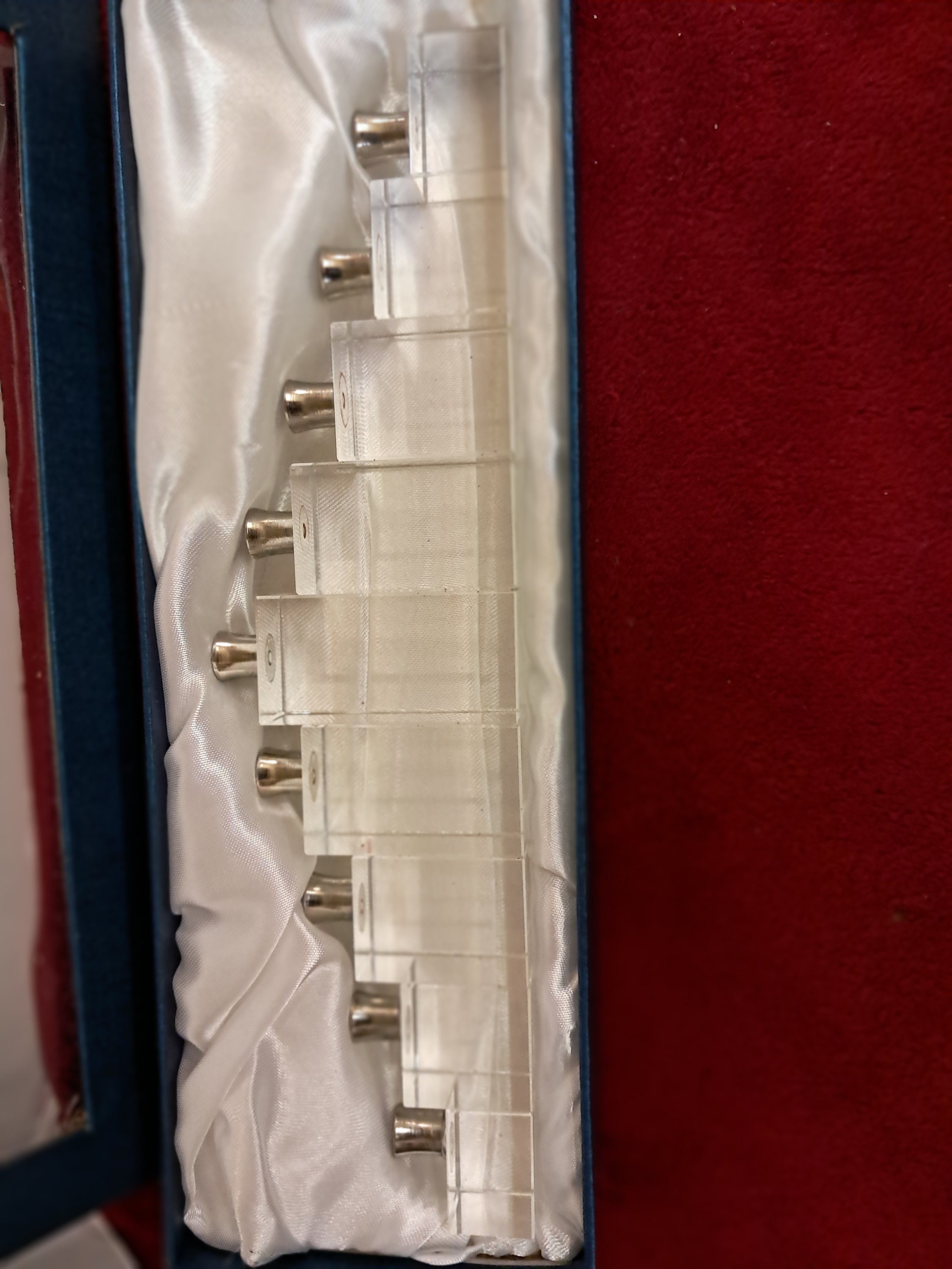Crystal Menorah-Menora w/Chrome Candle Holder in Silk Lined Box Measures approx. 3”x 10 5/8” x 1 1/4”The rare heavy lead crystal menorah is in very good condition The blue case shows signs of storage