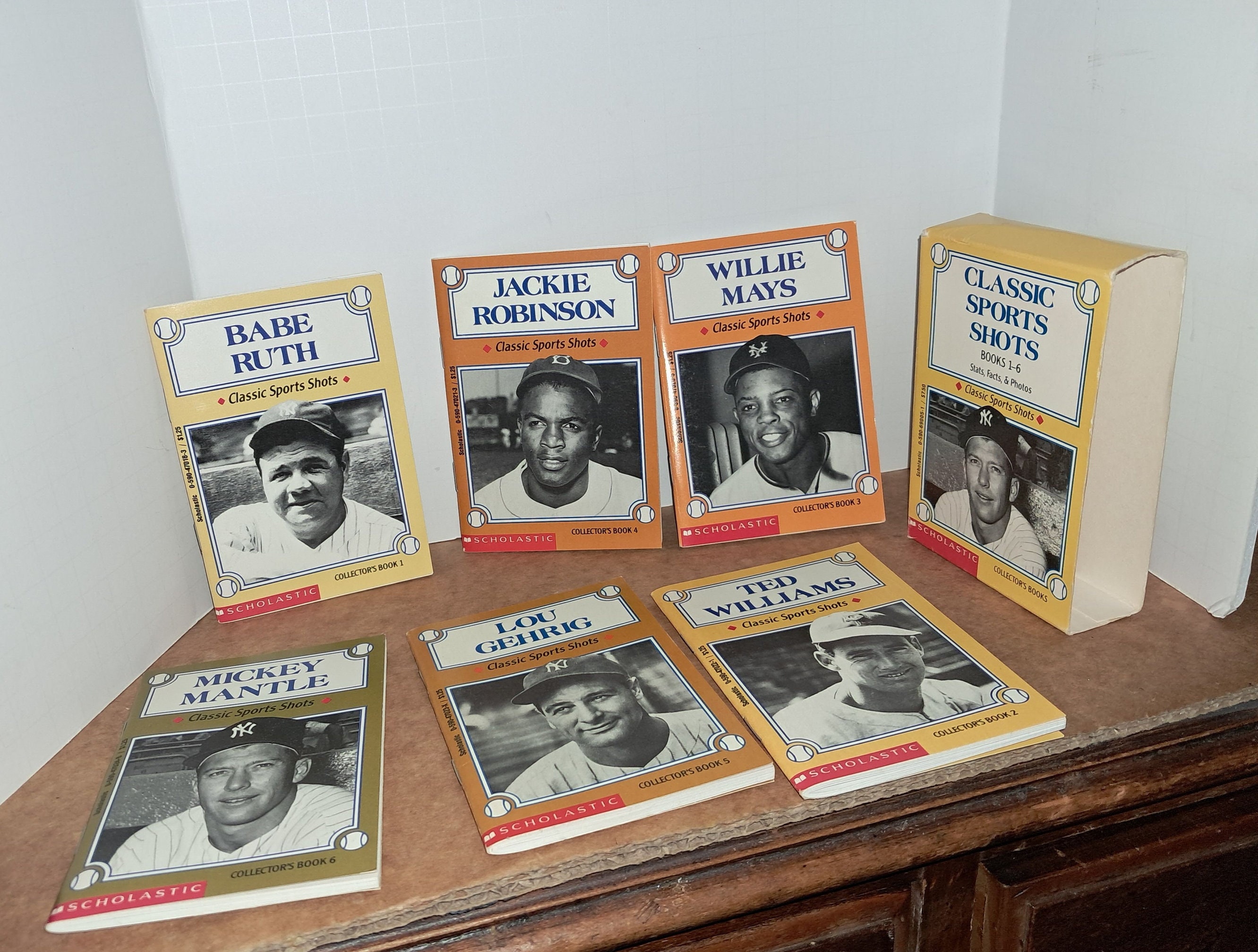 Complete 1993 Scholastic Classic Sports Shots Box Set - Ruth, Williams, Mays, Robinson, Gehrig and Mantle. All 6 mini books are in great shape, the slip box with Mickey Mantle on it shows some edge shelf wear.