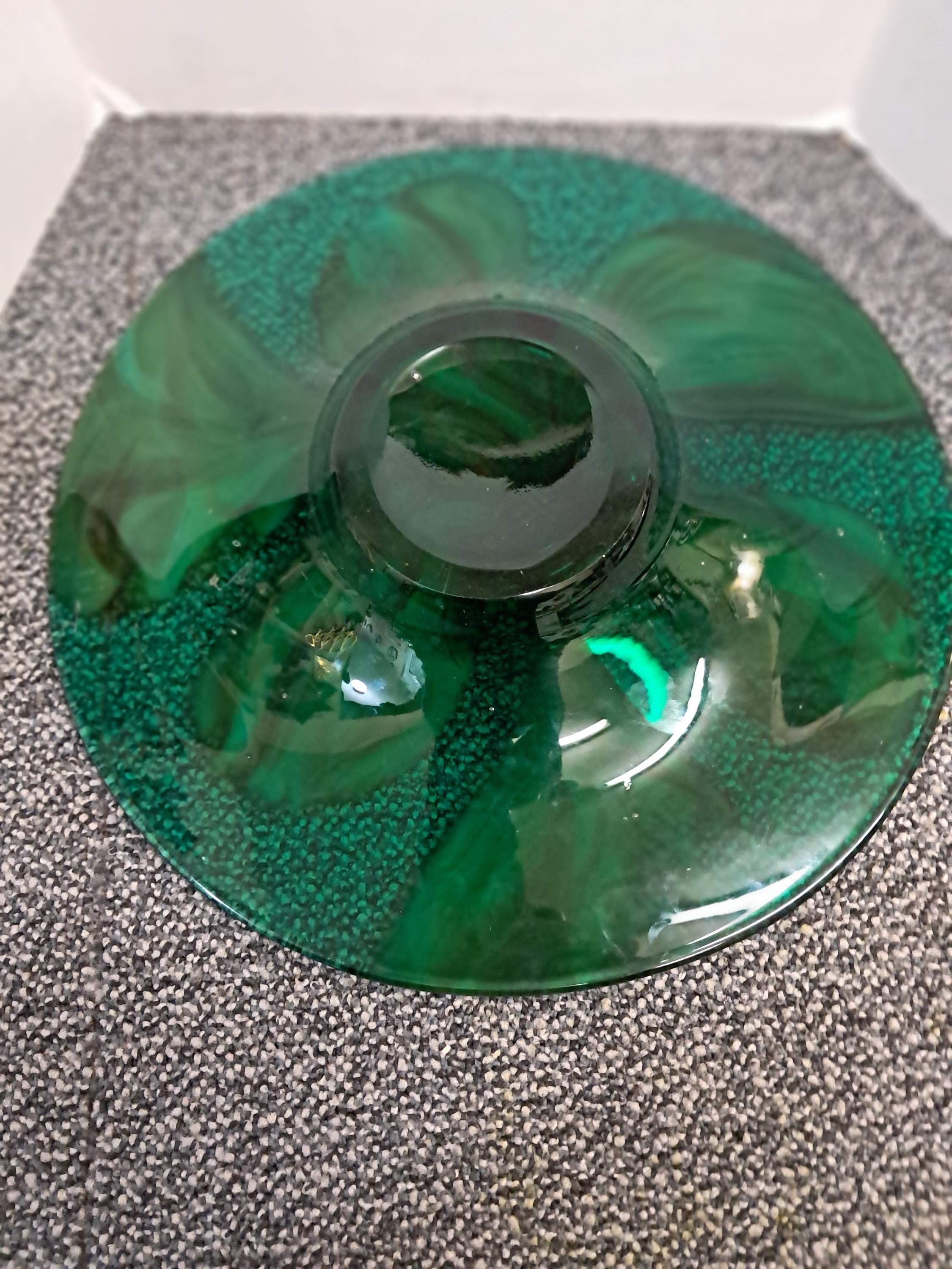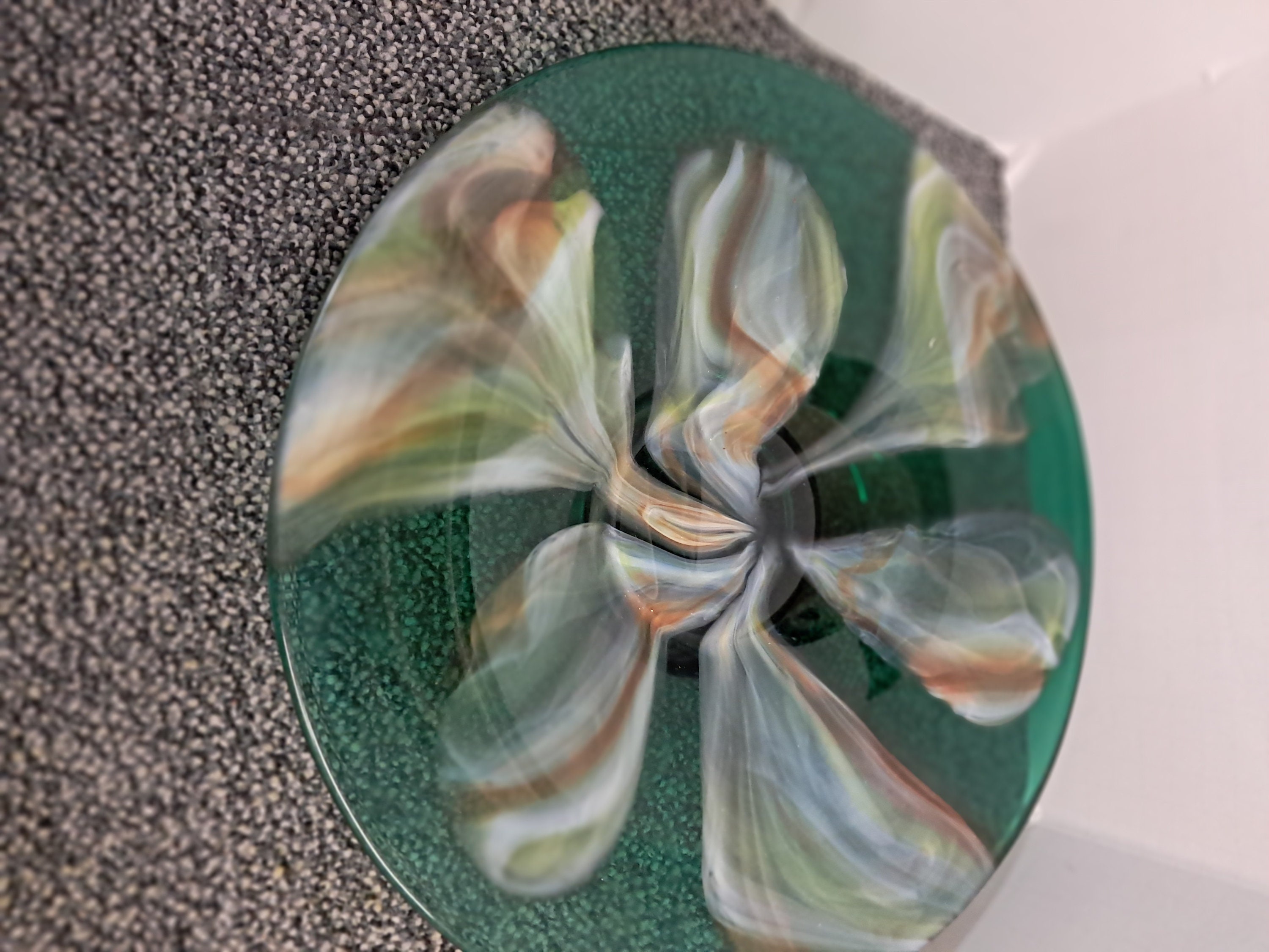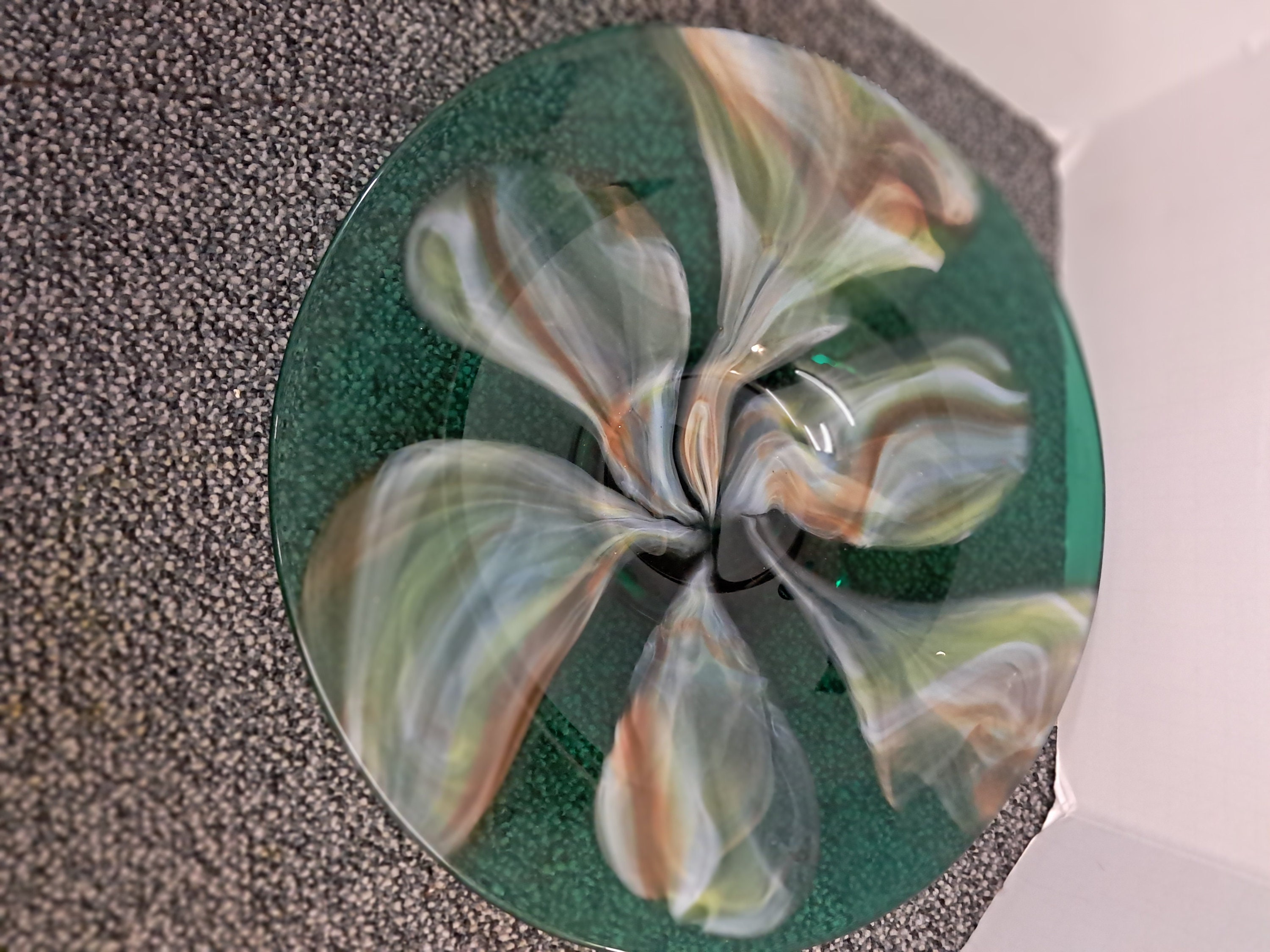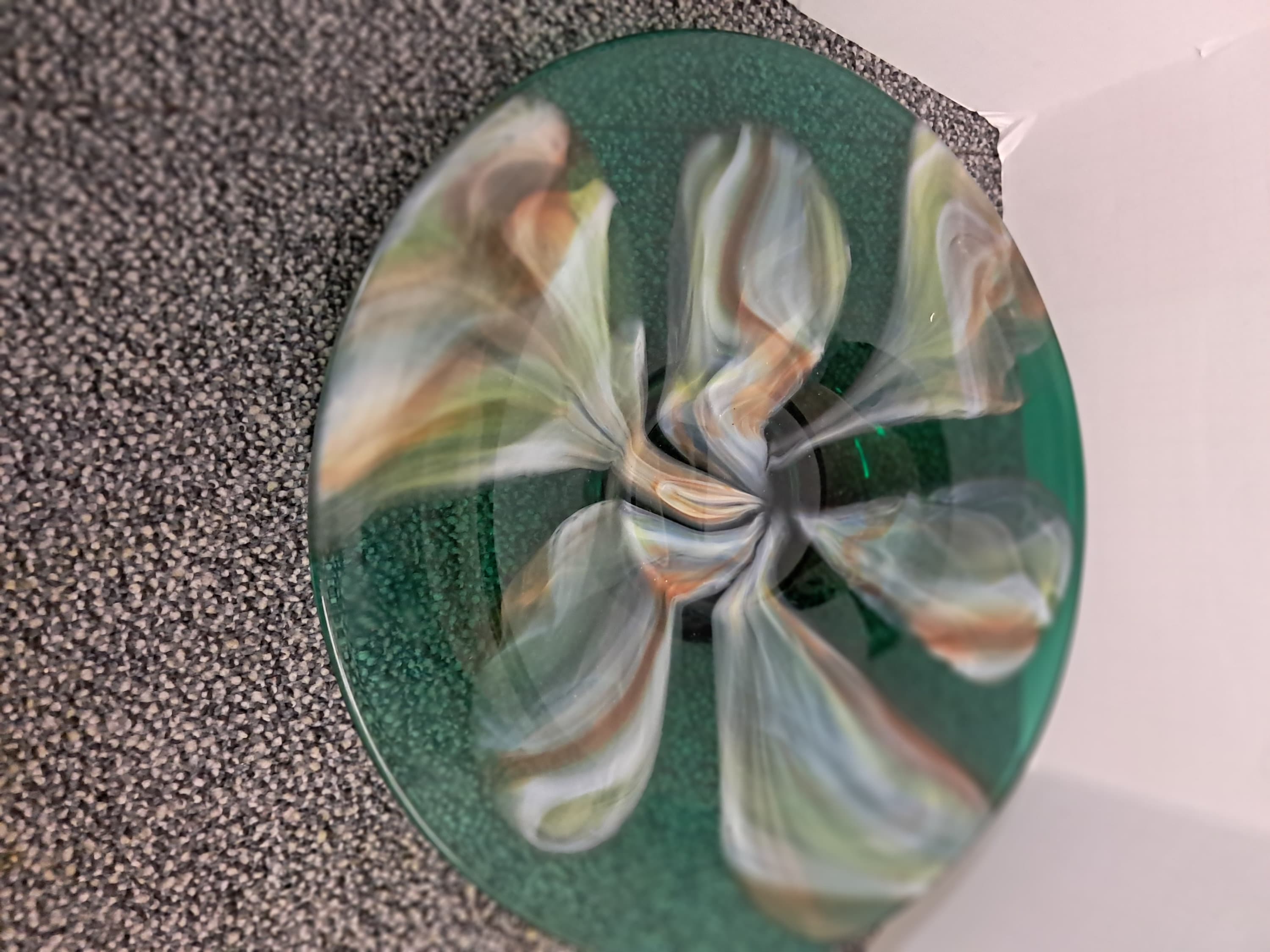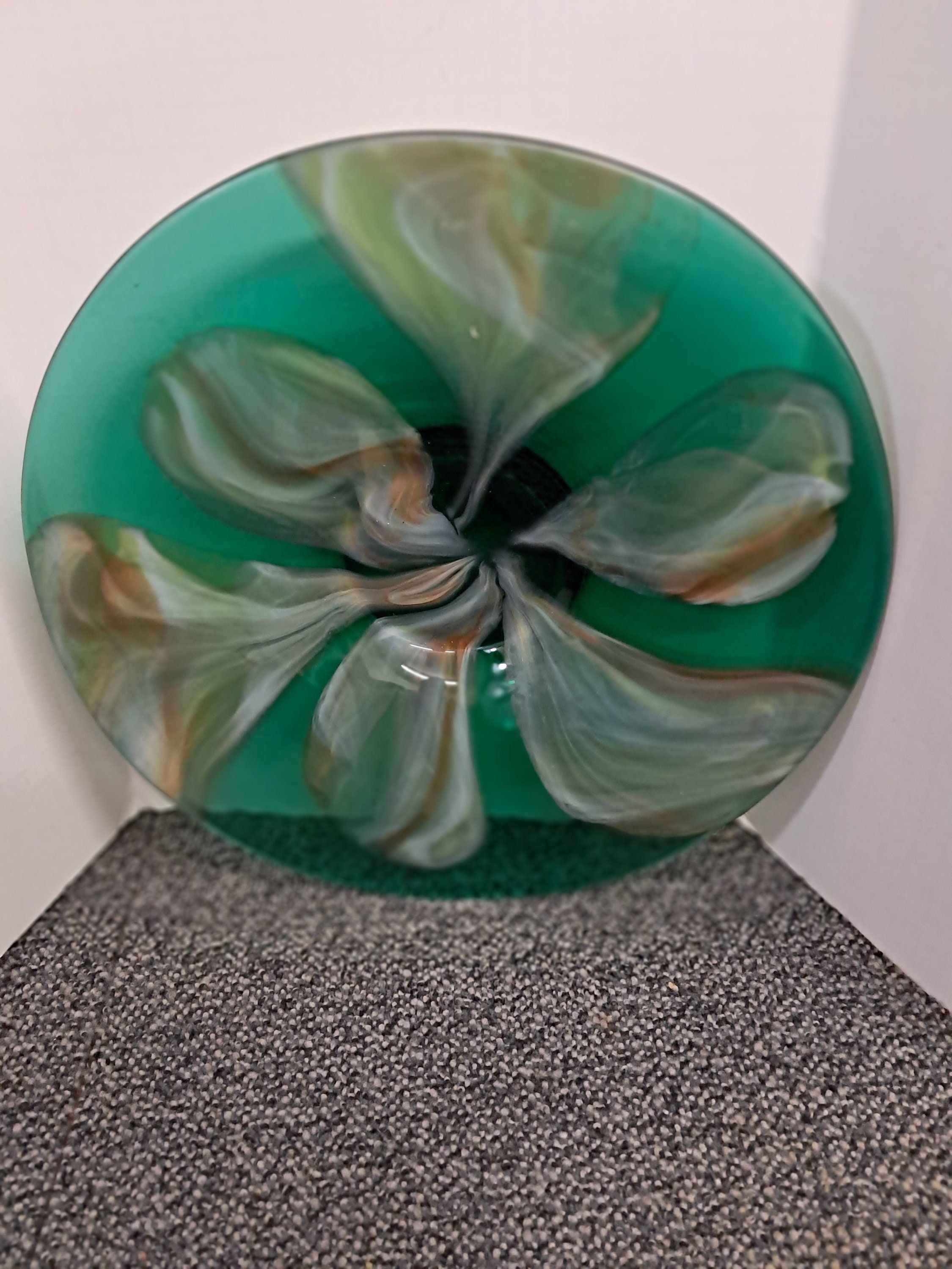 Here at Home of Temptations (HOT Design), A BRAND NEW, 'shades of turquoise' green handblown art glass display plate.