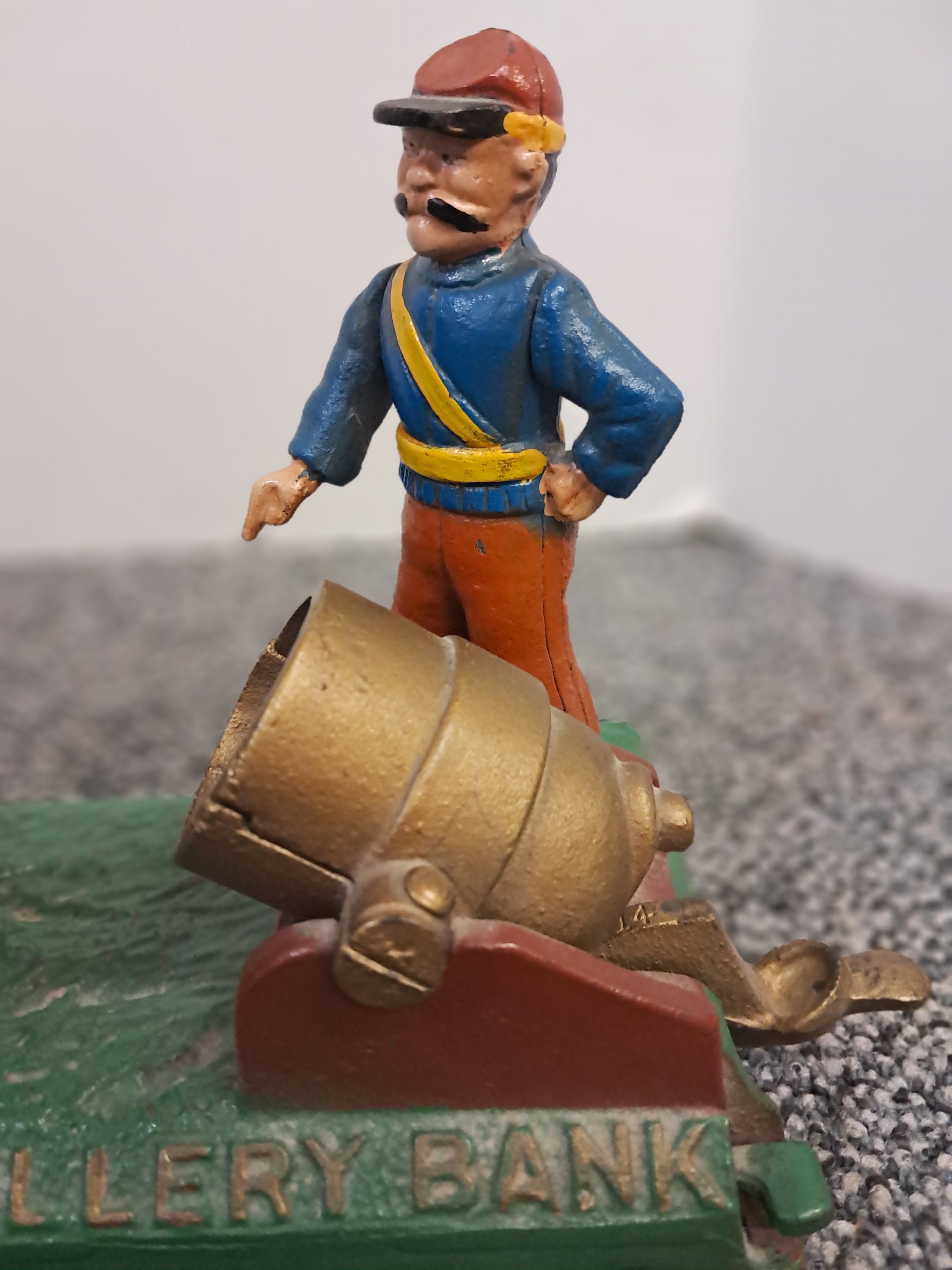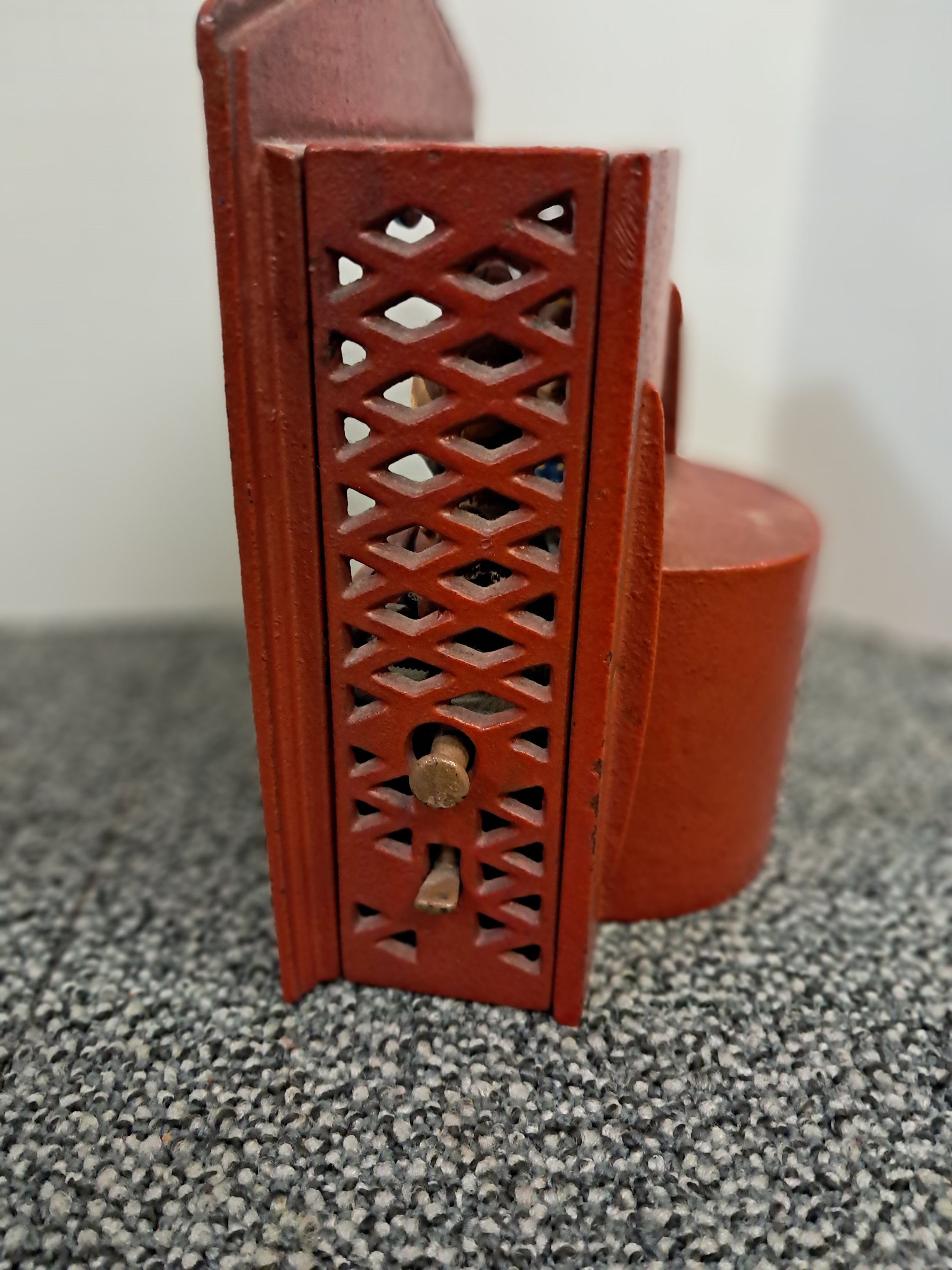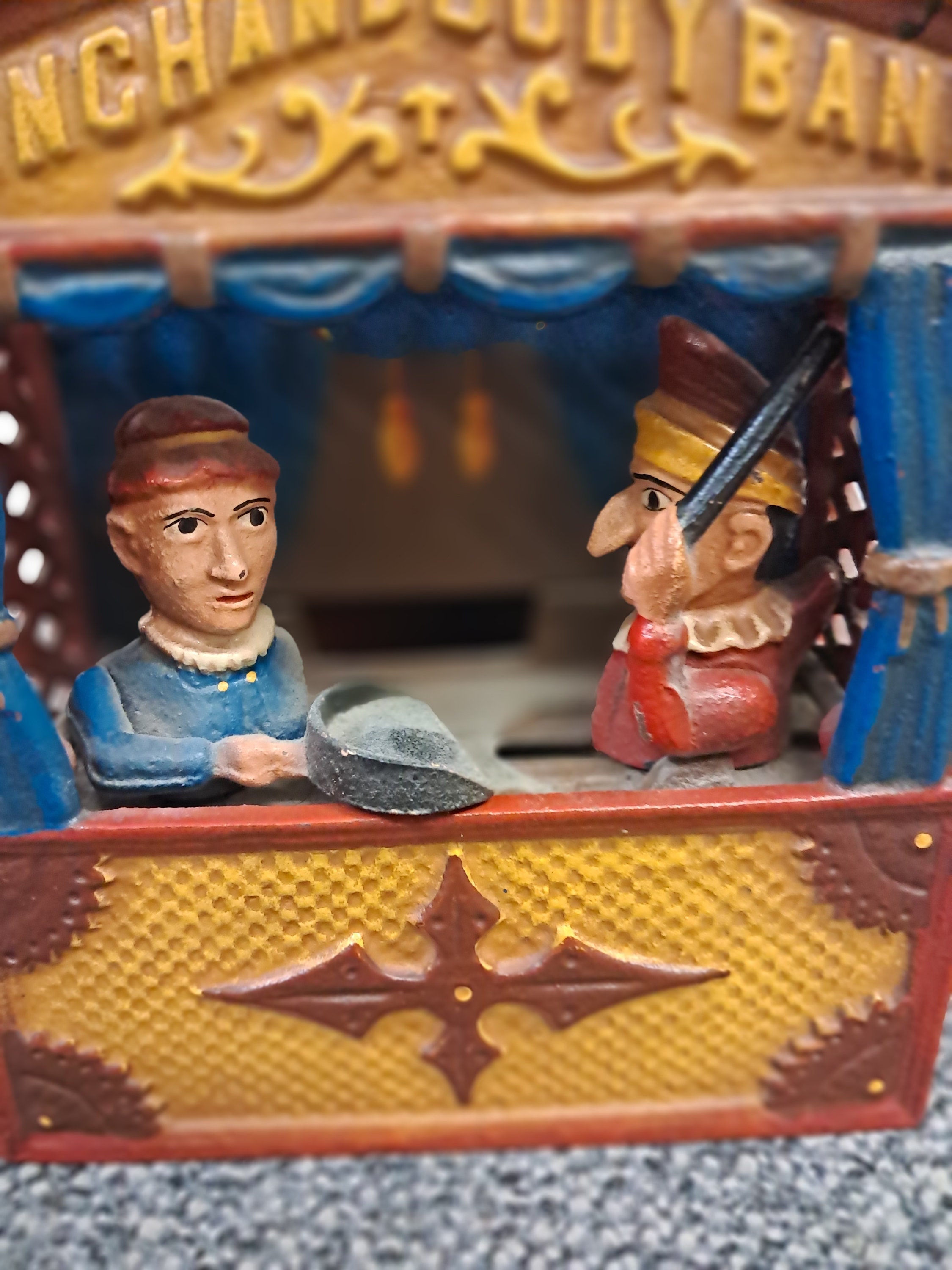 We are offering a working vintage coin bank, reproduced in the 1960s from the Book of Knowledge, depicting a classic puppeteer scene. When the lever is pulled, the character on the left pulls out a pan for inserting coins. By pushing down the small switch on the side, the pan will go insert the coins into the bank while the other character swings his baton.