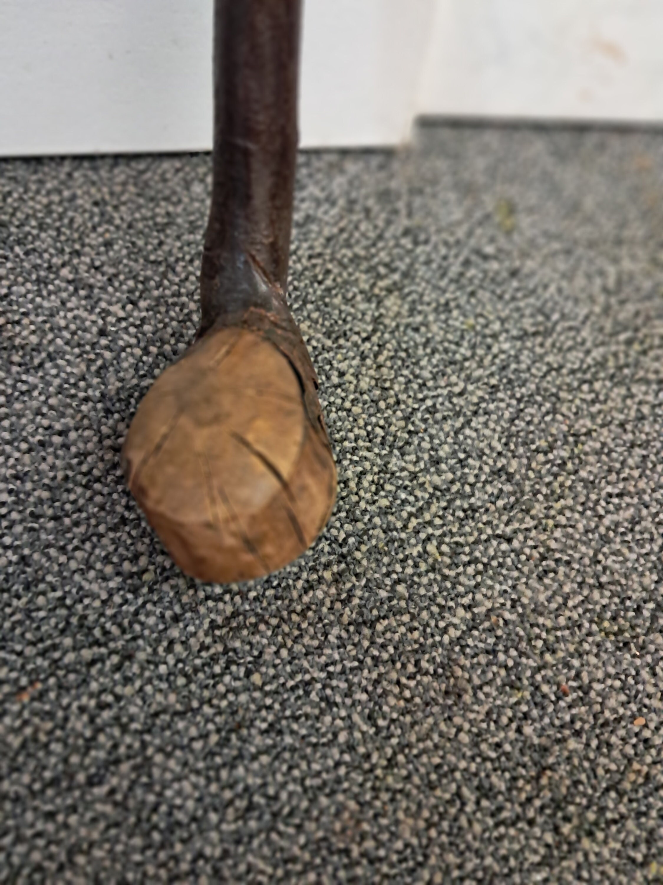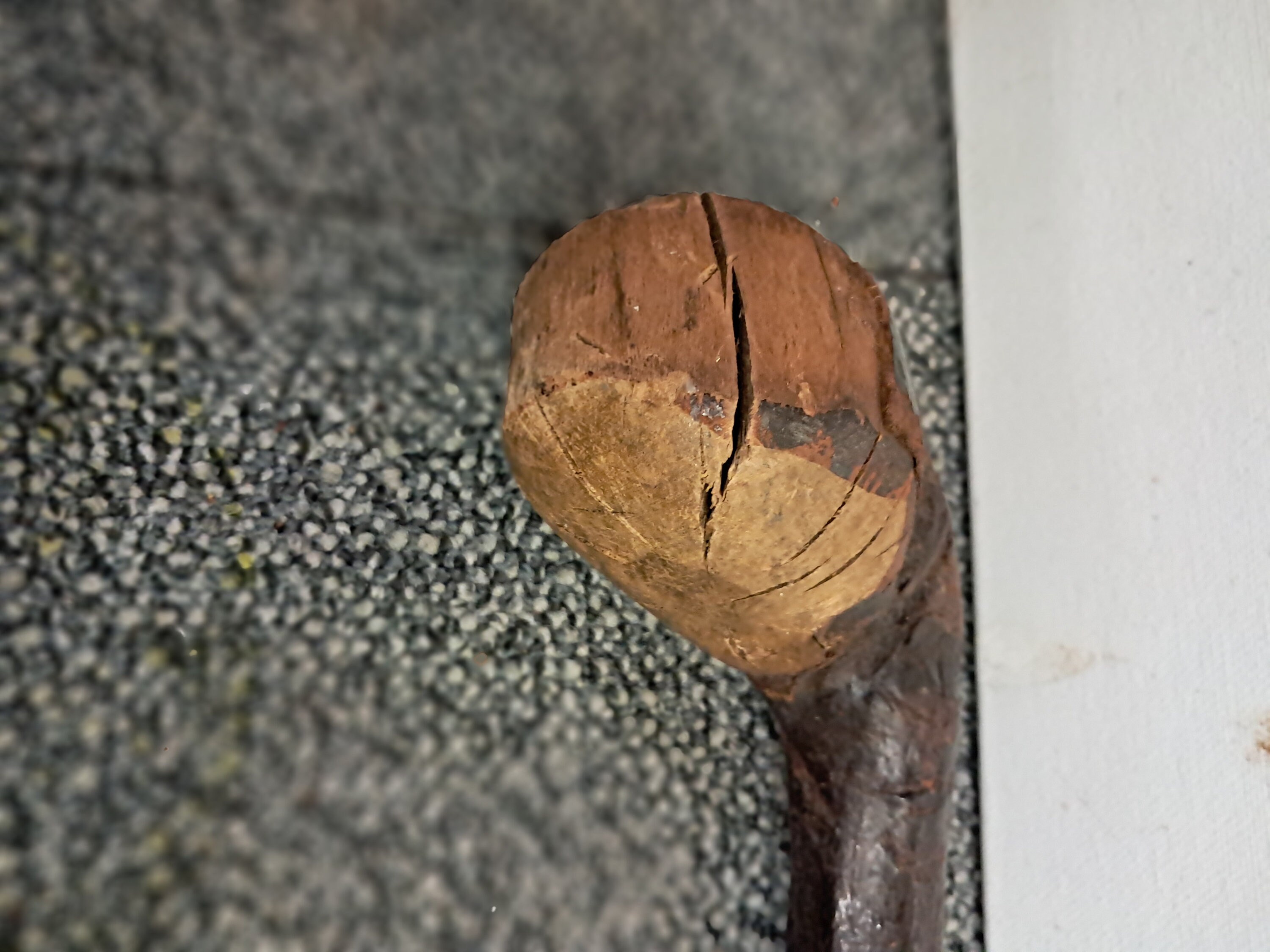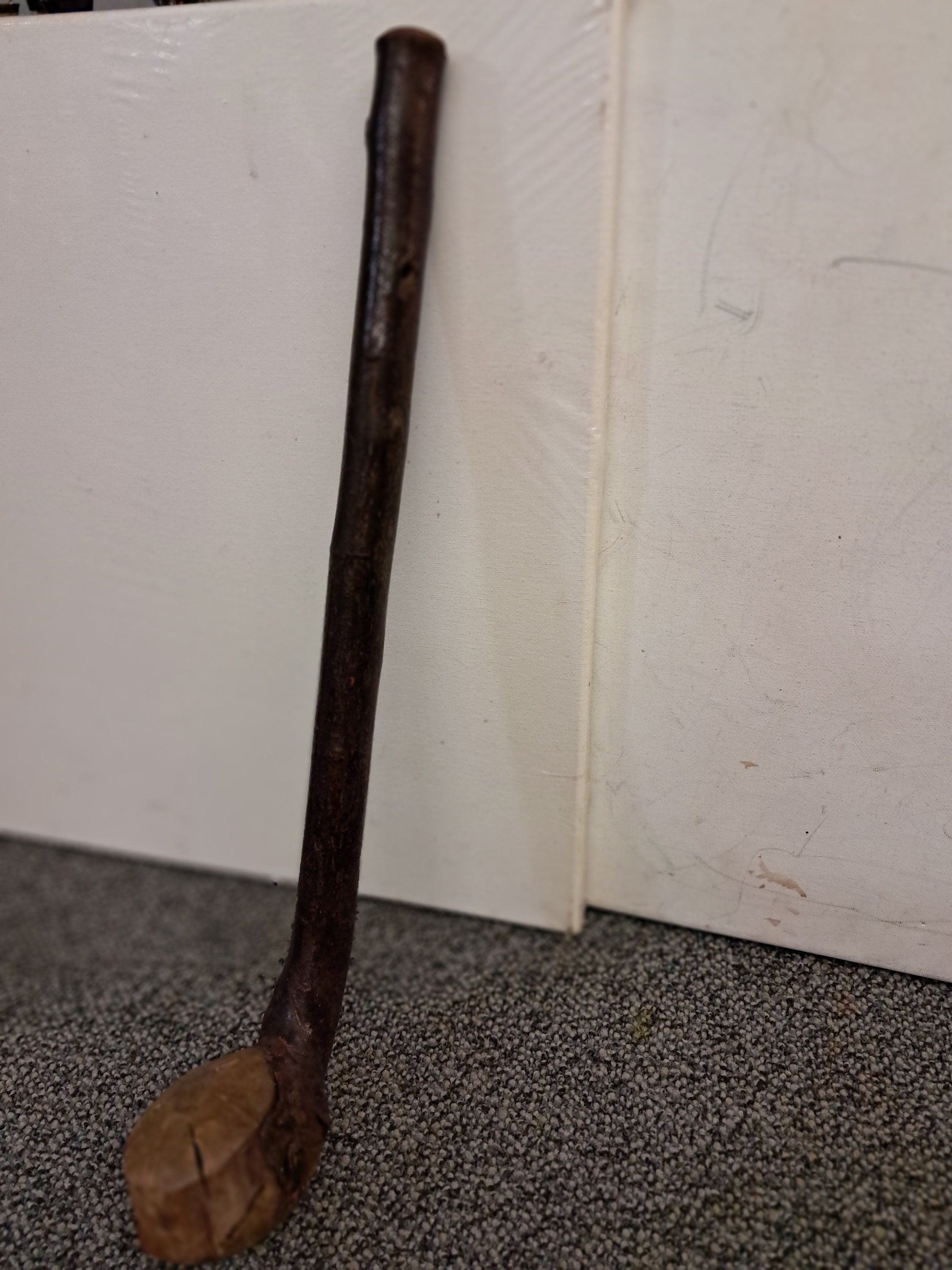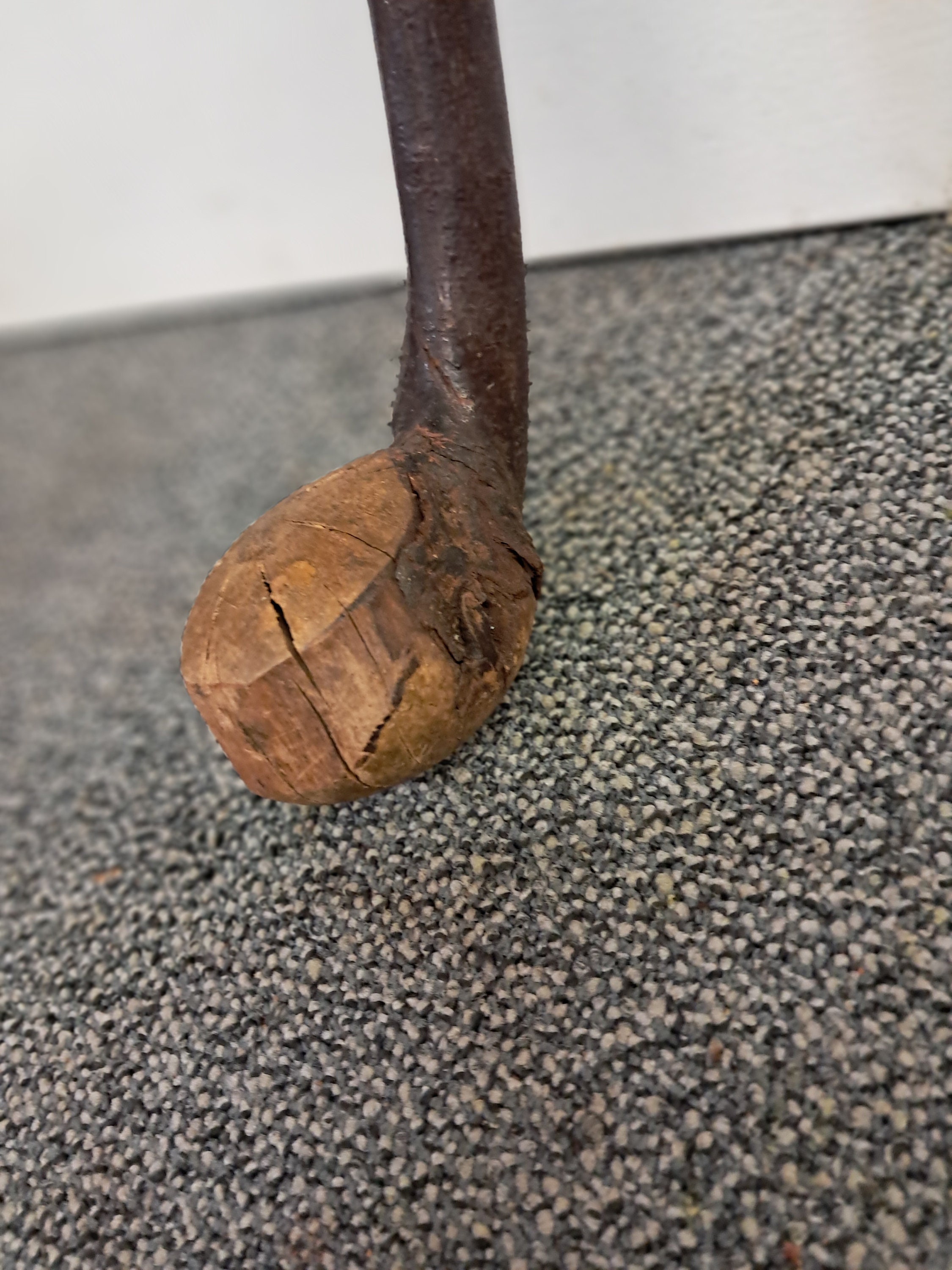 A formidable club that is hand-carved from the burl of a hardwood tree. The roughly spherical wood burl constitutes the striking head of the weapon and includes an integral handle that arches slightly about 15 inches in length. Burl wood was prized when creating wooden weaponry, as the incongruous wood graining imbues the club head with far greater density and structural integrity. Size: 18" L x 4" W
