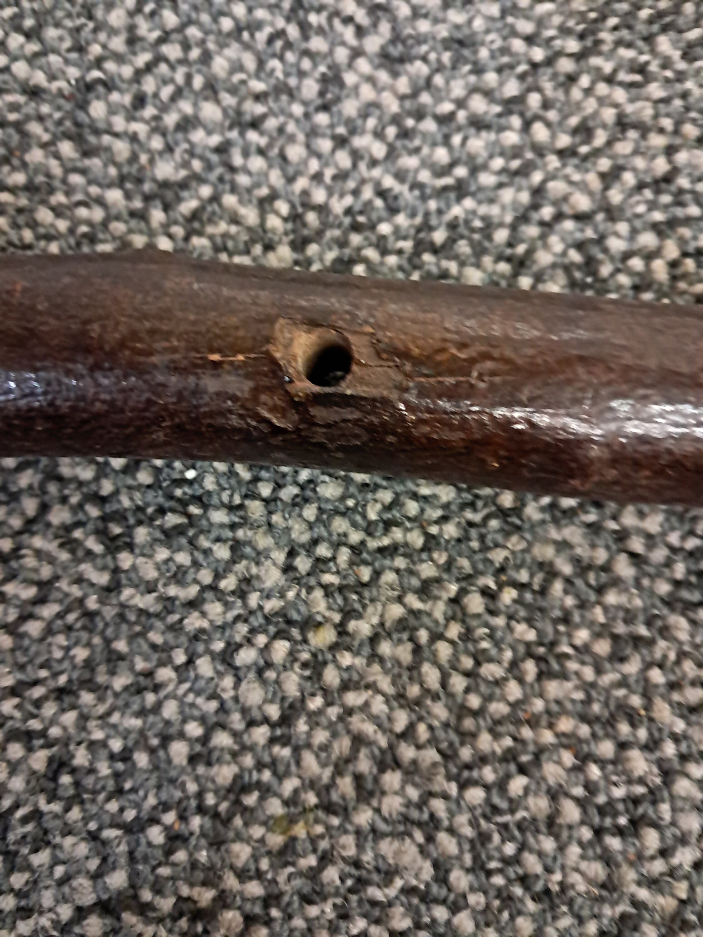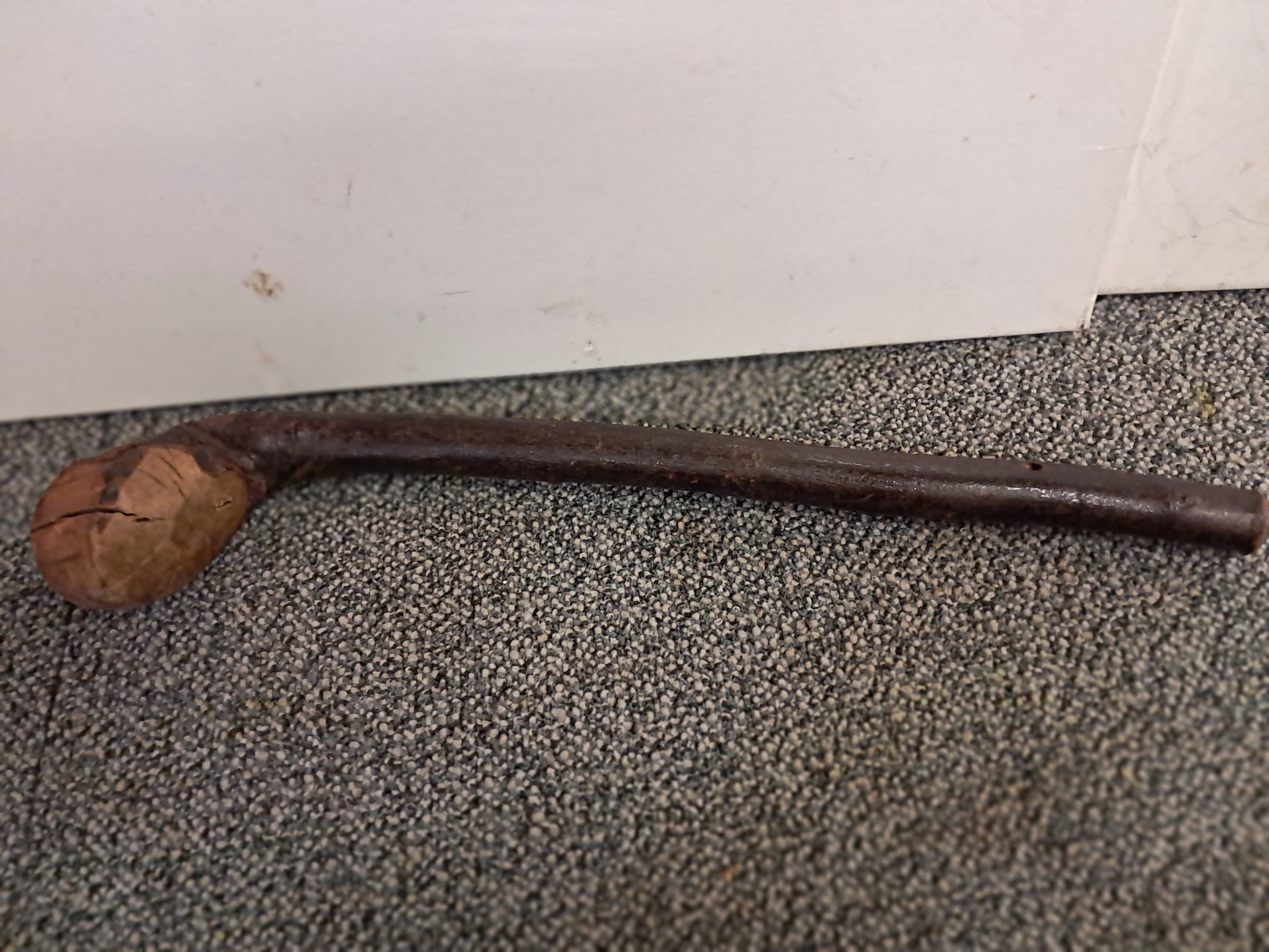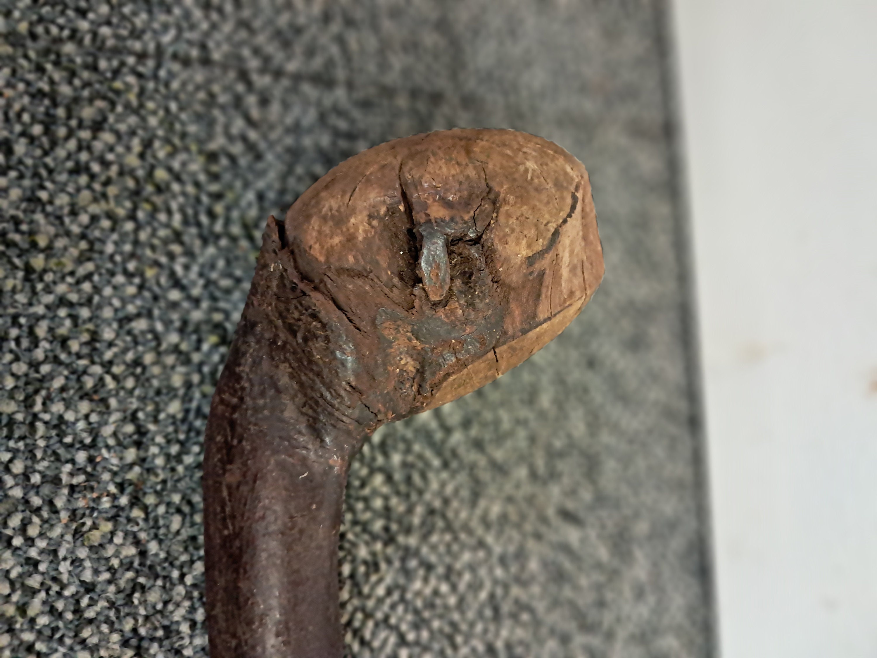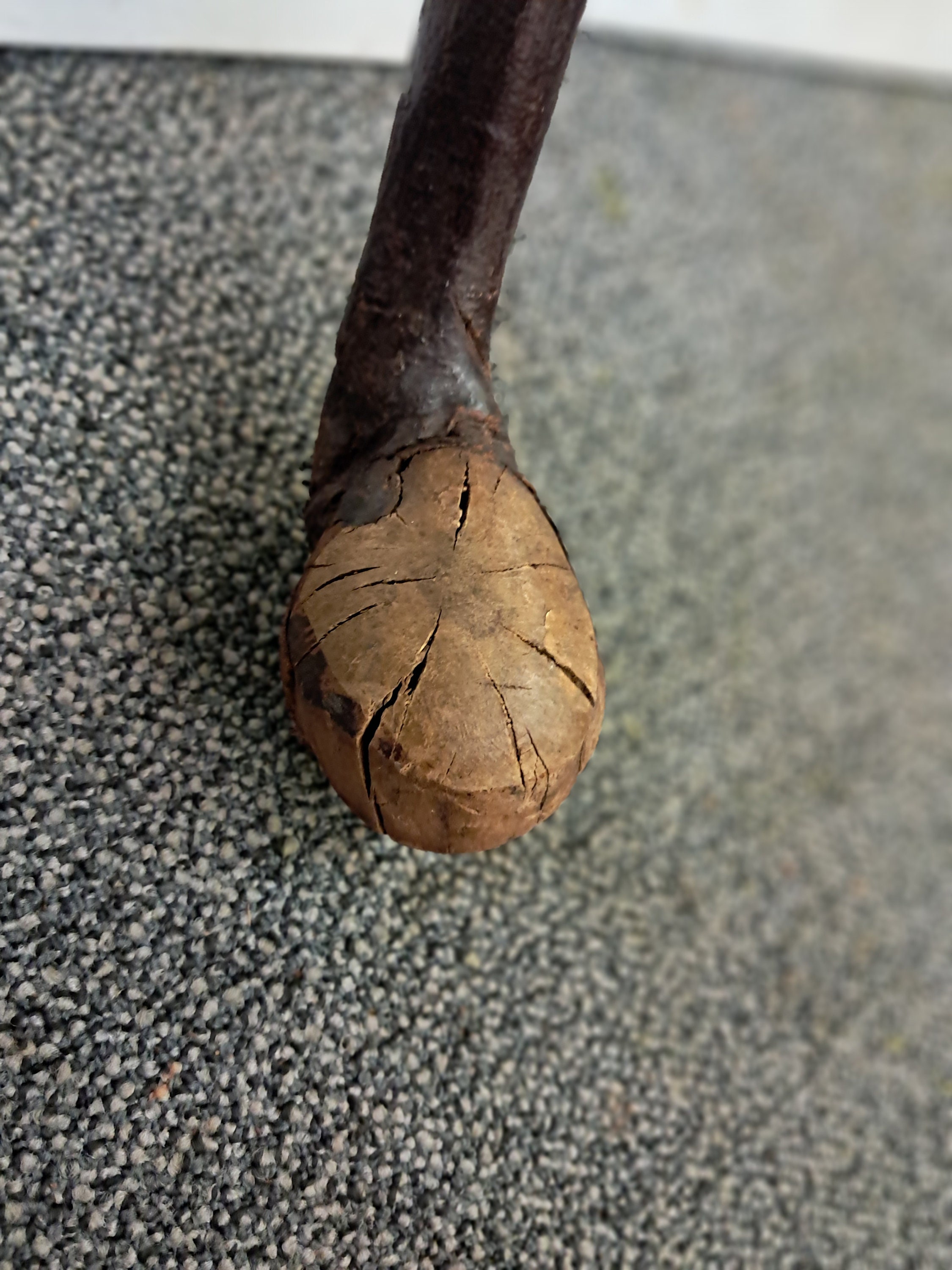 A formidable club that is hand-carved from the burl of a hardwood tree. The roughly spherical wood burl constitutes the striking head of the weapon and includes an integral handle that arches slightly about 15 inches in length. Burl wood was prized when creating wooden weaponry, as the incongruous wood graining imbues the club head with far greater density and structural integrity. Size: 18" L x 4" W
