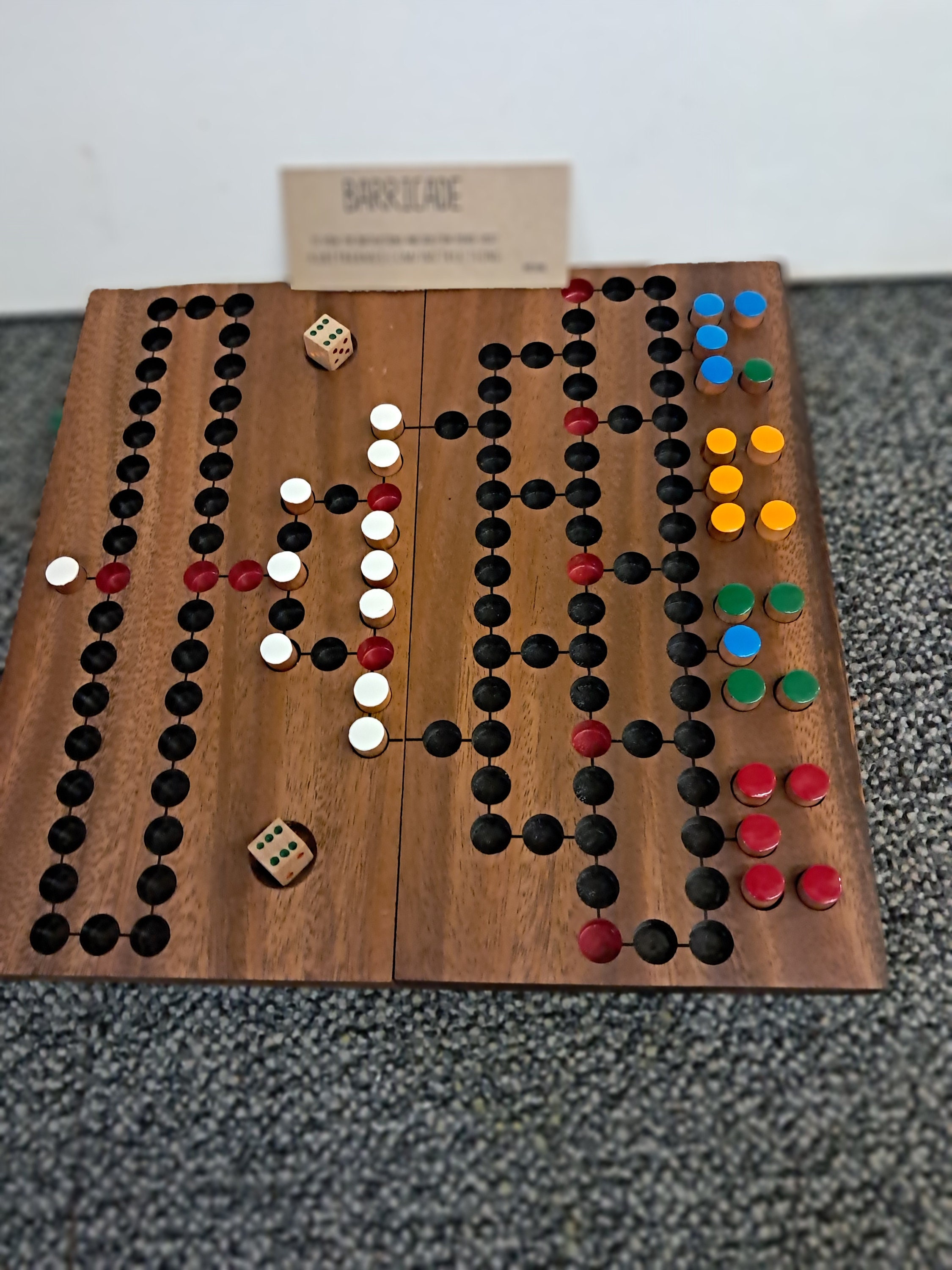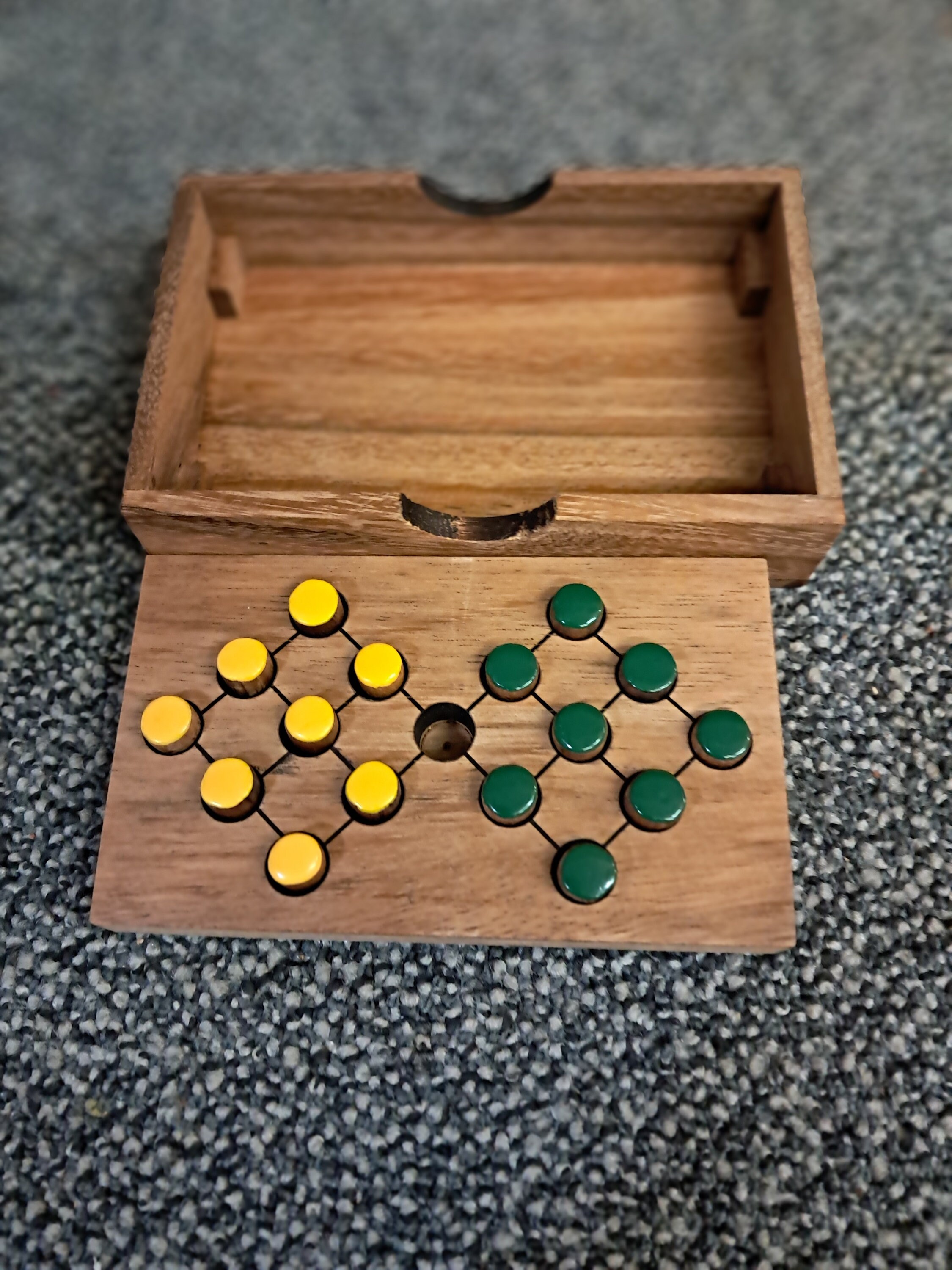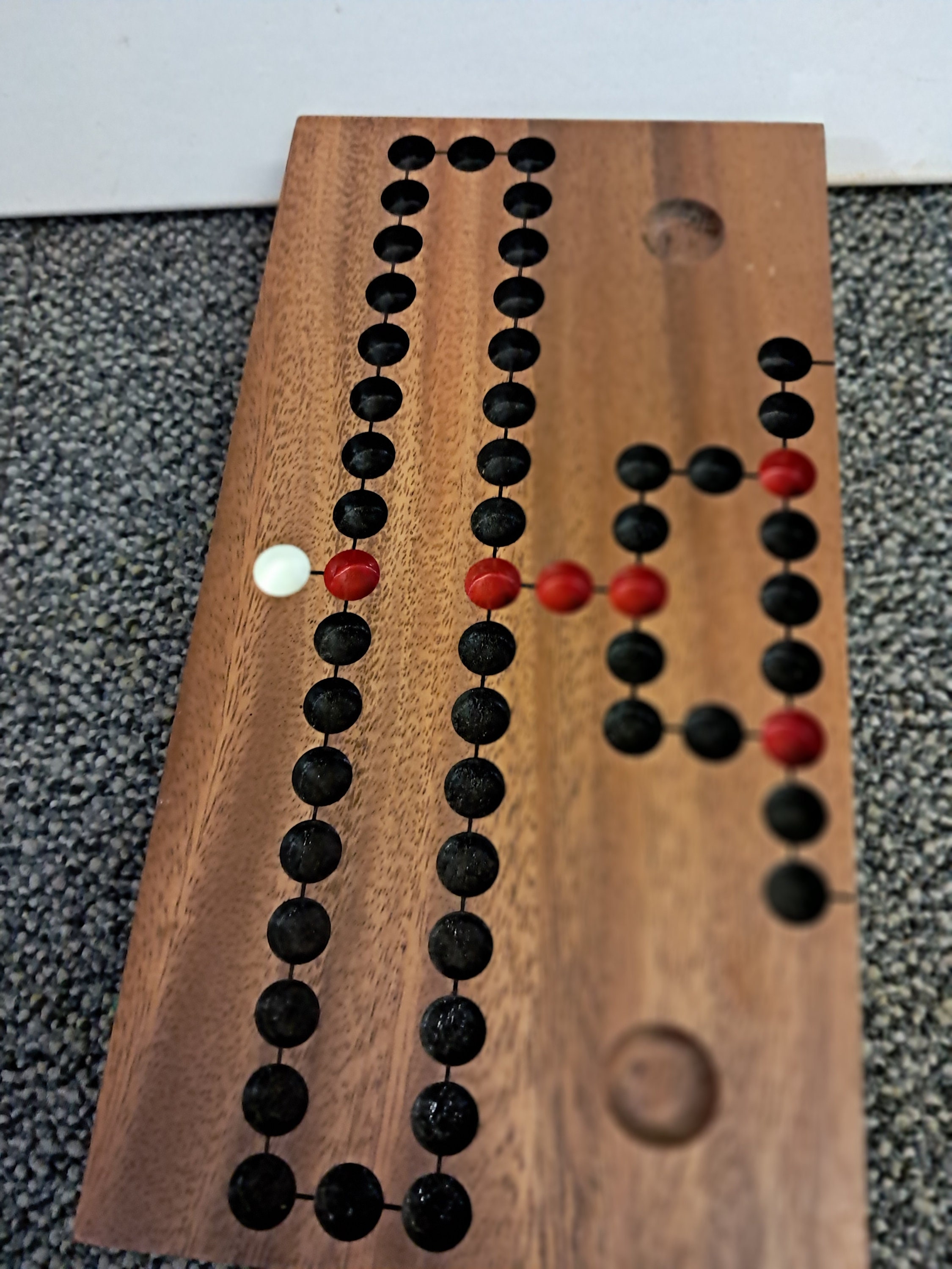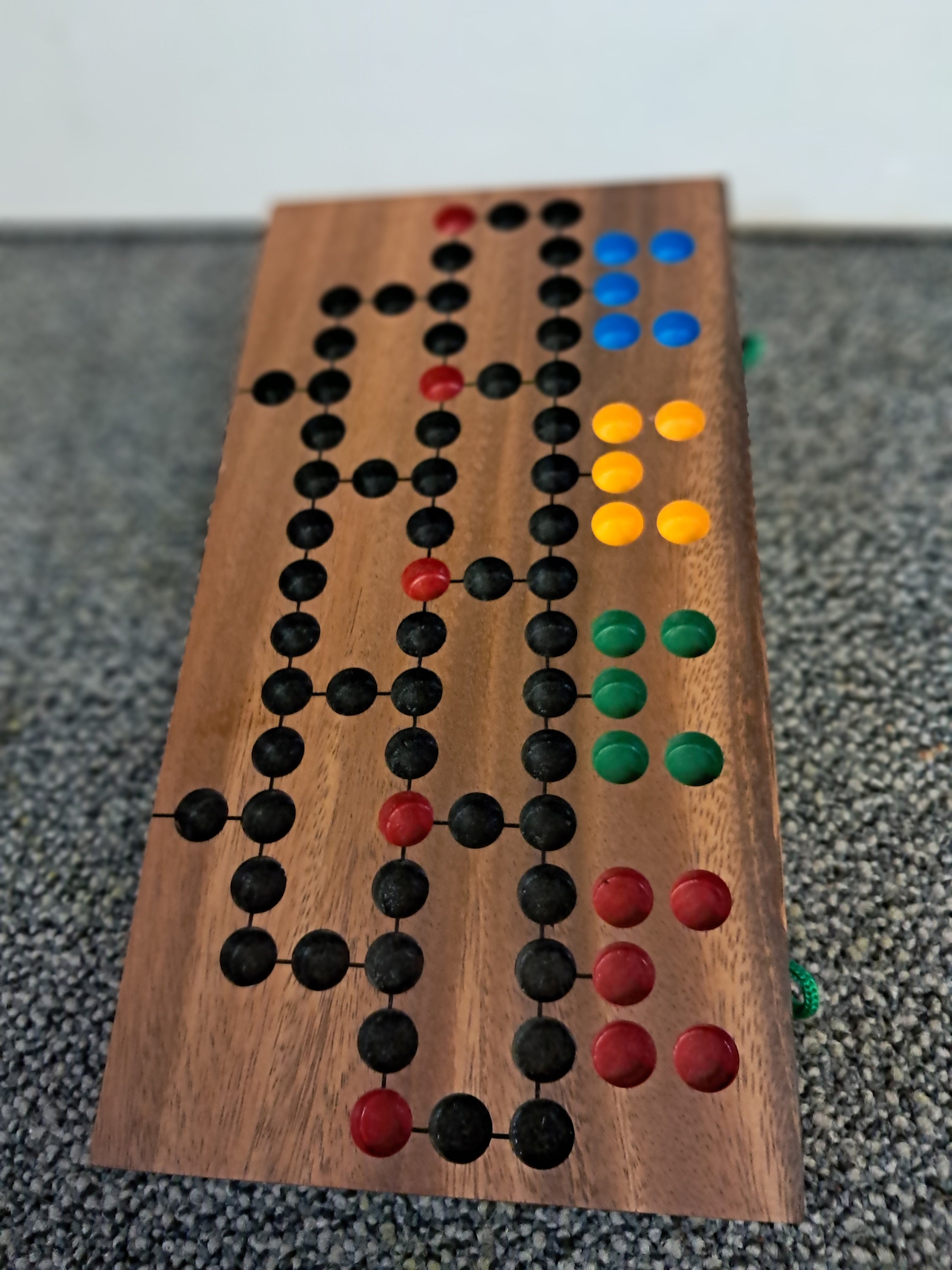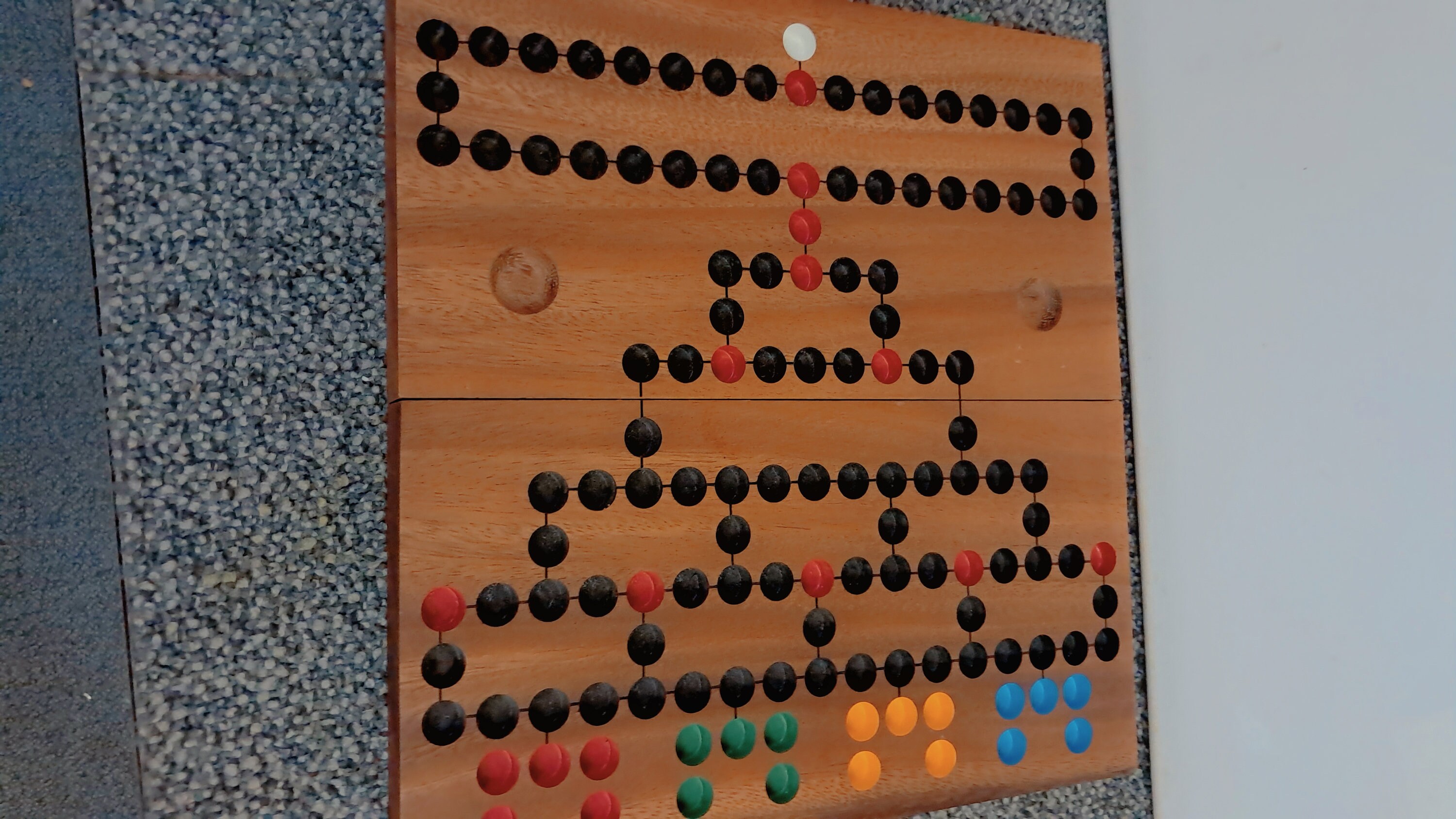 Large, folding game board made of dark Samena wood with coloured game plugs