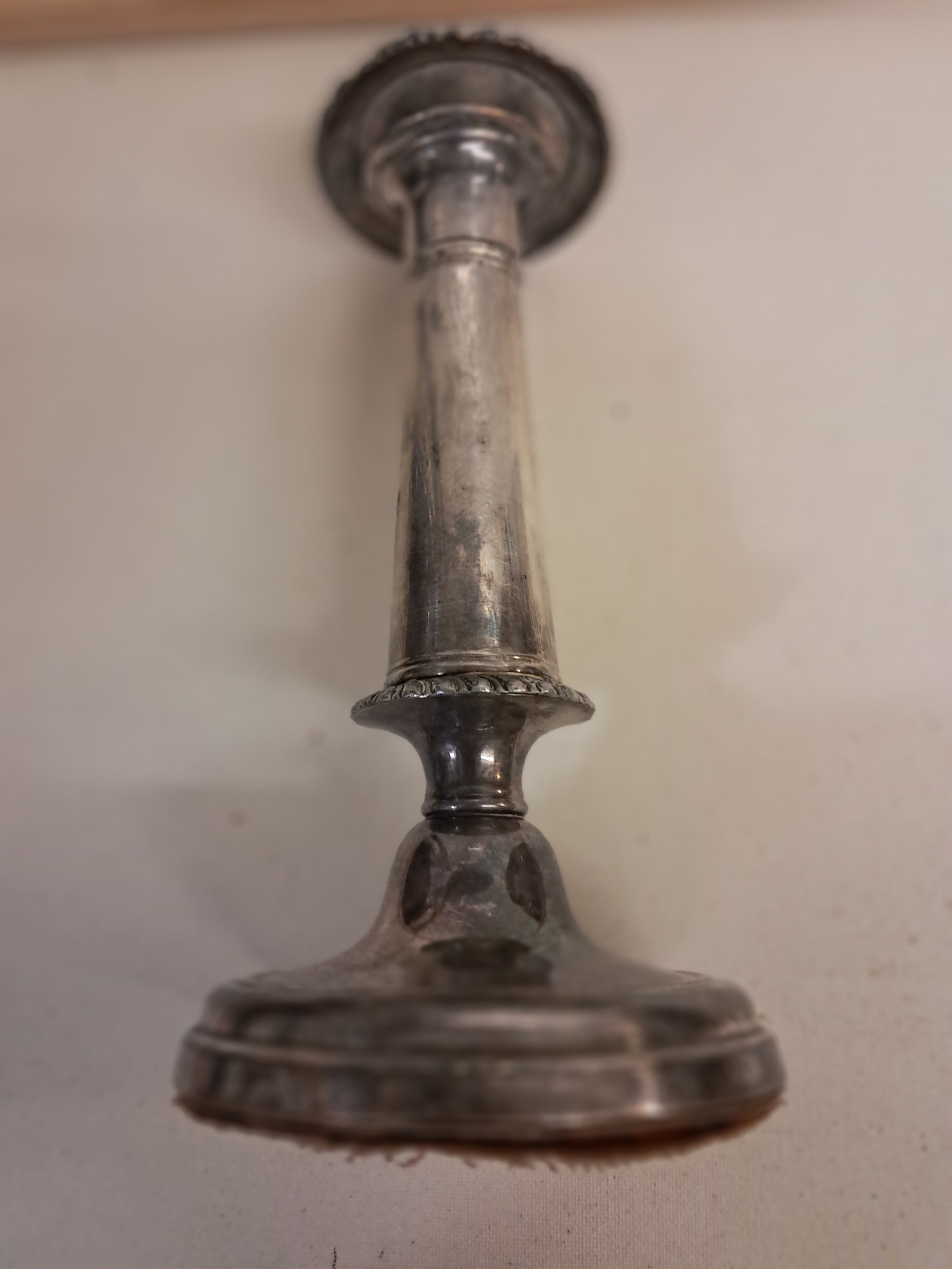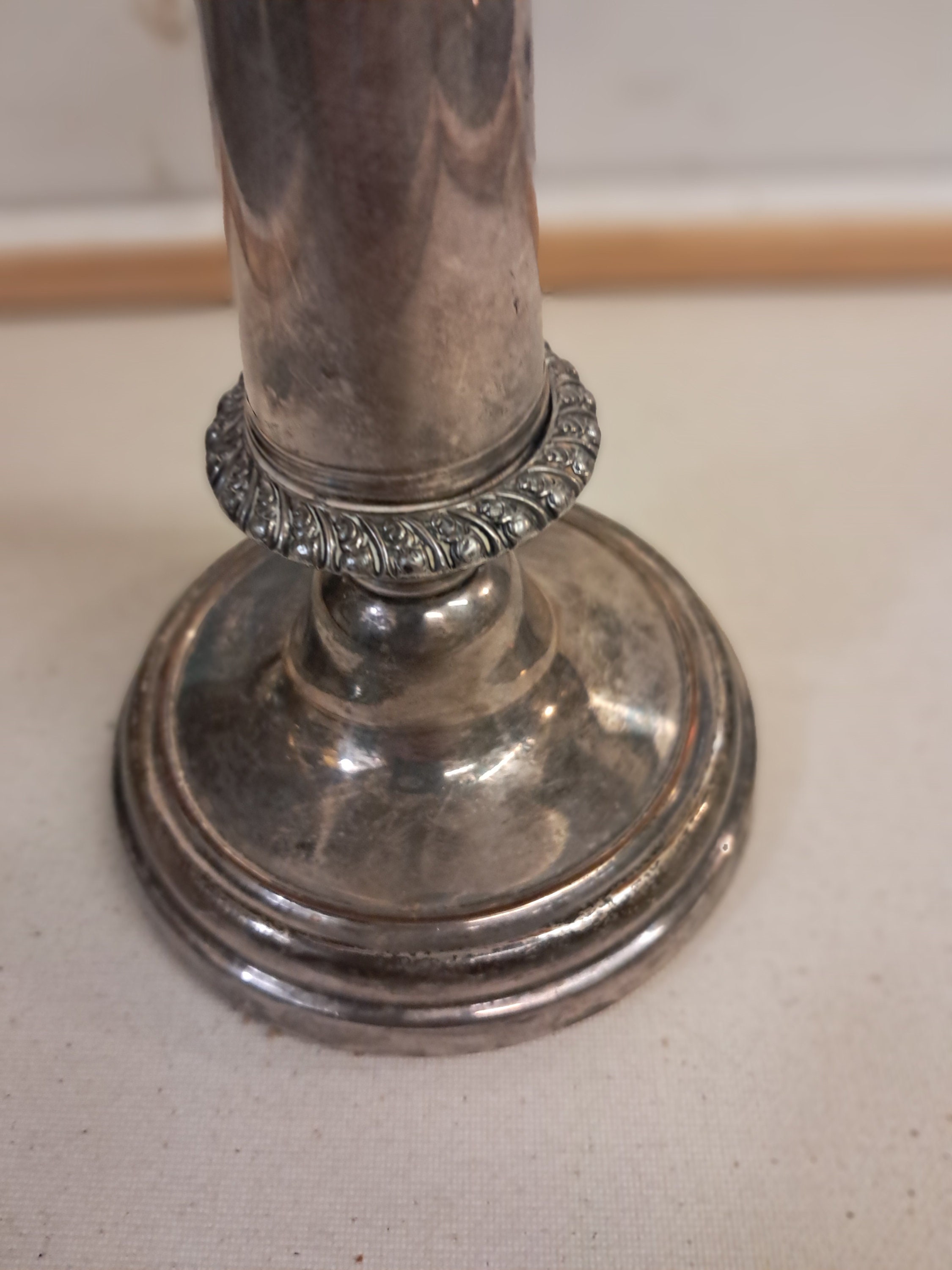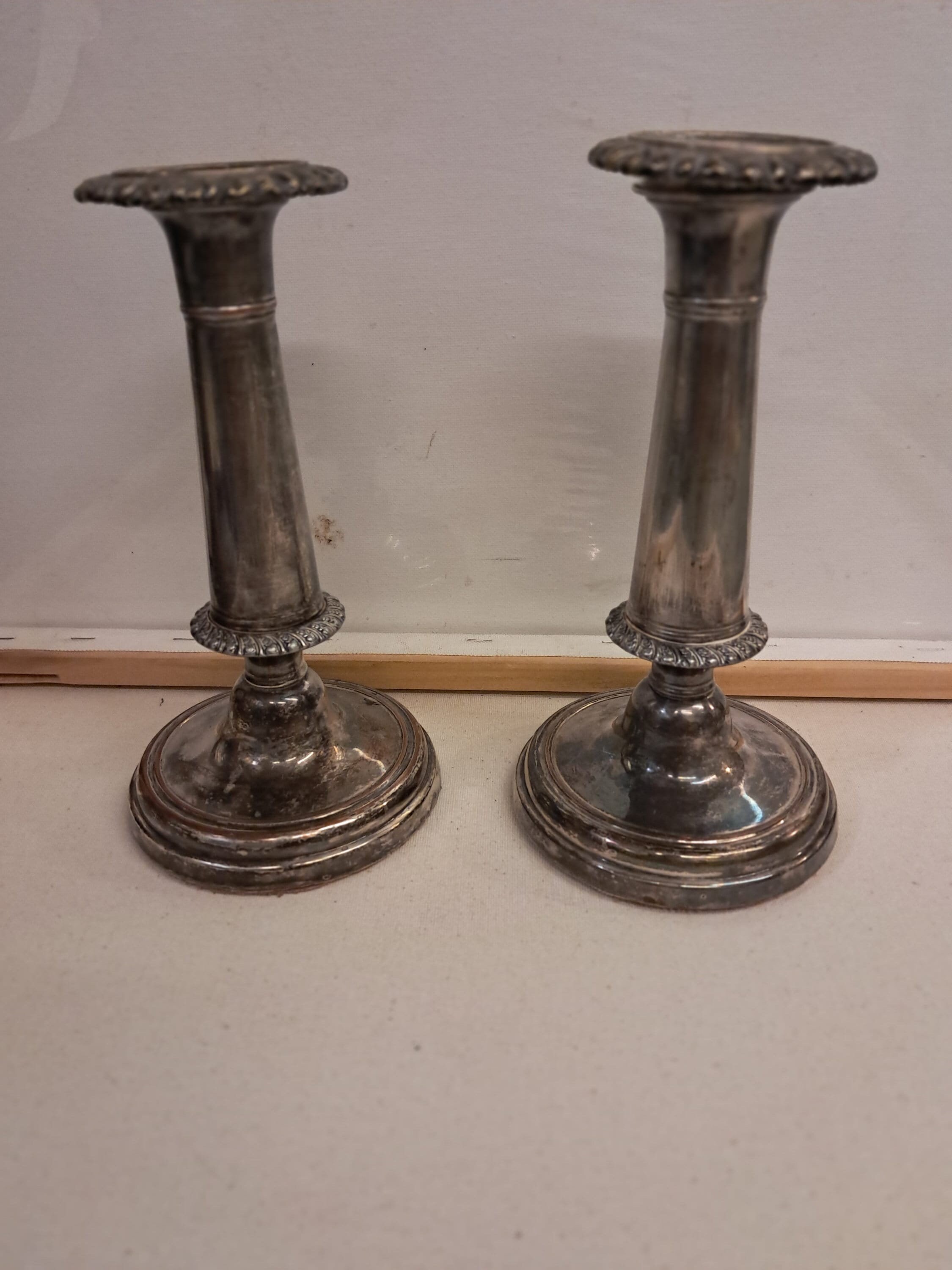 Pair late 19th early 20th century English neoclassical silverplate column candlesticks.
