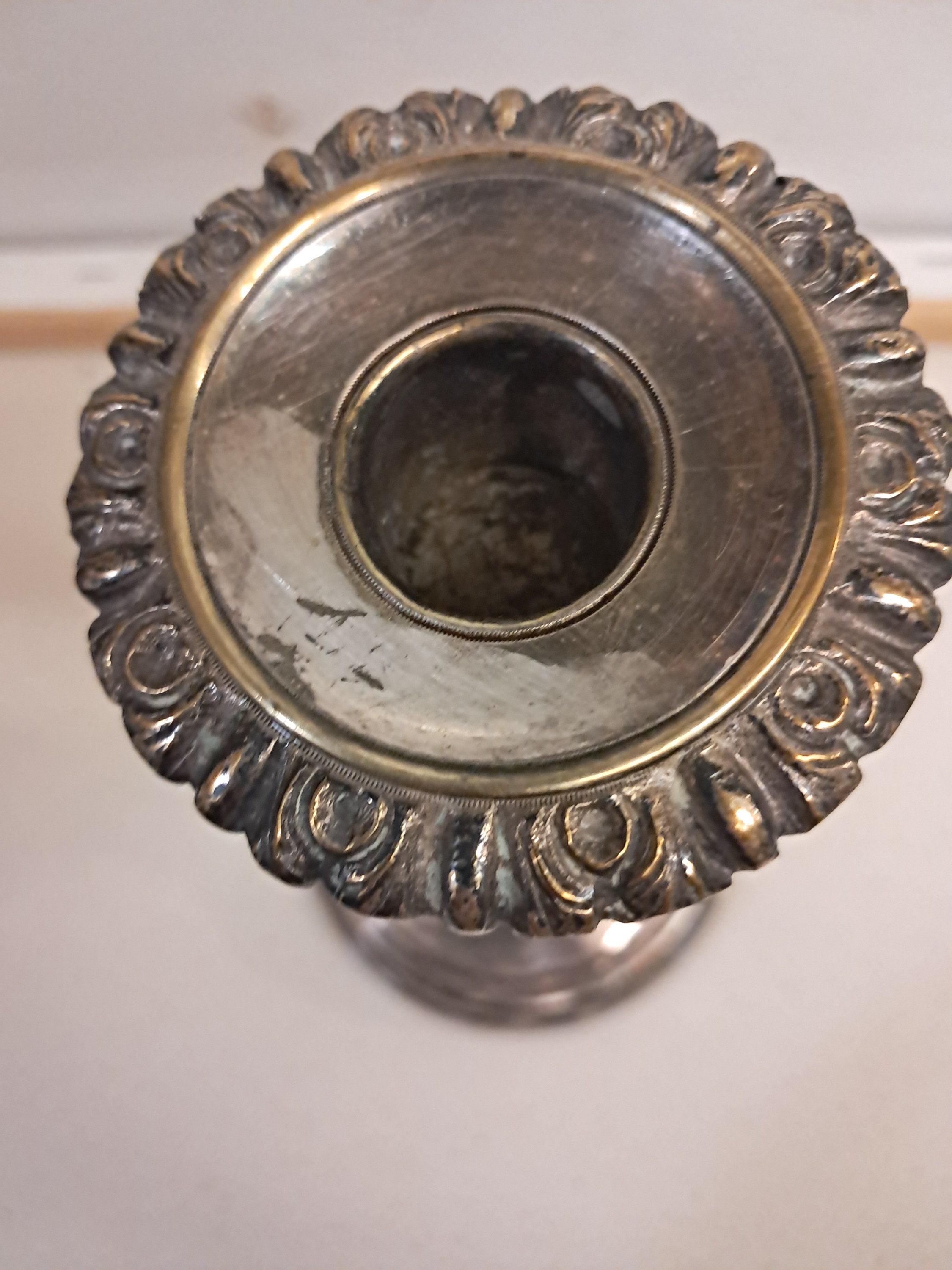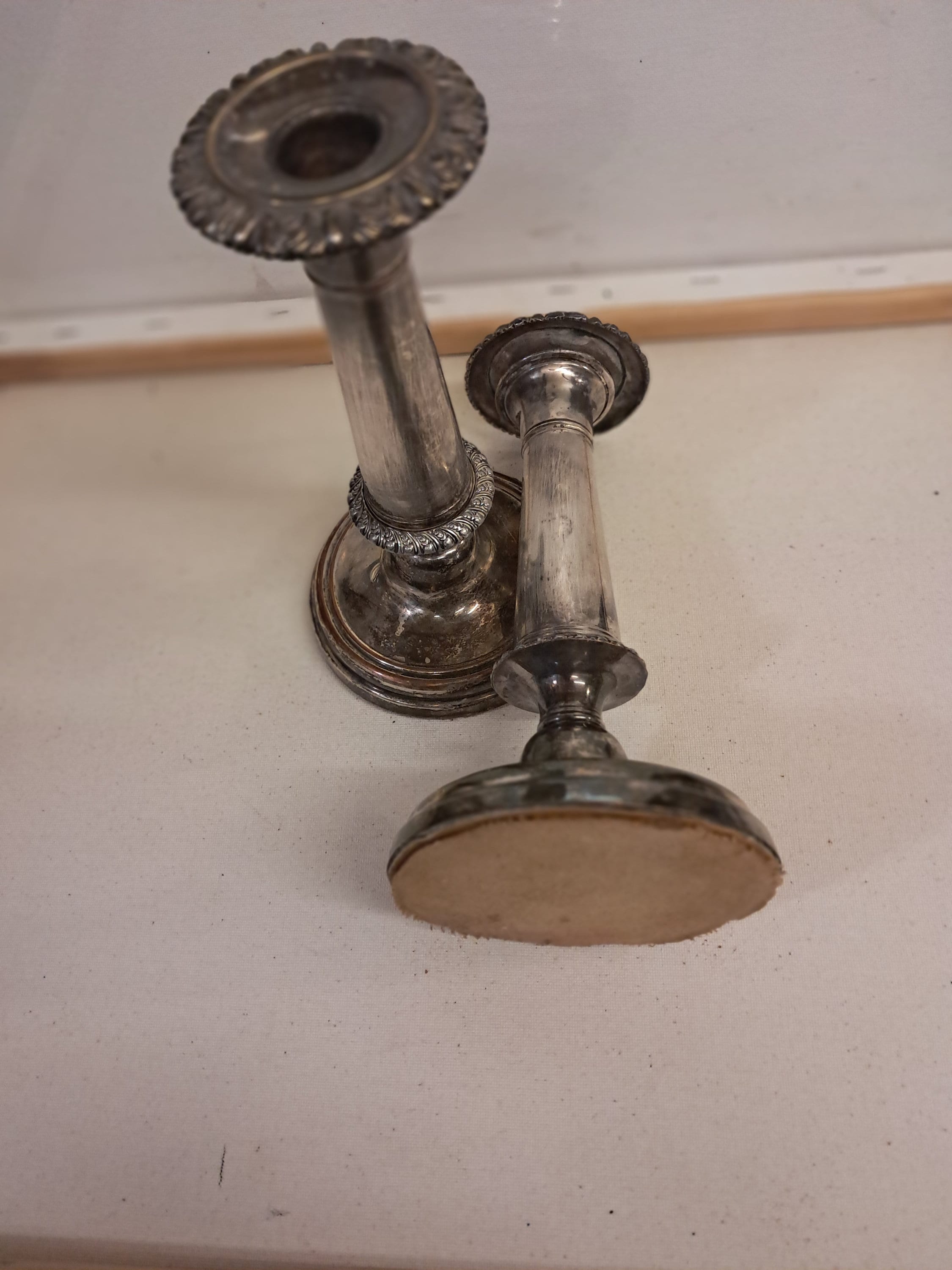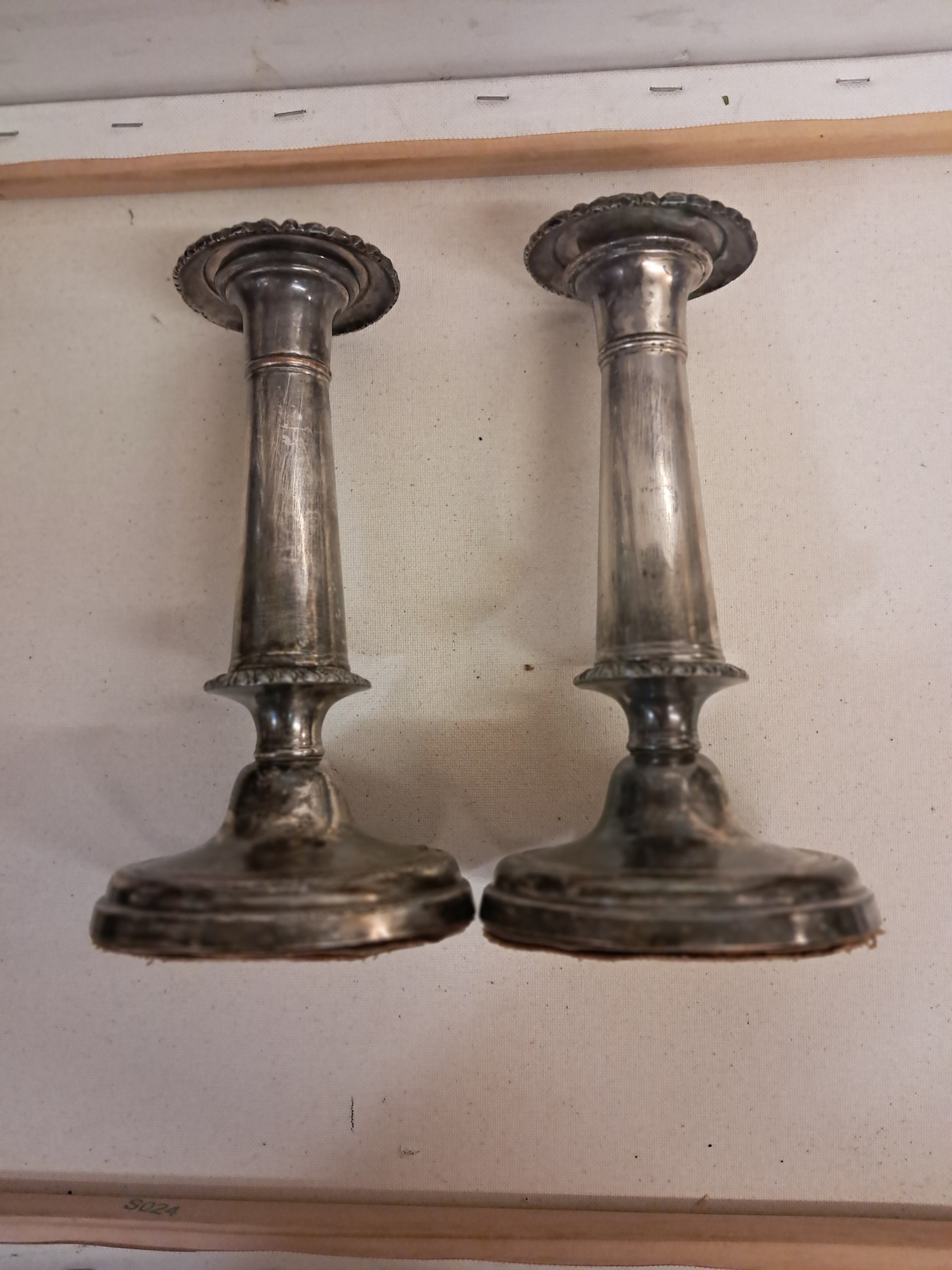 Pair late 19th early 20th century English neoclassical silverplate column candlesticks.