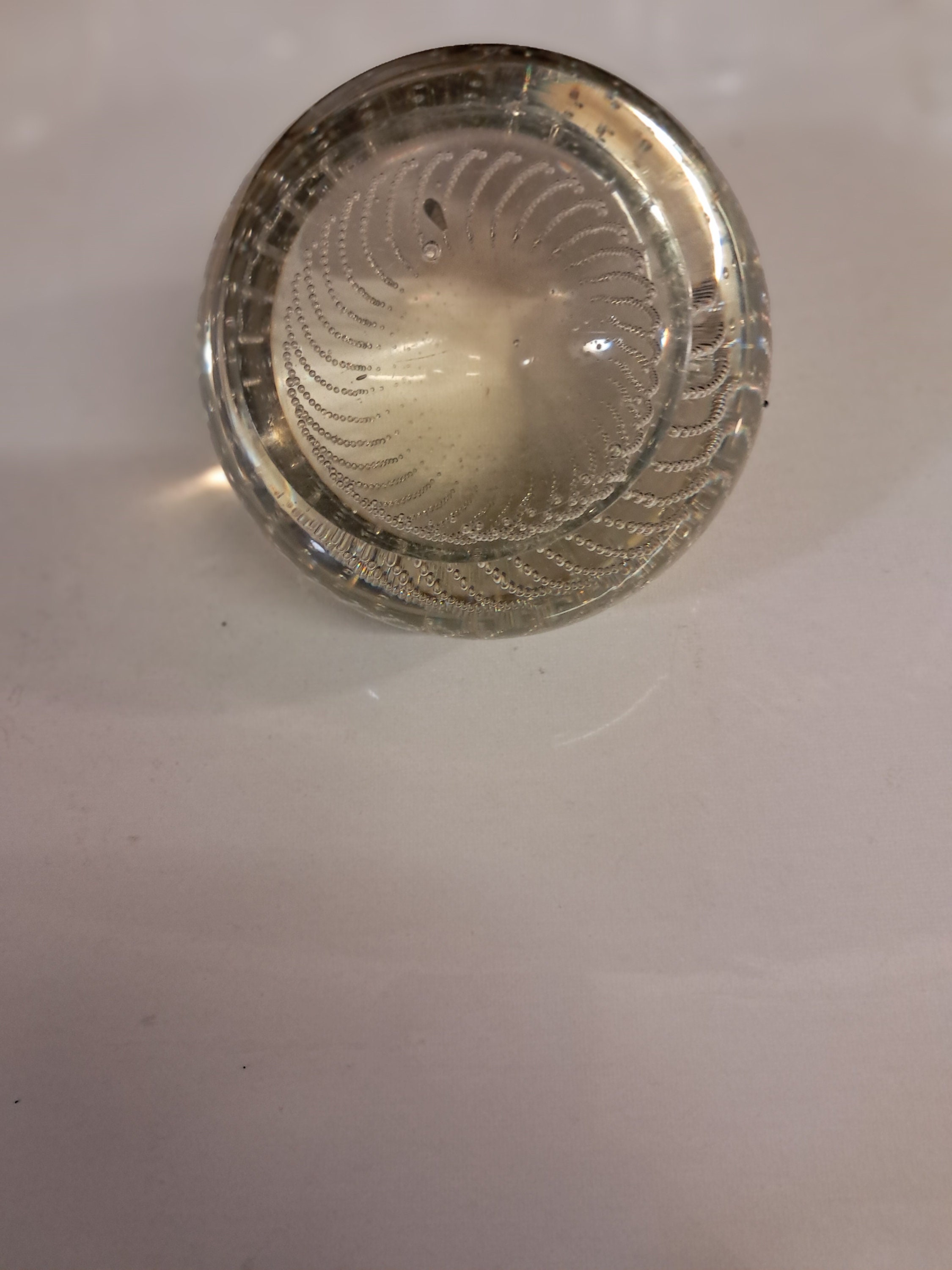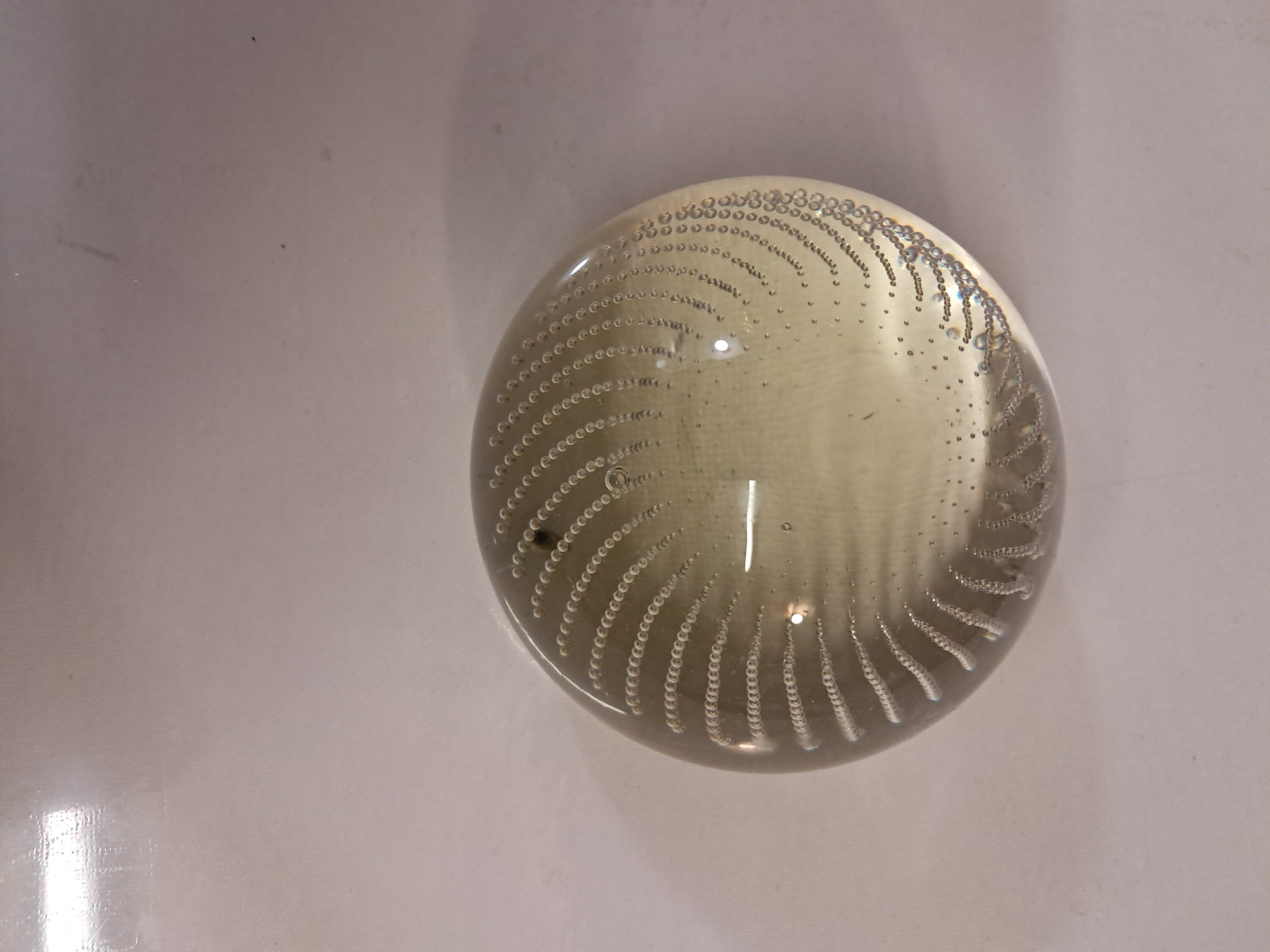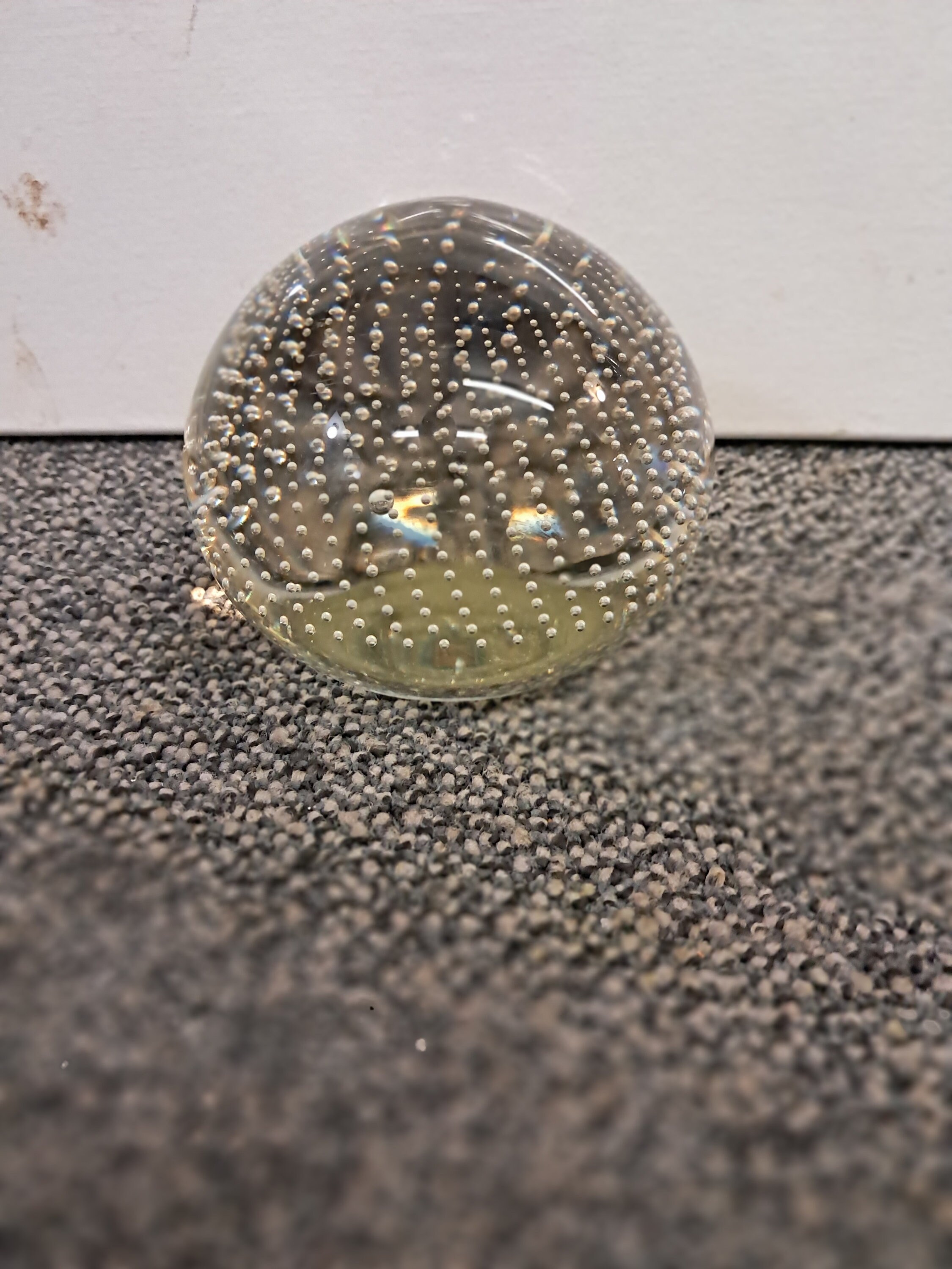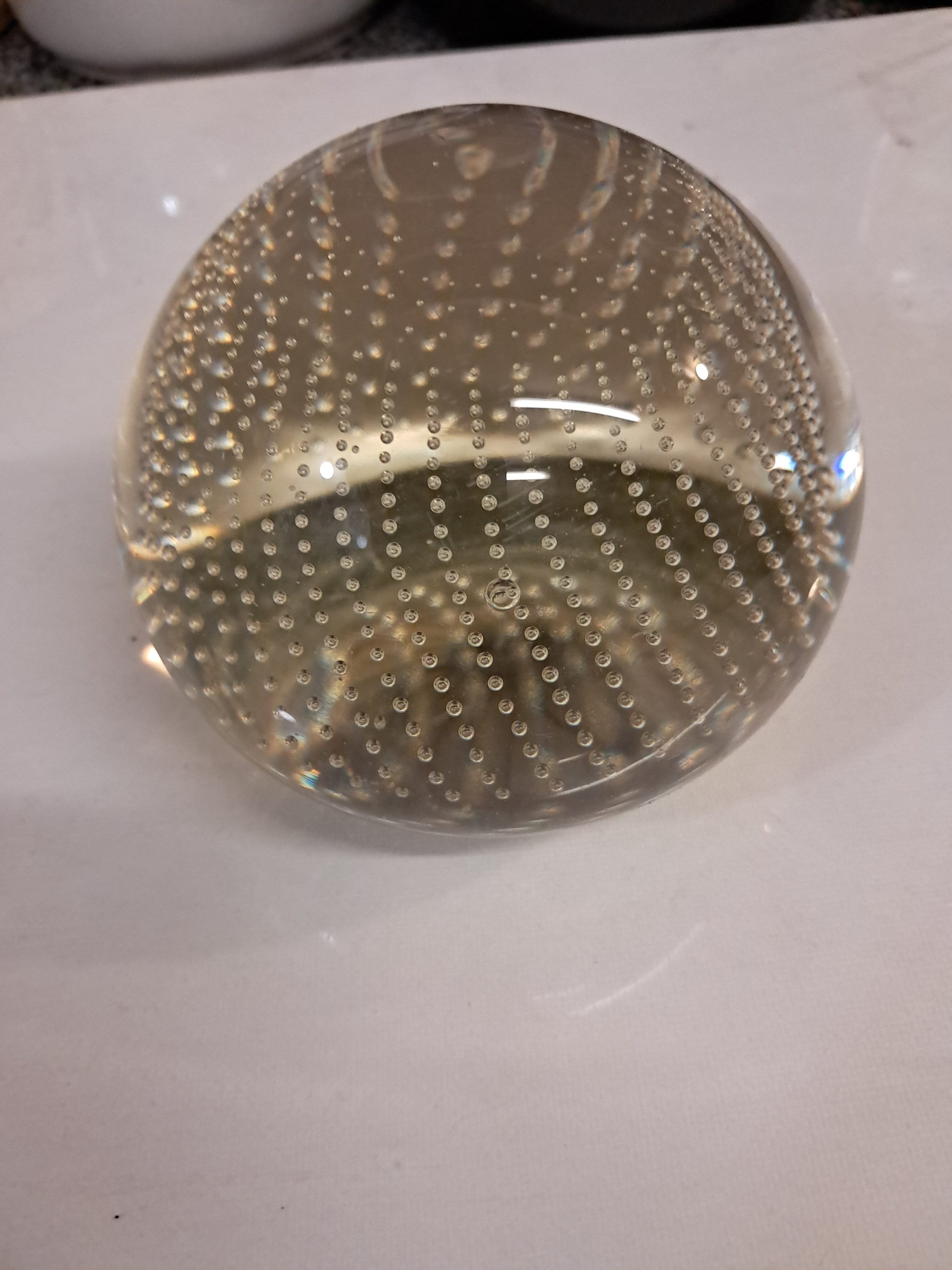 Heavy globe of crystal ball. Air bubbles form an inner sphere with a network of outer bubbles patterned in a network of linear bubbles. Flat bottom with no maker marks. The measurements are 6" in diameter and 5" tall. Mid-century crystal.