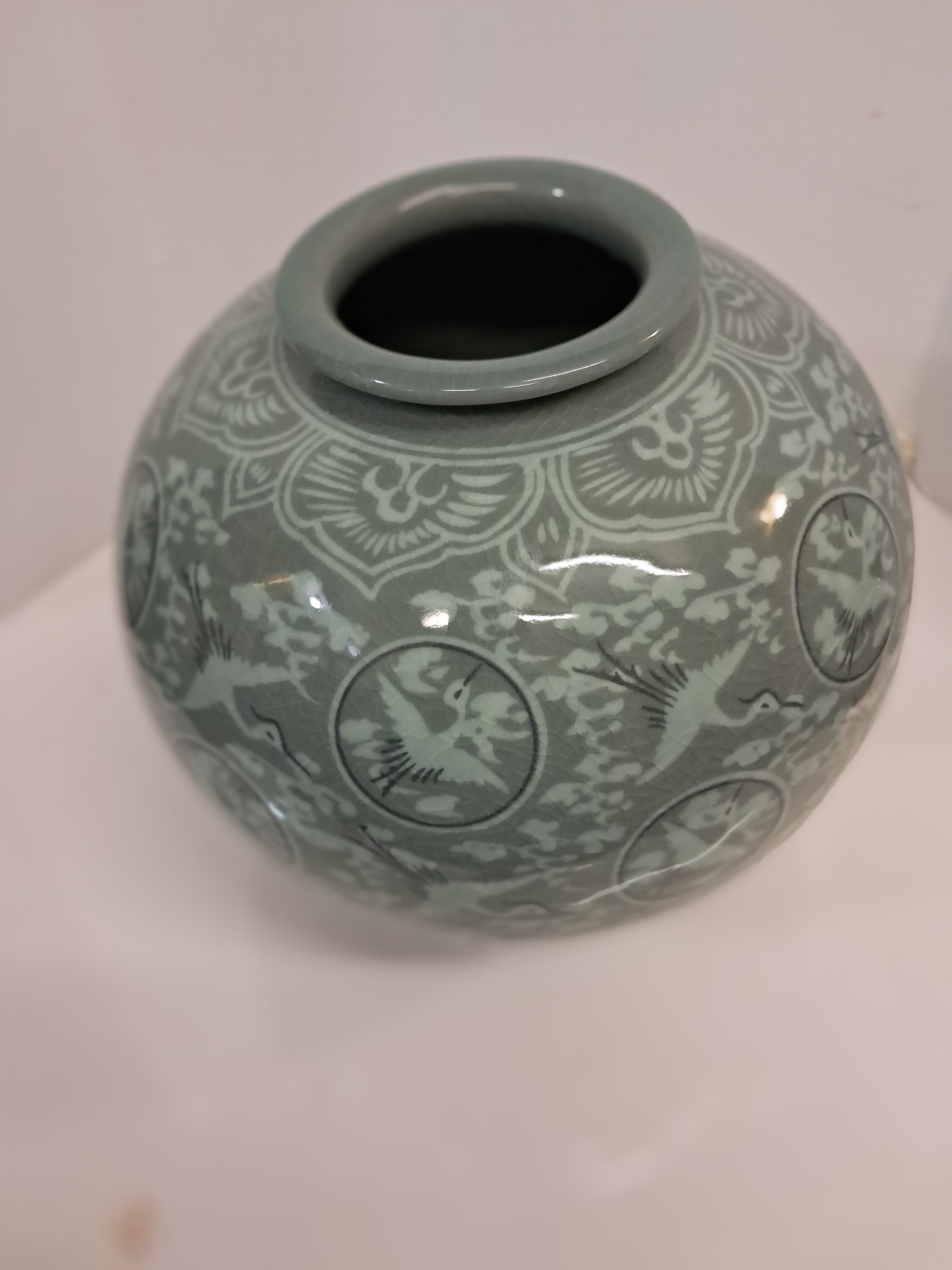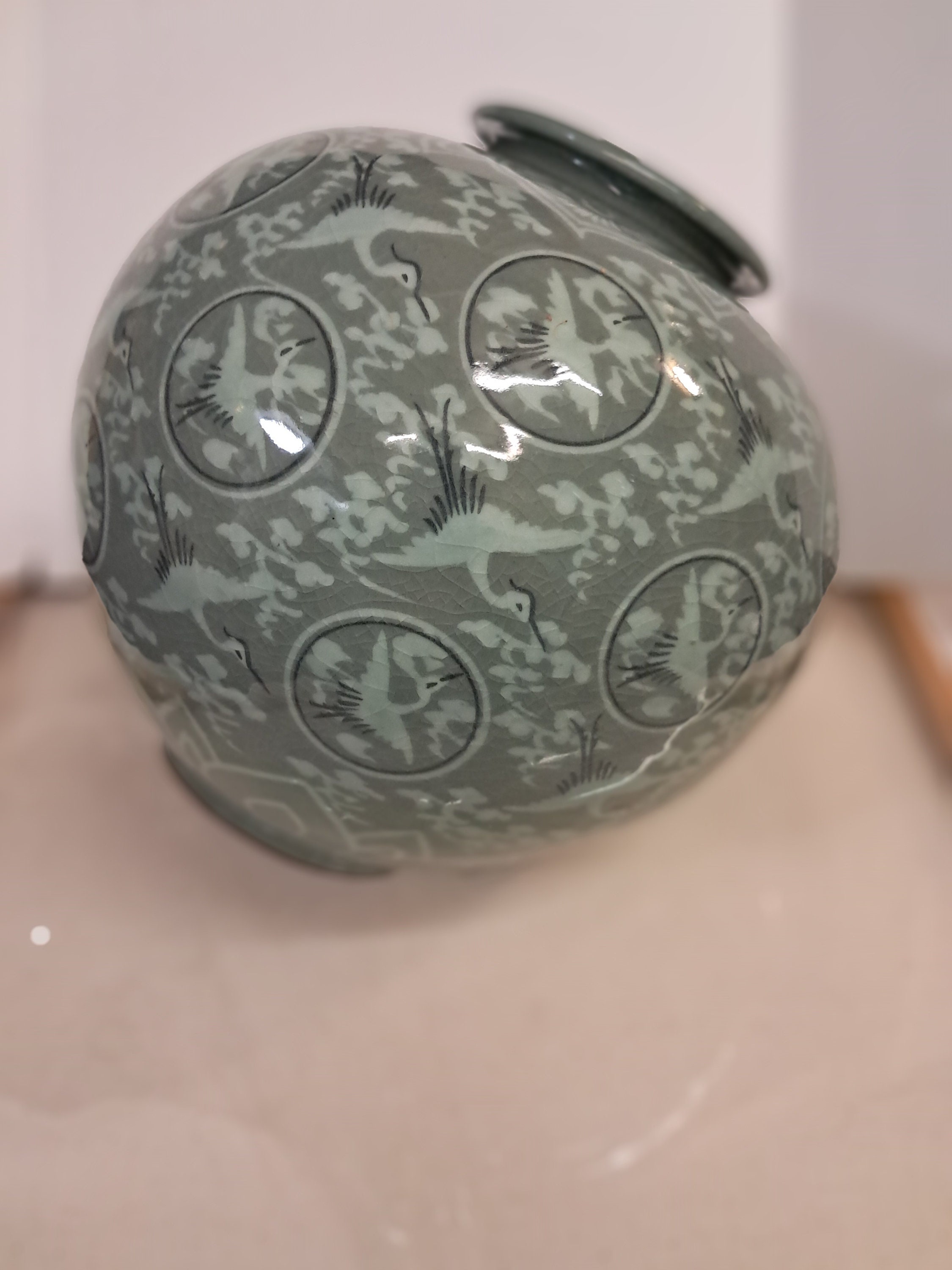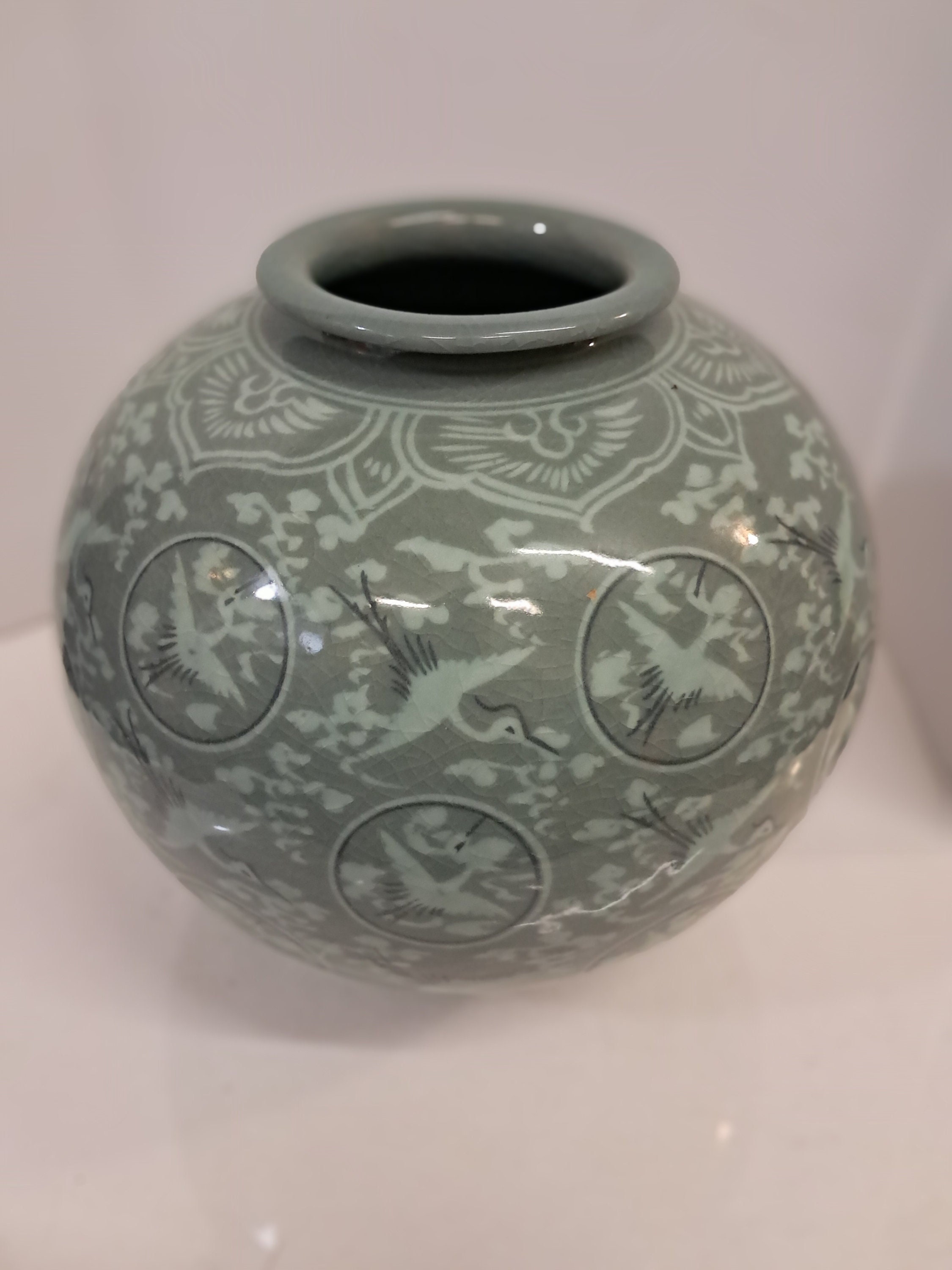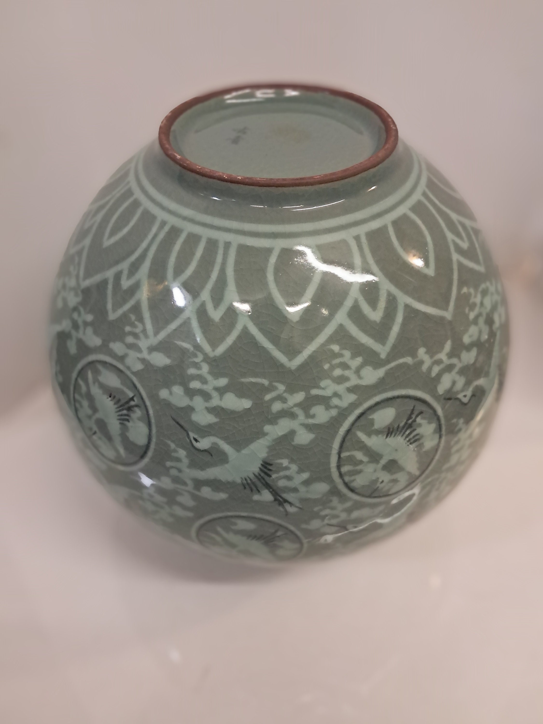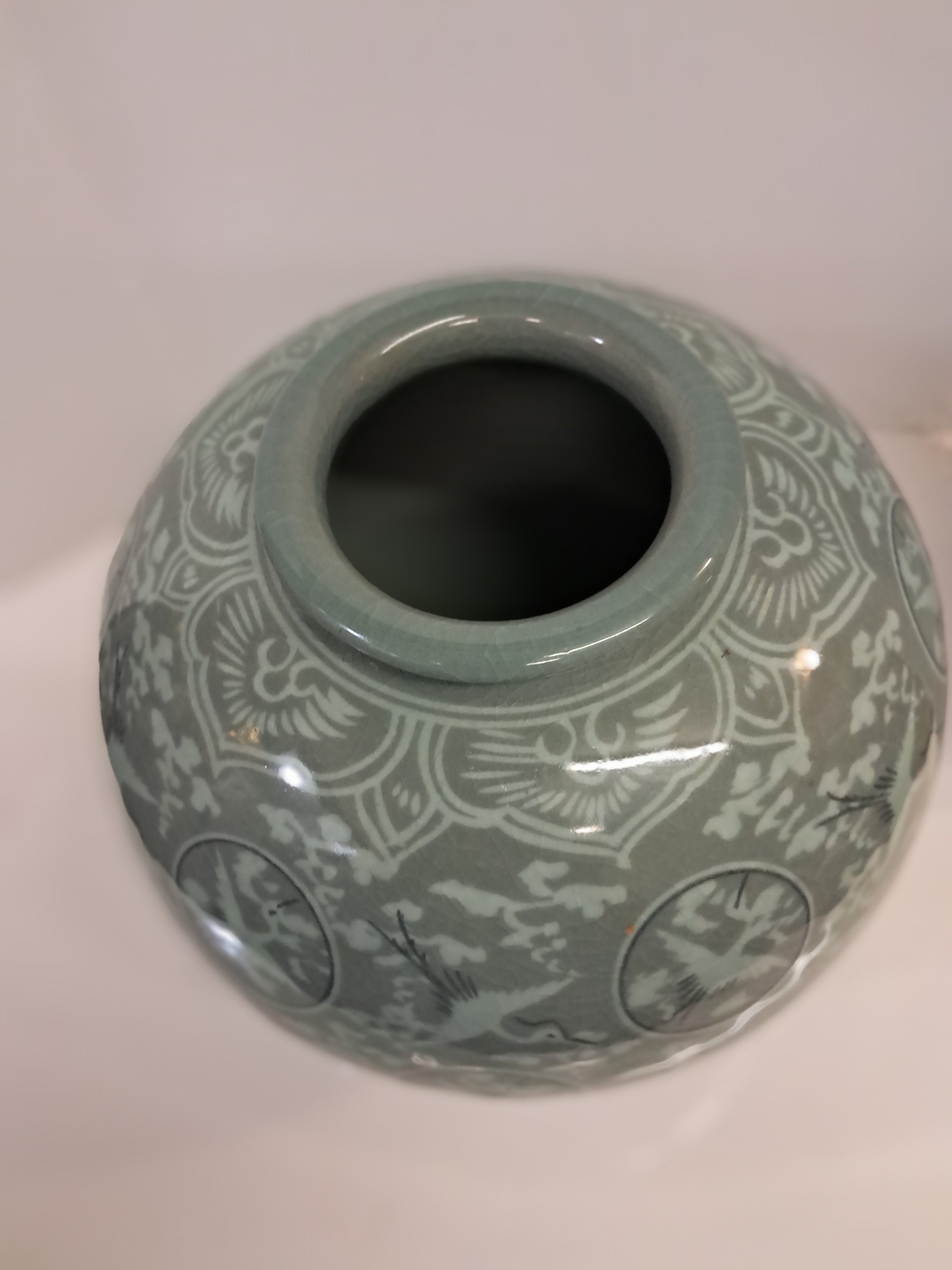 The voluminous form of this ceramic jar from Korea, a reproduction of the great 12th century Goryeo porcelain. Goryeo (918-1392) had already established its own style characterized by a more expansive form and elegantly-curved lines. An increasingly-important achievement of Goryeo ceramic ware in the world's ceramics history is the introduction of the inlaying technique to the art of pottery. In this porcelain jar, whose form, size and luxuriousness make it one of the greatest masterpieces of its kind, the pattern of cranes and clouds is exquisitely inlaid into the surface of the jade-blue body.