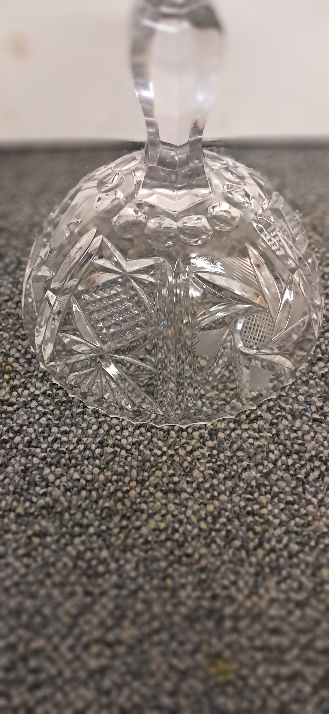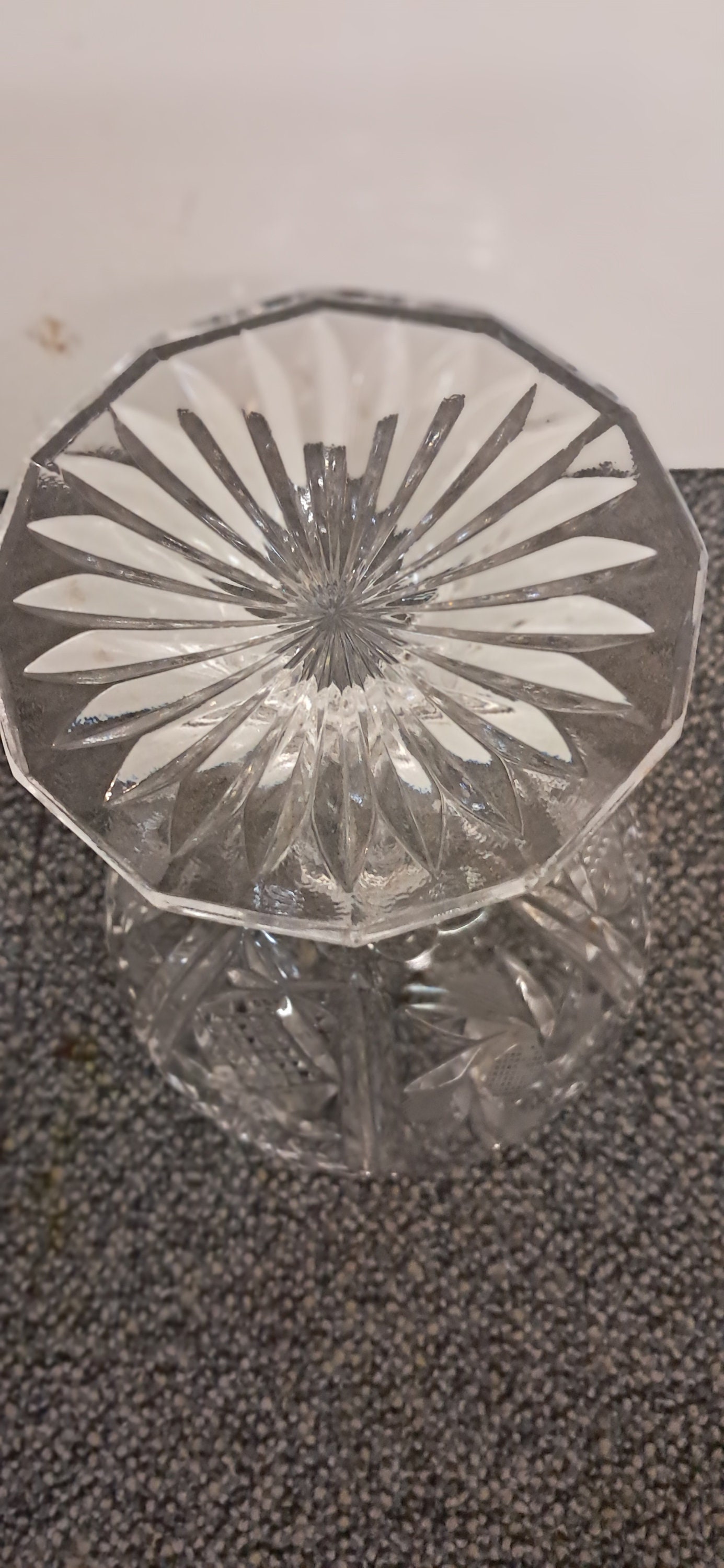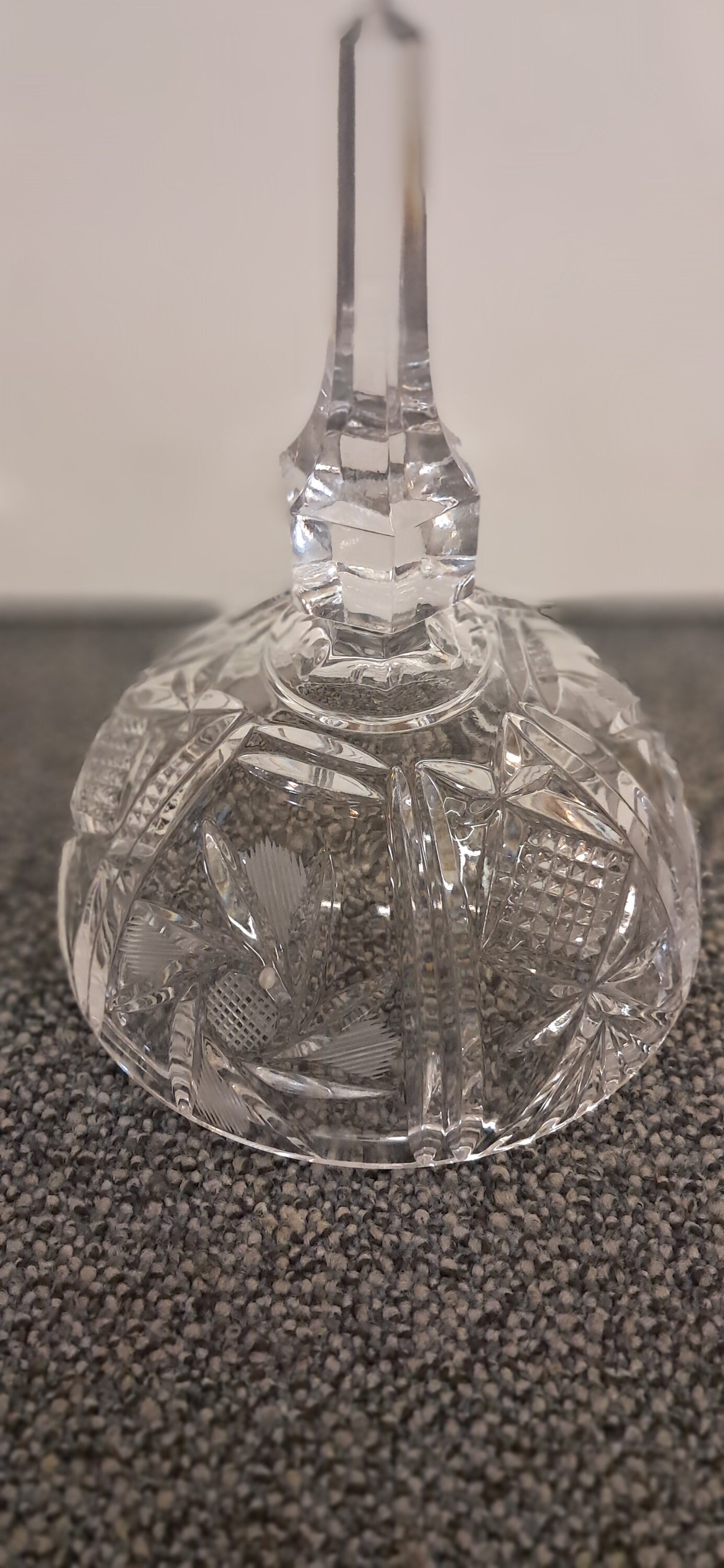 It measures approximately 15” tall x 6” in diameter and features a cut pineapple and pinwheel design with a faceted finial on the lid. It is in excellent vintage condition with no chips, cracks or repairs present, and reflects the light beautifully!