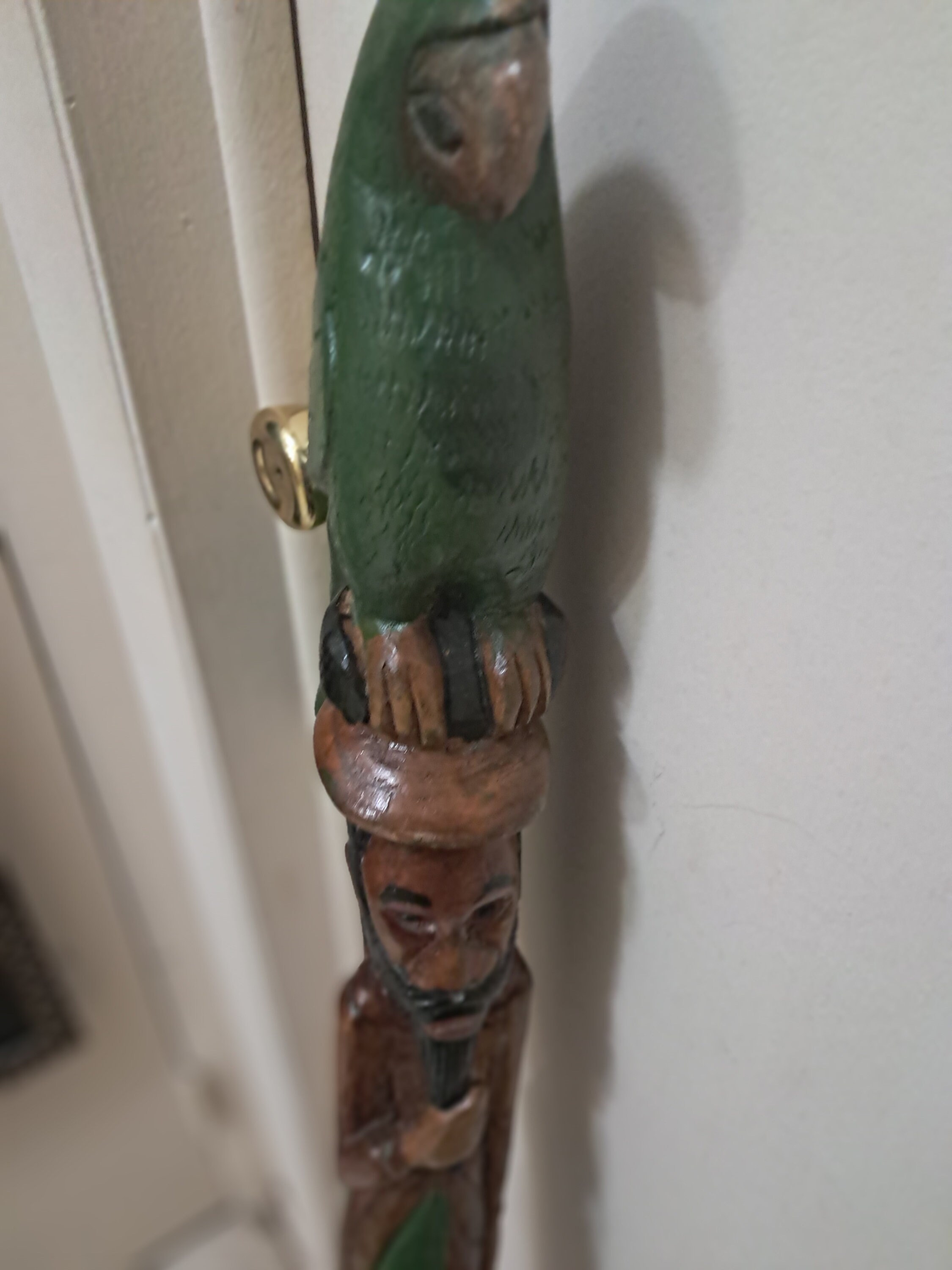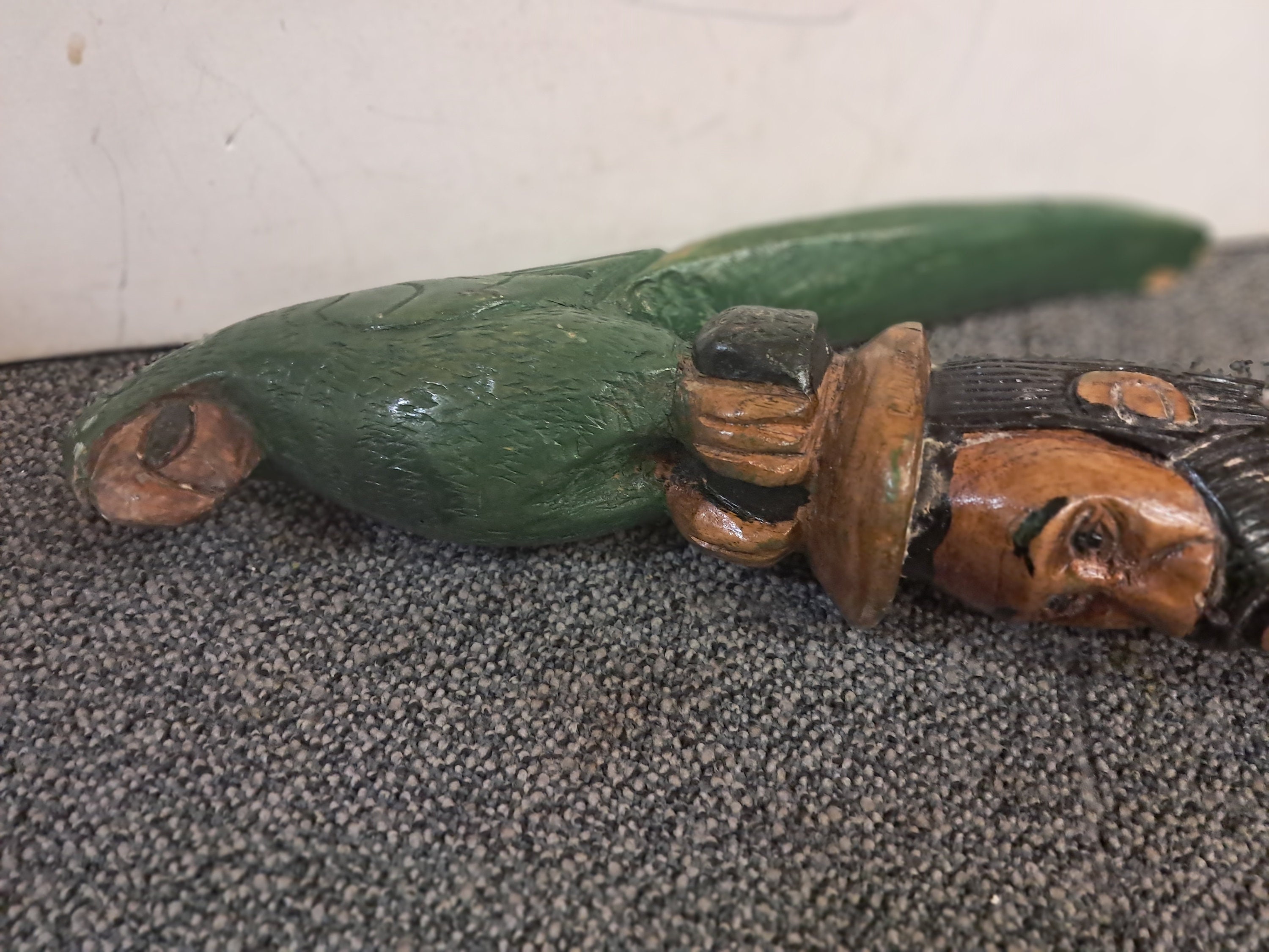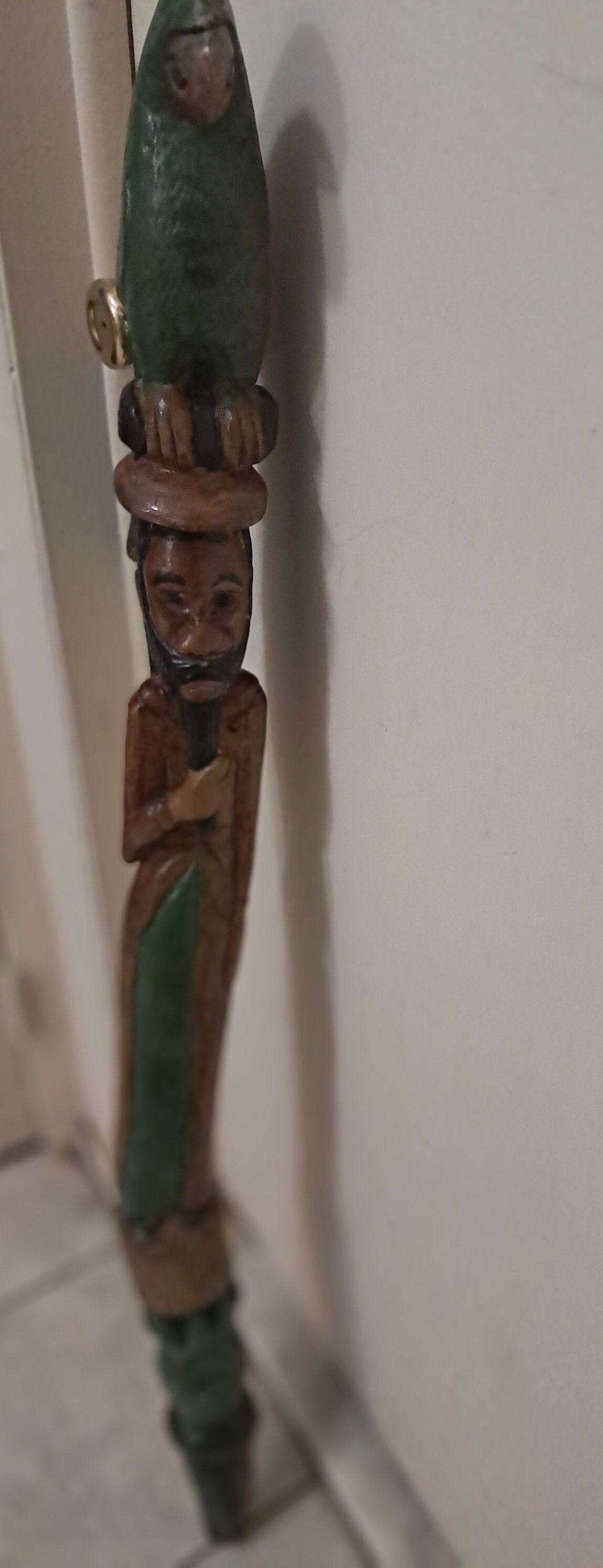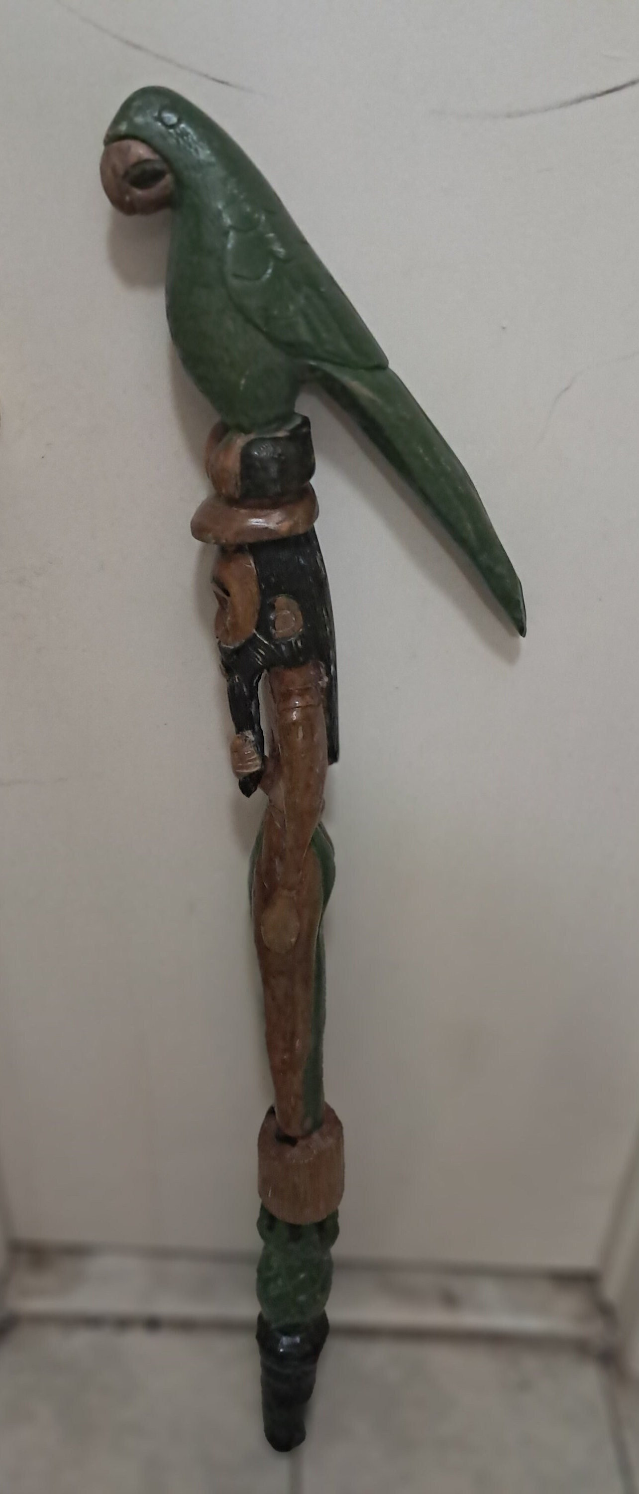 Wooden Walking Stick Staff Cane Hand Carved Painted 44" Parrot & Pirate Design