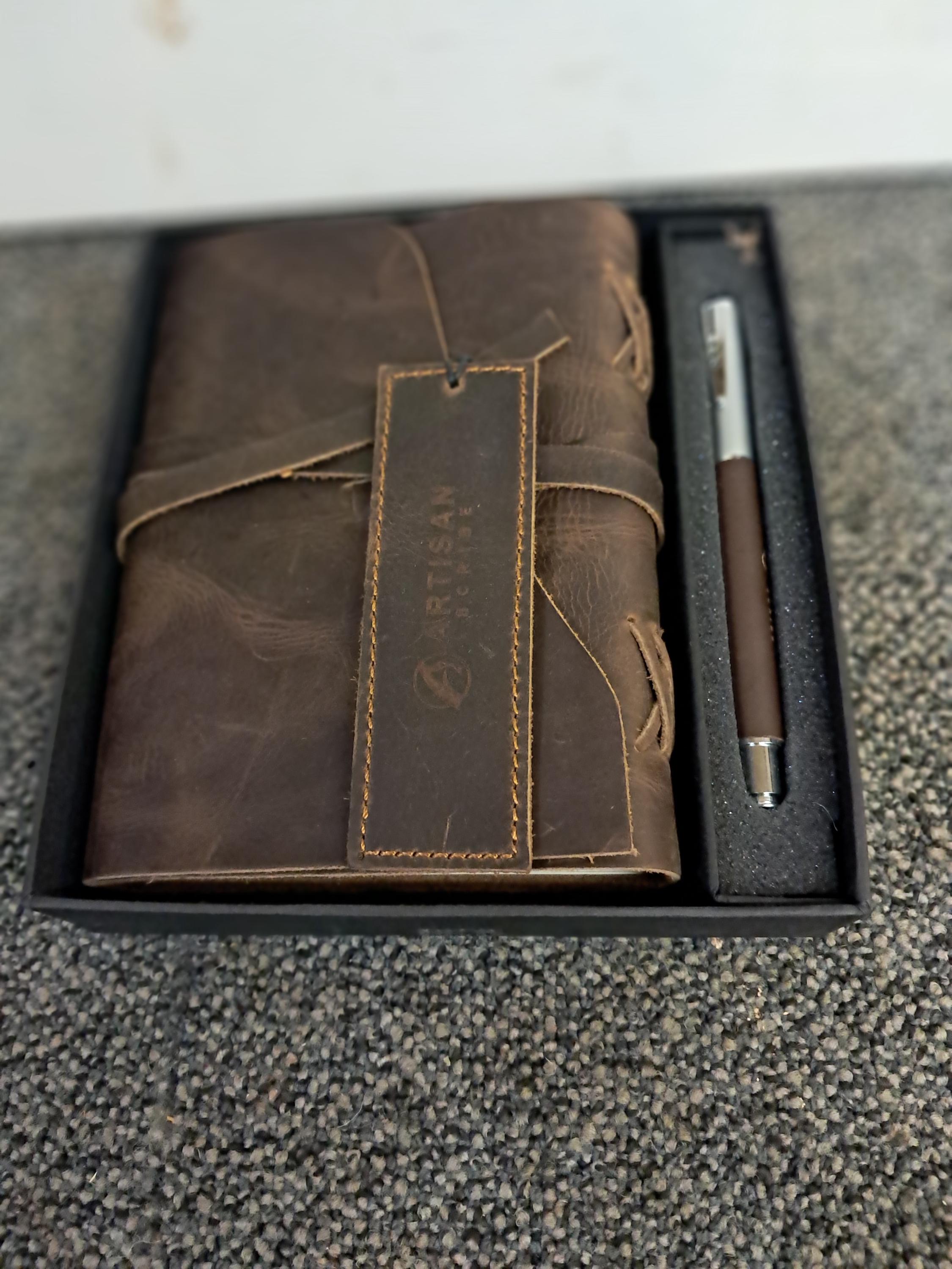 UNIQUE GIFT SET: Handmade leather journal and matching bookmark with designer pen and hidden pen holder. Presented in a finely crafted presentation box. A timeless gift for someone special who loves to write.