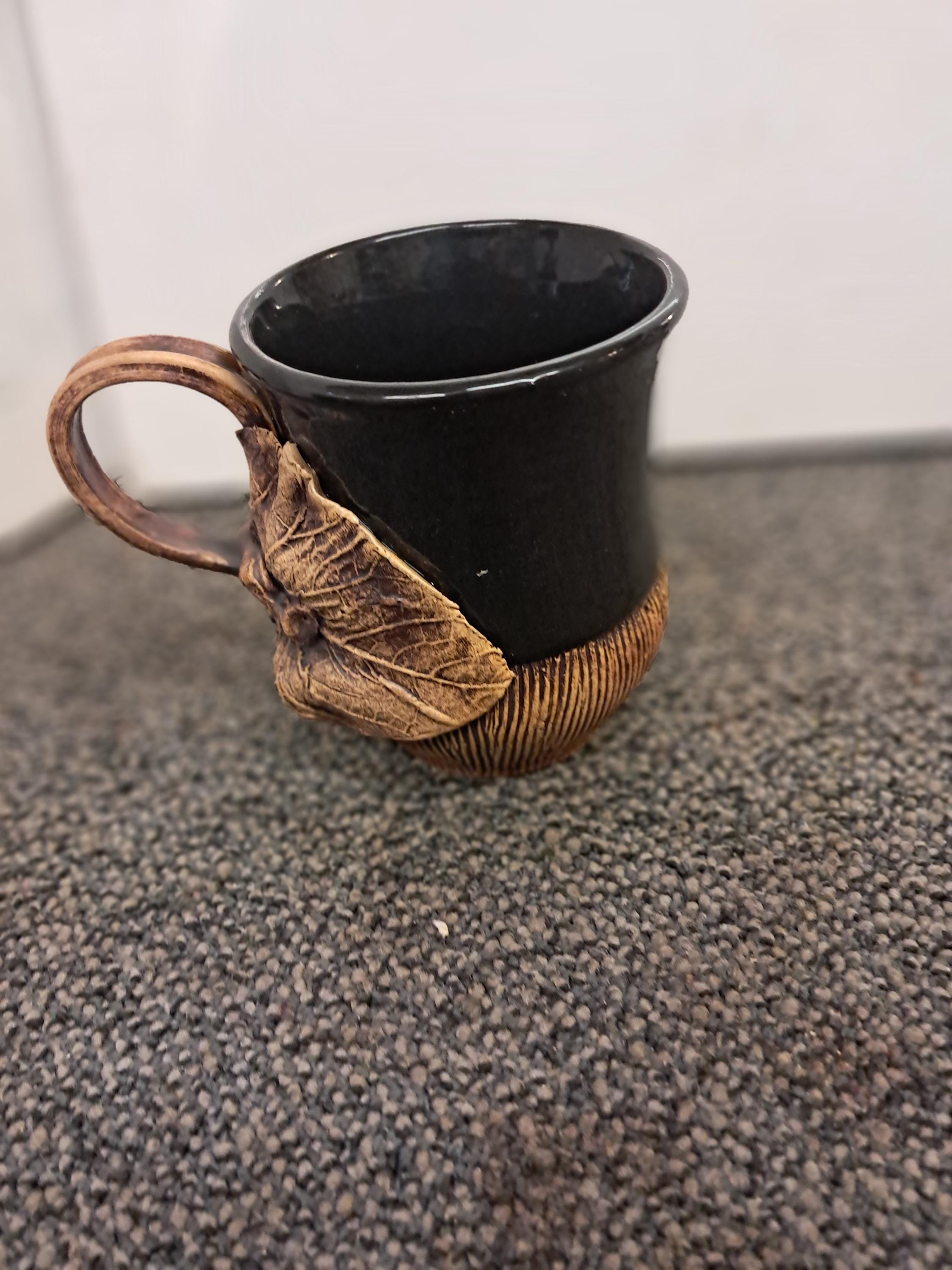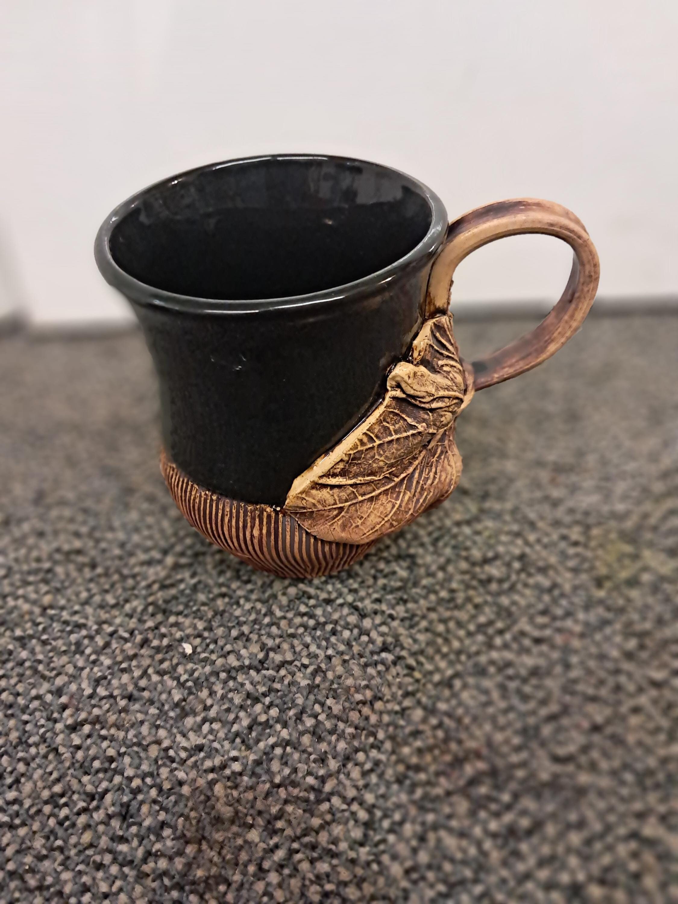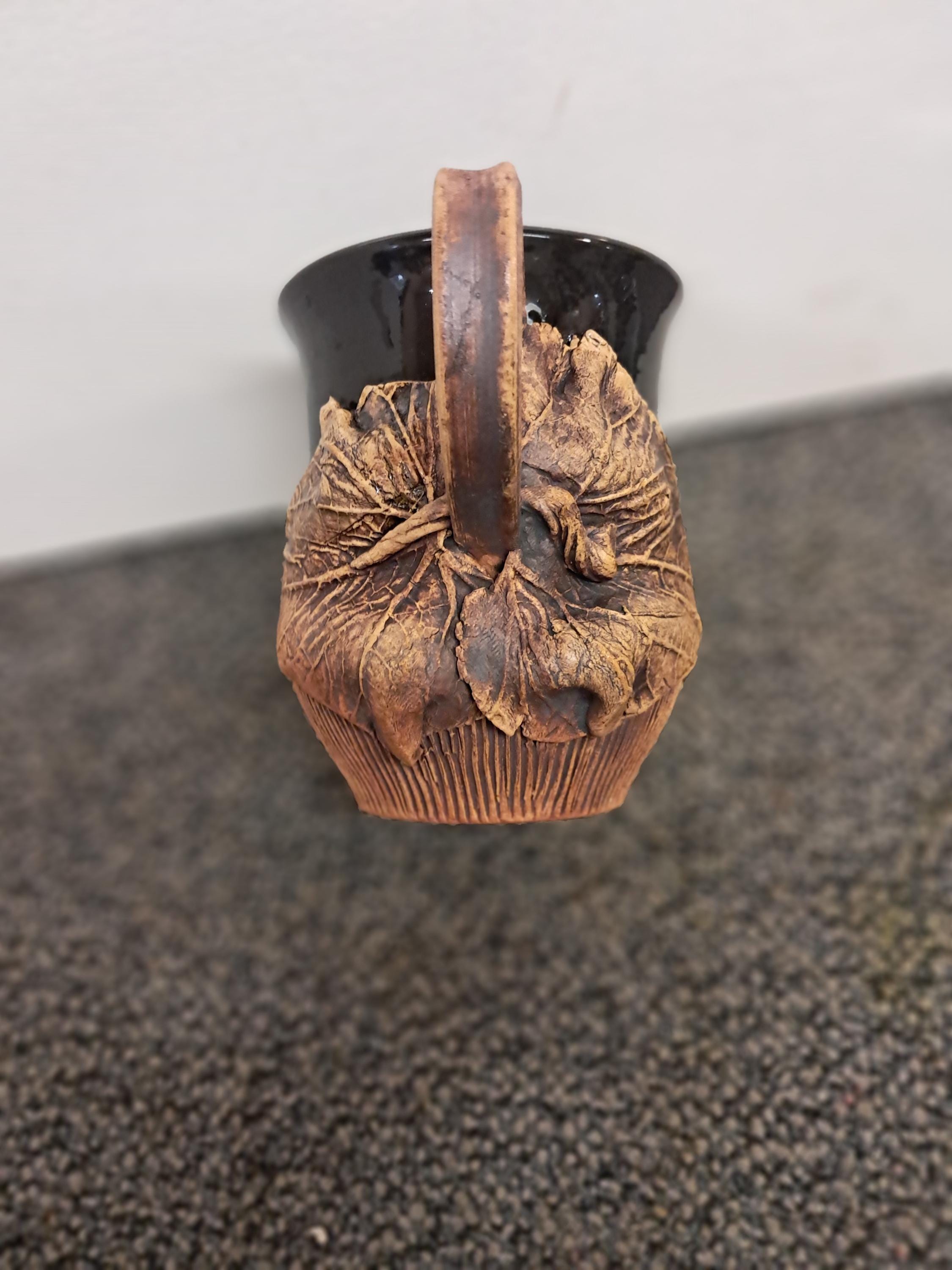 This mug emerged from a ball of speckled, brown clay that was thrown on the pottery wheel. Once firm enough to work, it was trimmed with leaves then joined to handle.