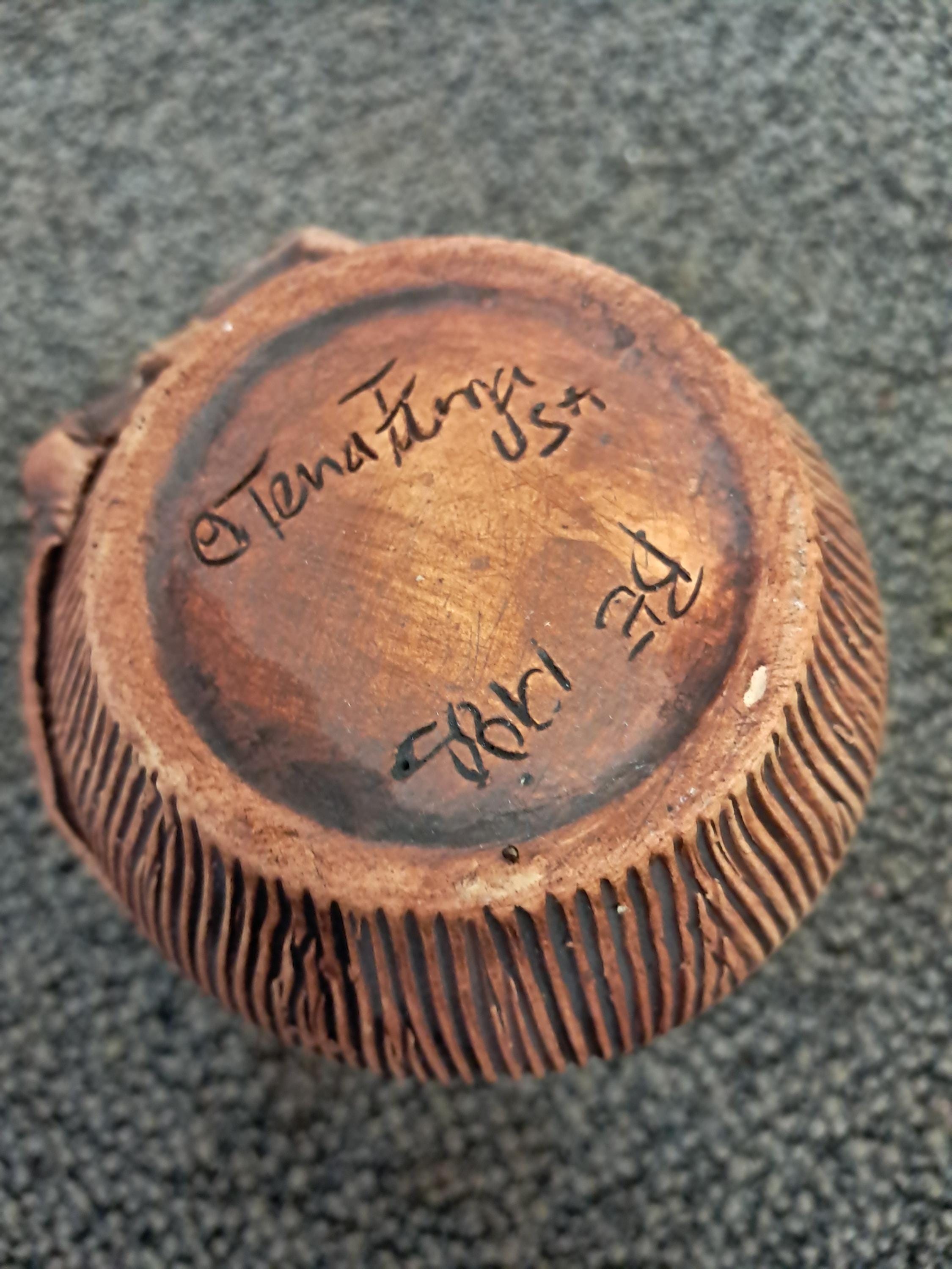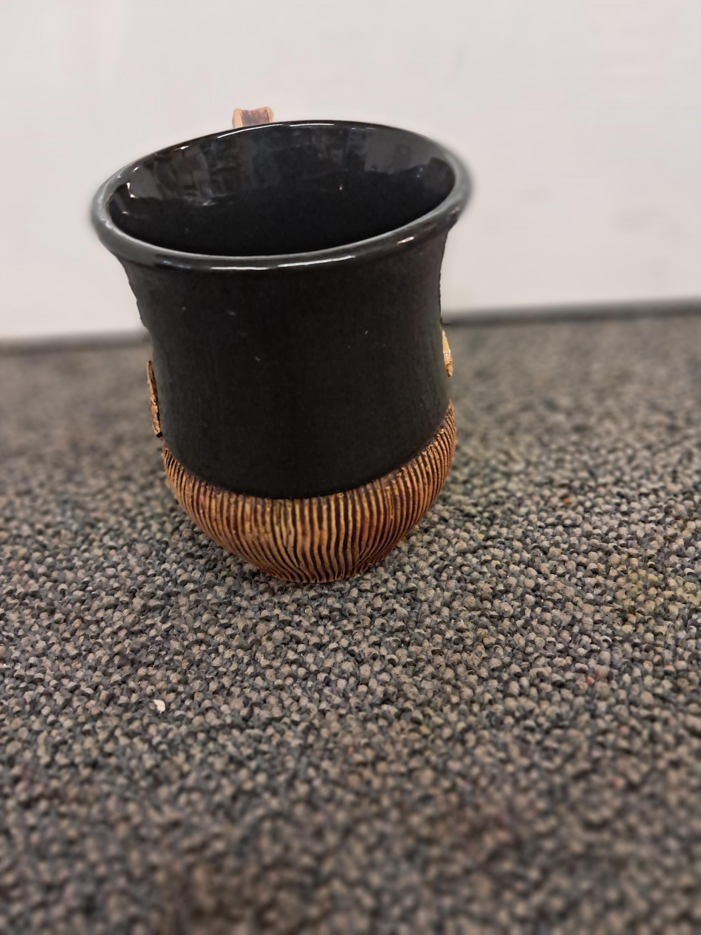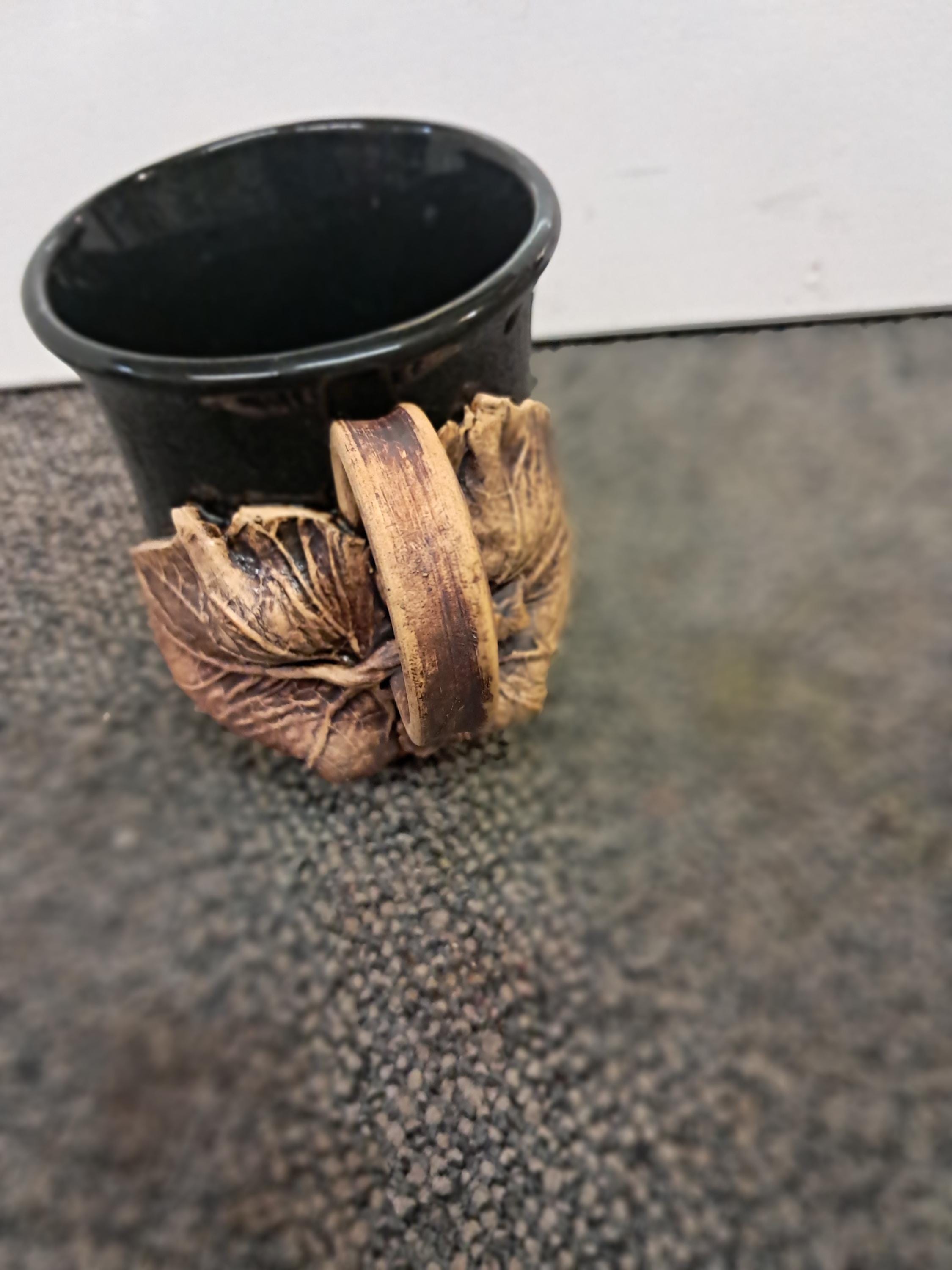 This mug emerged from a ball of speckled, brown clay that was thrown on the pottery wheel. Once firm enough to work, it was trimmed with leaves then joined to handle.