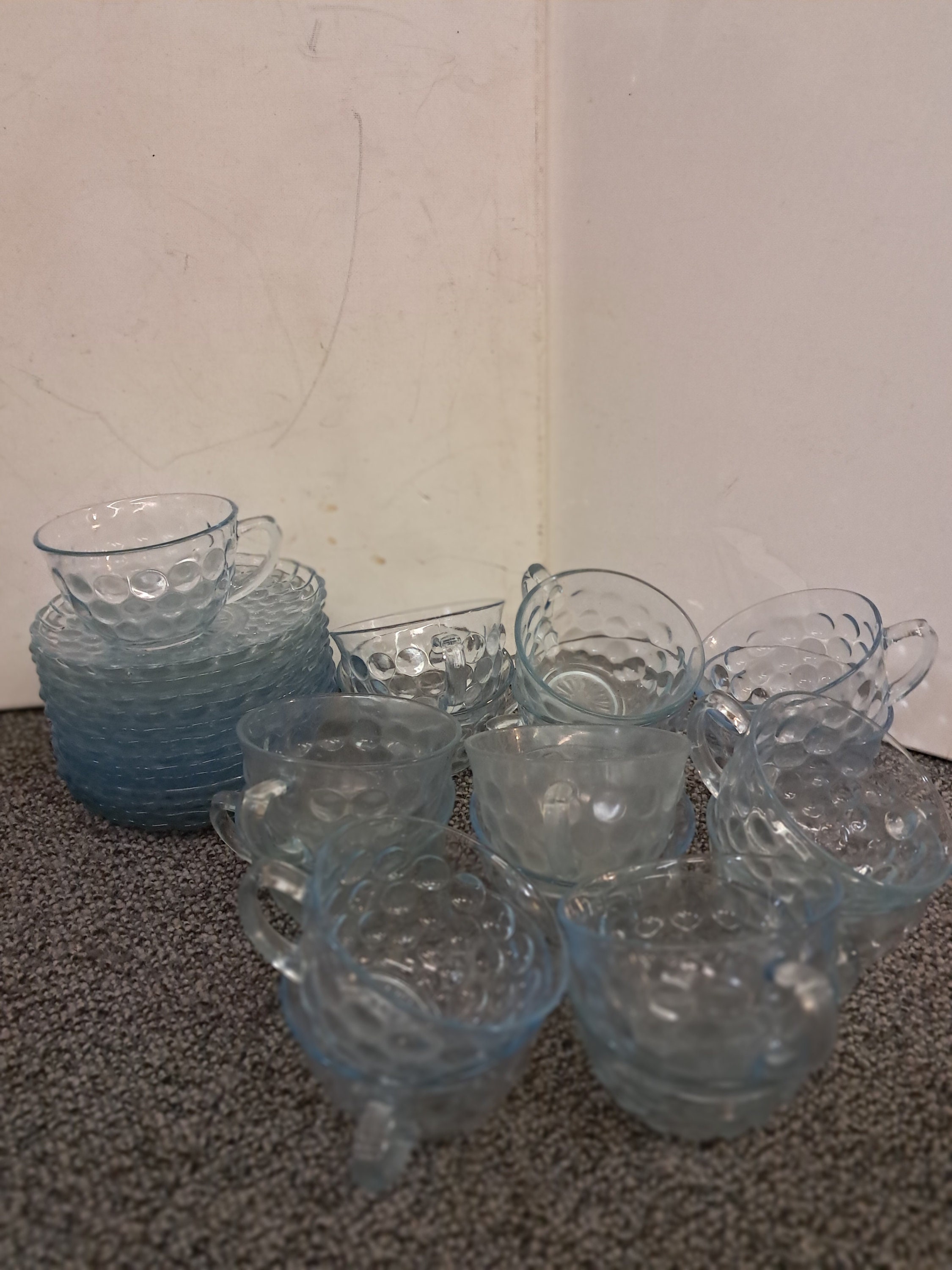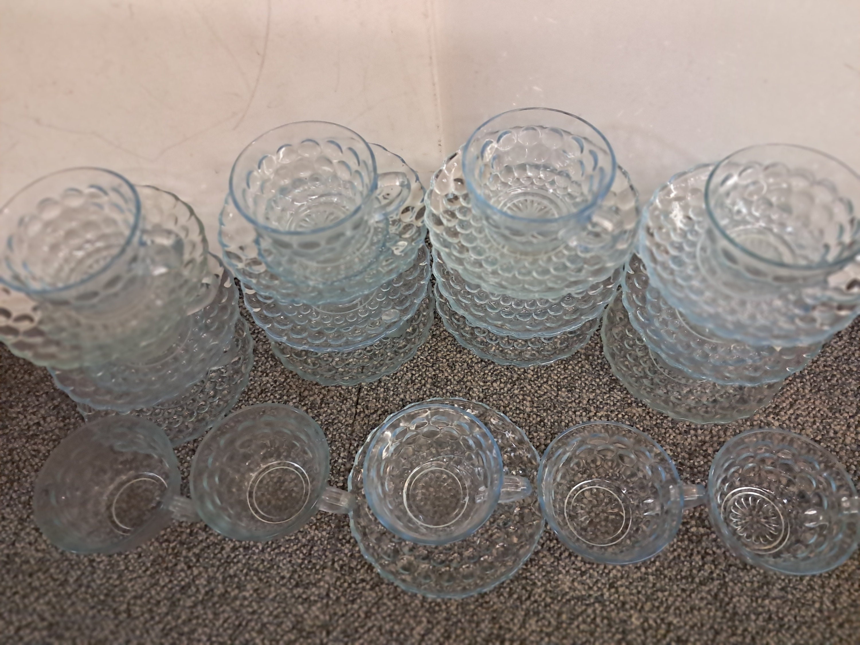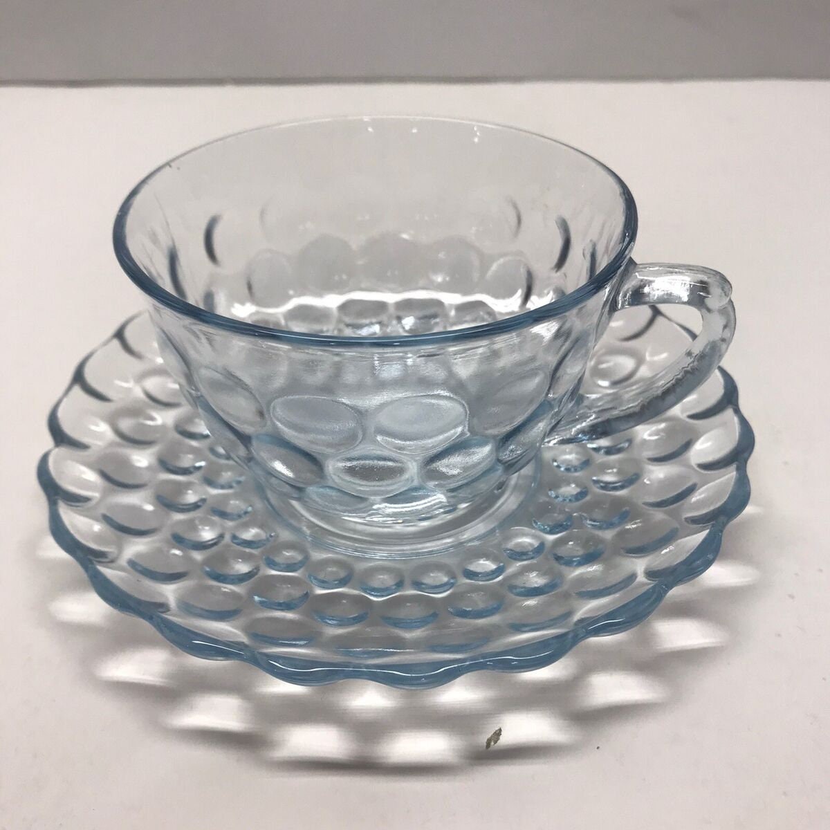 Bubble is the most common name for this Anchor Hocking pattern, but it is also known as Bullseye and Provincial. The pattern was made in crystal (clear), royal ruby, pink, green and this pale blue, called sapphire blue. Sapphire blue was introduced in 1937. The cup measures 2 3/8″ tall by 3 3/4″ in diameter, with the saucer measuring 5 3/4″. It is in excellent condition, with no chips, cracks or repairs.