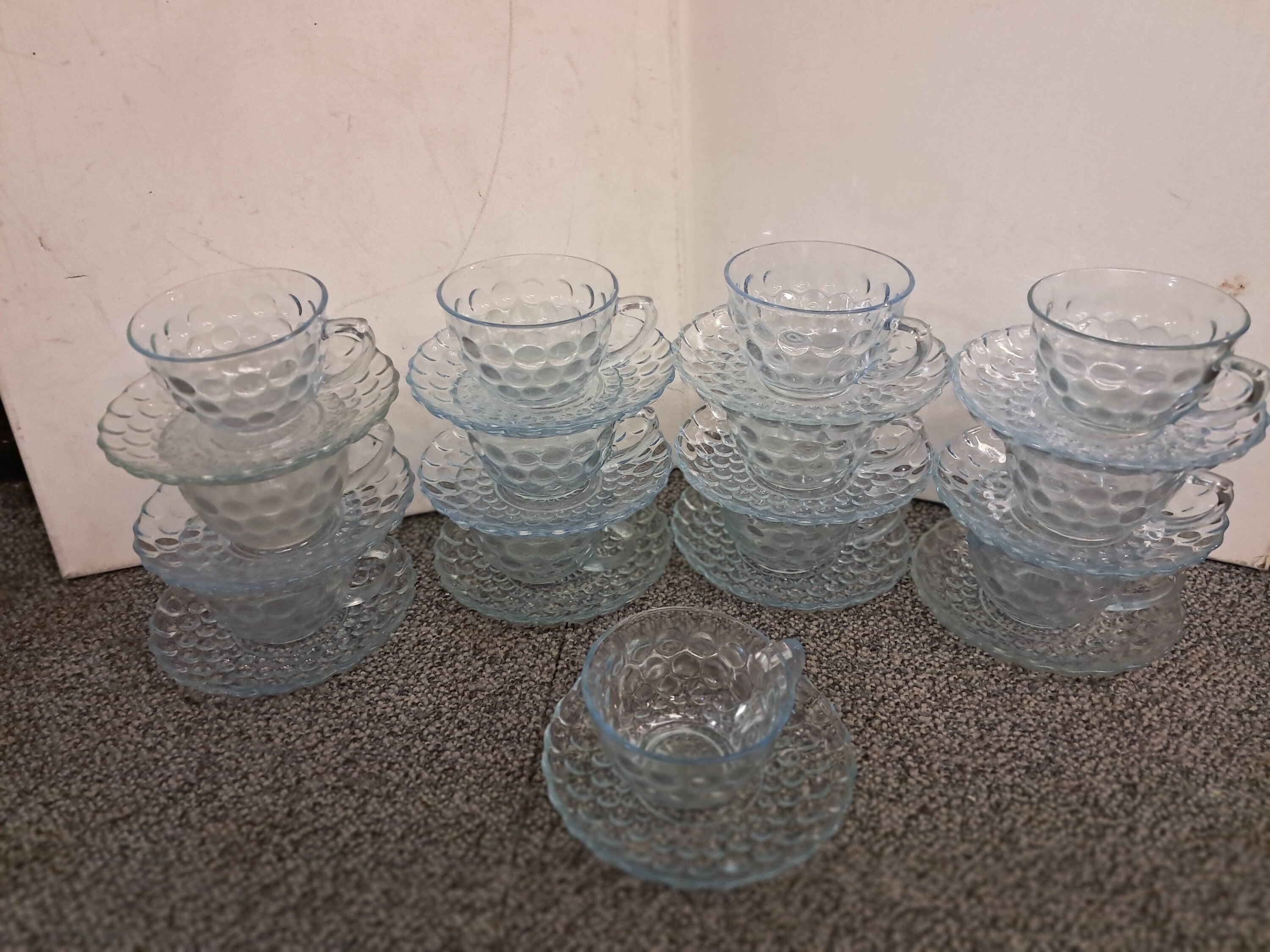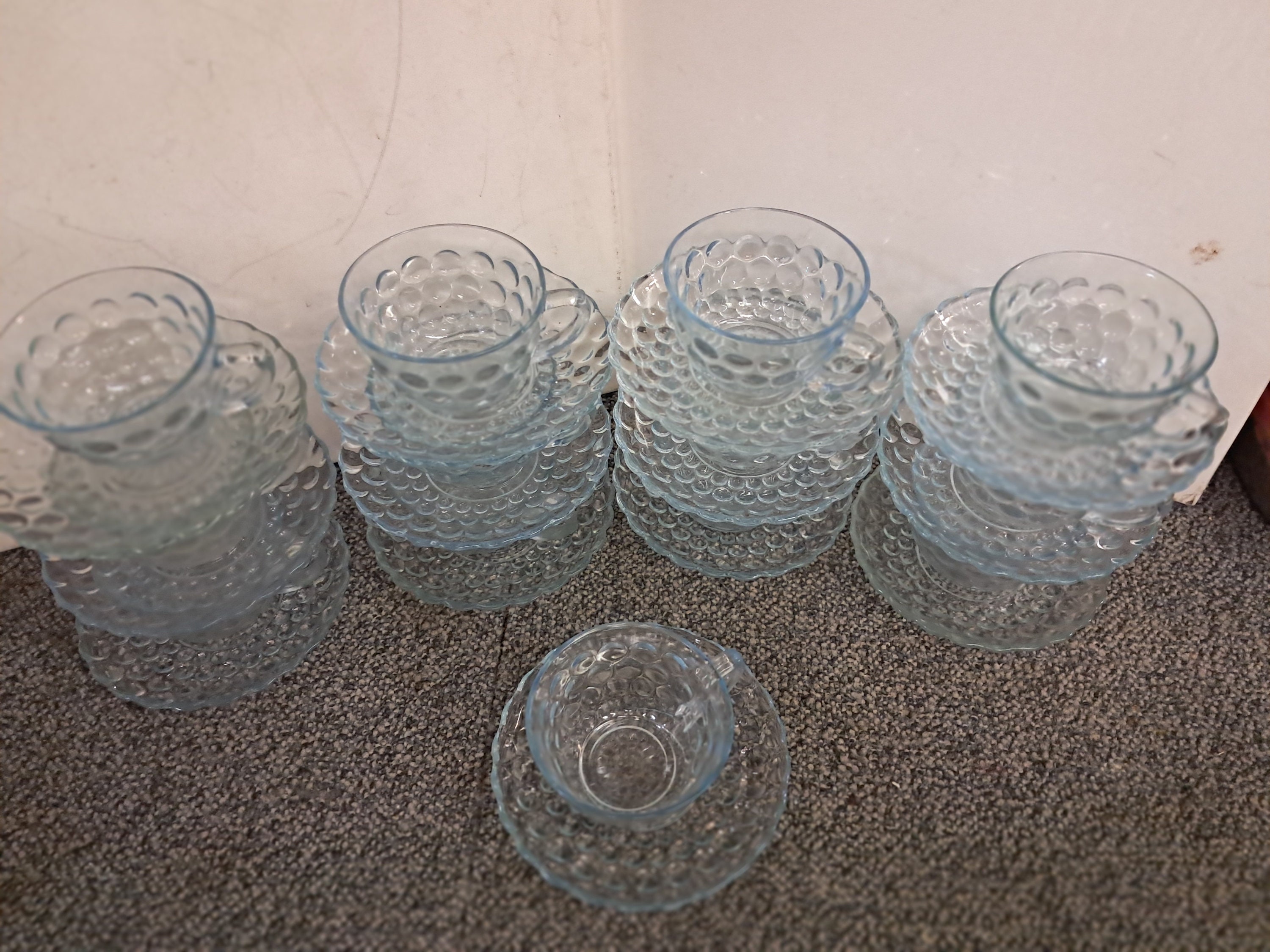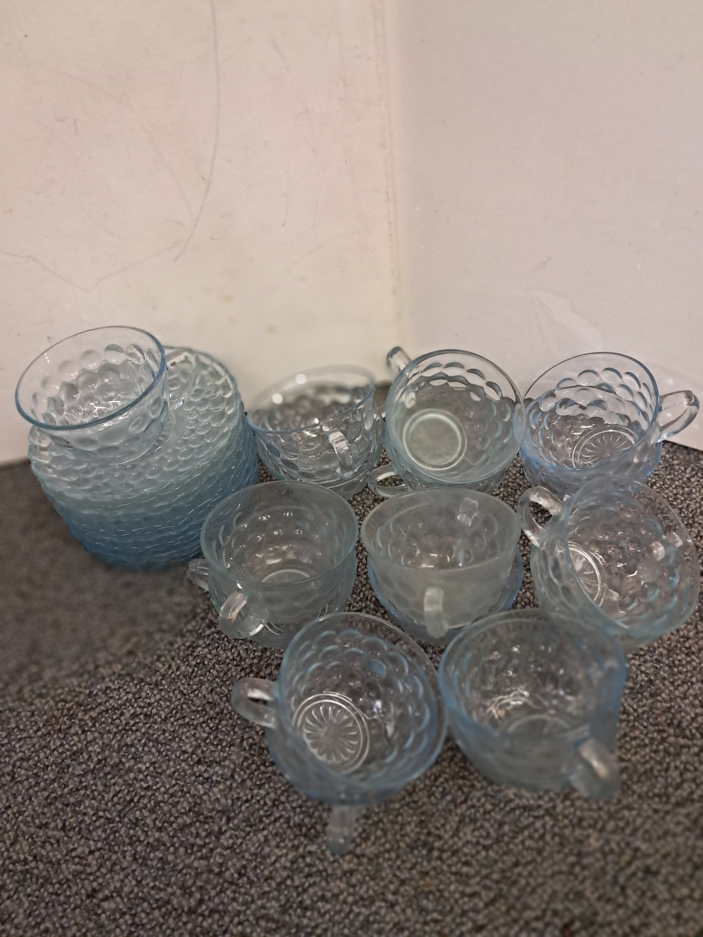 Bubble is the most common name for this Anchor Hocking pattern, but it is also known as Bullseye and Provincial. The pattern was made in crystal (clear), royal ruby, pink, green and this pale blue, called sapphire blue. Sapphire blue was introduced in 1937. The cup measures 2 3/8″ tall by 3 3/4″ in diameter, with the saucer measuring 5 3/4″. It is in excellent condition, with no chips, cracks or repairs.