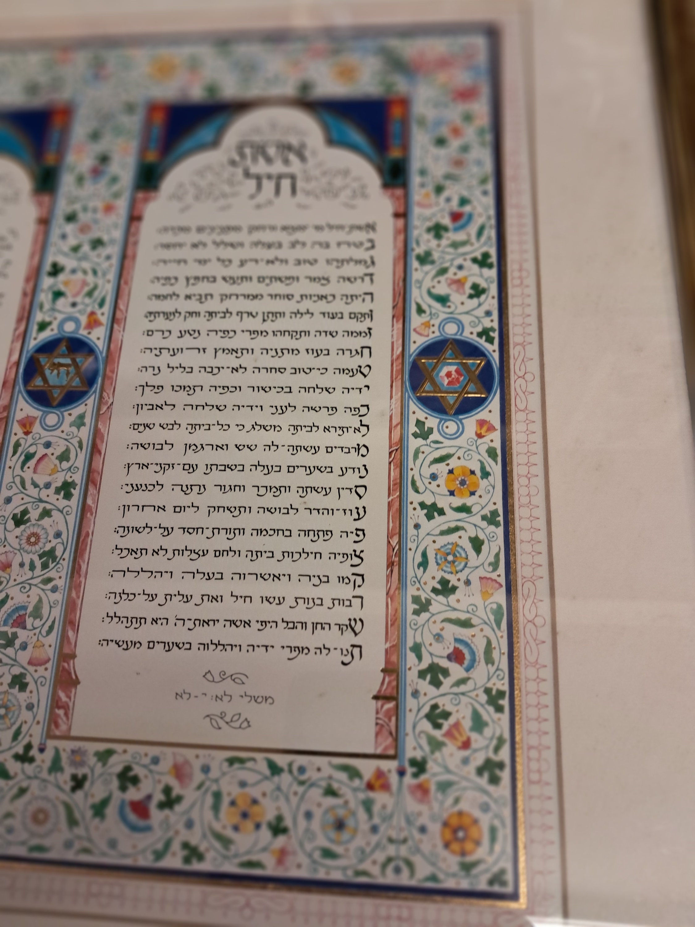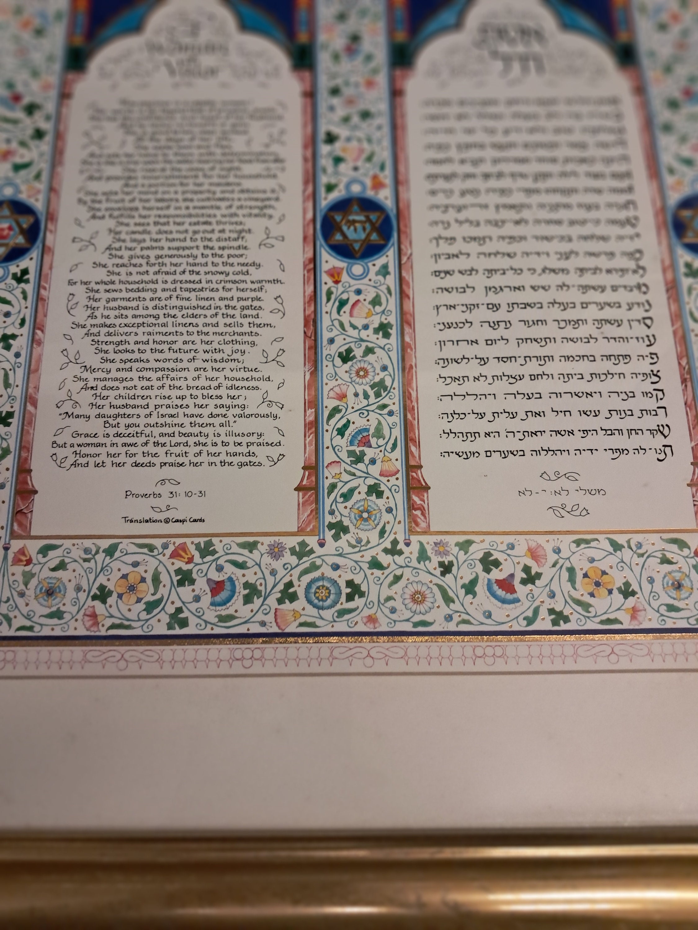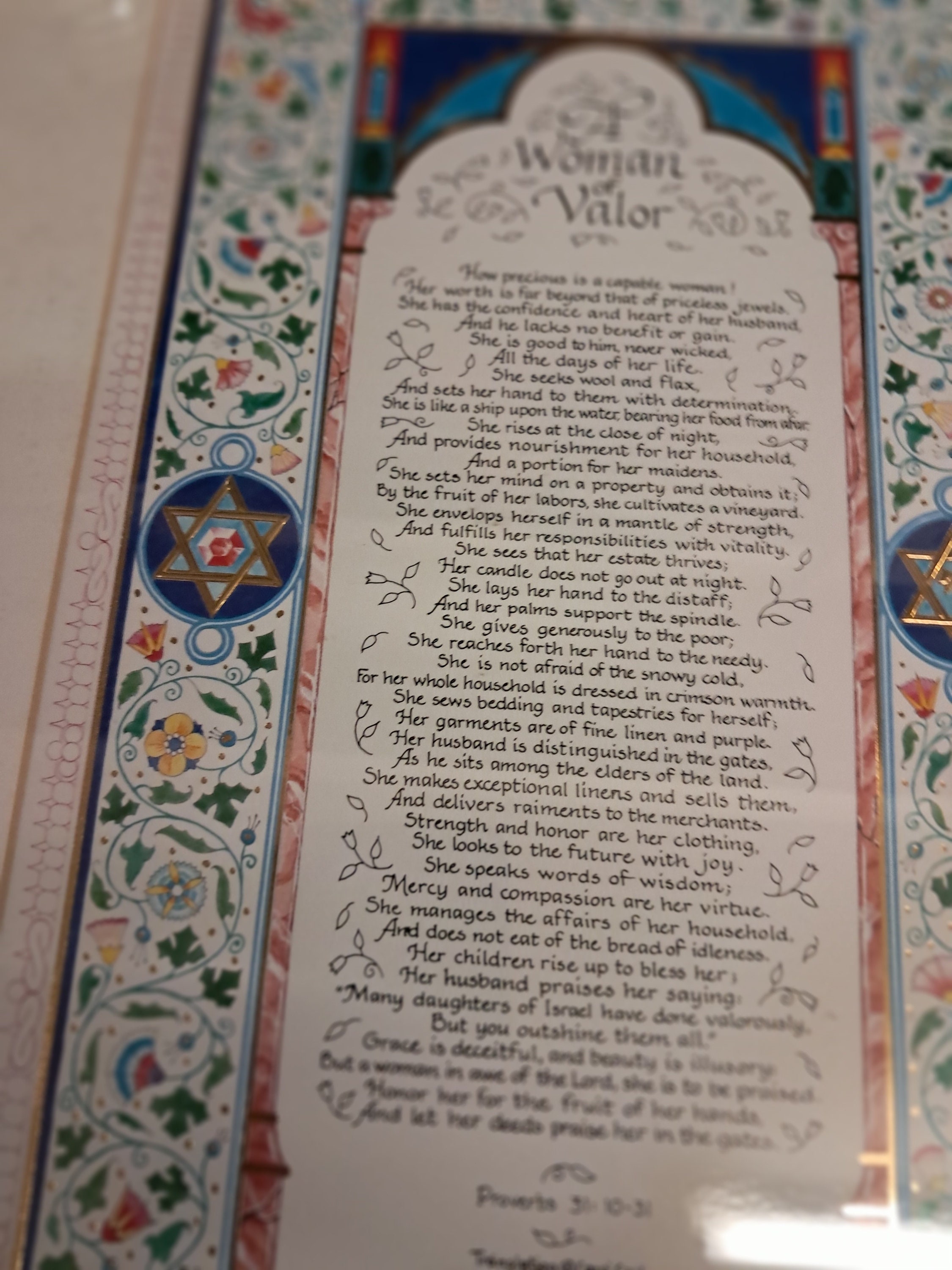 Woman of Valor Florentine Columns is a modern illuminated rendition of the biblical “Woman of Valor” (Proverbs 31) that is sung by the husband to his wife on Friday night. It is a wonderful gift for birthdays and makes an excellent gift for anniversaries from one spouse to the other. It is often used as a tribute or honorary gift for that special woman.