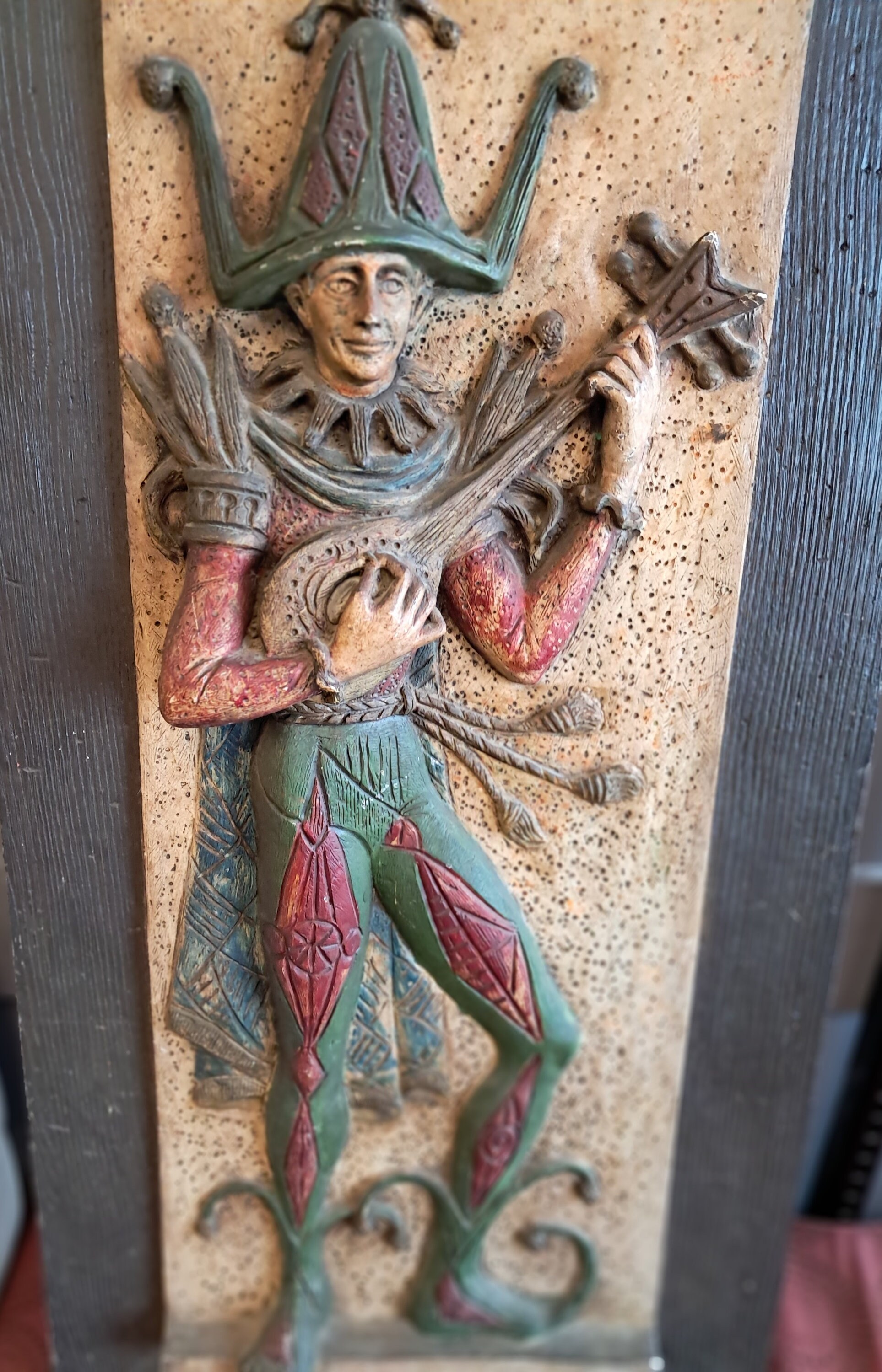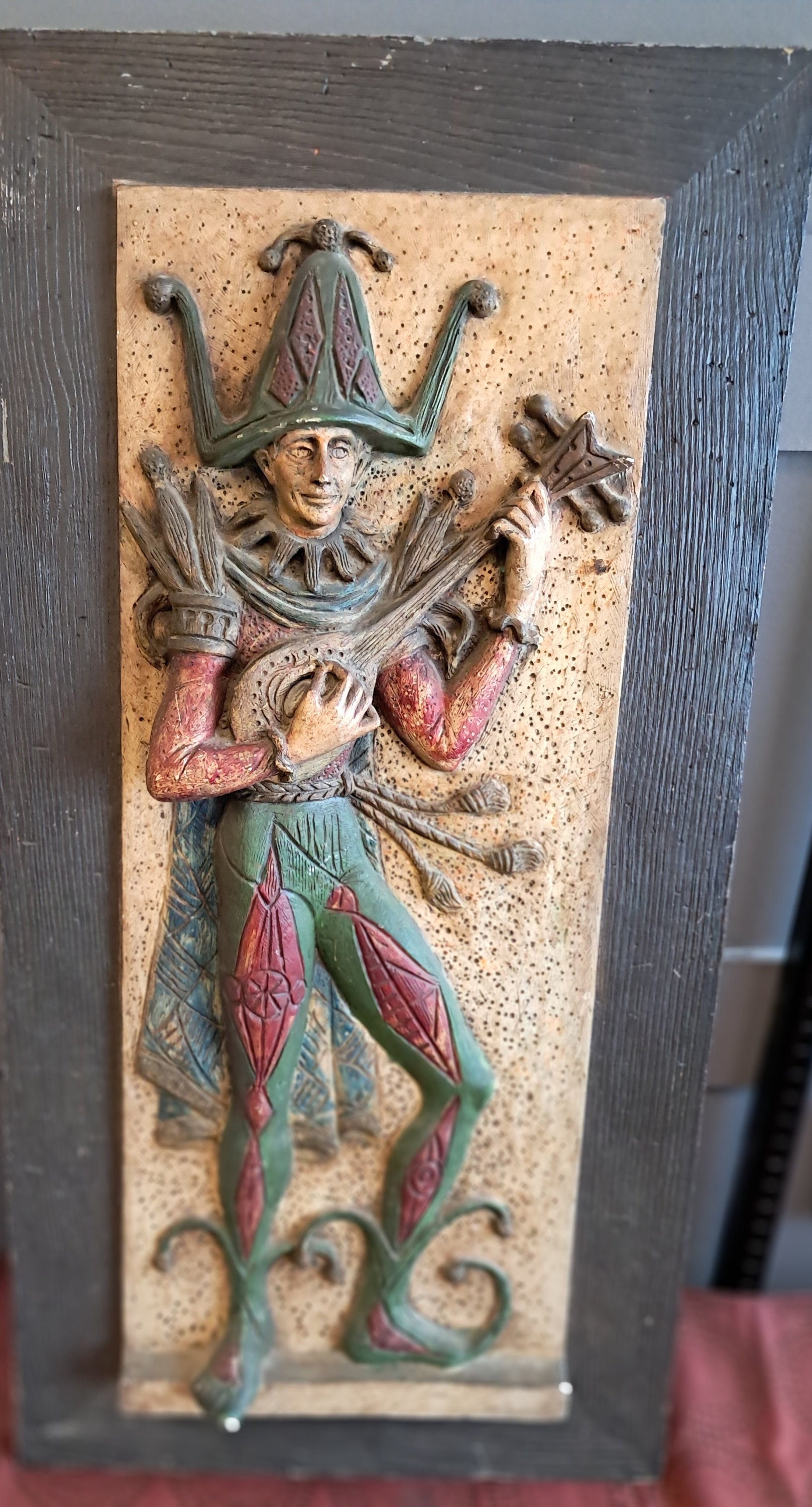A 3D fiberglass Cast Wall Sculpture Of Jester playing Mandolin