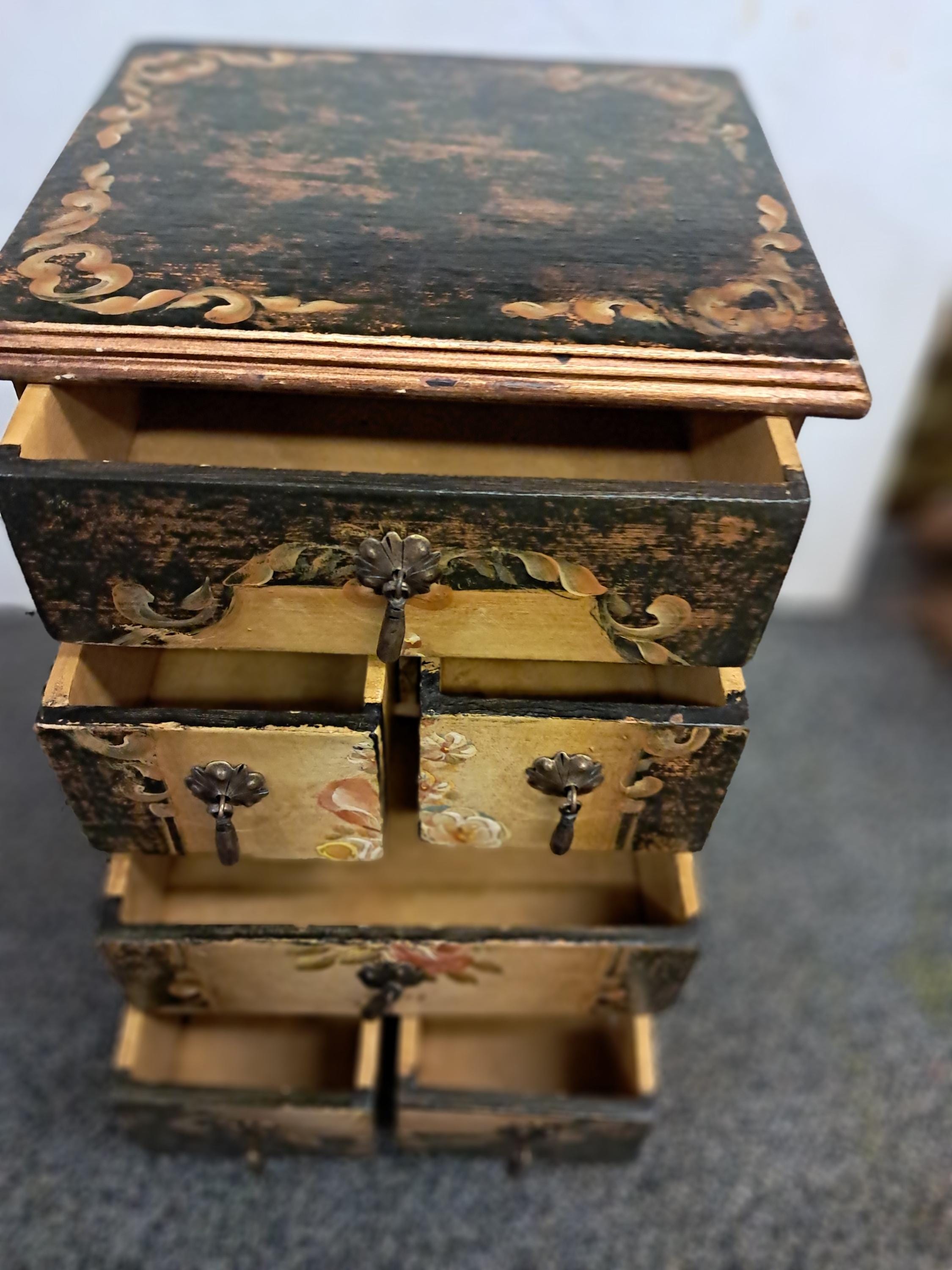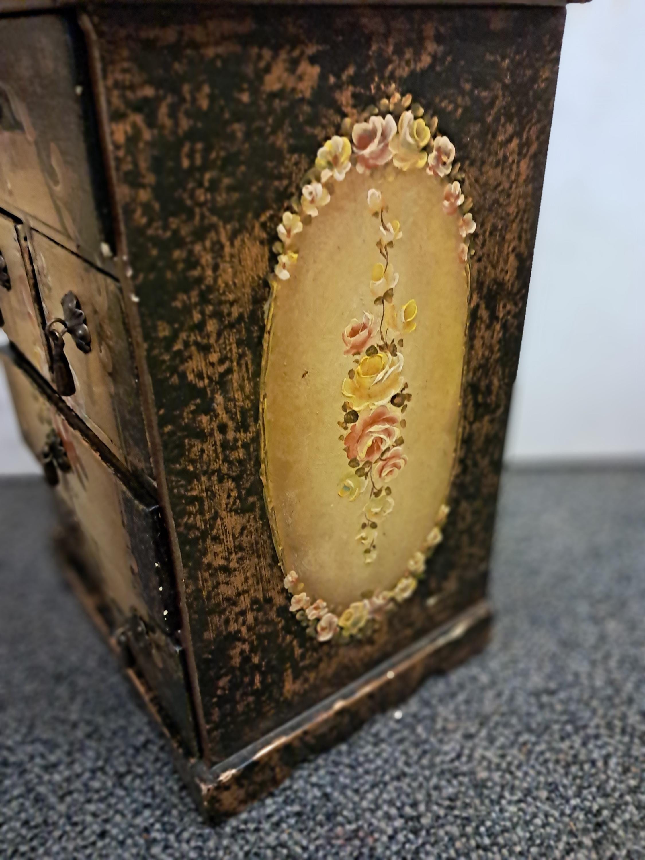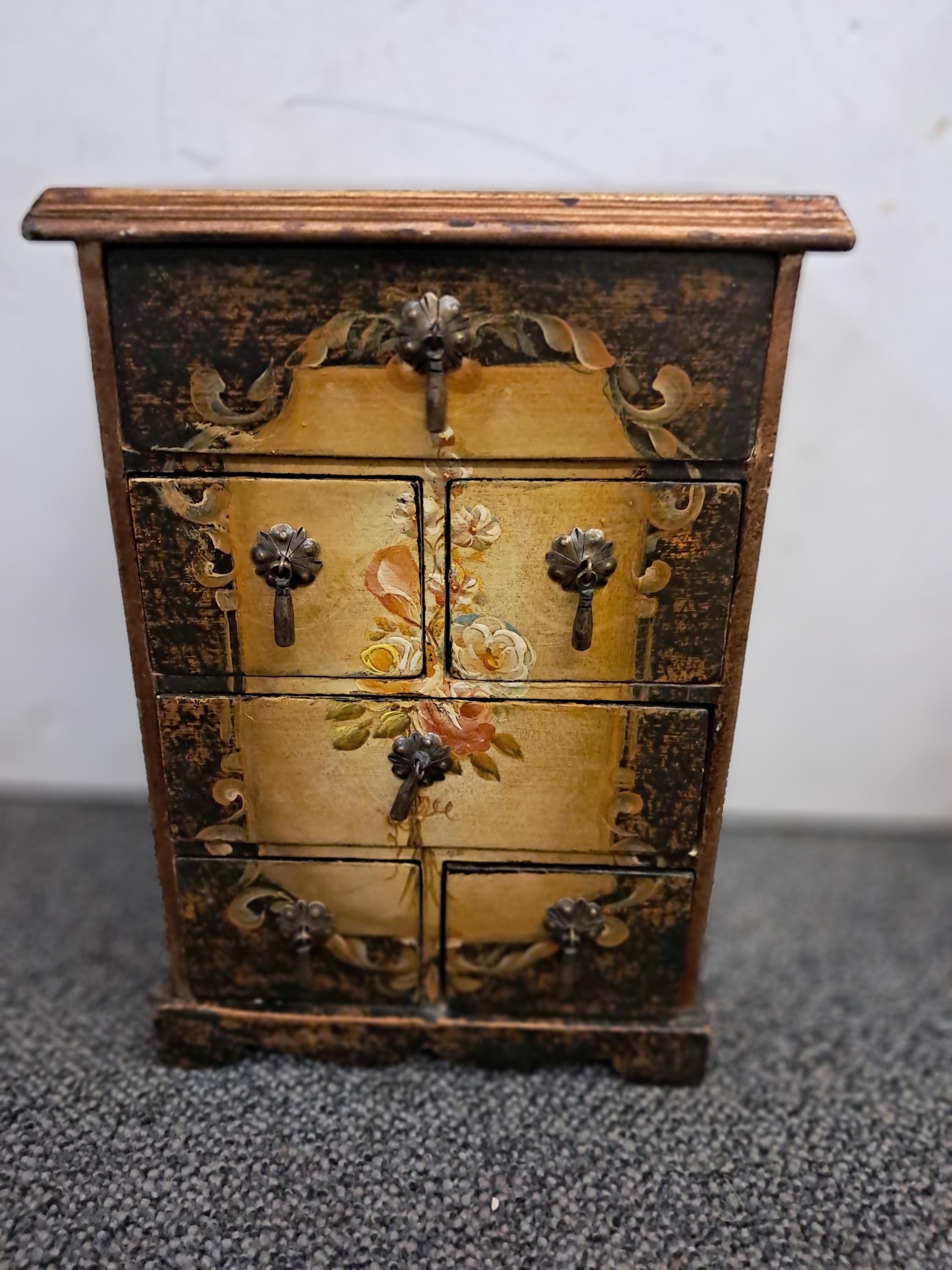 Gorgeous gilded Brown and Beige coloring. There are 6 drawers that all create a floral painting .