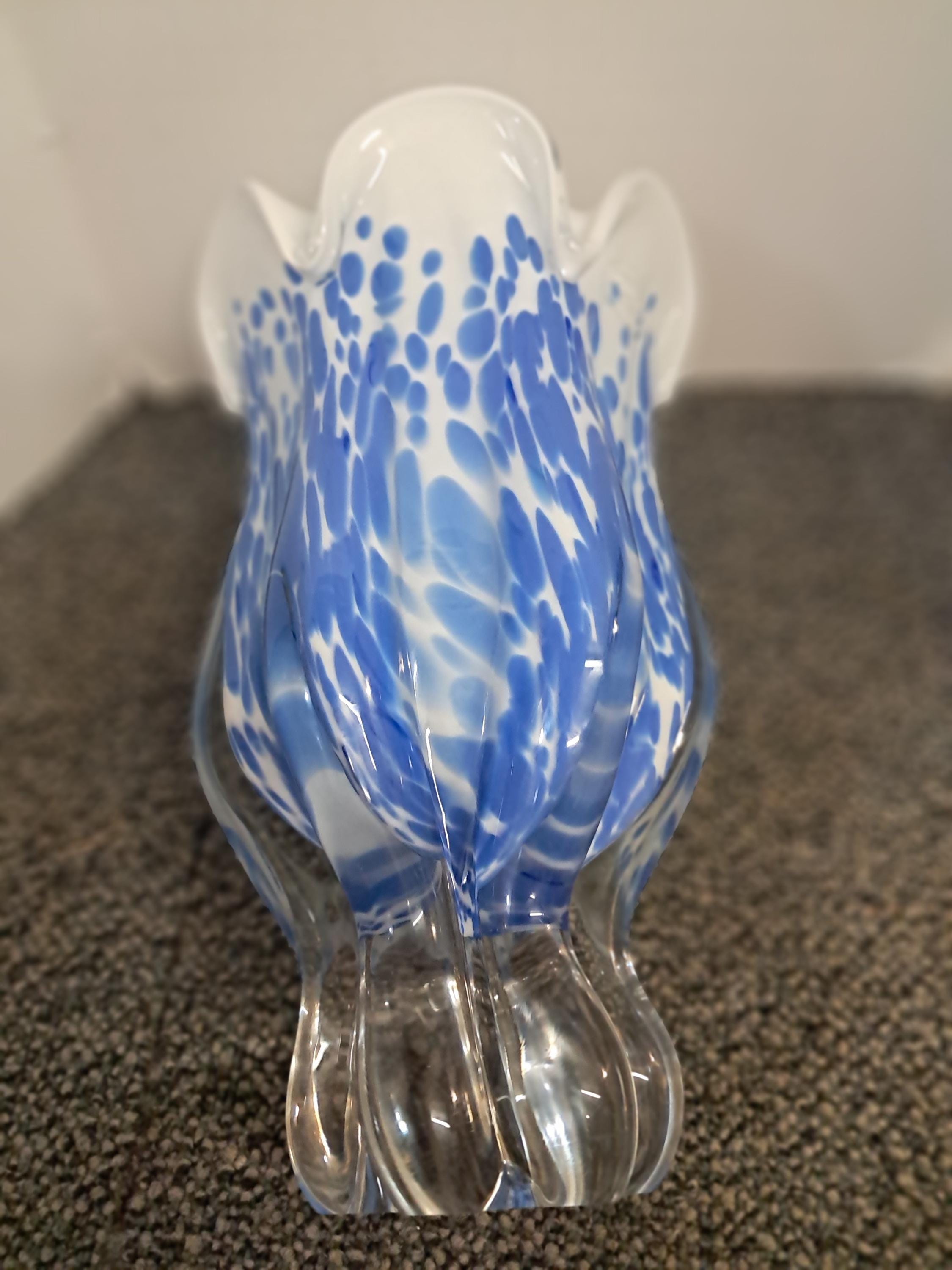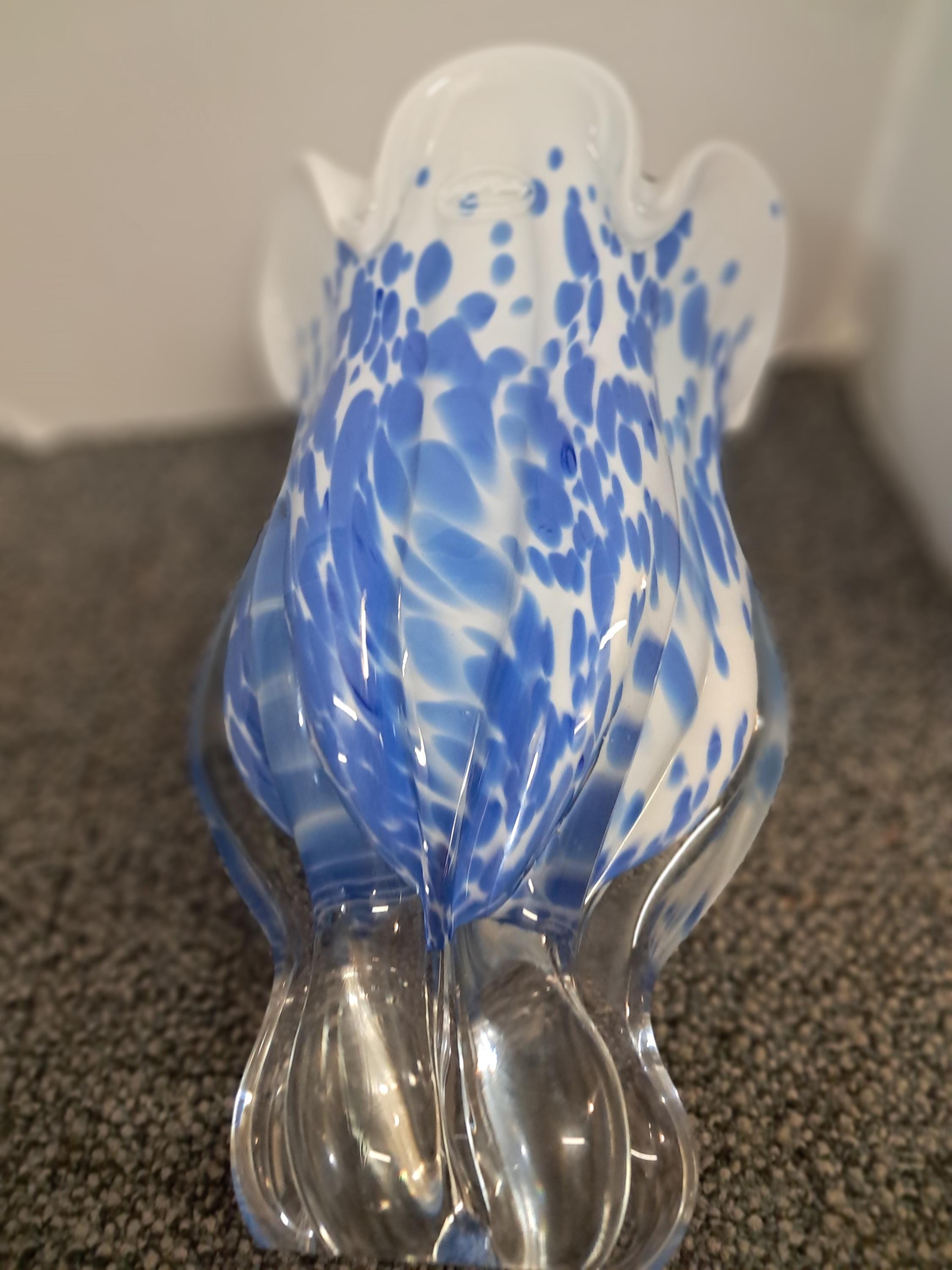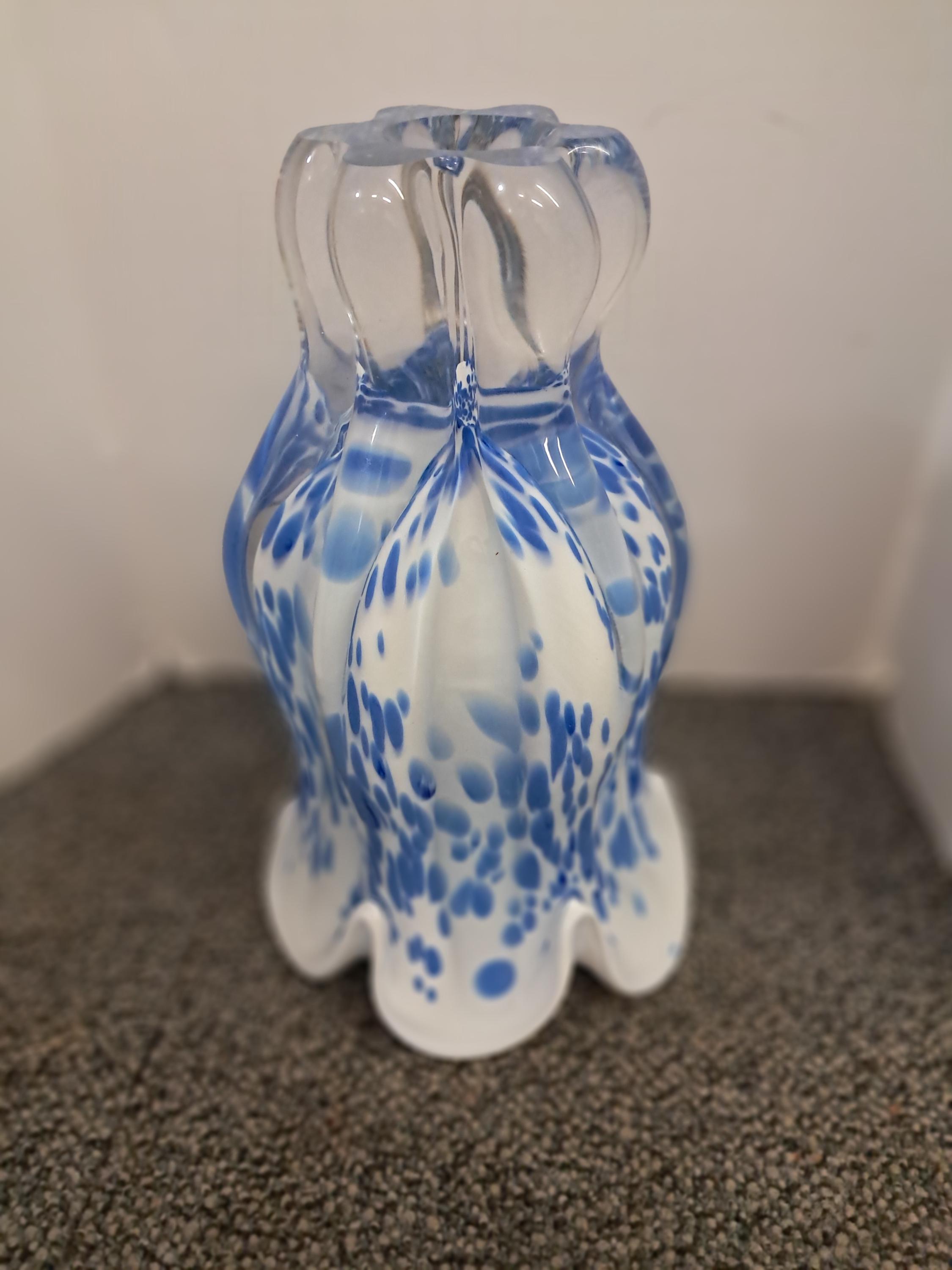 Striking blue and white blown glass vase made in Poland by Royal Gallery. Vase in excellent condition. Stands at 9.5 inches and is quite heavy.