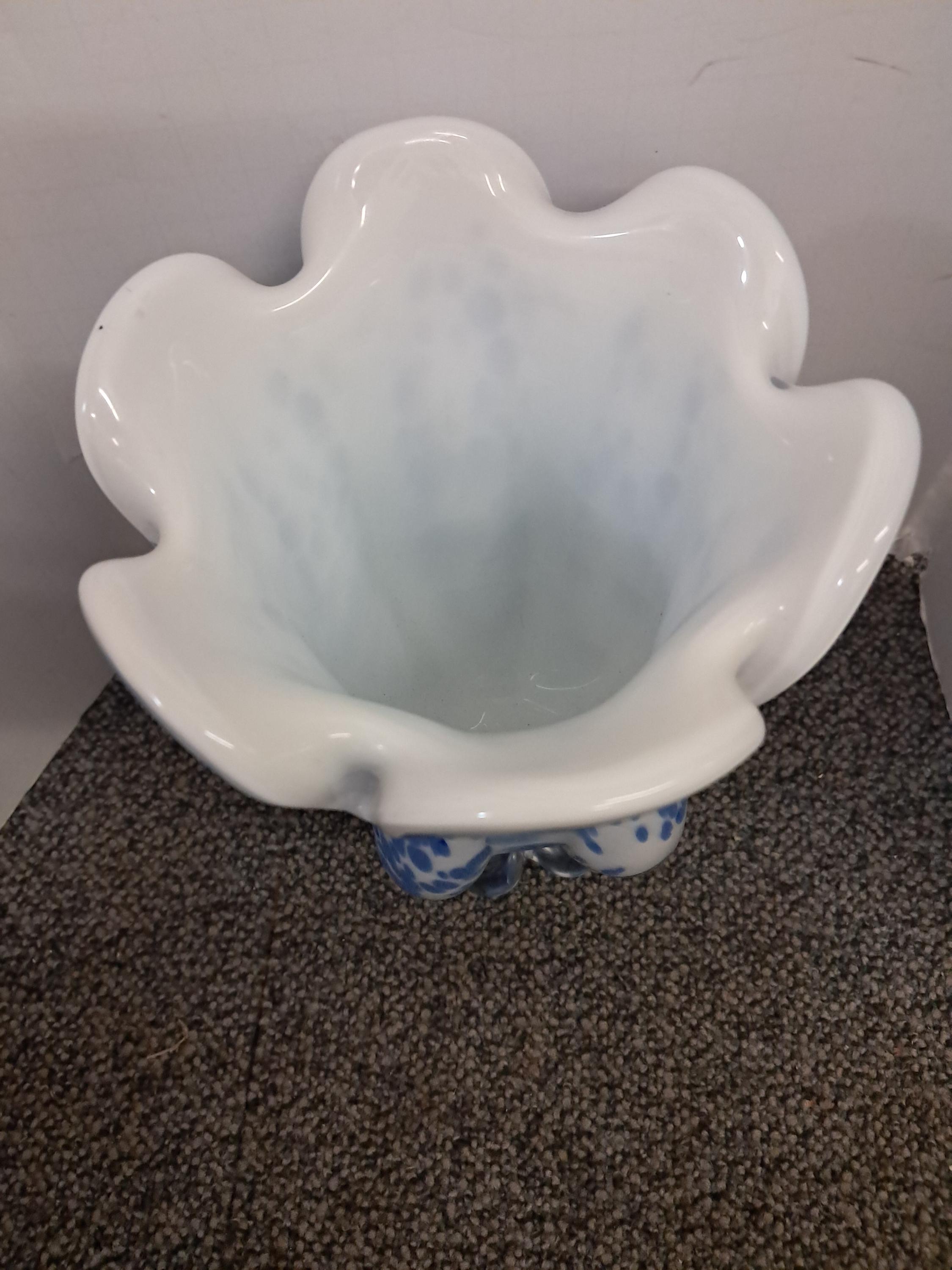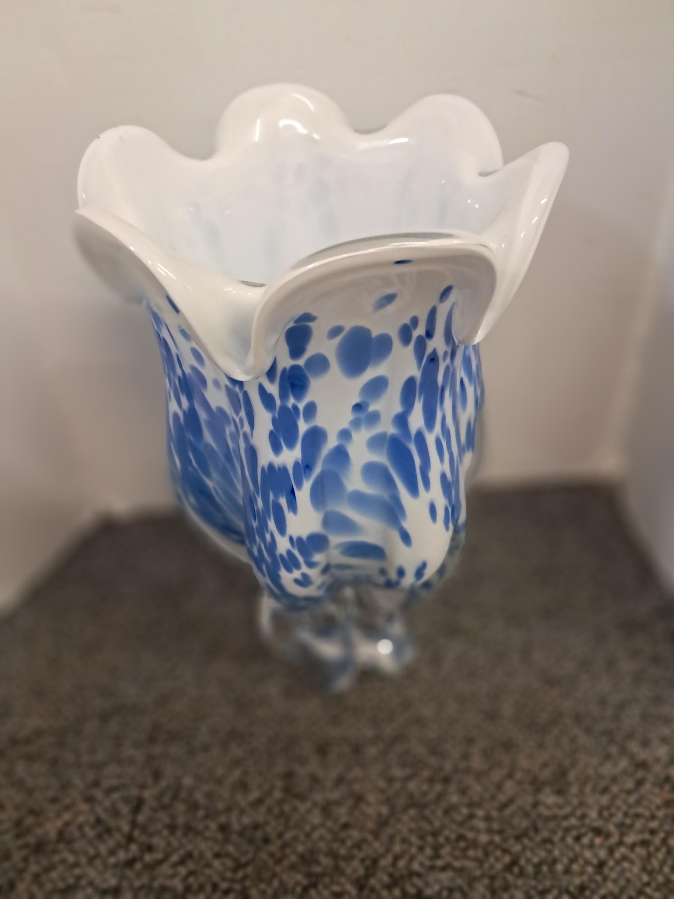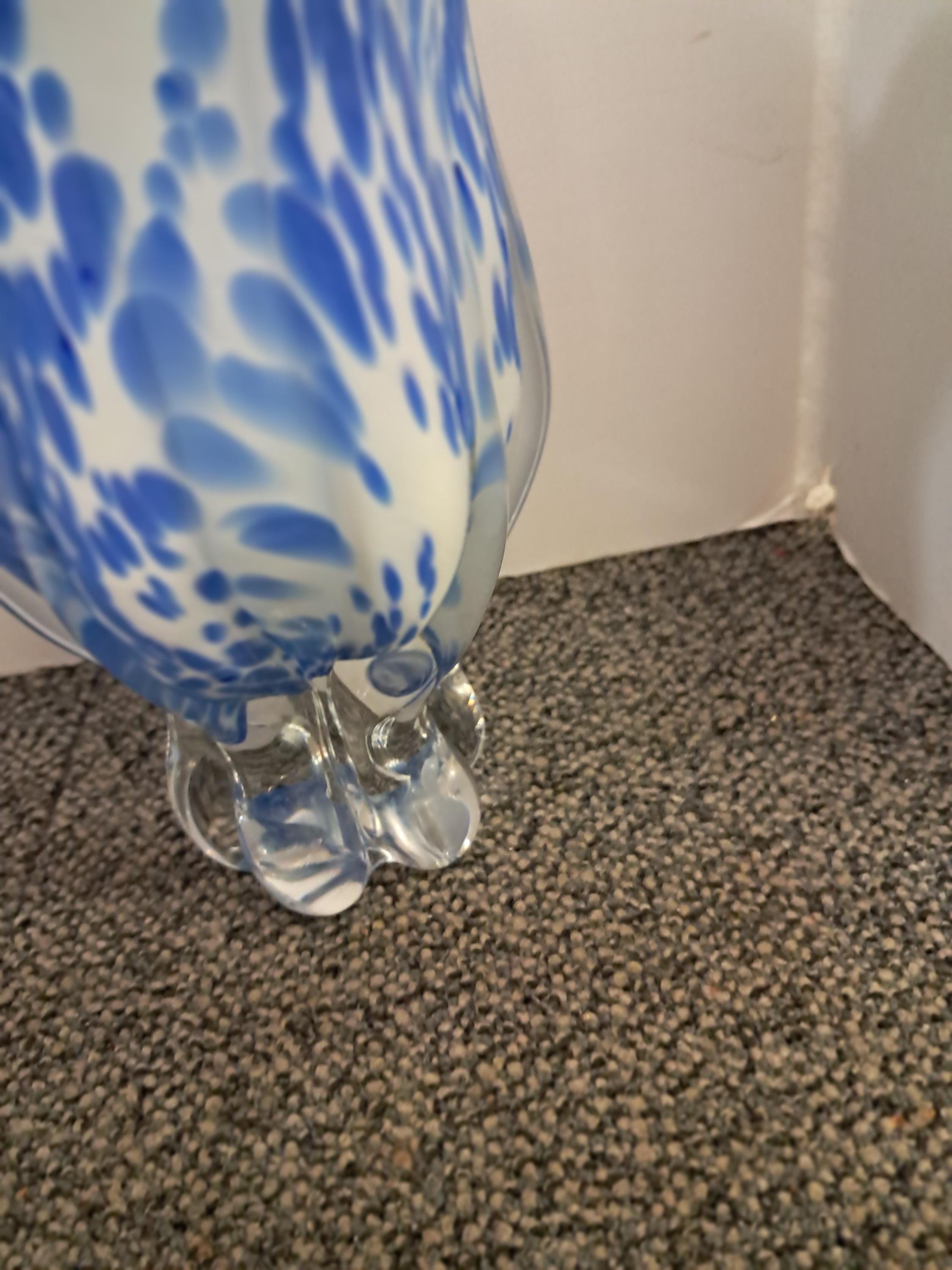 Striking blue and white blown glass vase made in Poland by Royal Gallery. Vase in excellent condition. Stands at 9.5 inches and is quite heavy.