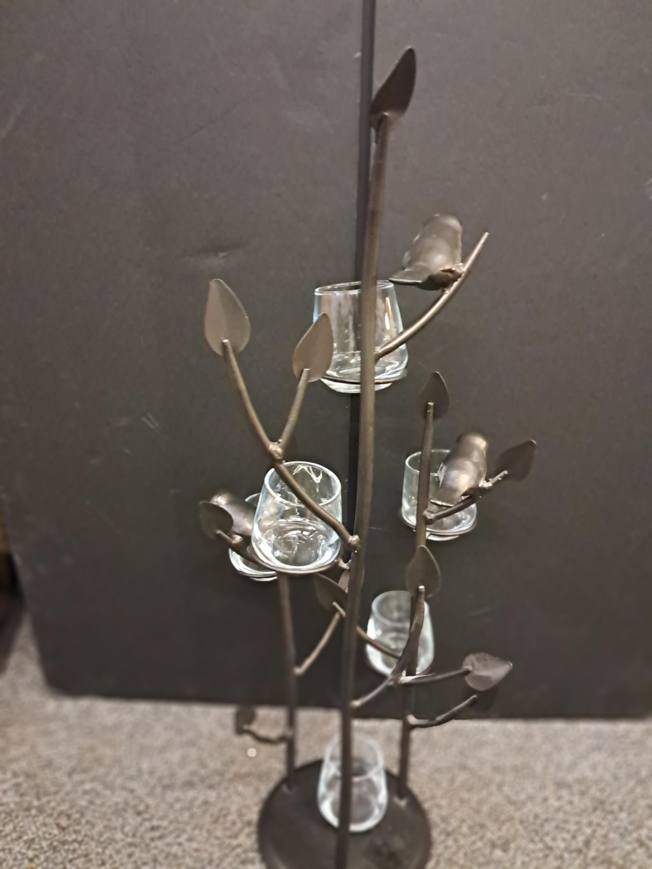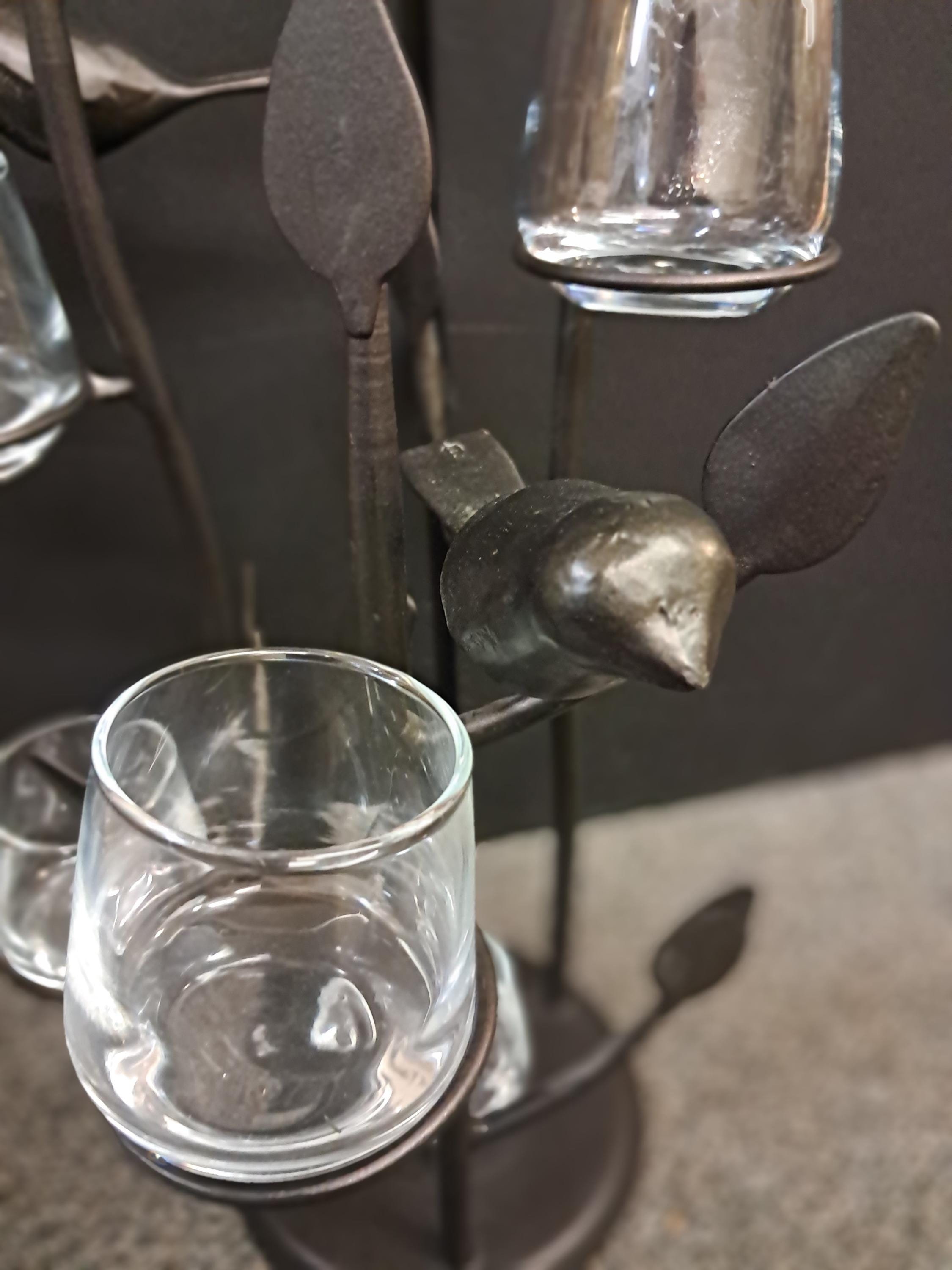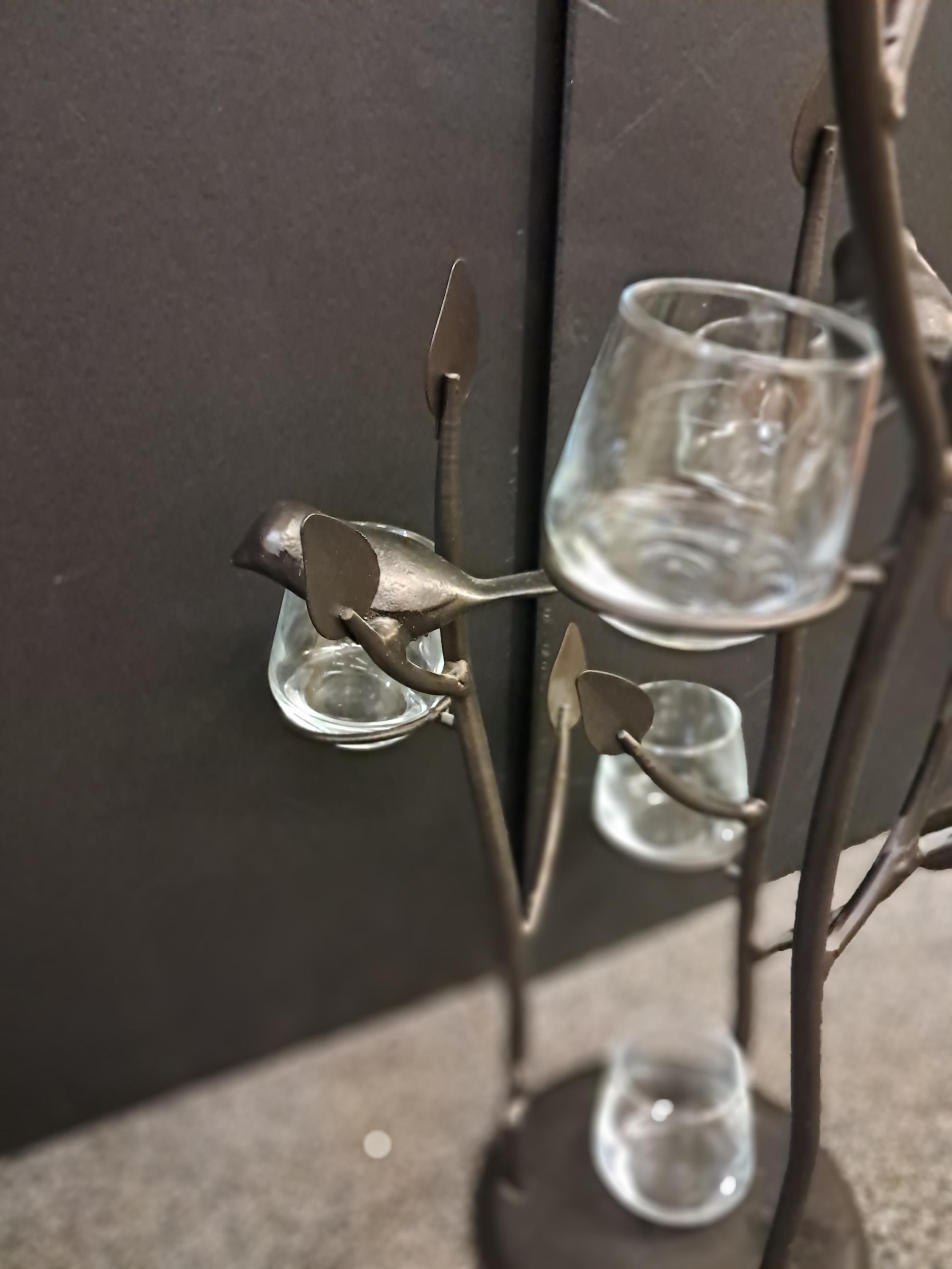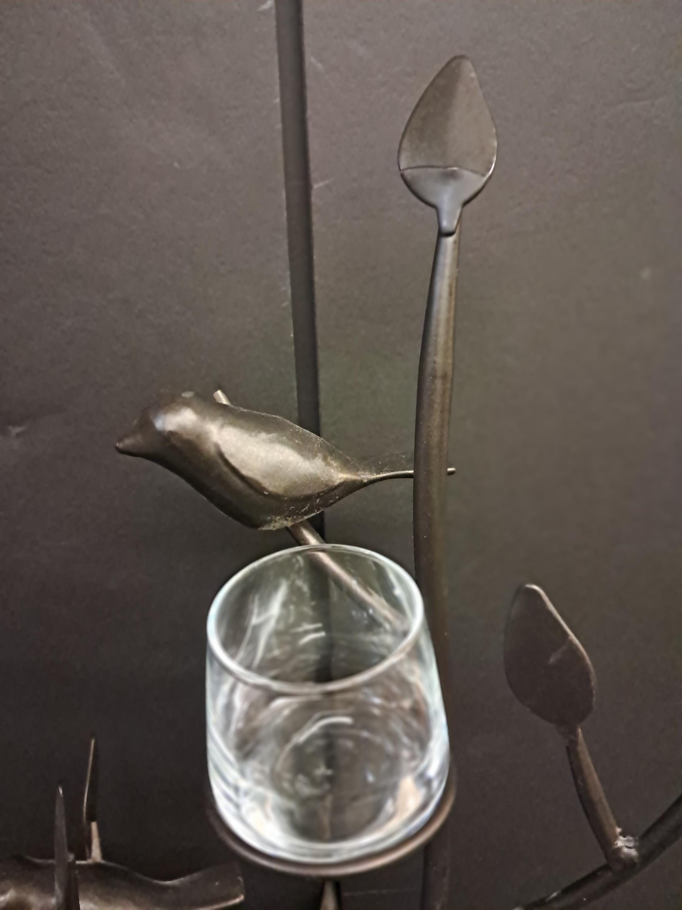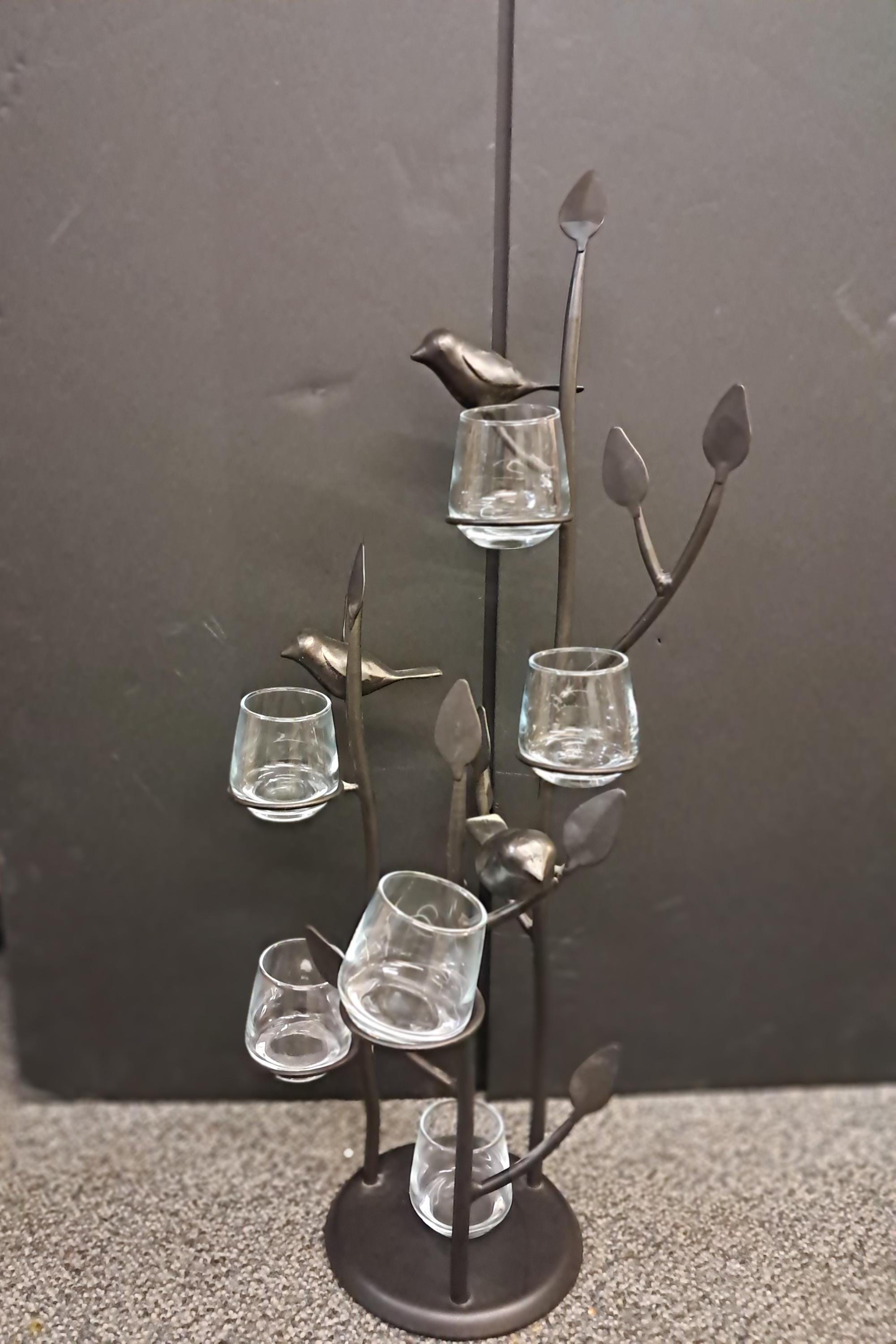 Ornate Wrought Iron 5 Setting Candle HolderDecorated with Leaves and 3 Birds6 Glass cups to hold candlesMeasures 22 " tall x 9" wide x 8 " deepWeight 4 lbsIn Excellent Condition with no damages