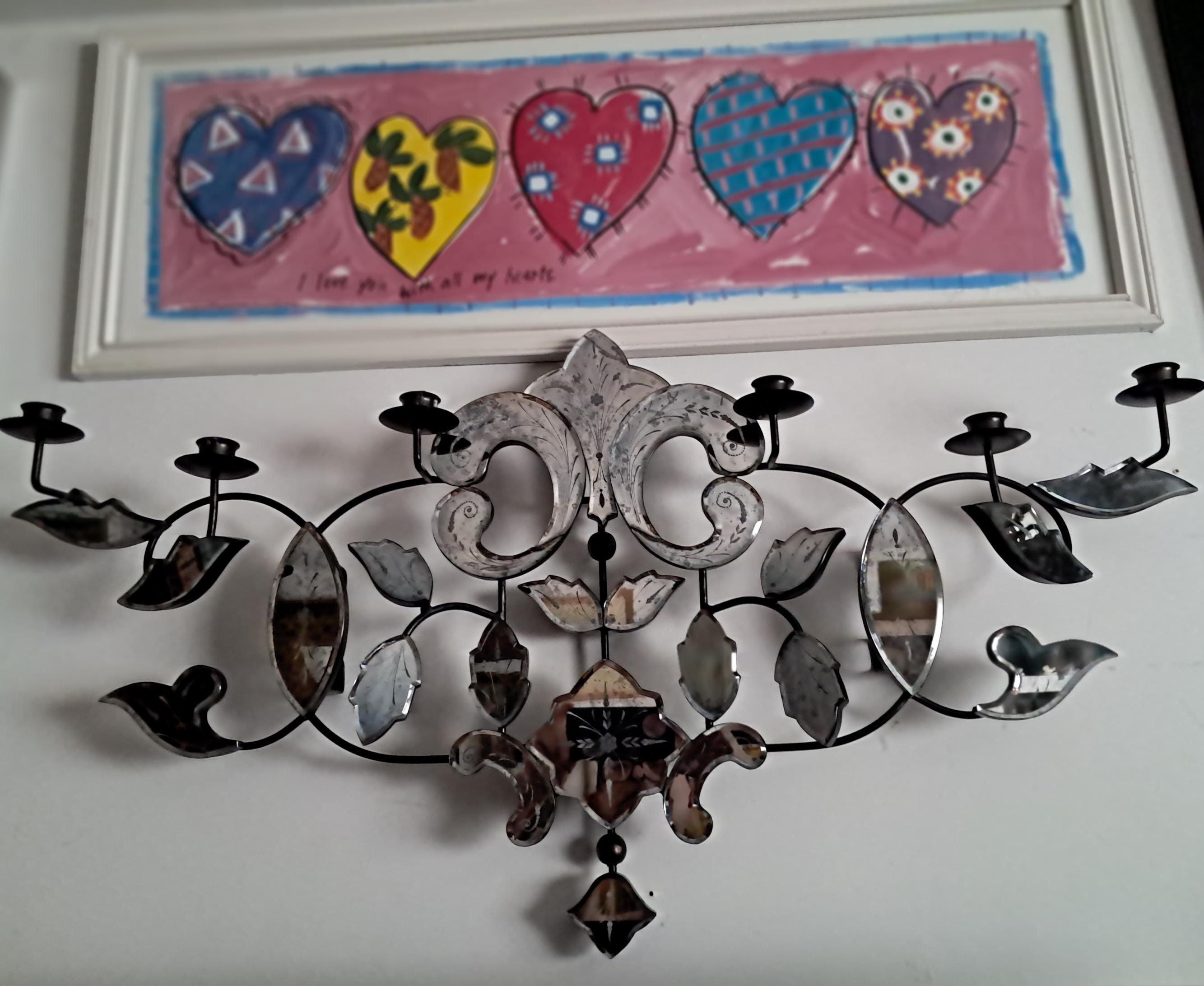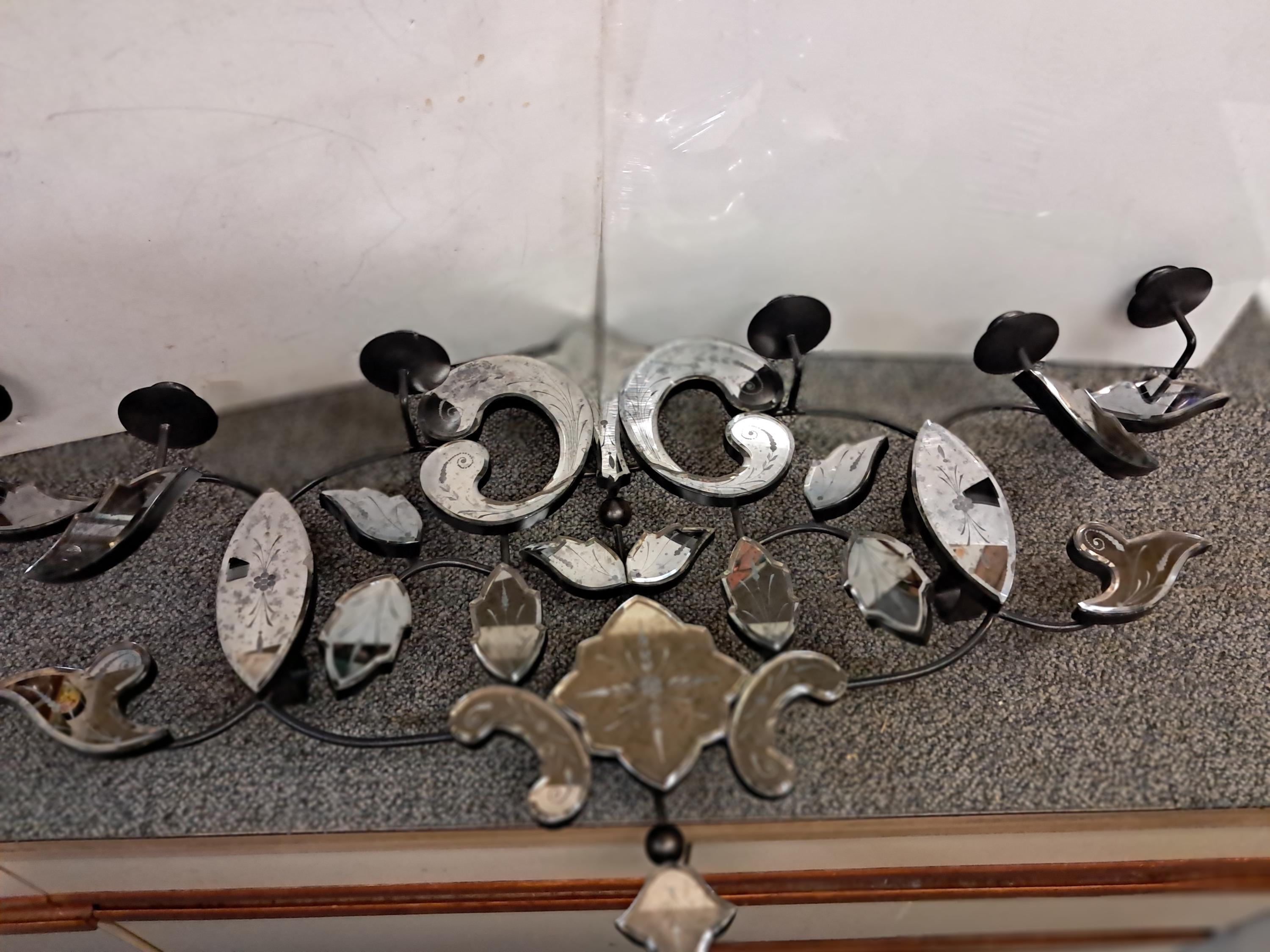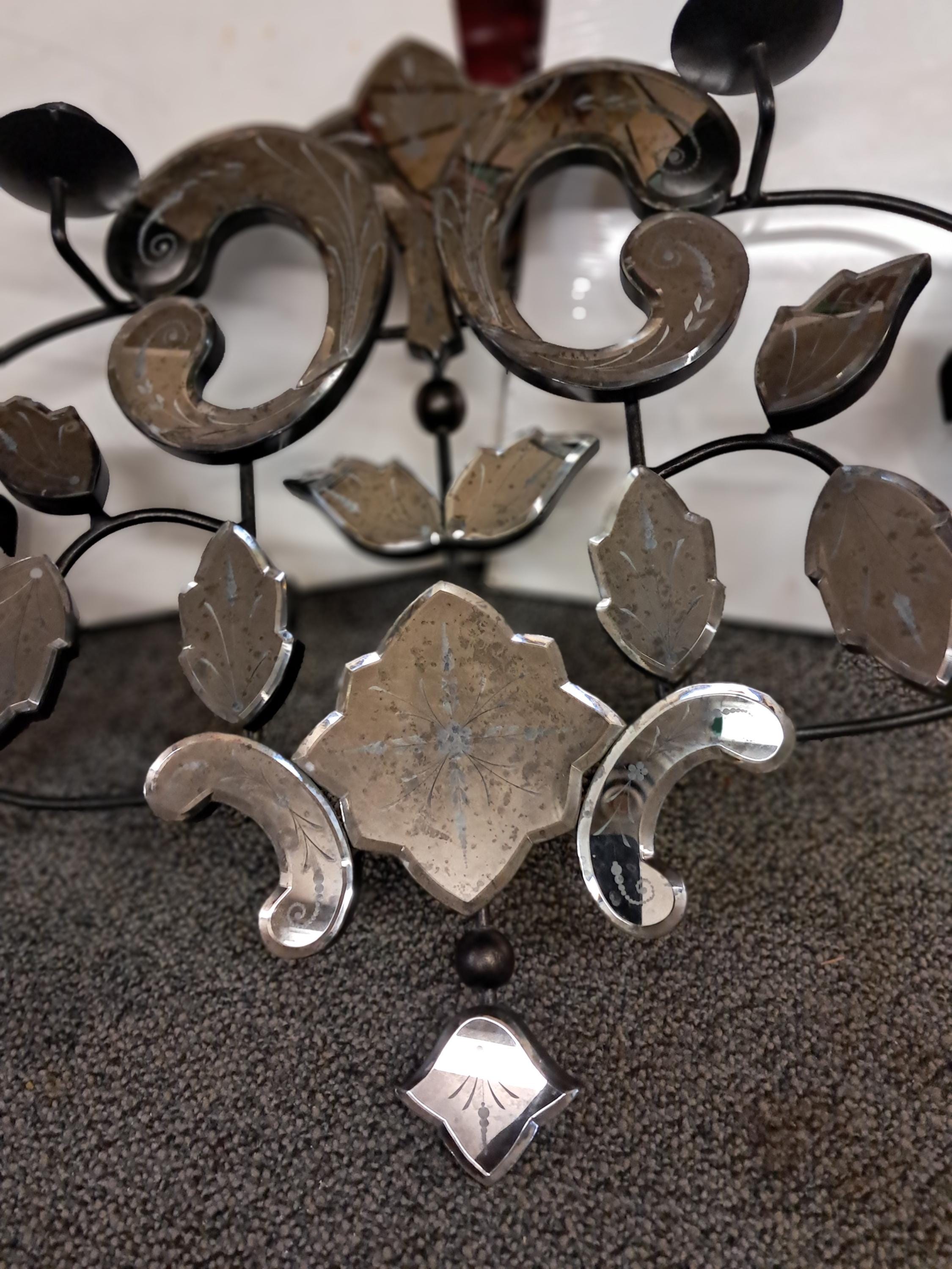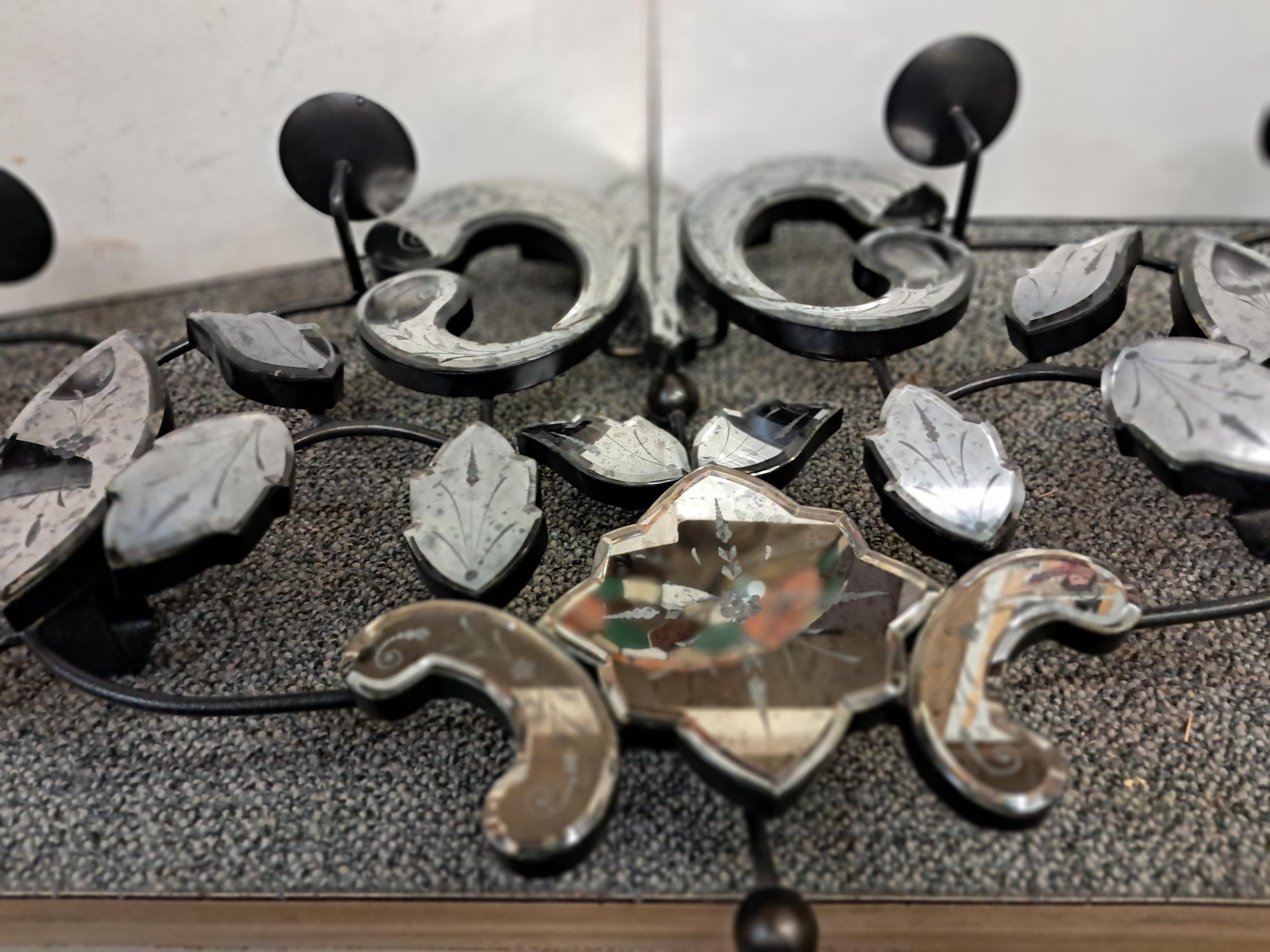 Art deco Candle Holder Trimmed With Mirror 6 Candle Holder on a metal frameTastefully done with etched floral design Mirrors38" wide x 20 " tall x 6" deepExcellent Condition with No Damage