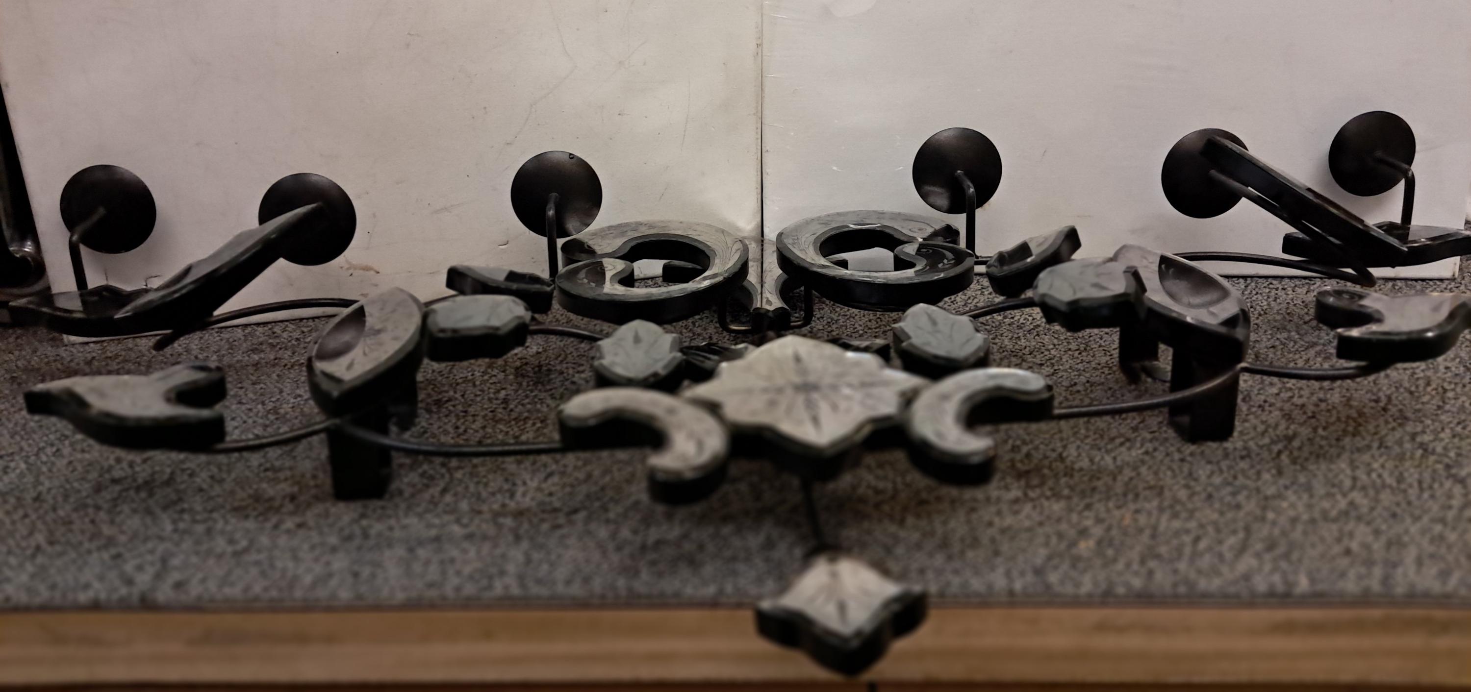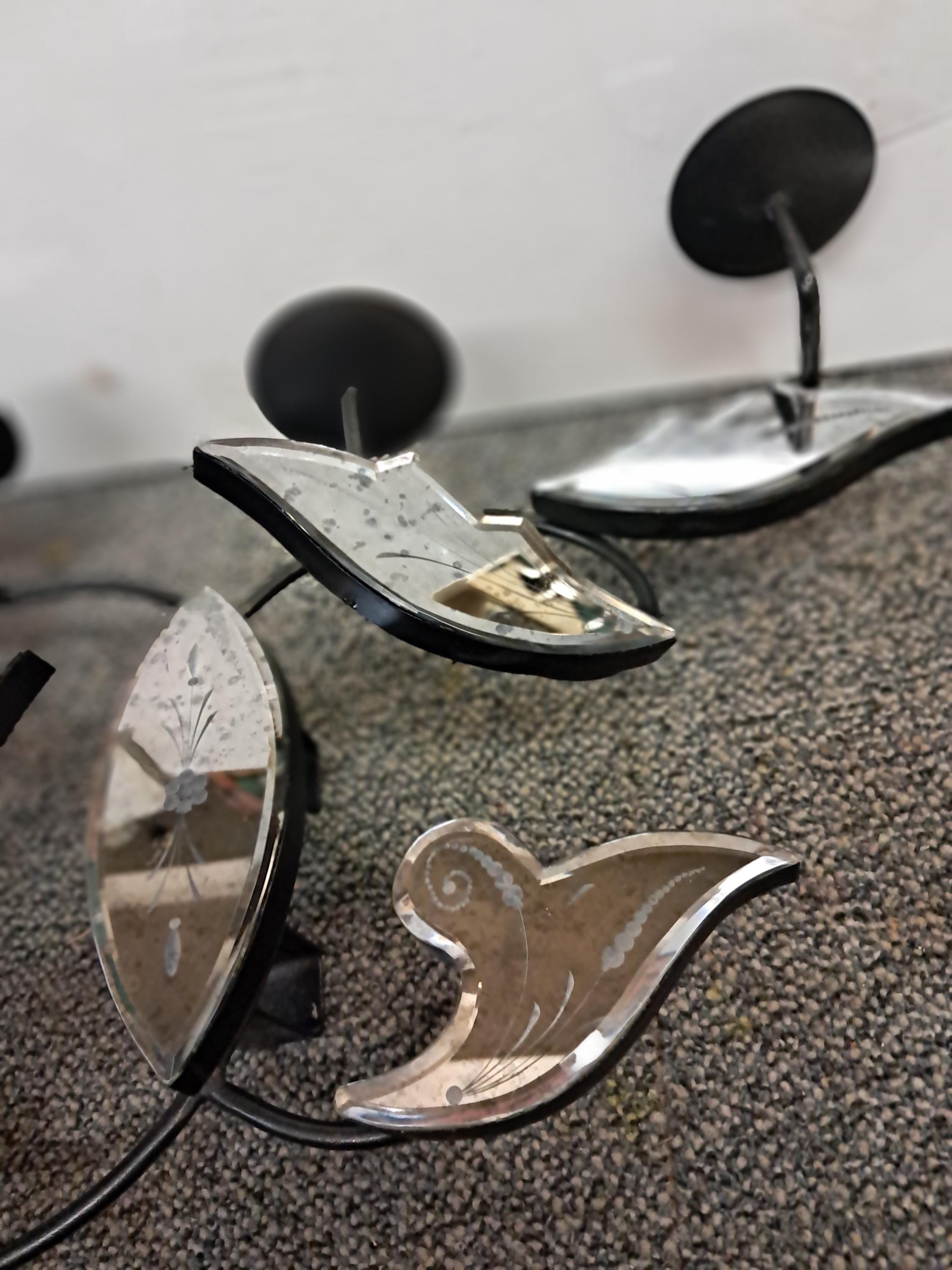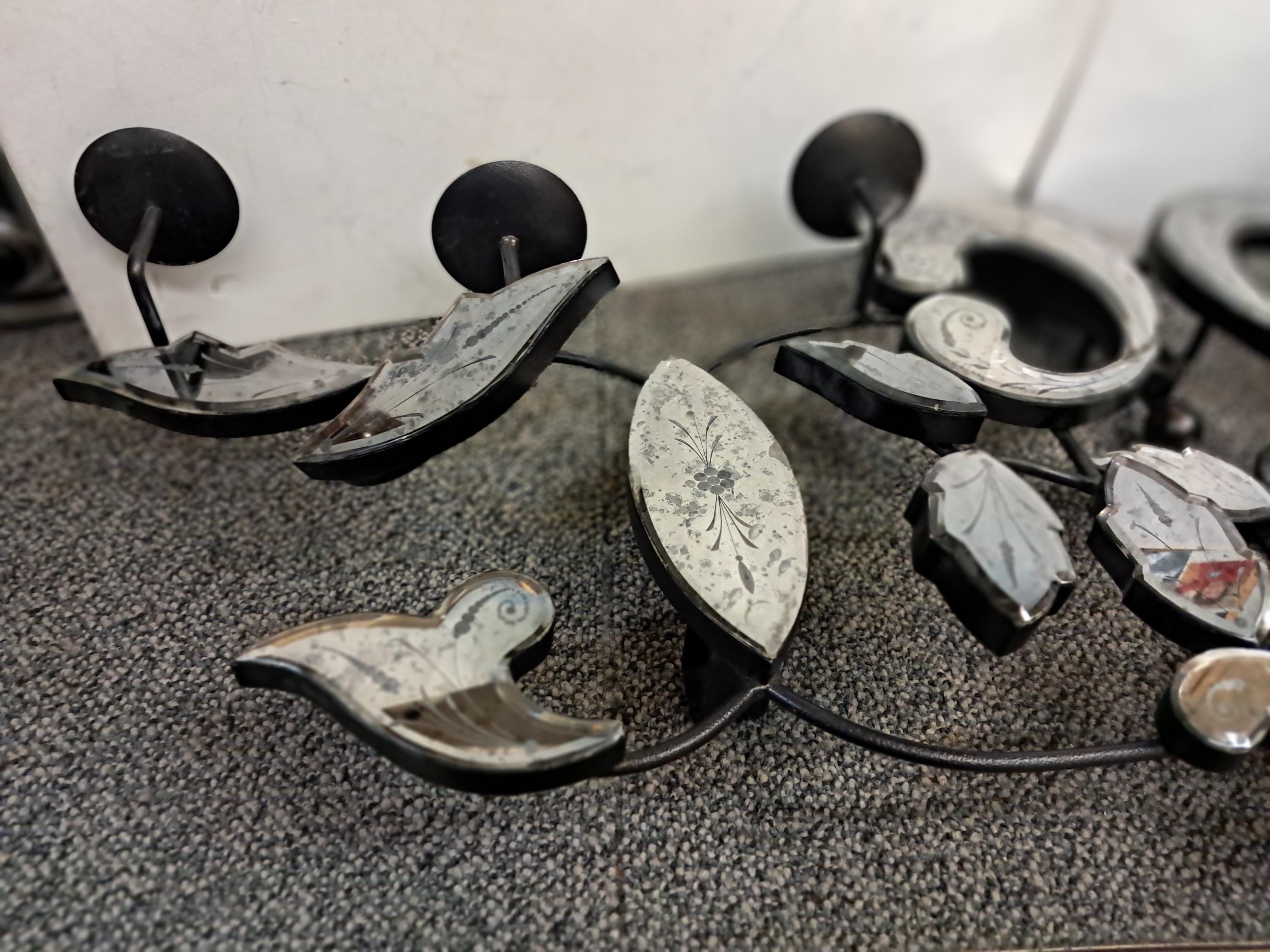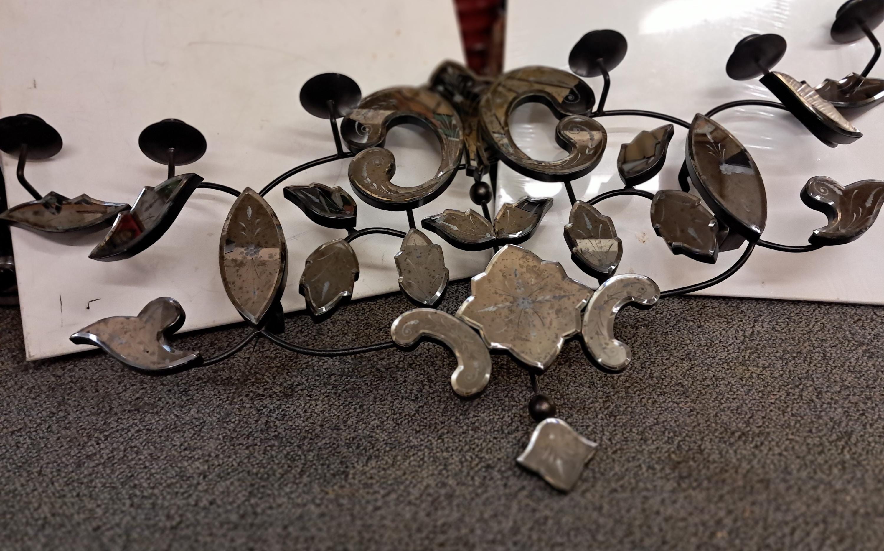 Art deco Candle Holder Trimmed With Mirror 6 Candle Holder on a metal frameTastefully done with etched floral design Mirrors38" wide x 20 " tall x 6" deepExcellent Condition with No Damage