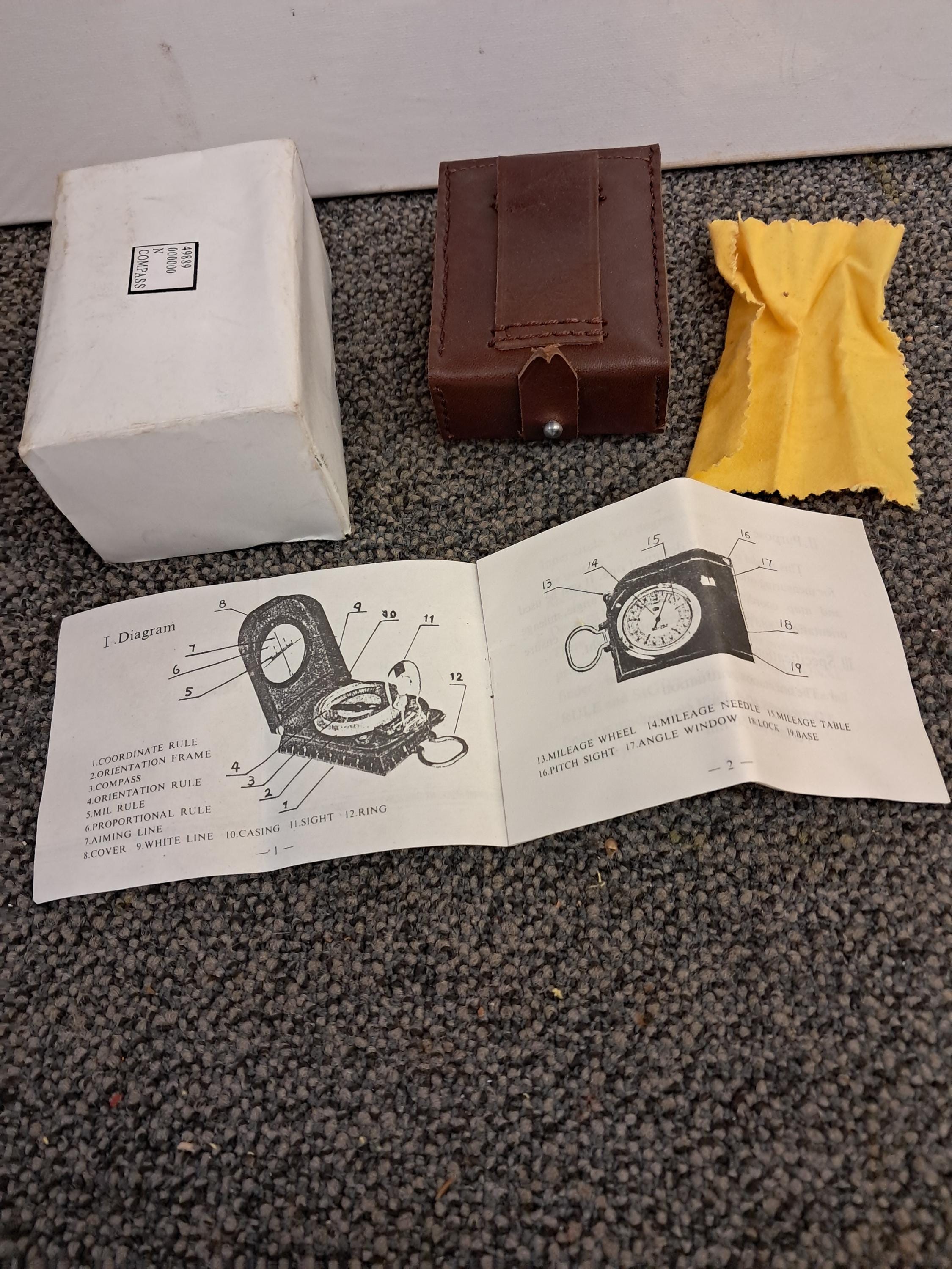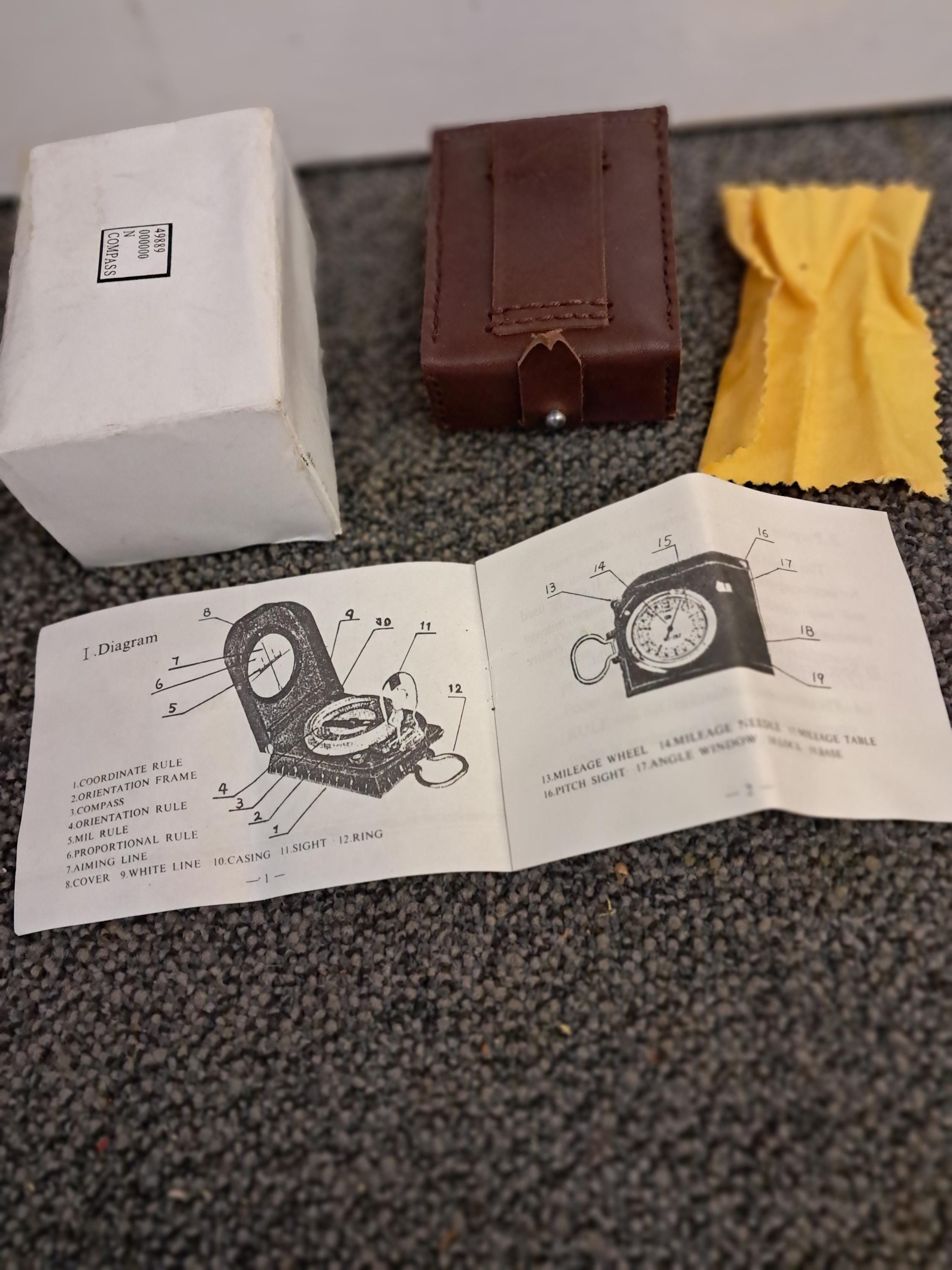 The Compas is new and comes with leather carrying bag,Instruction, and special materocal cloth to clean in case of rain. All are in original box