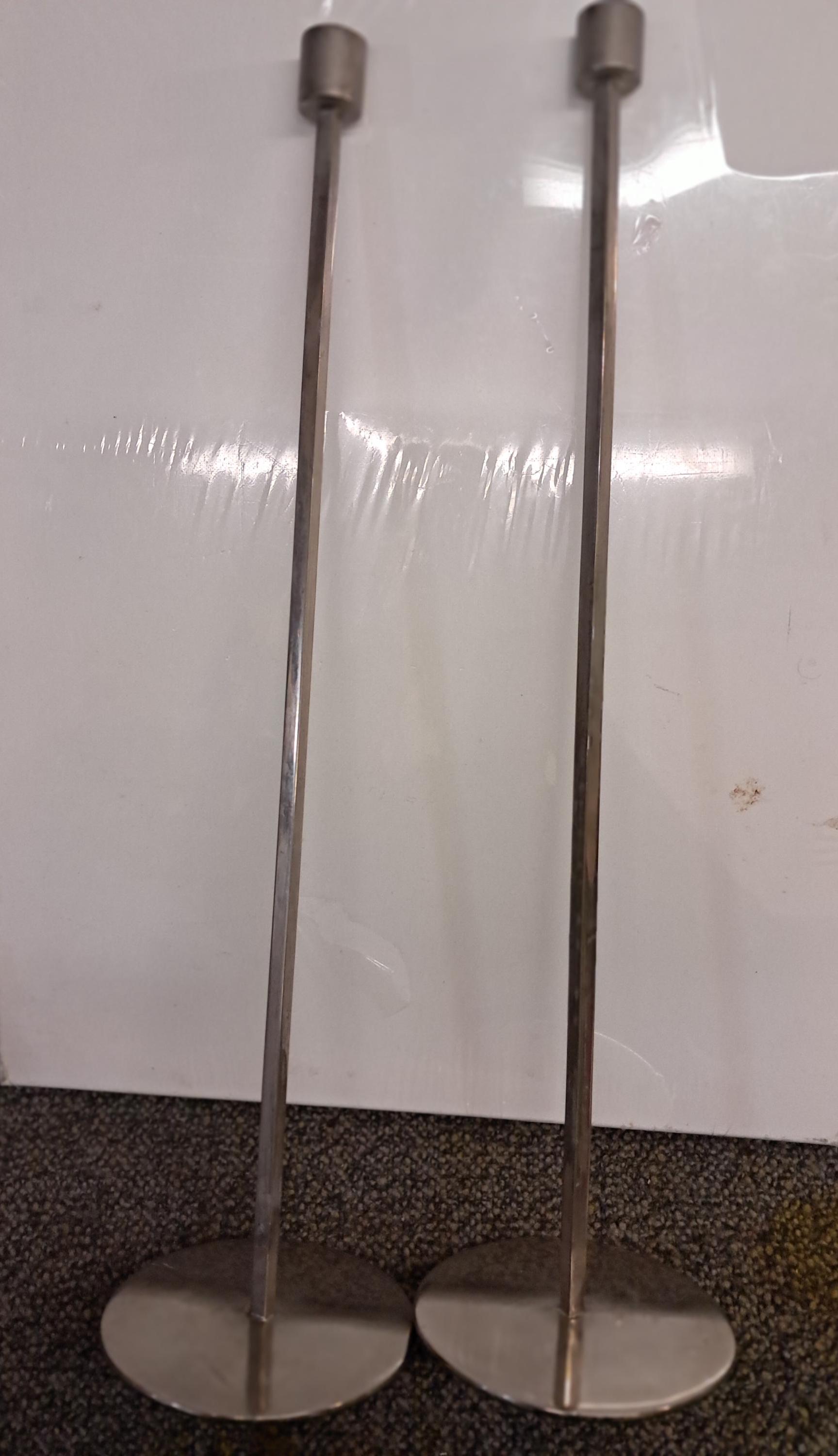 Nothing creates drama like candlelight! Soaring 20" and shapely with 5" bases for stability, these Candel holders are hand forged individually with heat and hammers from blackened steel and wrought iron. Weighty enough to sit securely along a dining table or grouped on a mantel, adding height and interest. They hold standard sized taper candles.