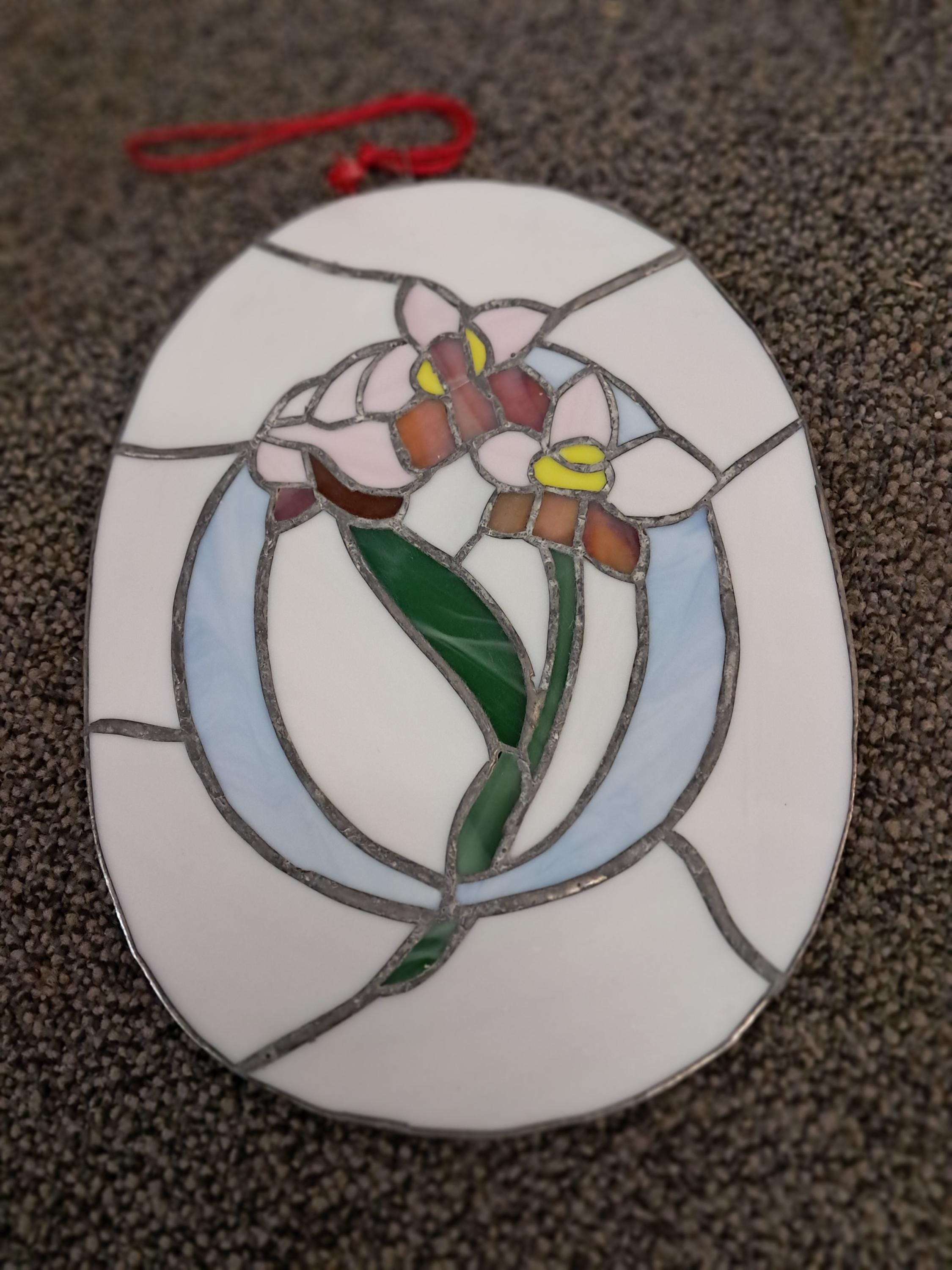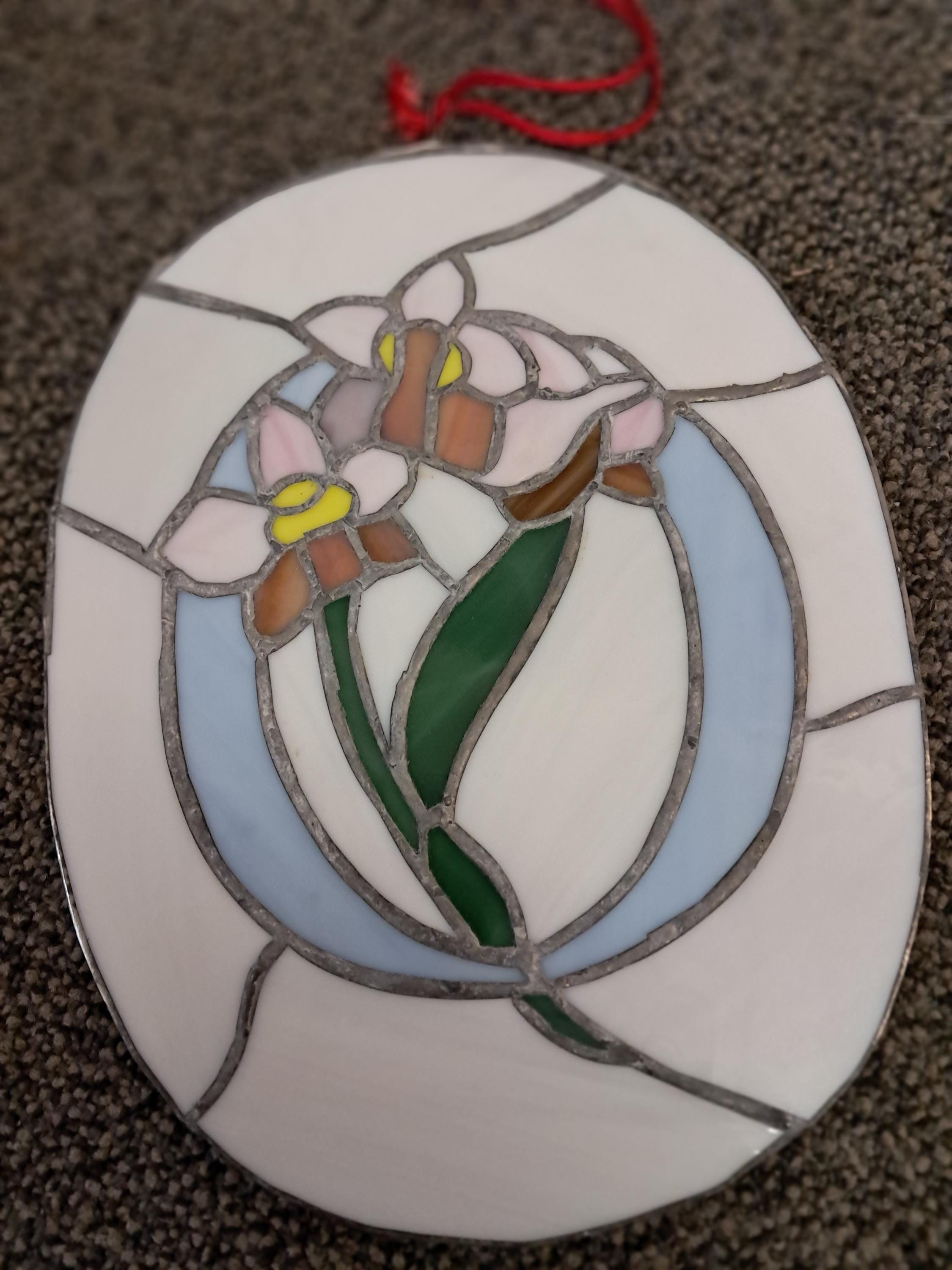 This Forget Me Not Stained Glass Window Panel is a lovely accent piece that will fill any space with vibrant purple/blue/pink/white & green colors. Handcrafted using the copper foil method from 39 glass cuts in various colors , this Oval Shape stained glass window panel showcases a bunch of forget me not flowers that peek out over the top of the panel. A great gift for avid gardeners or to remember a loved one.