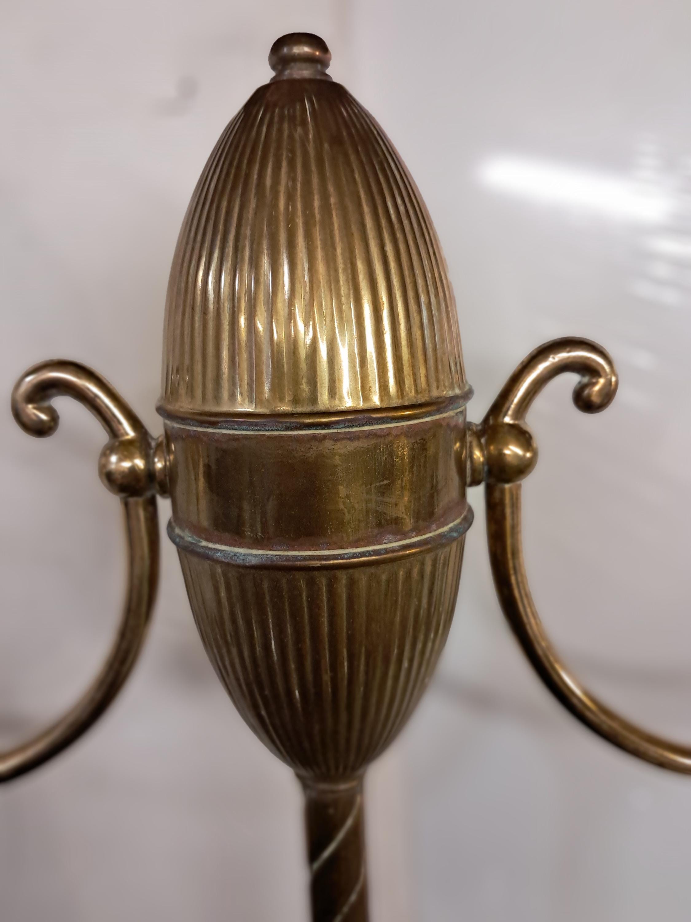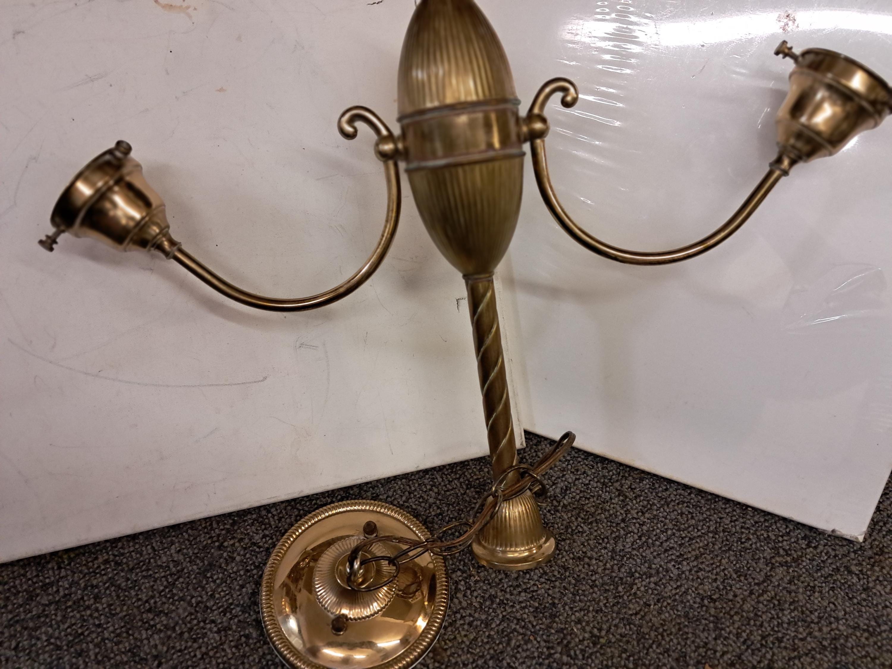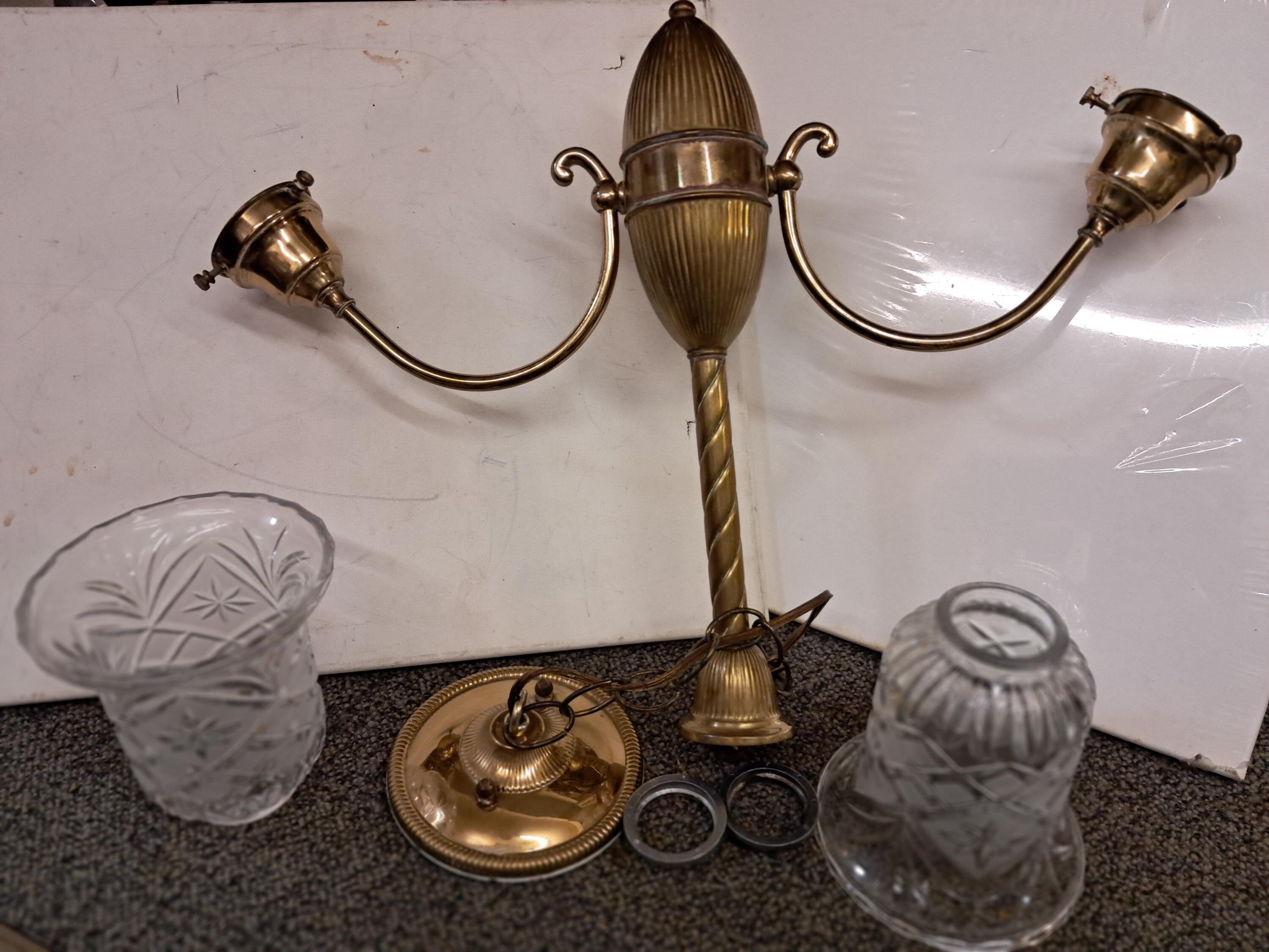 An antique ceiling fixture offers brass frame with two drop-lights terminating in glass shades,