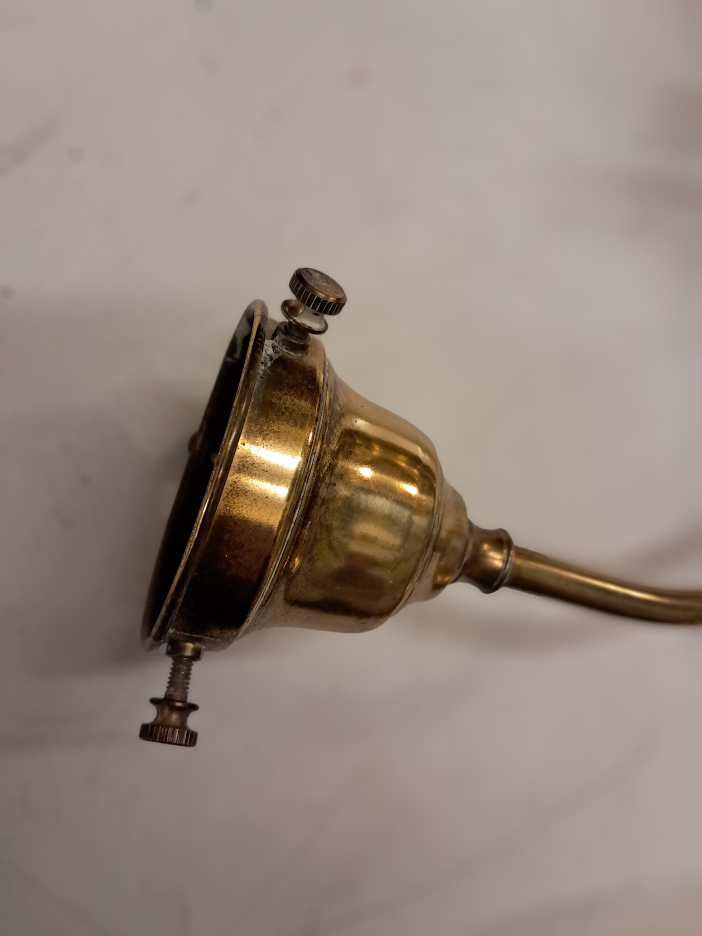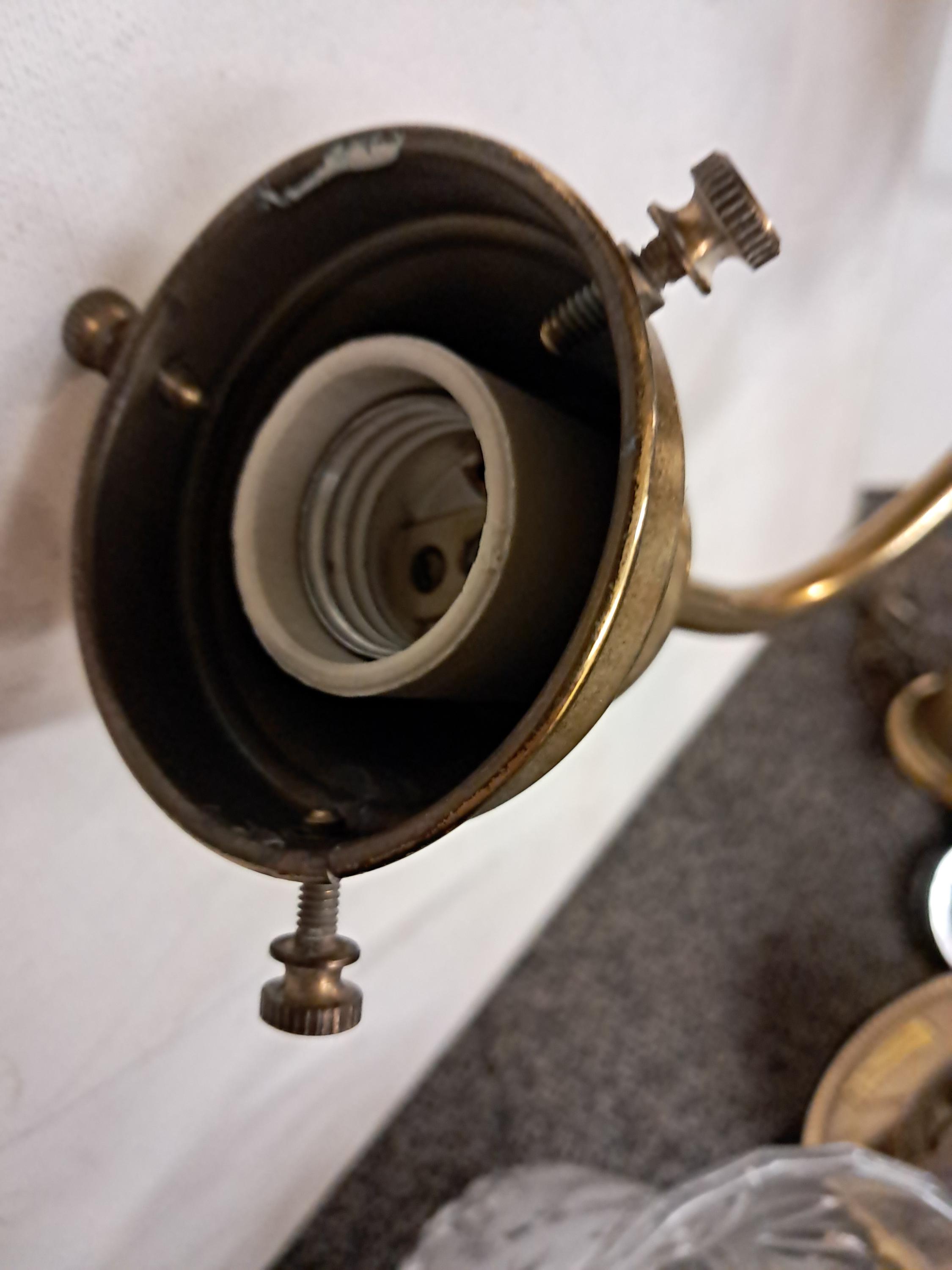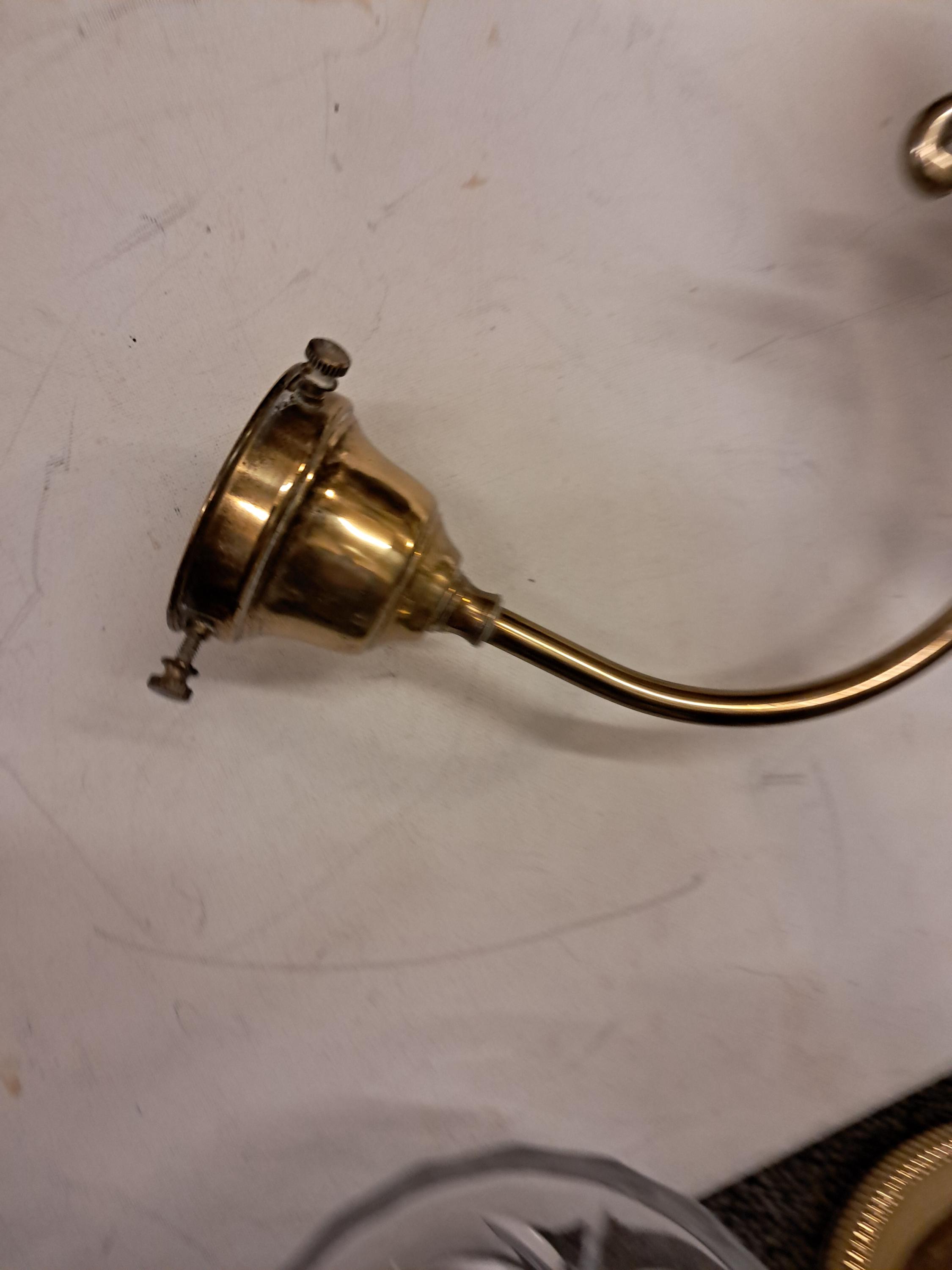 An antique ceiling fixture offers brass frame with two drop-lights terminating in glass shades,