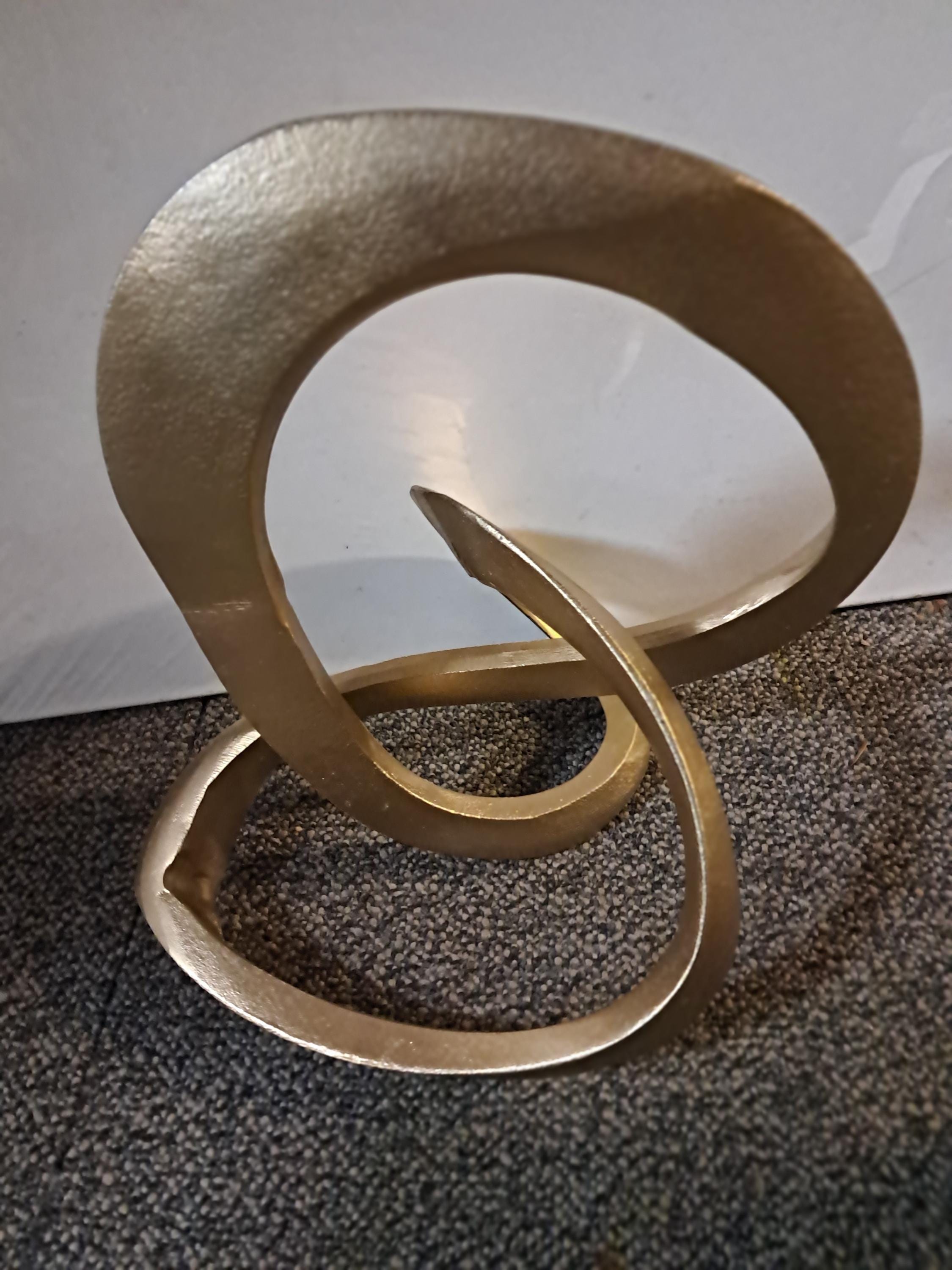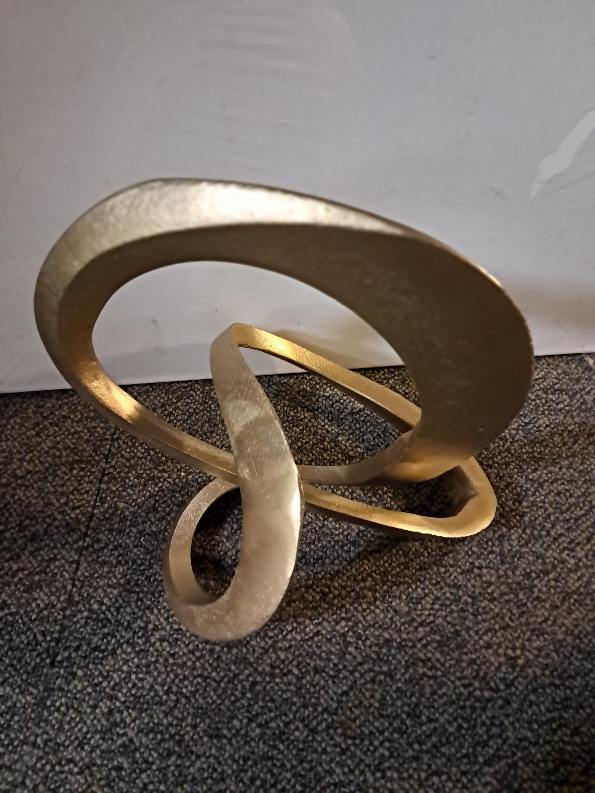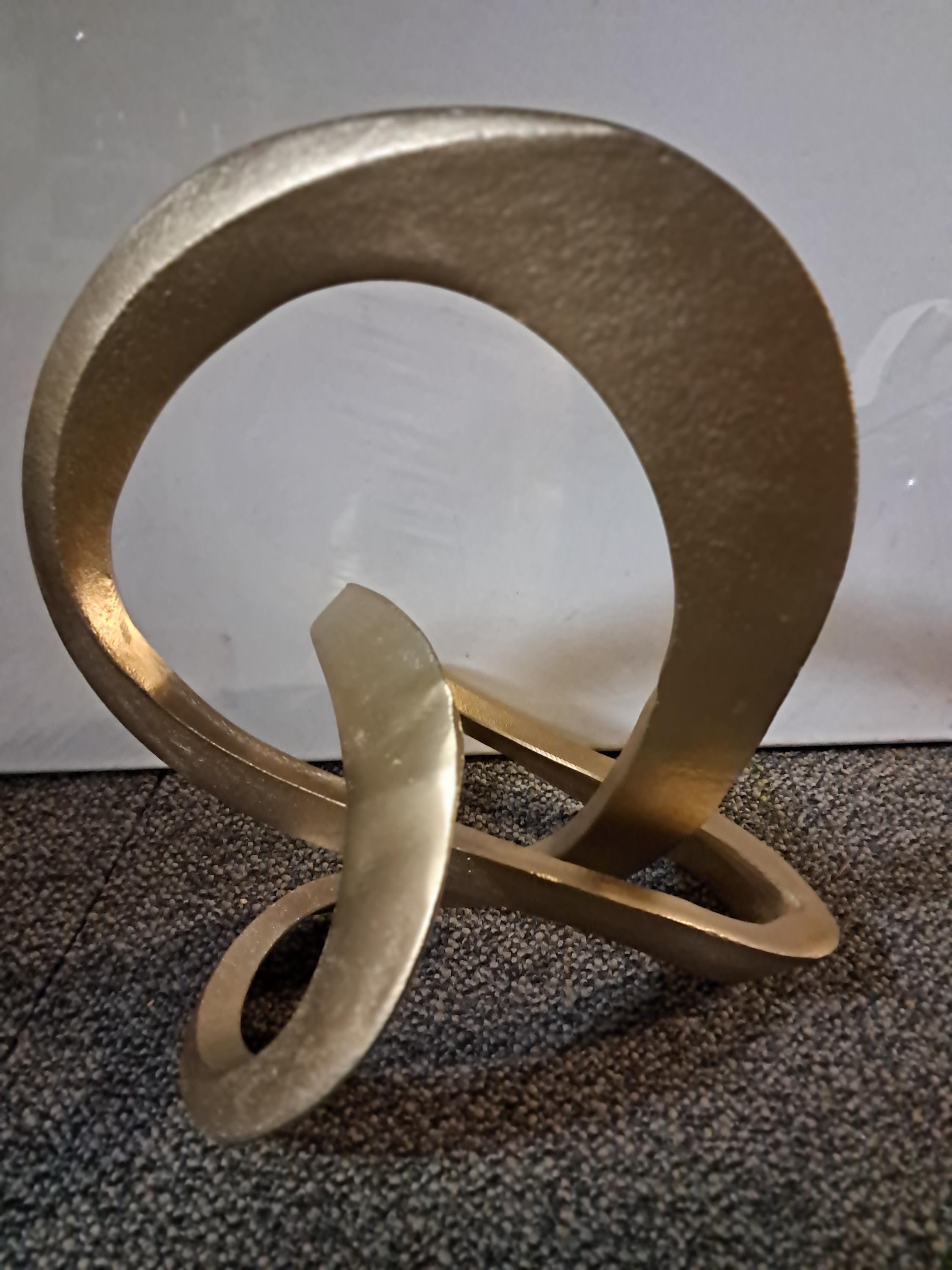 This modern and sleek metal loop sculpture serves as a minimalist decorative piece that enhances any space. Its smooth, flowing curves in a golden finish add a touch of elegance and sophistication, perfect for display on shelves, coffee tables, or mantels. The abstract design brings a sense of movement and contemporary style, making it a versatile addition to both modern and classic interiors. Ideal for those who appreciate artistic, understated décor pieces.