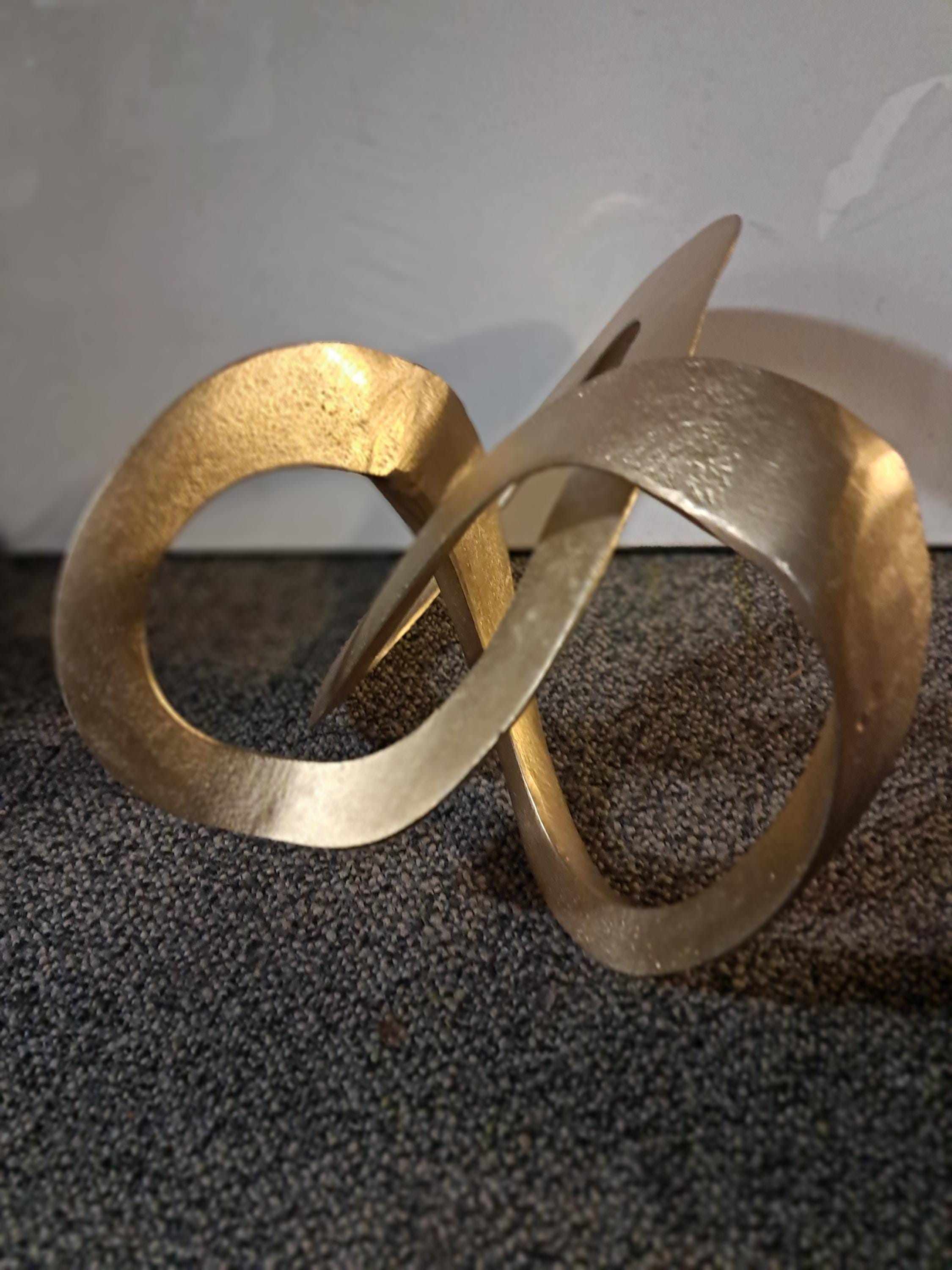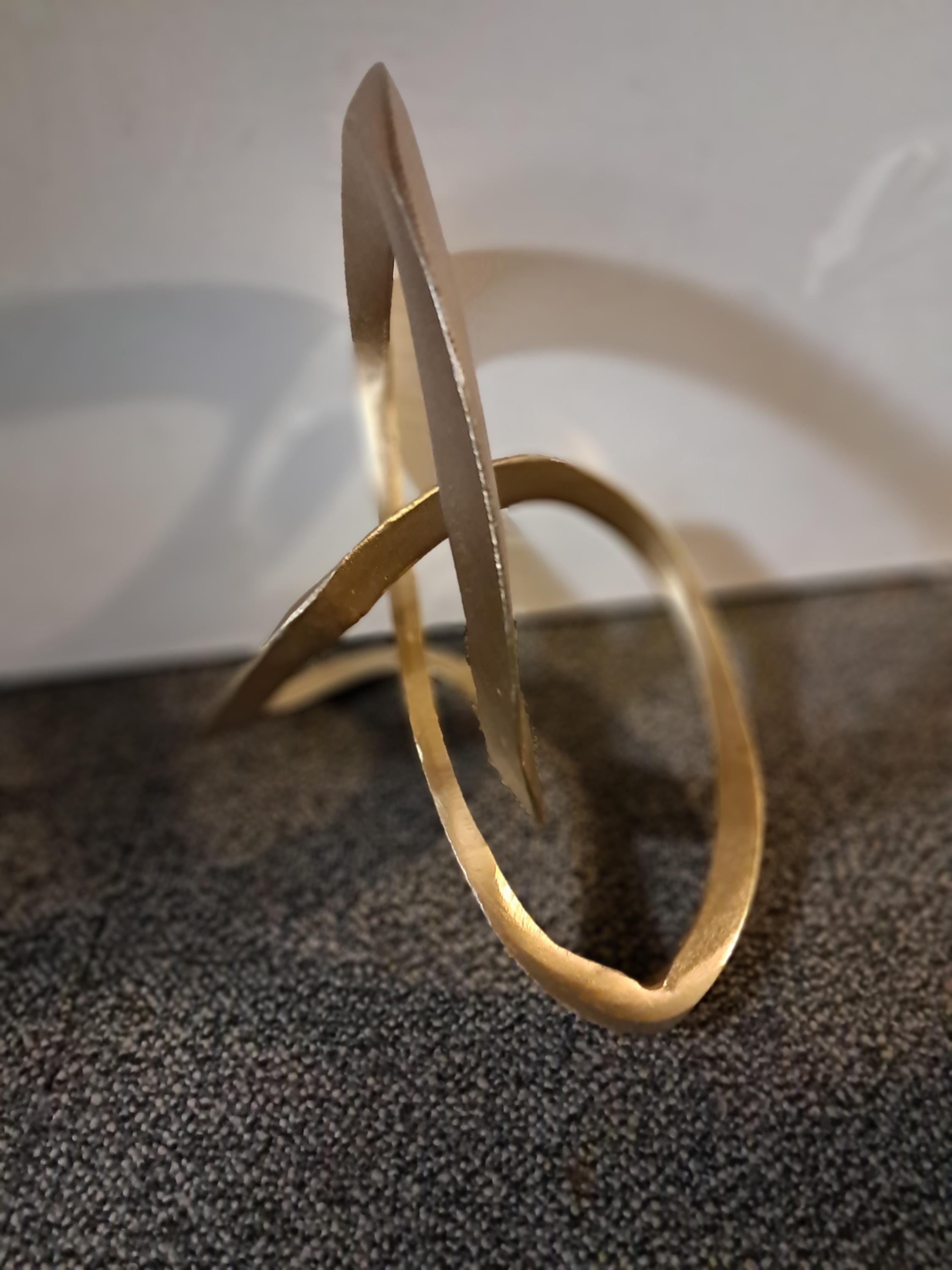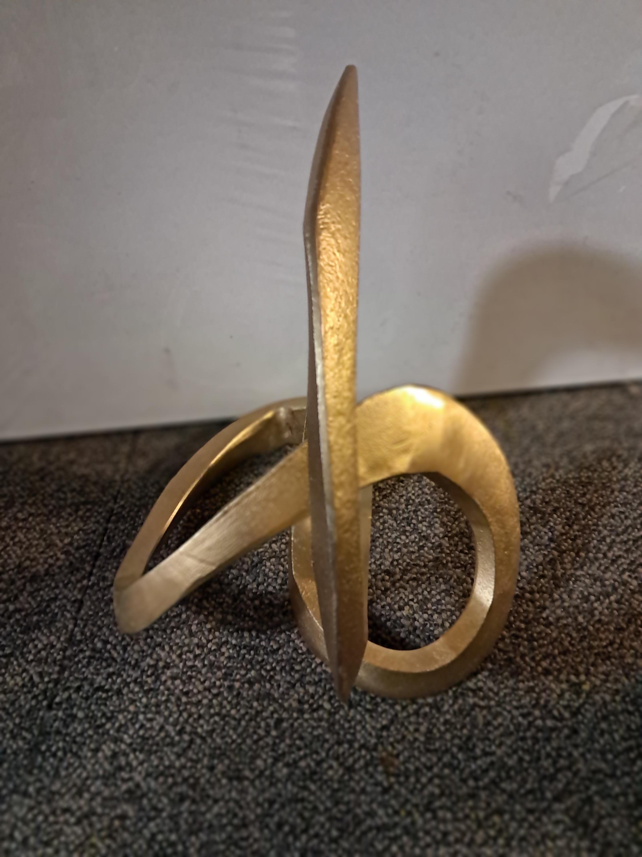 This modern and sleek metal loop sculpture serves as a minimalist decorative piece that enhances any space. Its smooth, flowing curves in a golden finish add a touch of elegance and sophistication, perfect for display on shelves, coffee tables, or mantels. The abstract design brings a sense of movement and contemporary style, making it a versatile addition to both modern and classic interiors. Ideal for those who appreciate artistic, understated décor pieces.