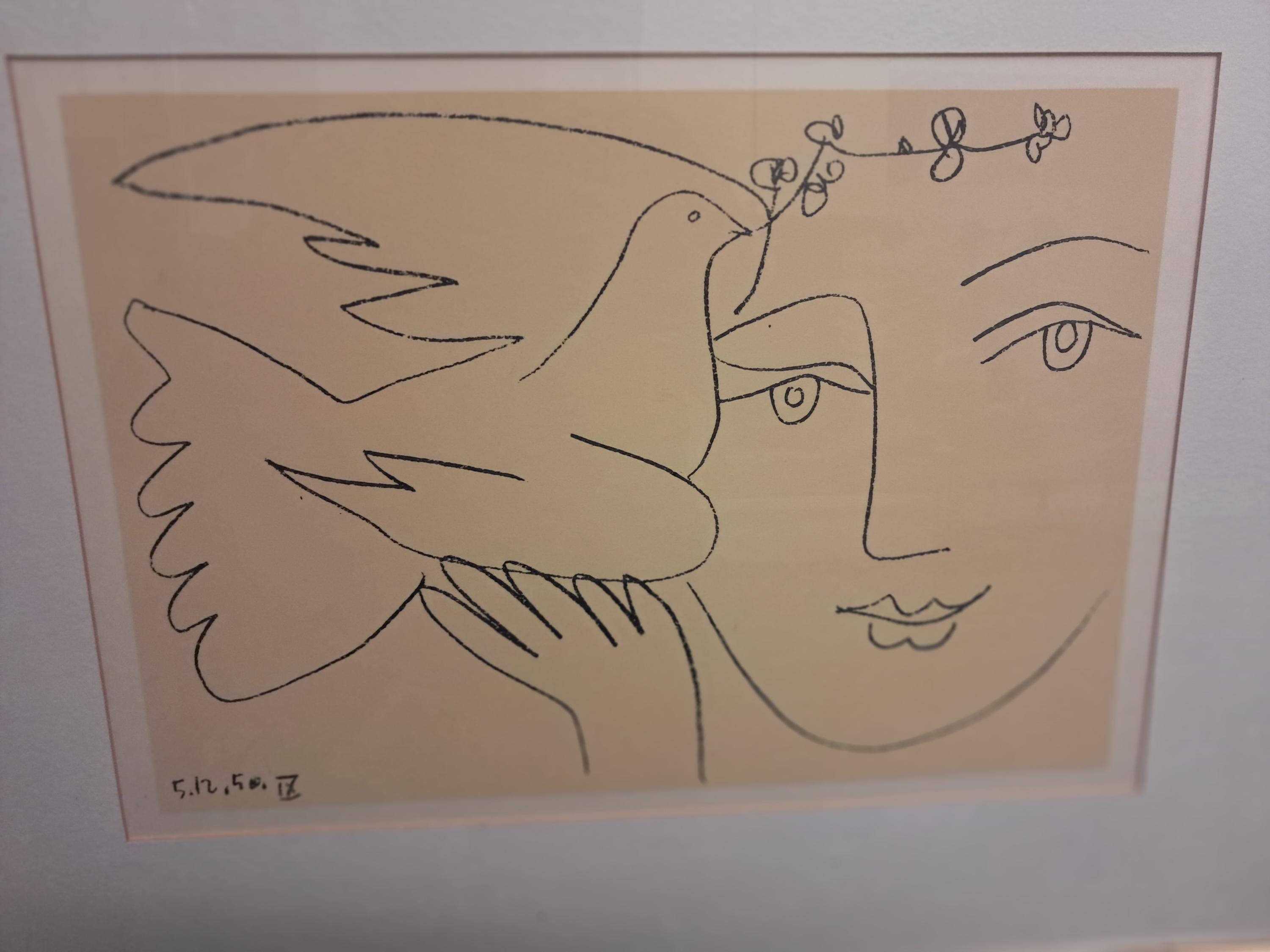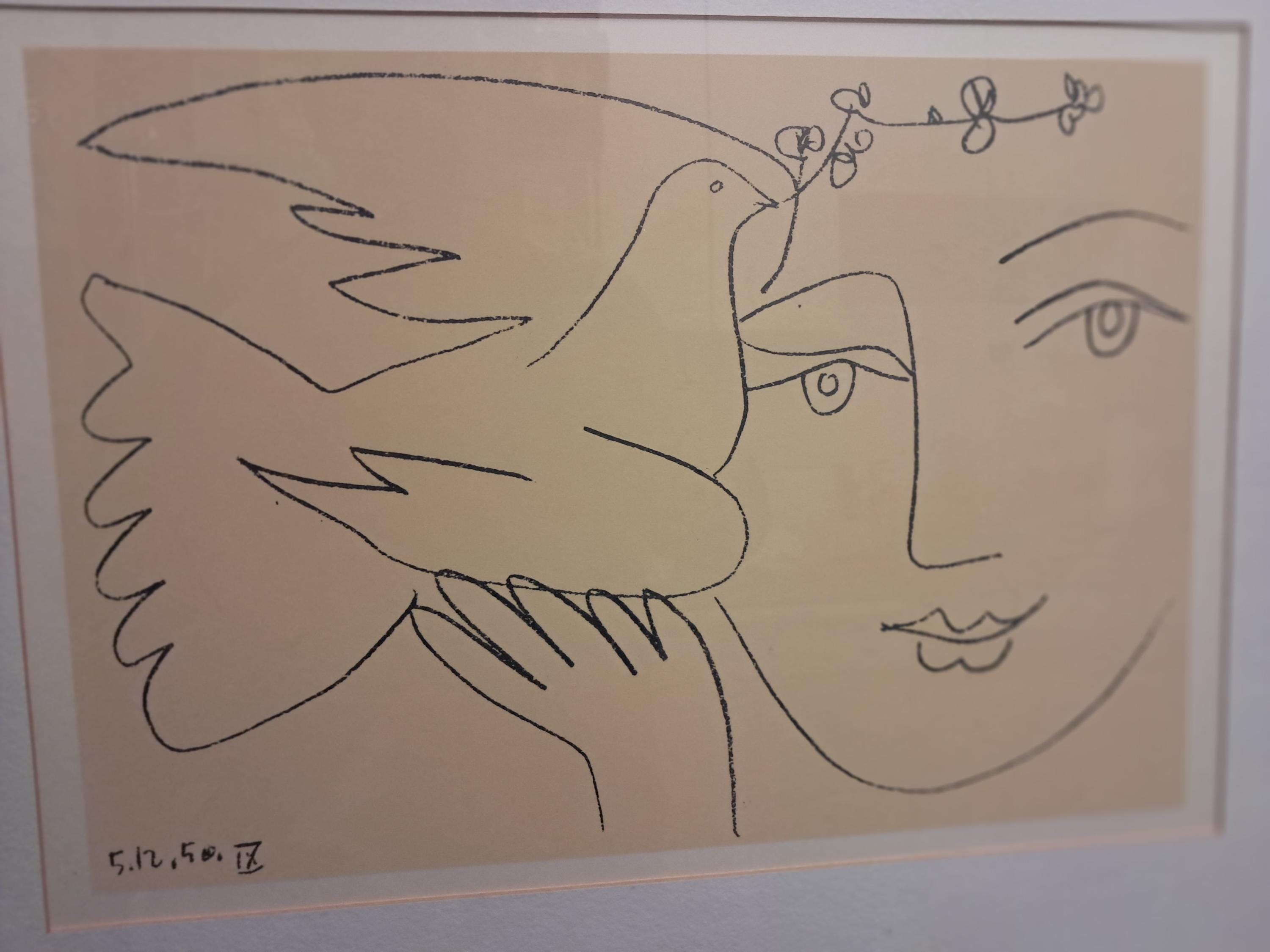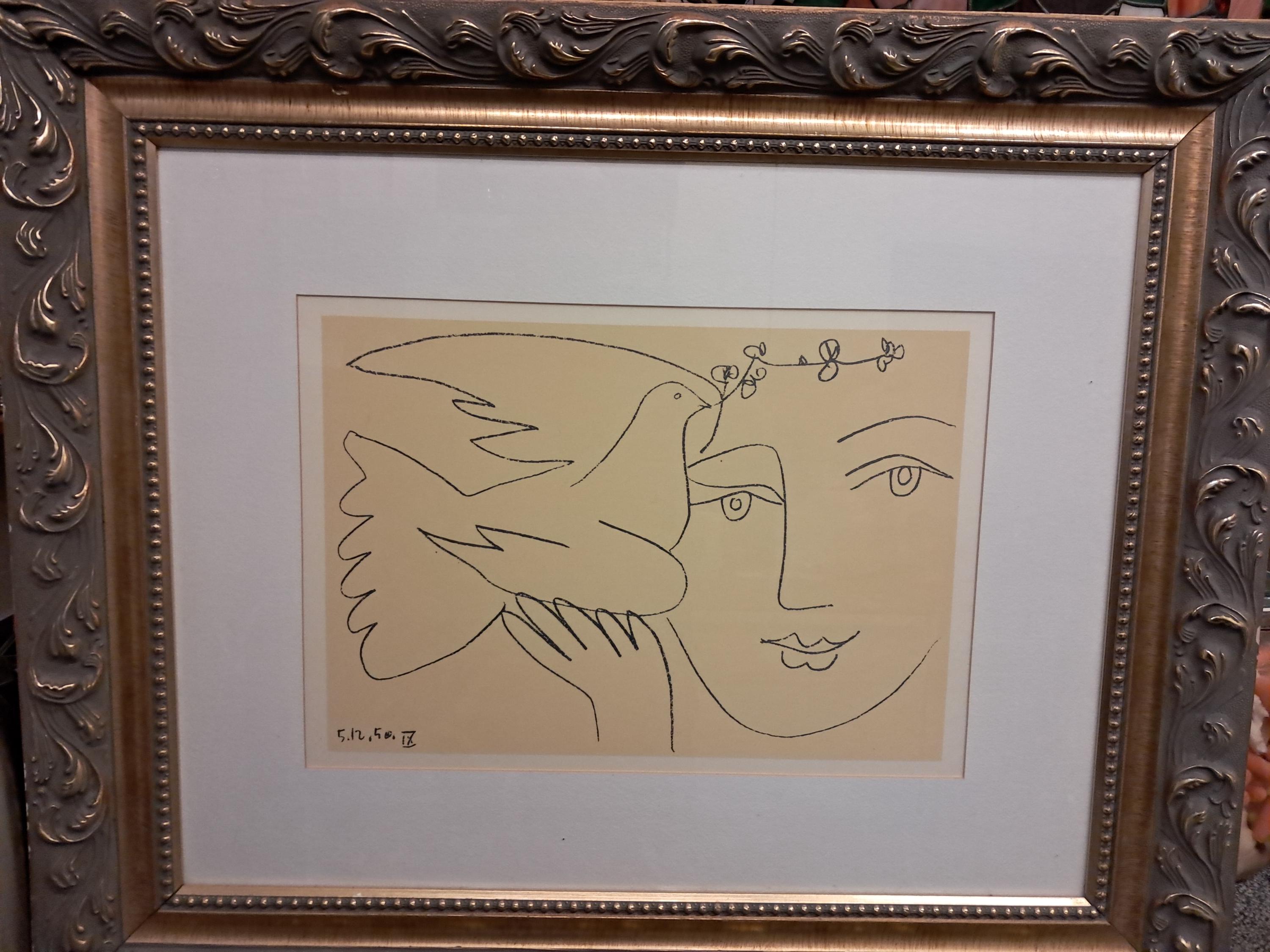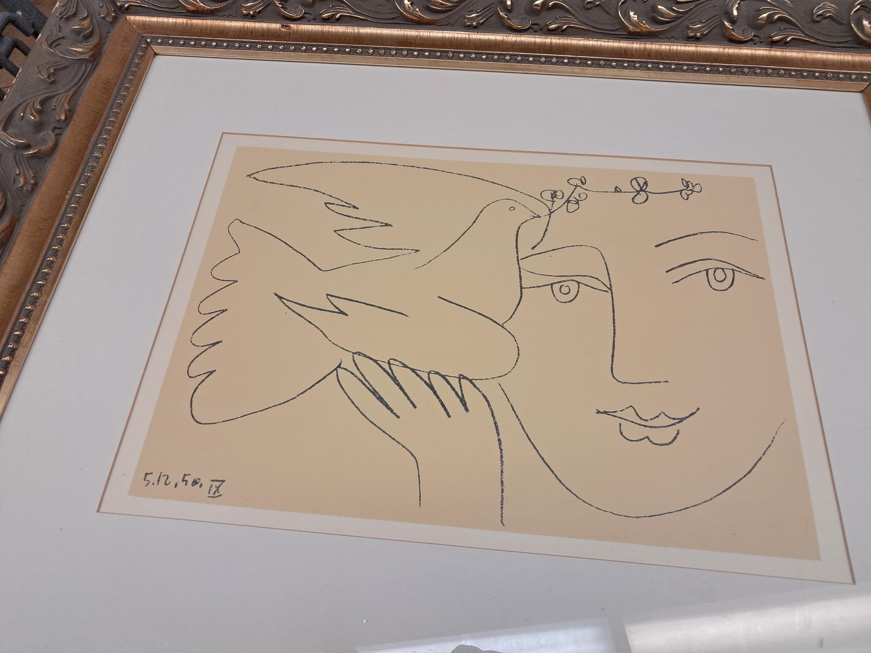 Framed Print after pablo picasso "le visage de la paix" representing a dove and a stylized face, signed and dated december 5, 1950. The original work, produced for paul éluard's book "le visage de la paix" peace", is characteristic of picasso's refined and expressive style. The reproduction was published by nouvelles images sa in 1996 and printed offset in france.