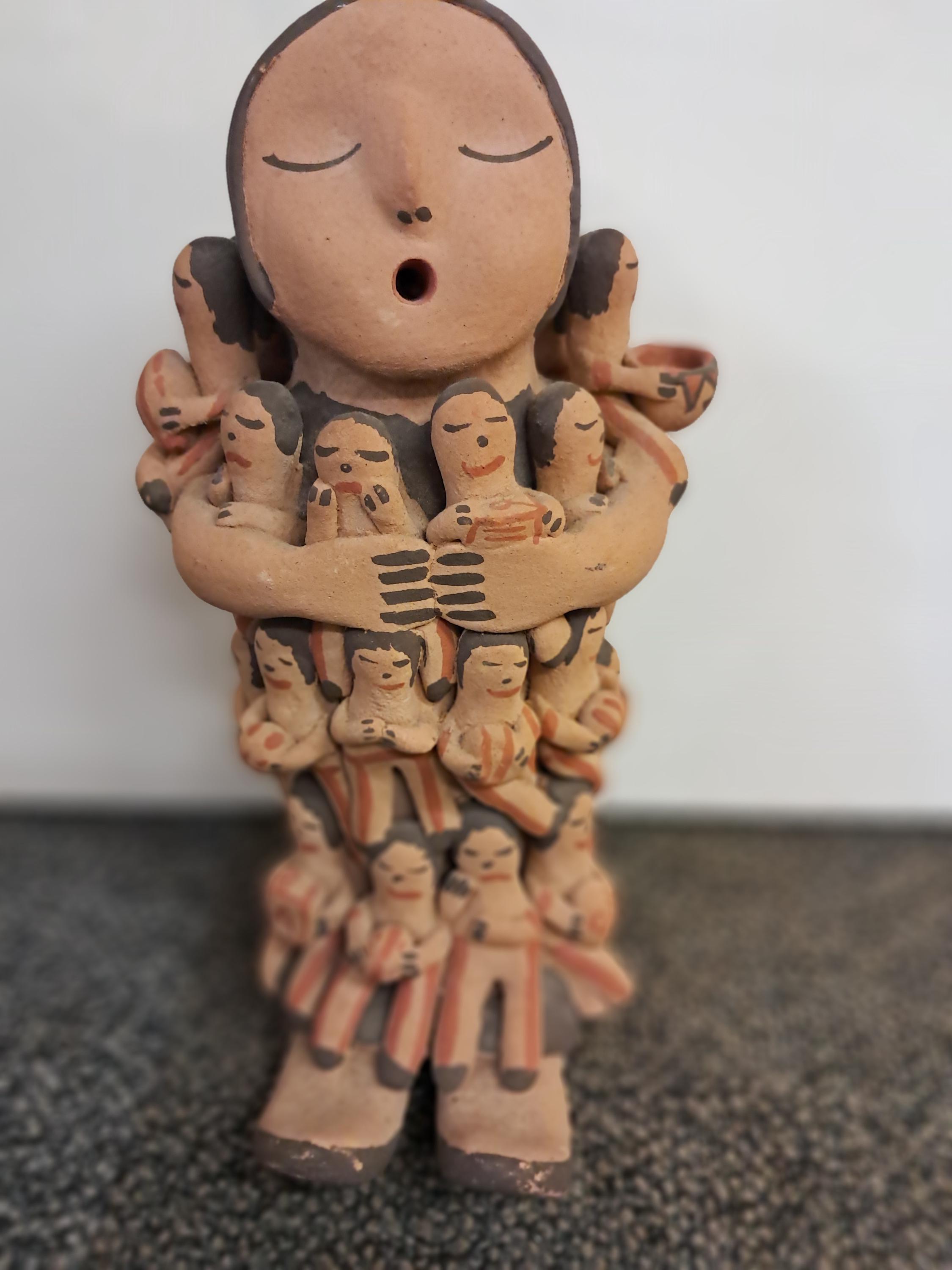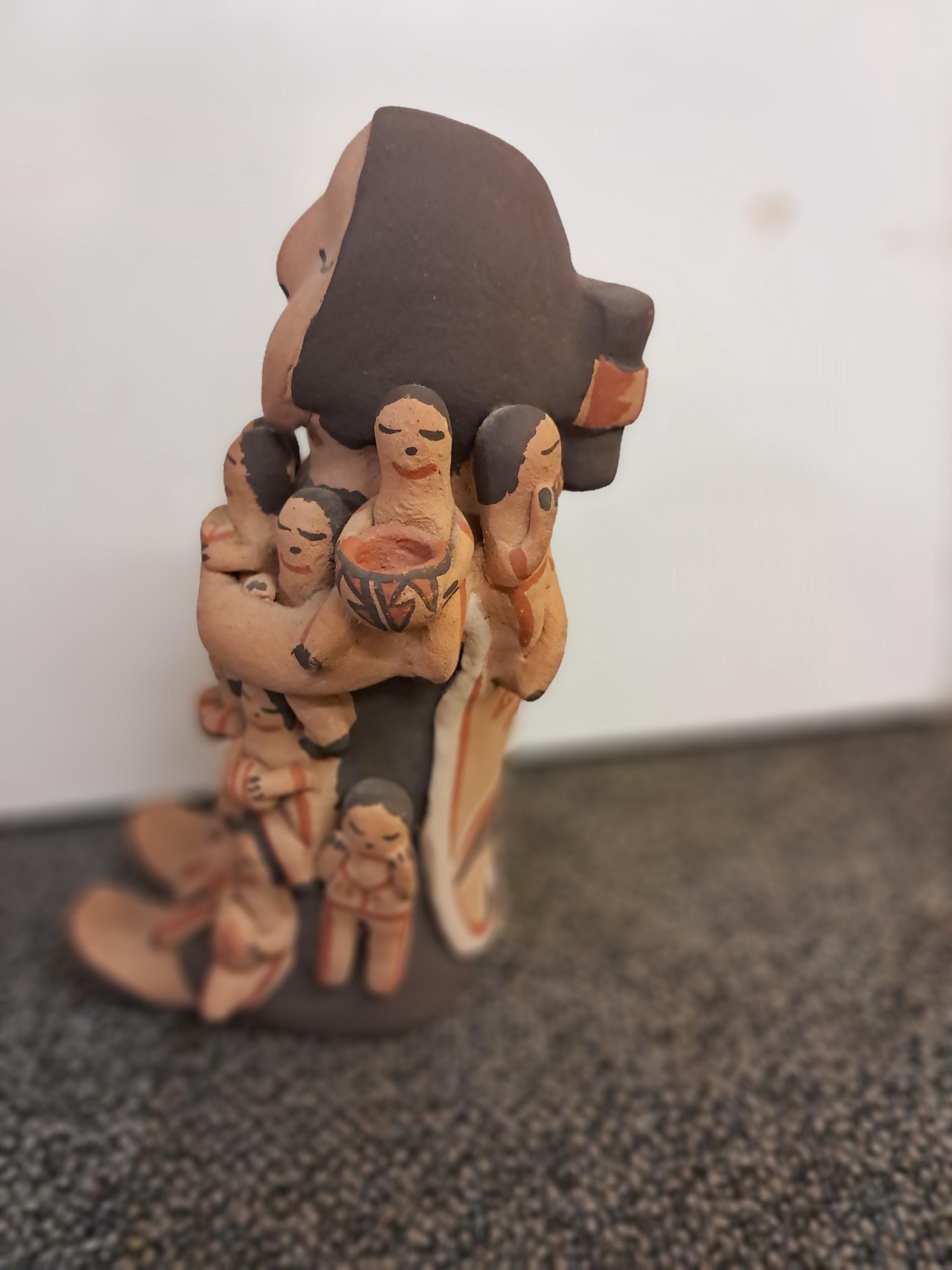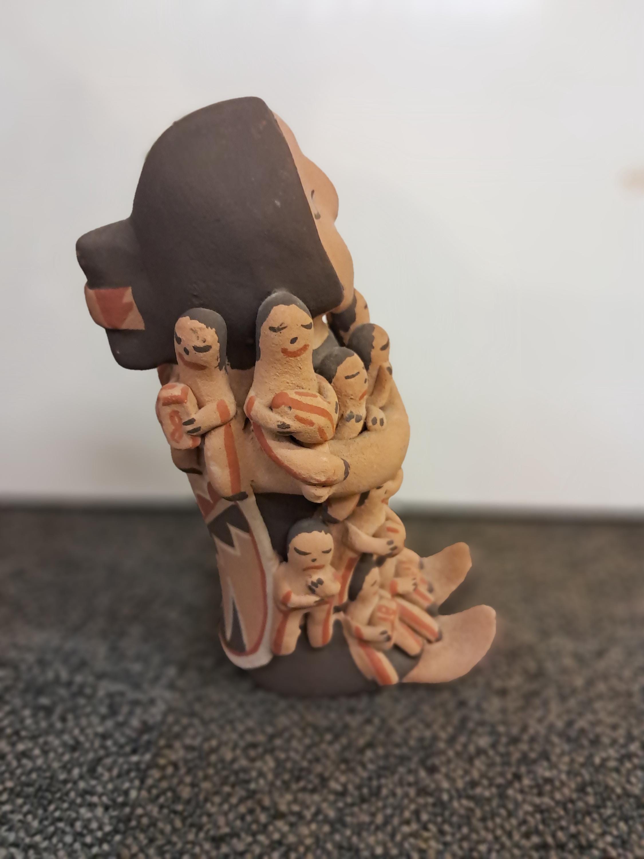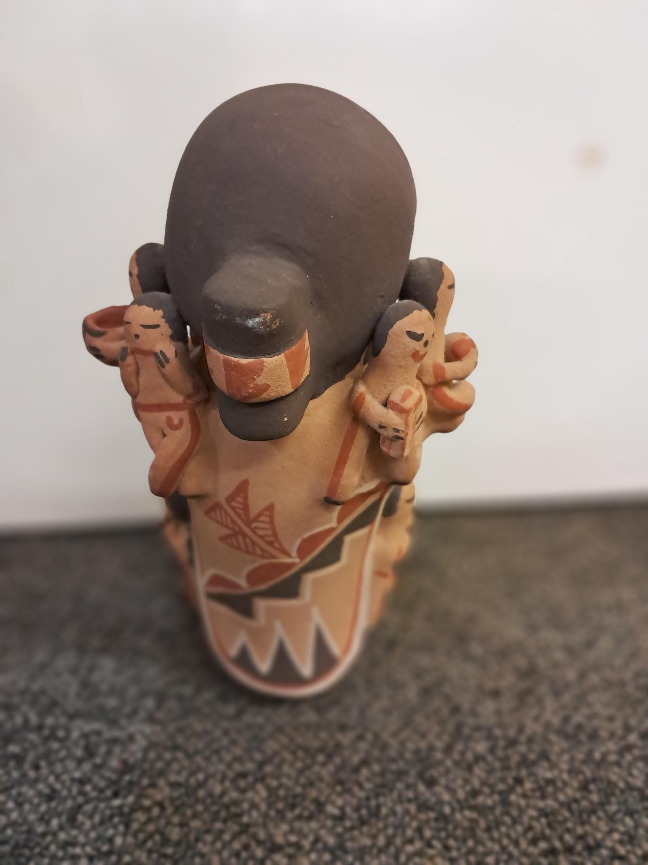A Jemez Pueblo storyteller by Bonnie Fragua. This piece has a mother with sevenchildren. This piece measures 8 inches in height, 4 inches in length and 5 inches wide.This piece is made traditionally with the clay and natural paint.